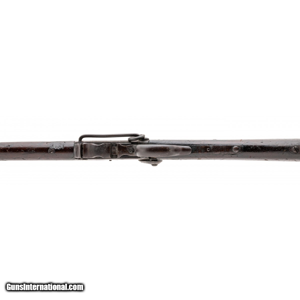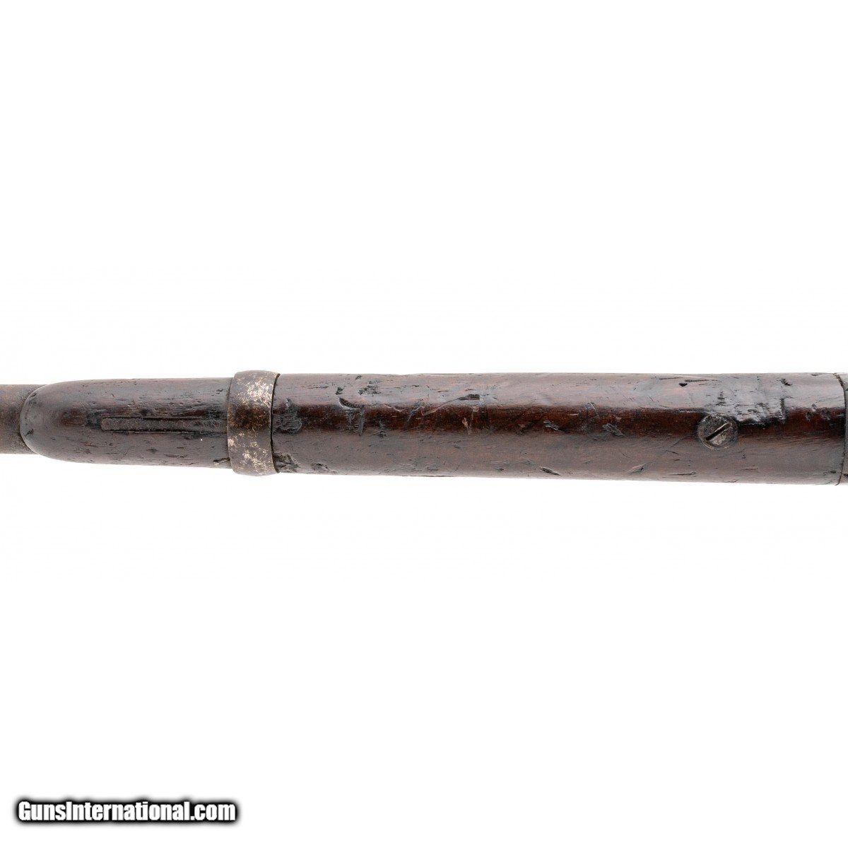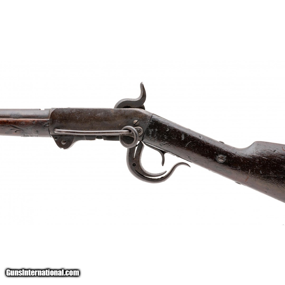 Description: " Serial No. 28806, circa 1863-1864, .54 caliber, 21"" round barrel. Overall condition is untouched, oxidation is noted on all metal parts and is a dark brown/grey patina. Bore is poor with heavy oxidation visible in the lands and grooves. Rear sight is missing, nipple and ignition system will detach from the breech. Factory markings are visible and legible. Stock shows heavy ""combat"" use with initials carved into the left side. Action does not hold at half or full cock. Carbine looks like its seen some action! SOLD Antique: Yes |