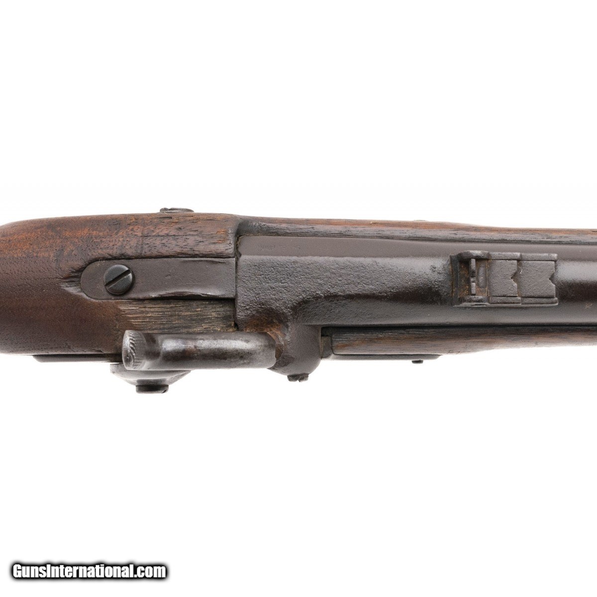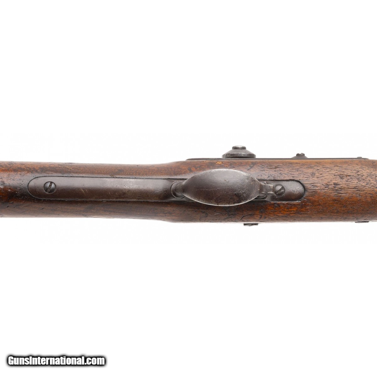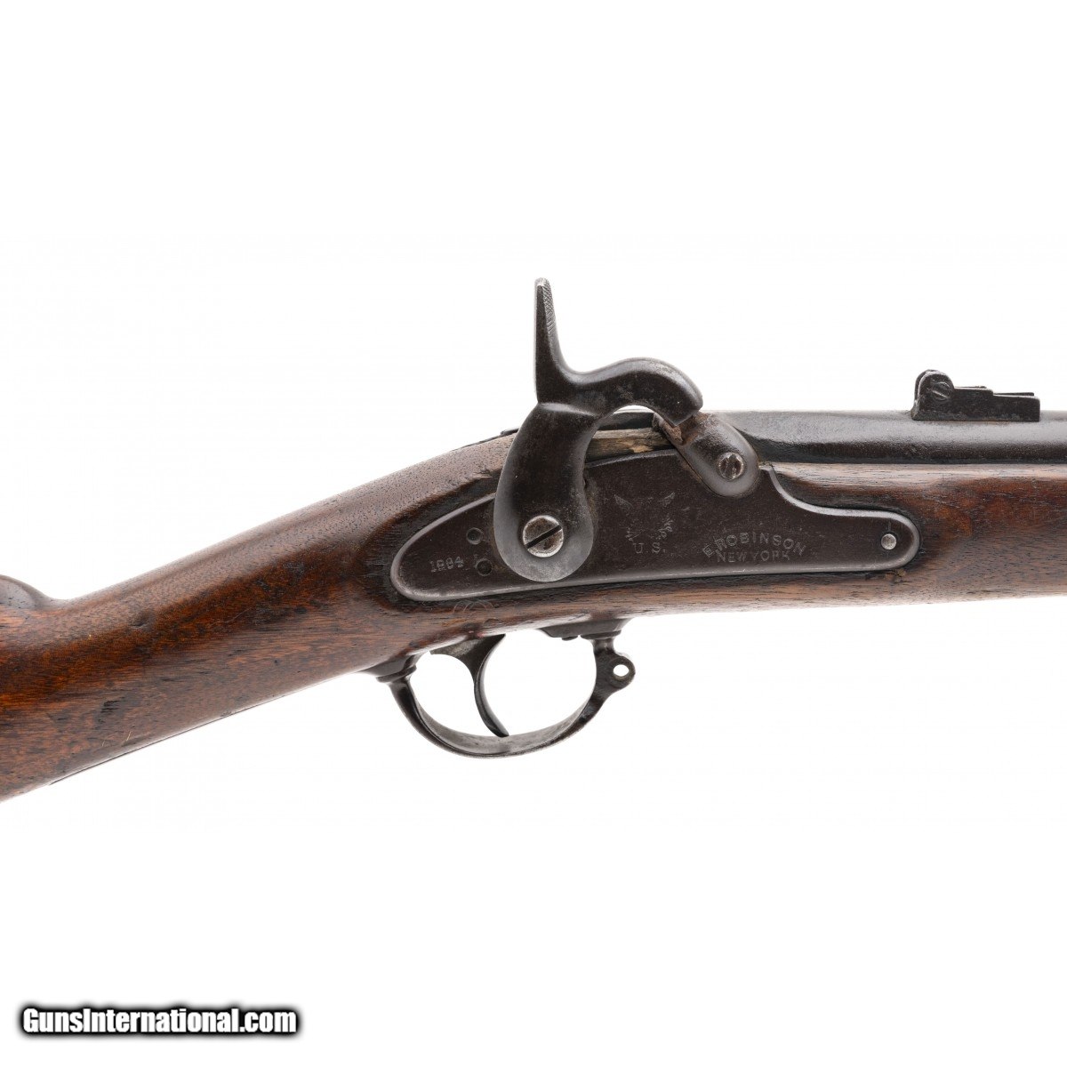 Description: "NSN, made in 1864, .58 caliber, 40" round proofed barrel. Barrel and other metal parts are a dark brown/grey patina with smooth surface oxidation visible. Lock plate is marked with ""Eagle/ U.S.-E.ROBINSON/NEW YORK"". Rear of lock is marked ""1864"". Heavy pitting is noted at the bolster with wood loss noted. This means the musket was heavily used! Stock has expected nicks, dings and scratches from handling and usage wear. Action holds at half and full cock. A good example of a used civil war musket with that ""been there"" look.