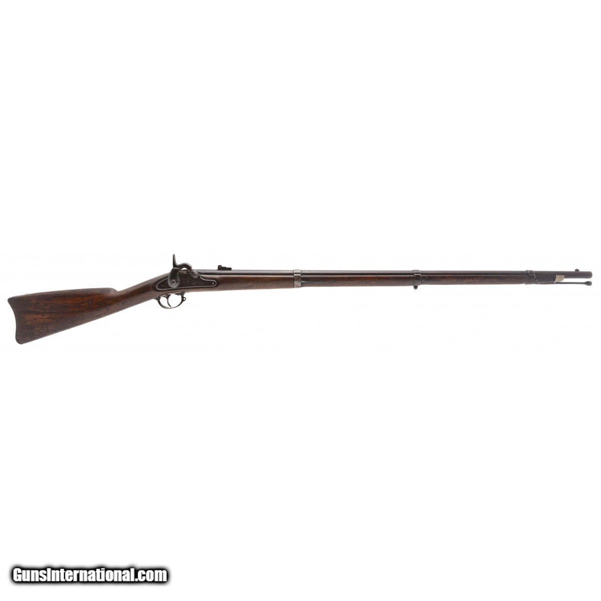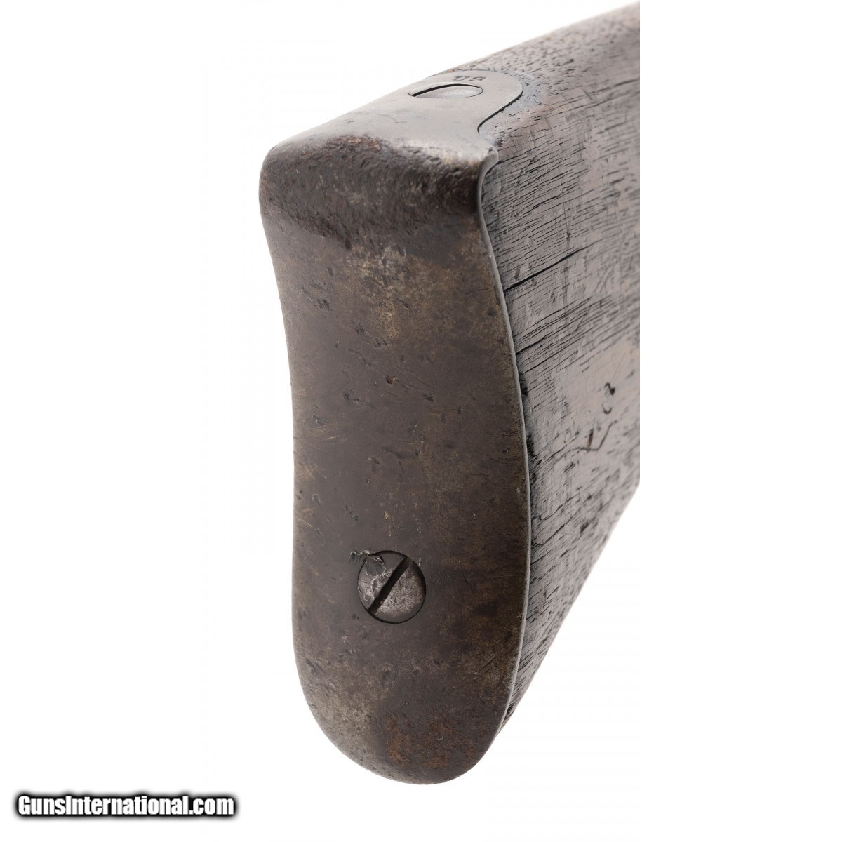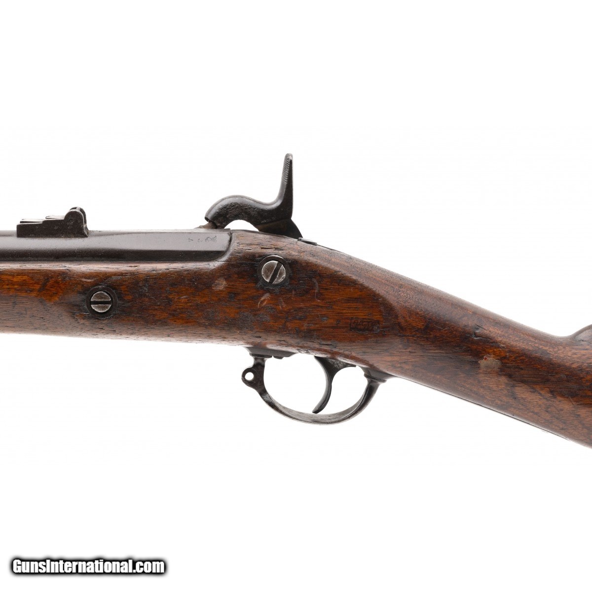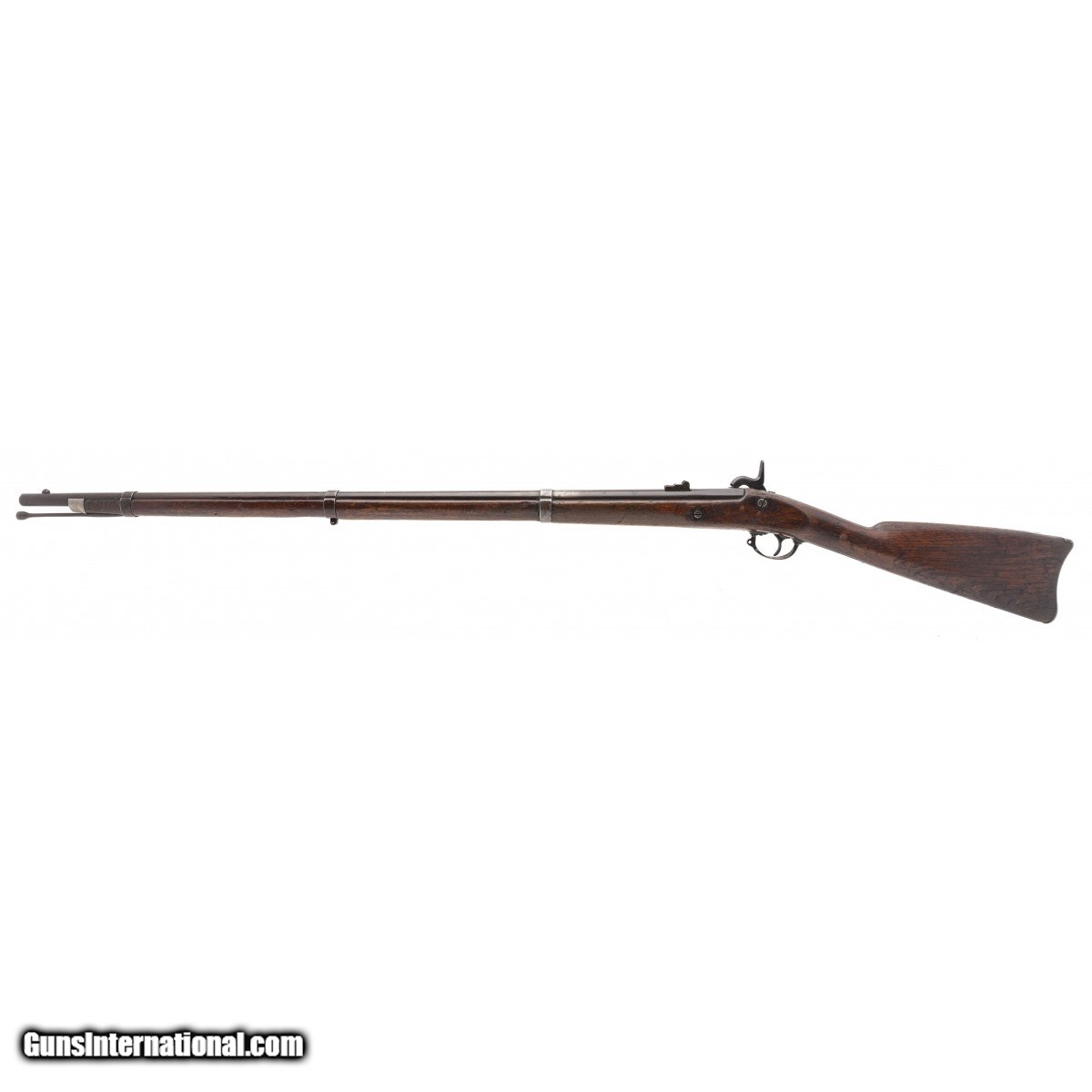Description: "NSN, made in 1864, .58 caliber, 40" round proofed barrel. Barrel and other metal parts are a dark brown/grey patina with smooth surface oxidation visible. Lock plate is marked with ""Eagle/ U.S.-E.ROBINSON/NEW YORK"". Rear of lock is marked ""1864"". Heavy pitting is noted at the bolster with wood loss noted. This means the musket was heavily used! Stock has expected nicks, dings and scratches from handling and usage wear. Action holds at half and full cock. A good example of a used civil war musket with that ""been there"" look.