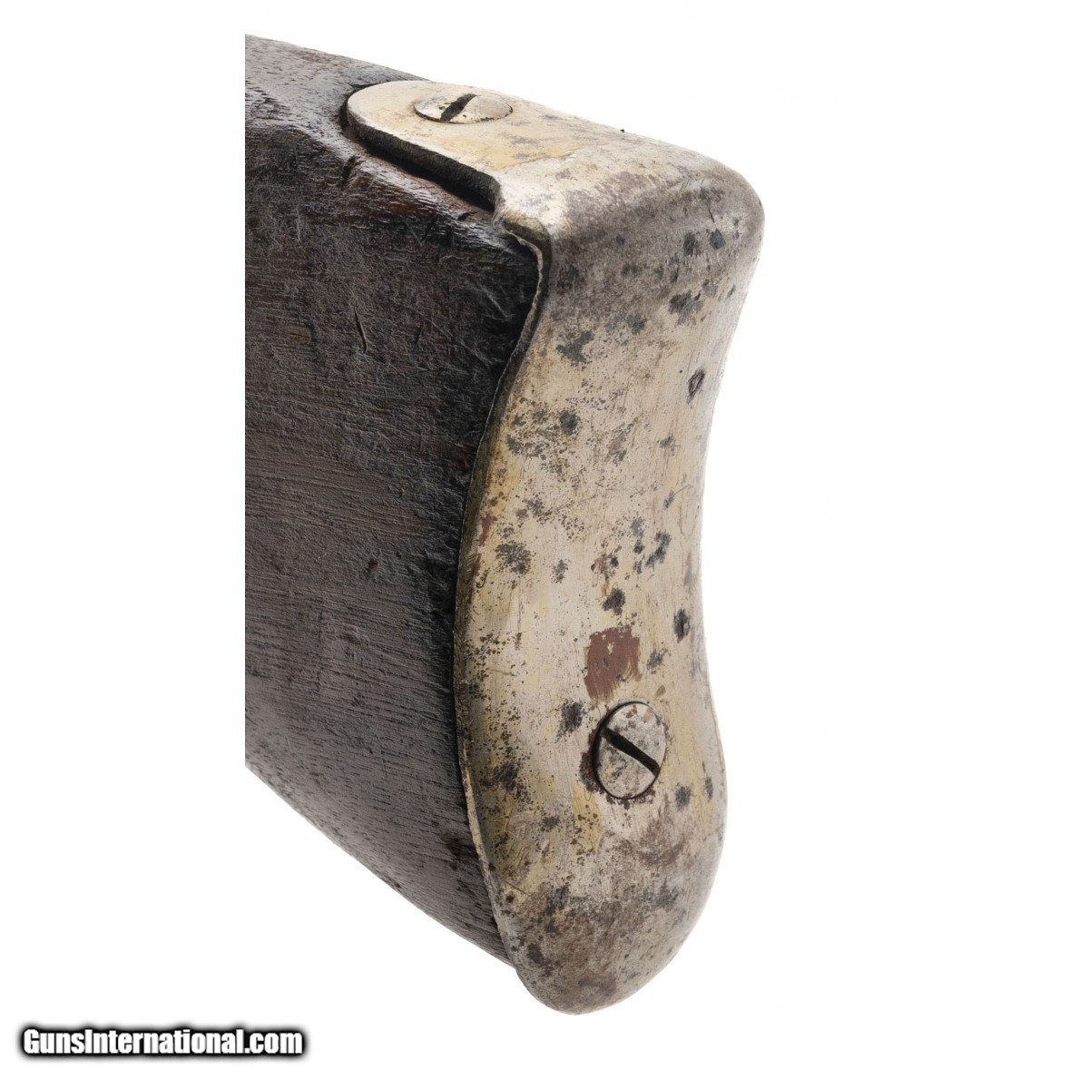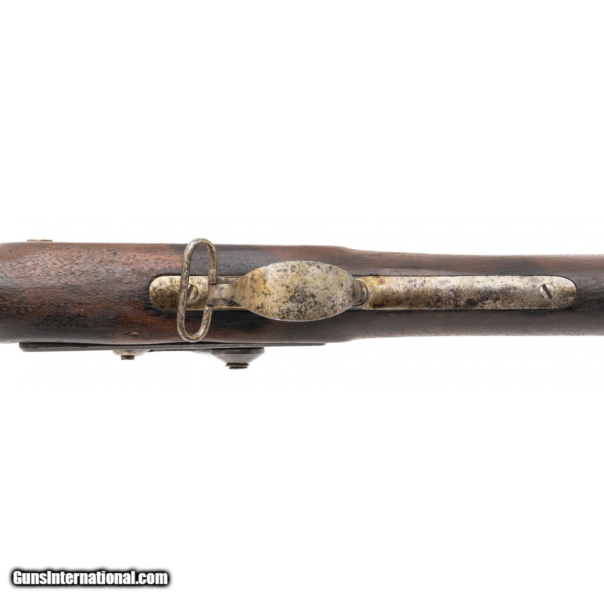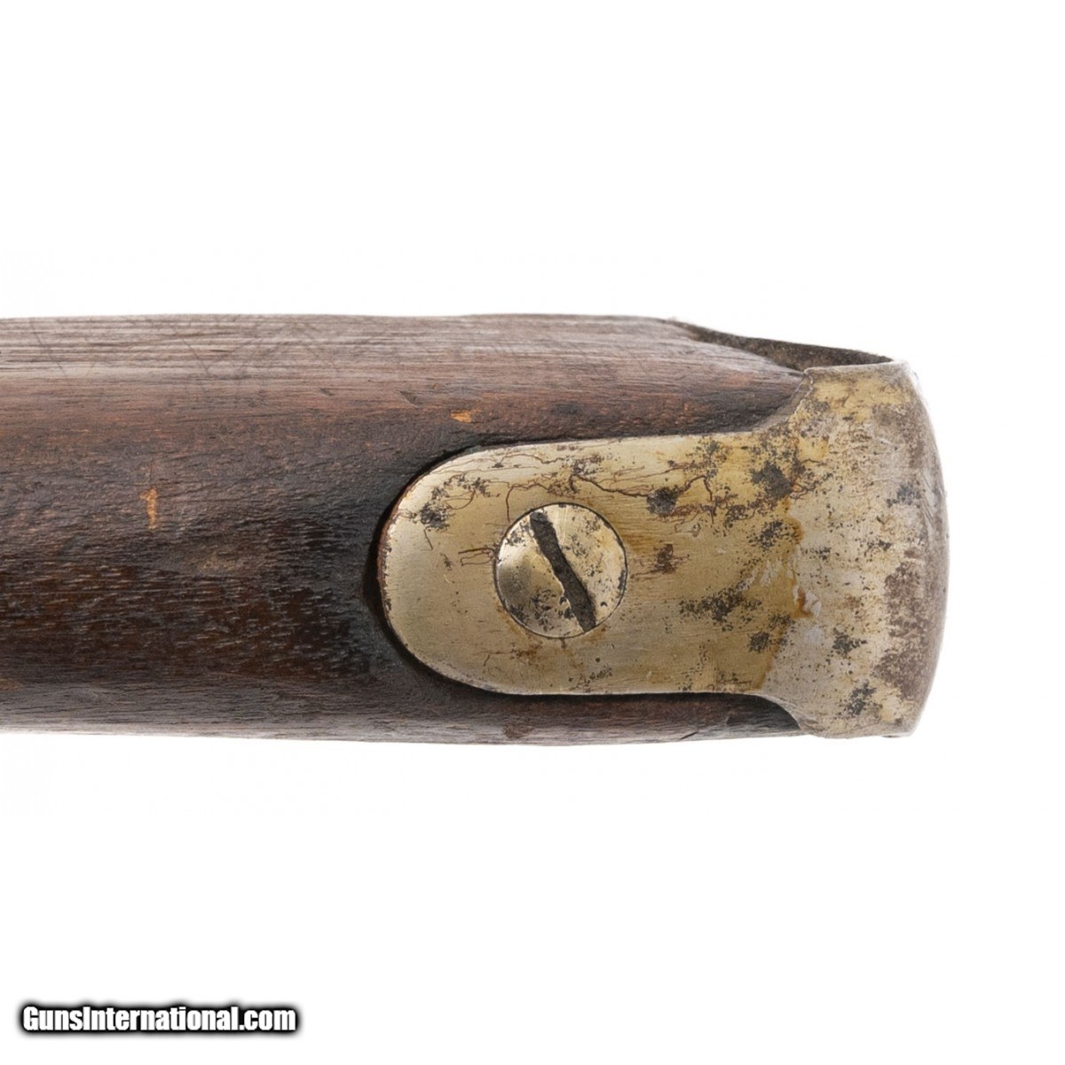 Description: " NSN, made in 1864, .58 caliber, 40"" round barrel. Barrel has been cleaned some time ago with scattered areas of oxidation visible throughout the surface. Lock plate and hammer are a darker patina, lock plate is marked "" Eagle/US-S.N.&W.T.C/FOR/MASSACHUSETTS"". A crack is visible that wraps from one side of the trigger guard to the other, going over the wrist. Nipple is missing and ram-rod is missing, action only holds at half cock. One of 11,000 manufactured for the Civil War. SOLD Antique: Yes |