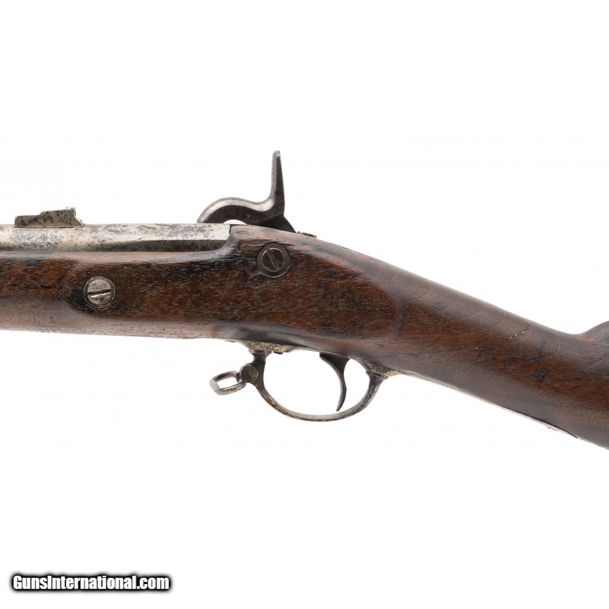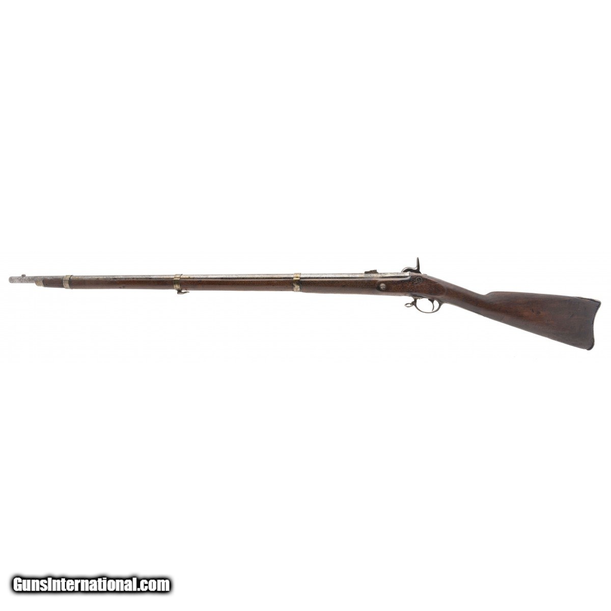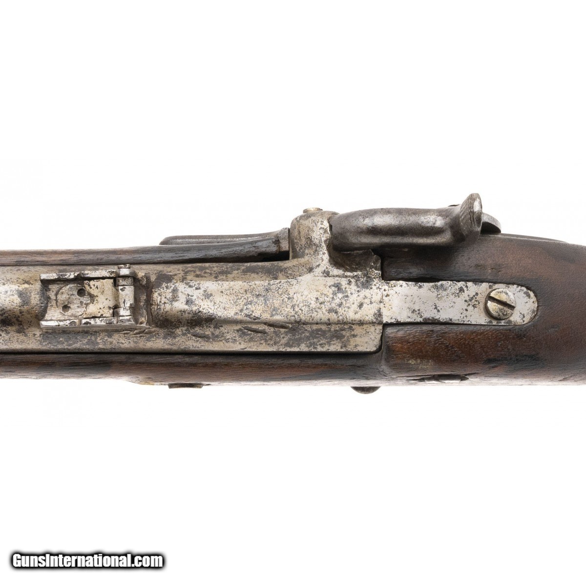 Description: " NSN, made in 1864, .58 caliber, 40"" round barrel. Barrel has been cleaned some time ago with scattered areas of oxidation visible throughout the surface. Lock plate and hammer are a darker patina, lock plate is marked "" Eagle/US-S.N.&W.T.C/FOR/MASSACHUSETTS"". A crack is visible that wraps from one side of the trigger guard to the other, going over the wrist. Nipple is missing and ram-rod is missing, action only holds at half cock. One of 11,000 manufactured for the Civil War. SOLD Antique: Yes |