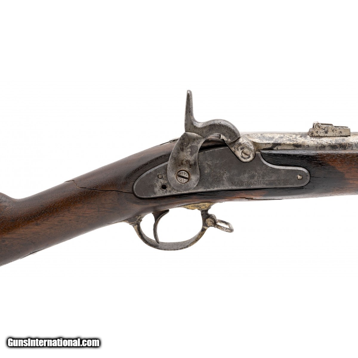 NSN, made in 1864, .58 caliber, 40"" round barrel. Barrel has been cleaned some time ago with scattered areas of oxidation visible throughout the surface. Lock plate and hammer are a darker patina, lock plate is marked "" Eagle/US-S.N.&W.T.C/FOR/MASSACHUSETTS"". A crack is visible that wraps from one side of the trigger guard to the other, going over the wrist. Nipple is missing and ram-rod is missing, action only holds at half cock. One of 11,000 manufactured for the Civil War.