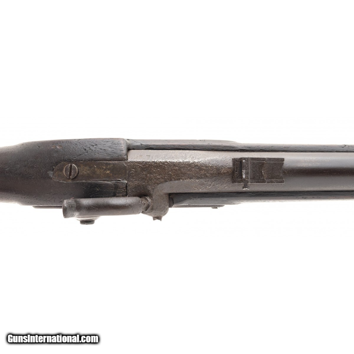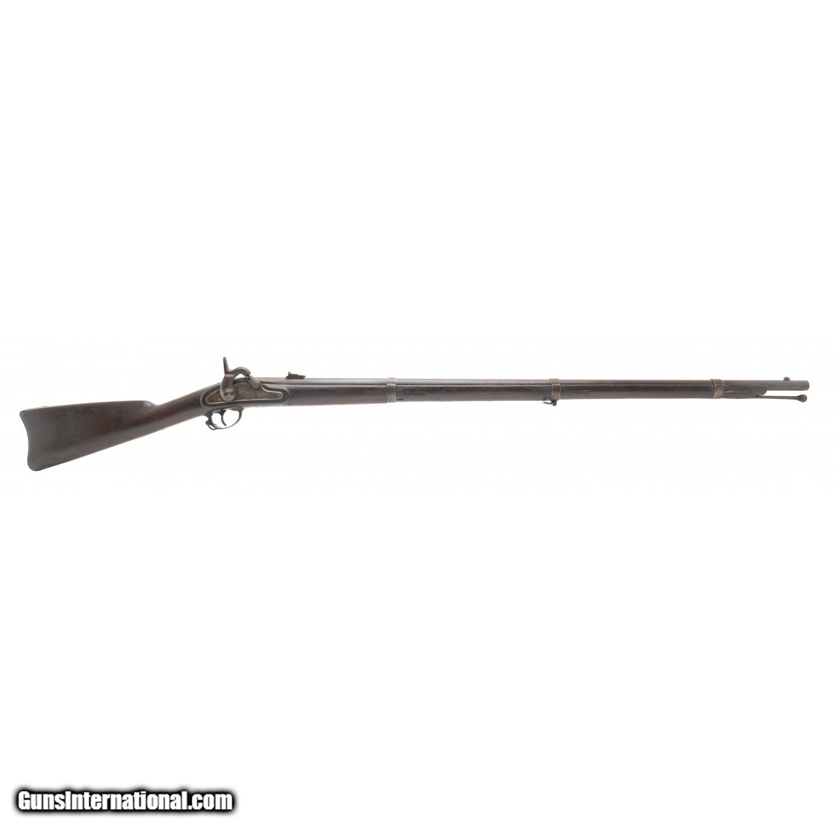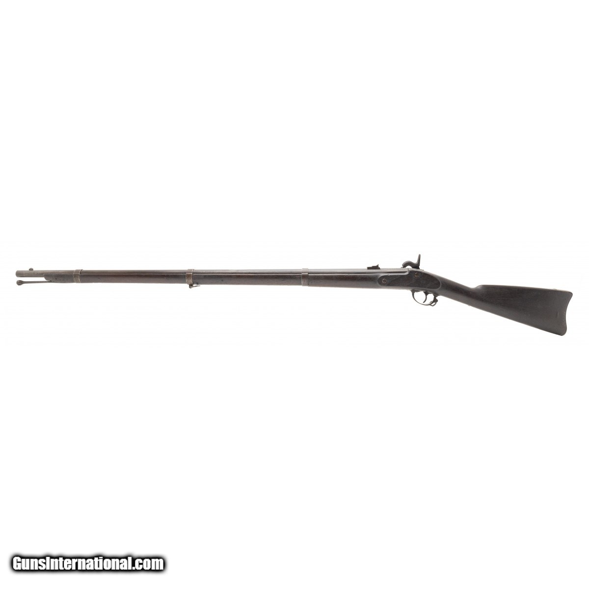 Description: " The U.S. Model 1861 percussion Rifle Musket was made during the Civil War by the Springfield Armory and multiple contractors. This battle-used Model 1861 was made by Alfred Jenks & Son of Bridesburg, PA. All the Jenks rifle muskets are marked ""BRIDESBURG"" on the lock. It is one of 98,464 Jenks delivered during the war. This early Bridesburg rifle musket was manufactured in 1862. The 40"" round 58 caliber barrel has a very good bore with bright, strong rifling. All the metal has a smooth brown patina with the bolster area and top of the lock having moderate firing pitting. The barrel V over P over eagle inspection and proof marks are visible. The lock is marked US over BRIDESBURG with an eagle to the center and 1862 at the tail. The swivels and ramrod are present. The stock is very good with a strong inspection cartouche on the left flat and another one forward of the trigger guard. It exhibits the dents, dings, and scrapes expected of an issue gun but presents very well overall. The action functions correctly. The Bridesburg rifle musket is a basic piece for any Civil War collection. SOLD |