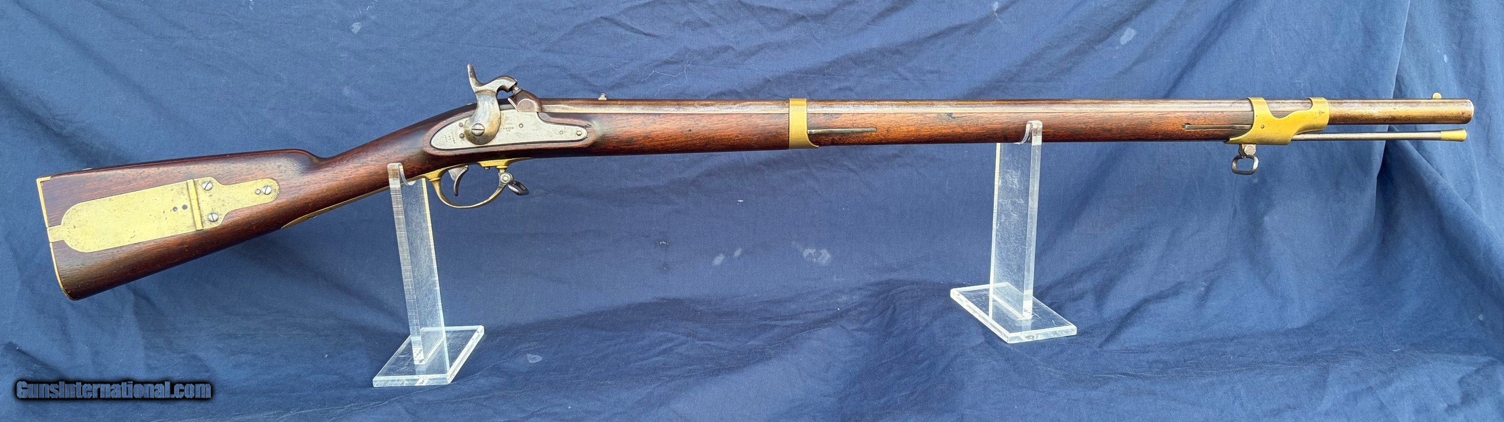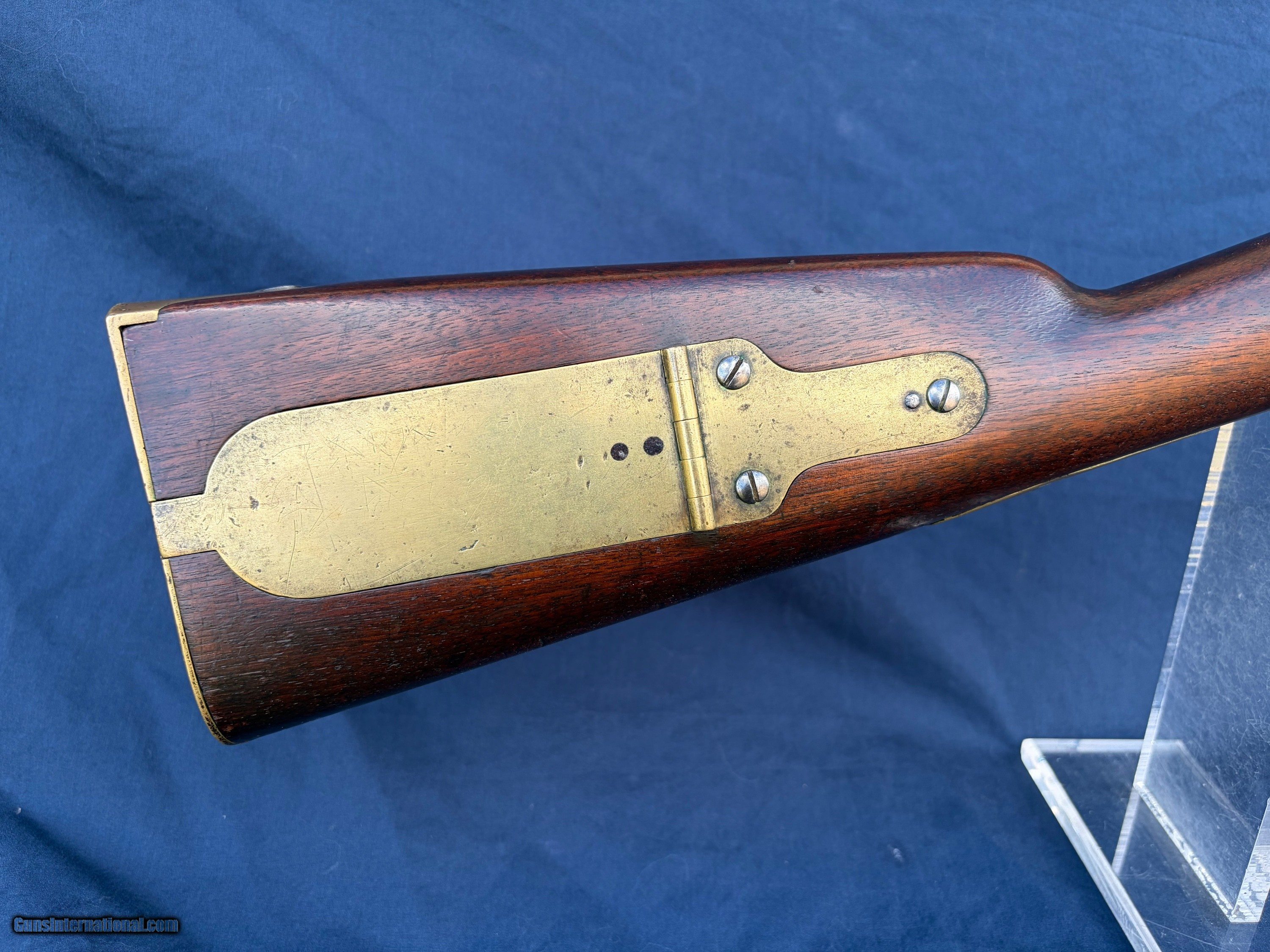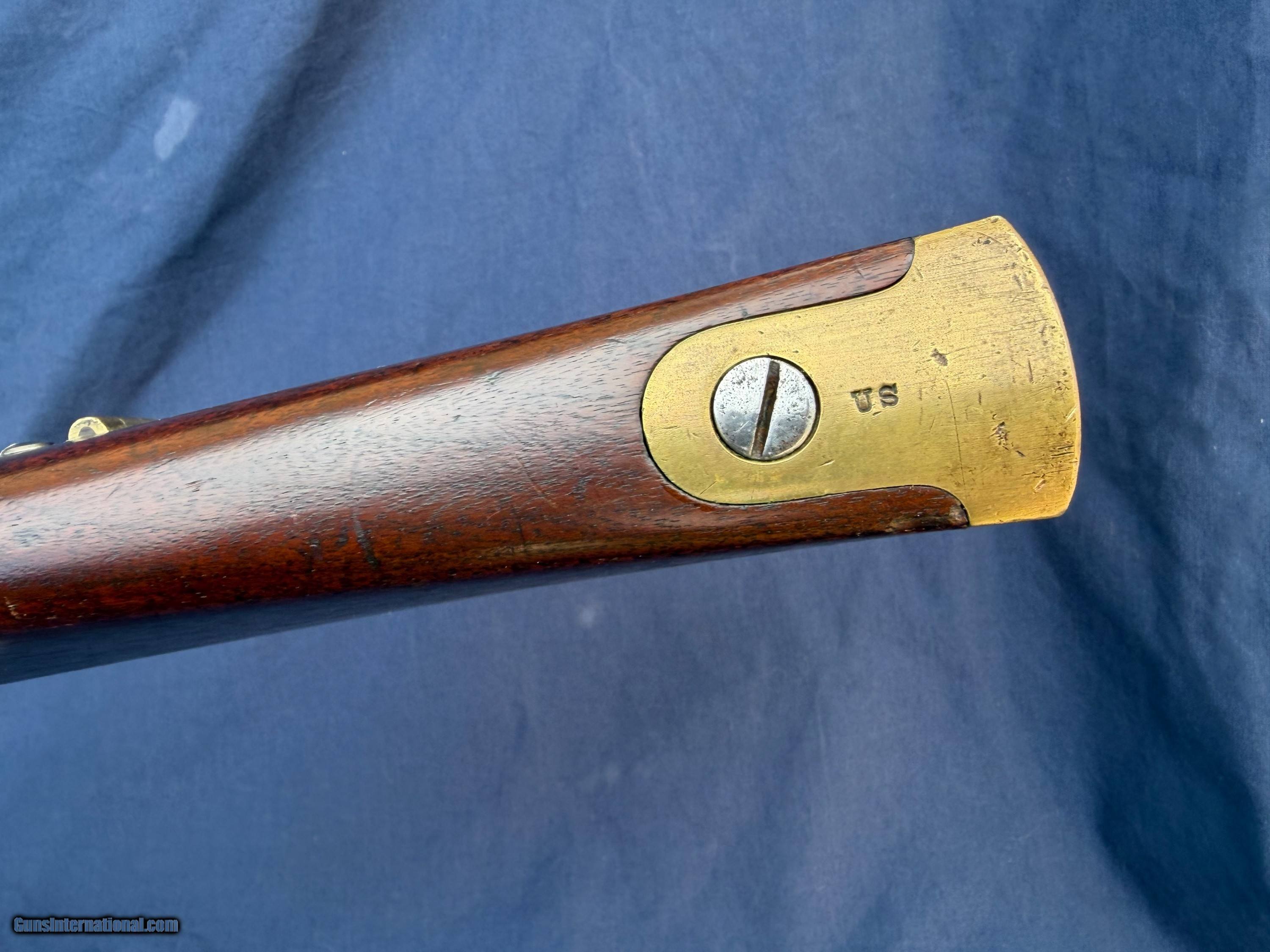 Description: George Tryon of Philadelphia, Pennsylvania manufactured 1841 "Mississippi Rifle". One of 5000 made between 1846 - 1848. Musket barrel with blade front sight, and rear graduated sight. "JCB", "P", smaller P, and with 1848 date on tang. Barrel also marked with "N.J." on left rear flat. Lock marked "Tryon US" in front of hammer and "Philada PA 1848" behind hammer. Walnut wood stock with brass furniture. Stock has both cartouches behind sideplate towards buttstock. Brass buttplate has "US" mark on top. .54 caliber with original ramrod and extra nipple in patch box. 33" barrel exhibits some nice original brown underneath a scattered coat of thin shellac applied many years ago. Action functions as it should. Wood shows normal handling marks, scratches, and scrapes. The usual tiny crack is present from rear lock plate bolt to receiver (see pics). Please feel free to ask questions. I will consider trades. Antique: Yes Price: $2,650.00 Buy Now Contact Seller |