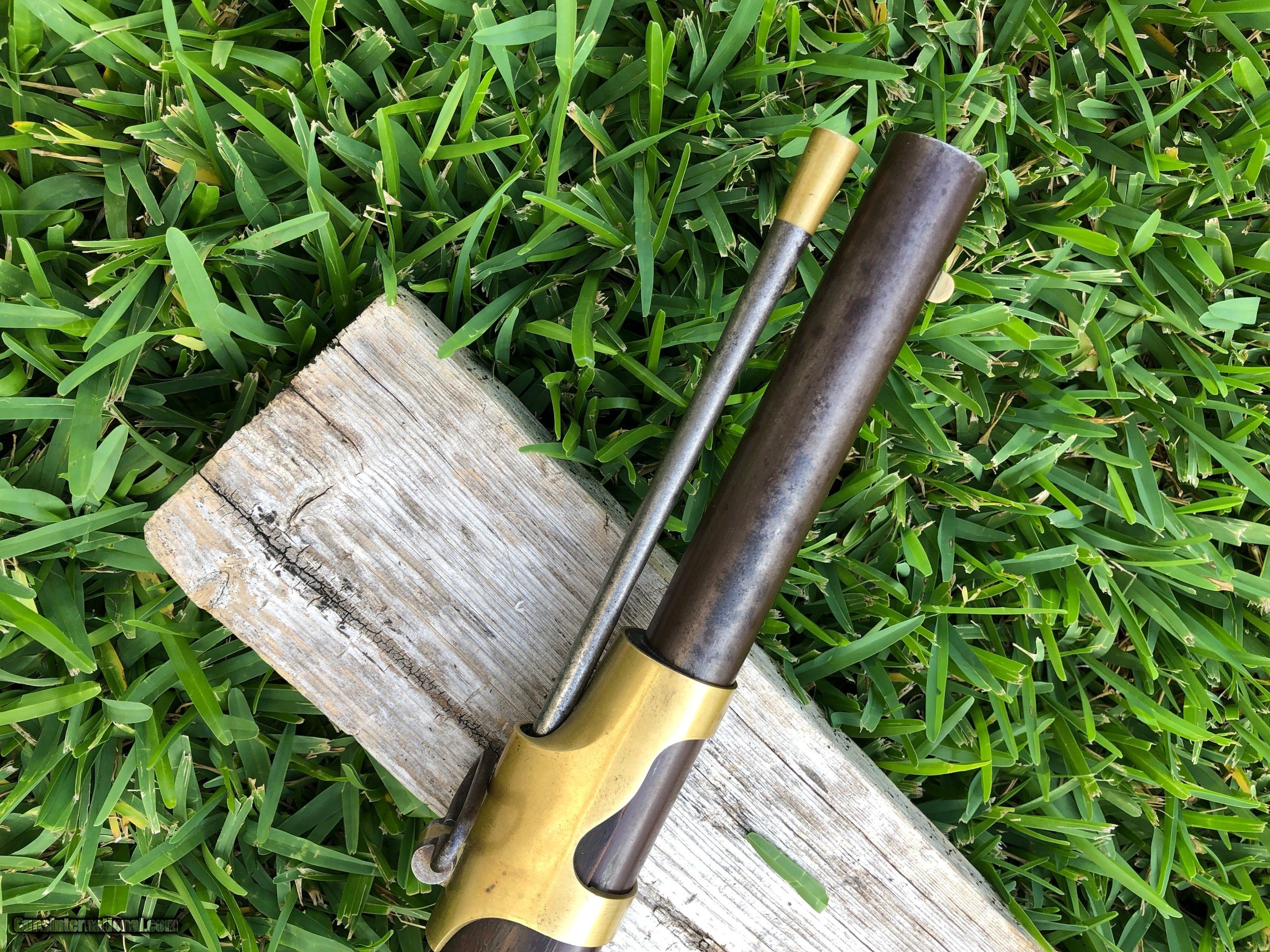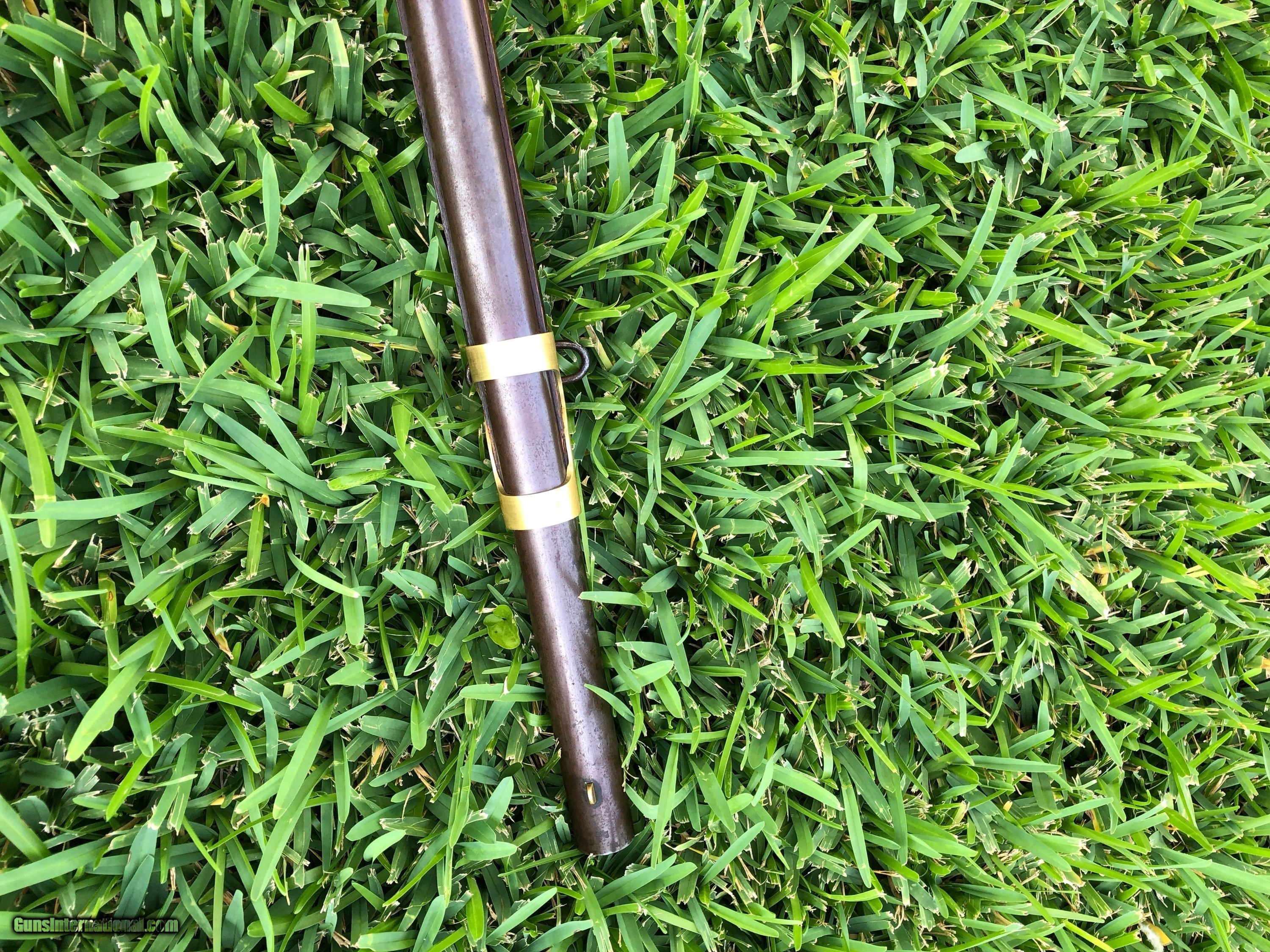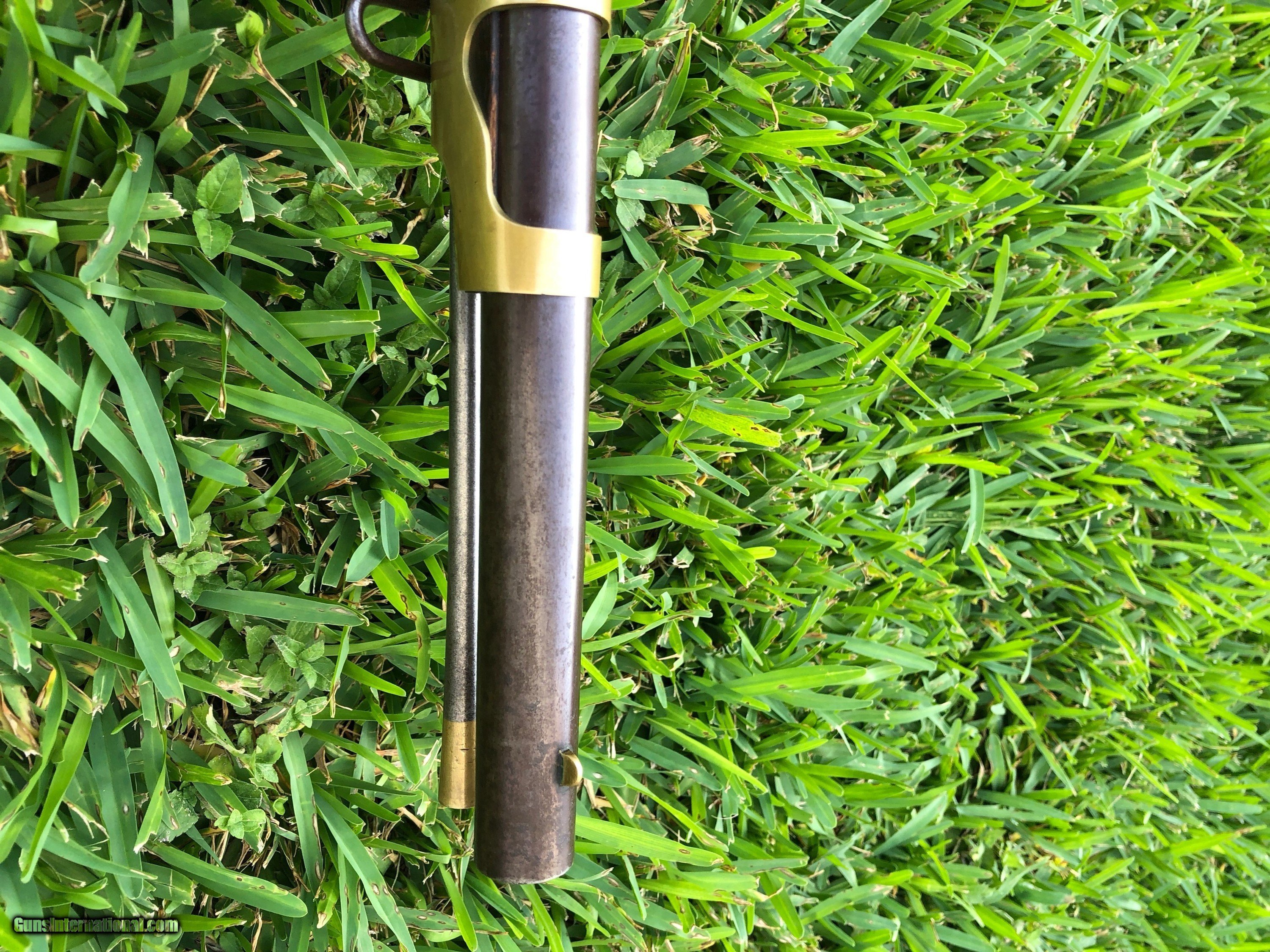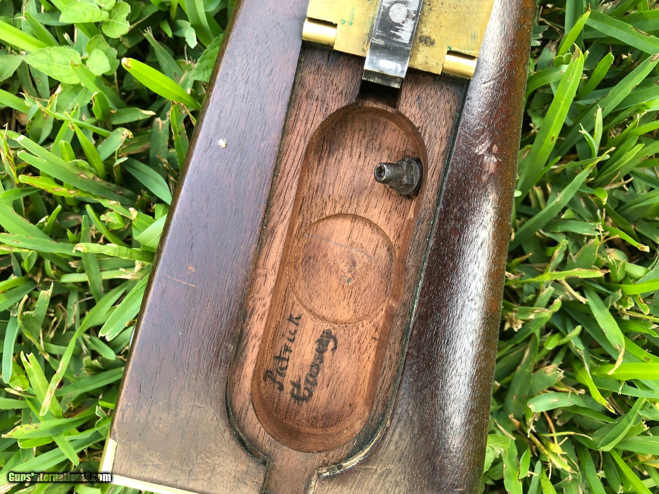 Description: Very nice 1841 Whitney rifle sold to me with 90% original brown that I say is around 80%. Lockplate with a light cleaning showing traces of case colors. Stock is excellent with sharp inspection markings. Bore is fine with a few spots of darkning. All complete and original with a name inked in patchbox and unusual markings on outside of patchbox. Tough to upgrade this one. Free Shipping. SOLD Antique: Yes |