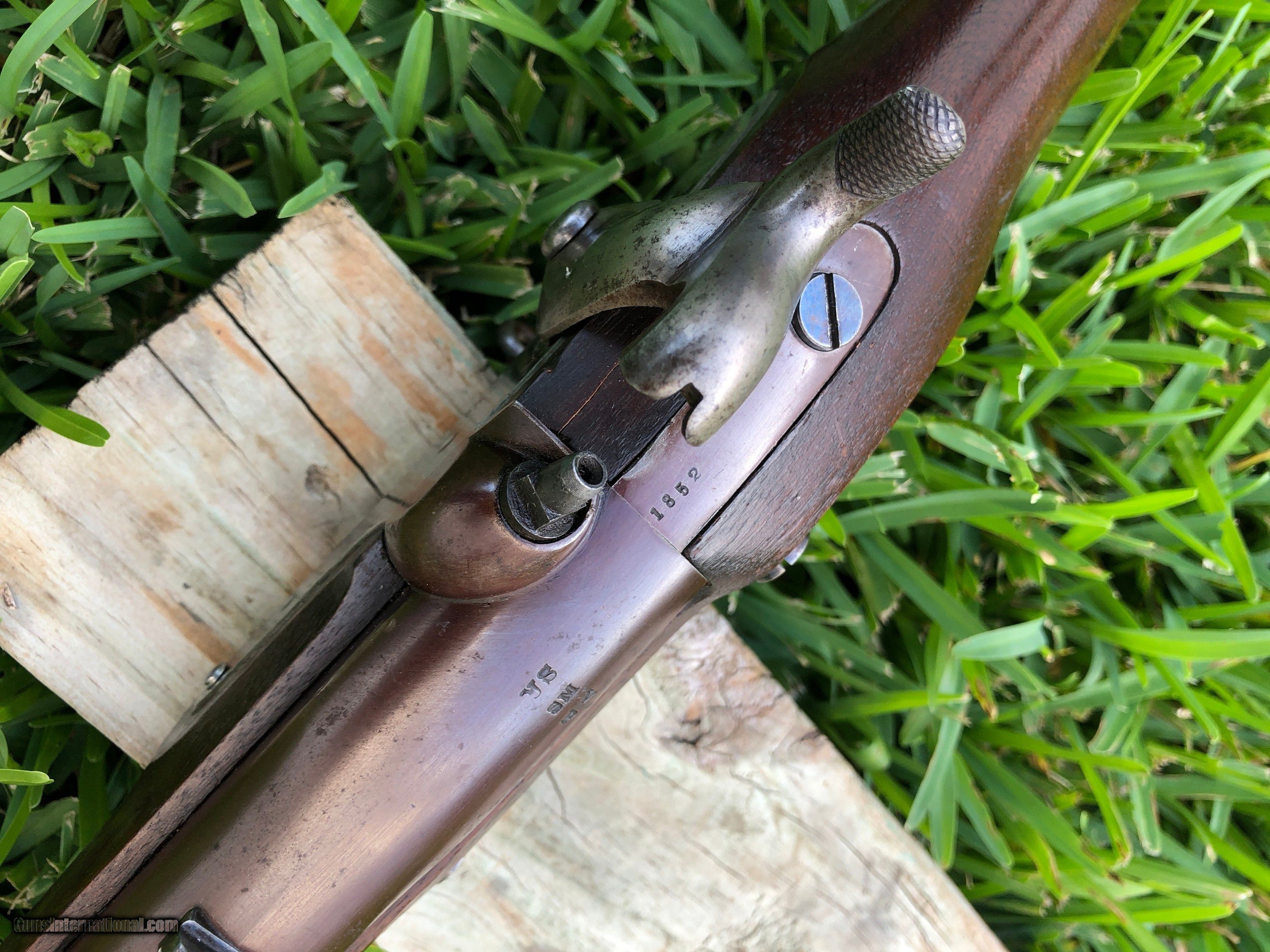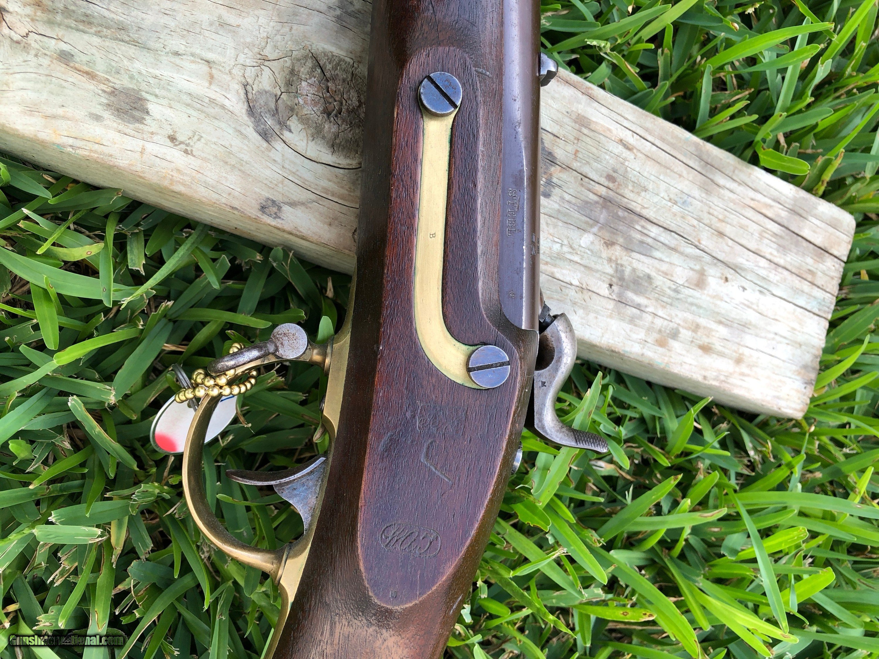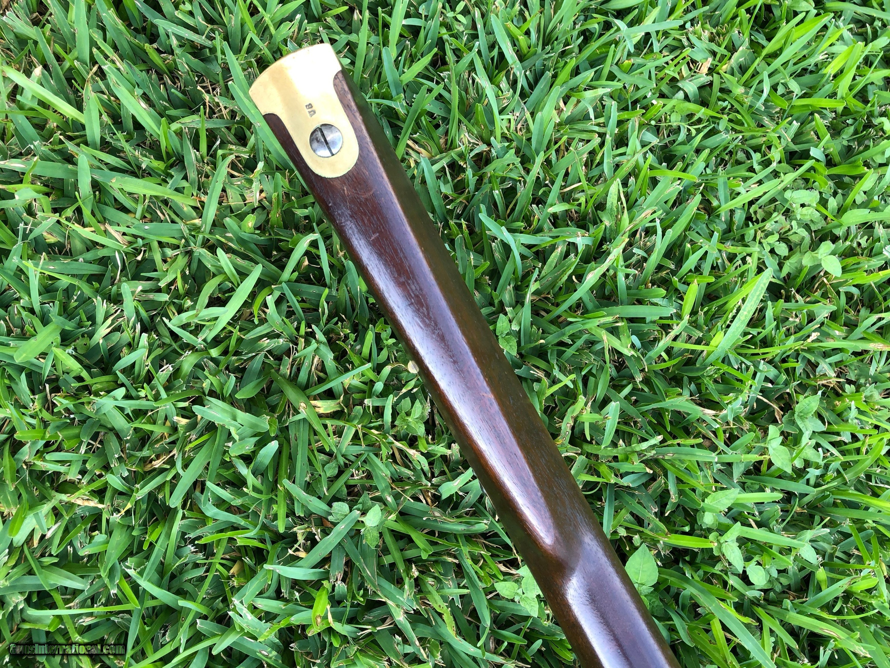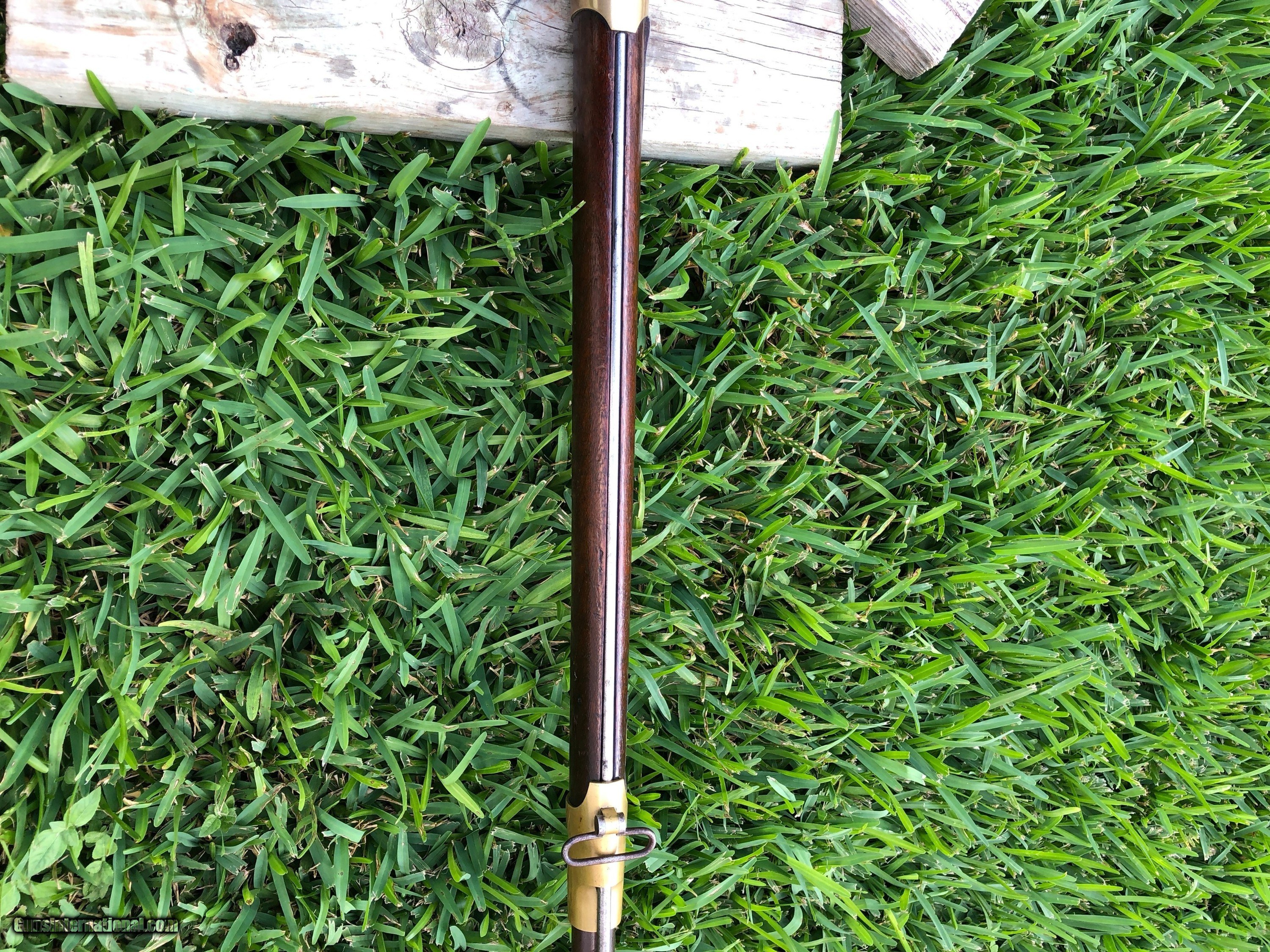 Description: Very nice 1841 Whitney rifle sold to me with 90% original brown that I say is around 80%. Lockplate with a light cleaning showing traces of case colors. Stock is excellent with sharp inspection markings. Bore is fine with a few spots of darkning. All complete and original with a name inked in patchbox and unusual markings on outside of patchbox. Tough to upgrade this one. Free Shipping. SOLD Antique: Yes |
