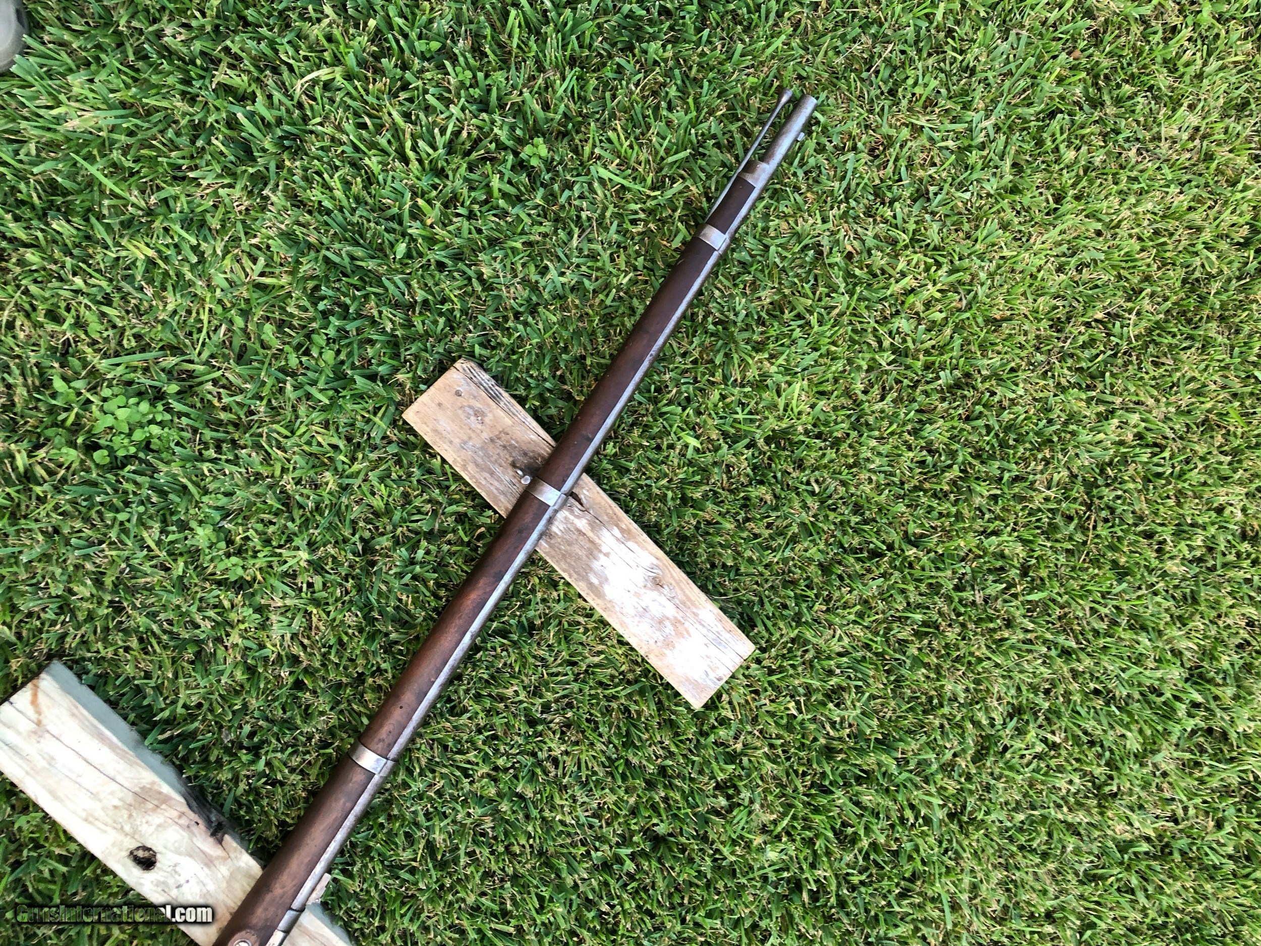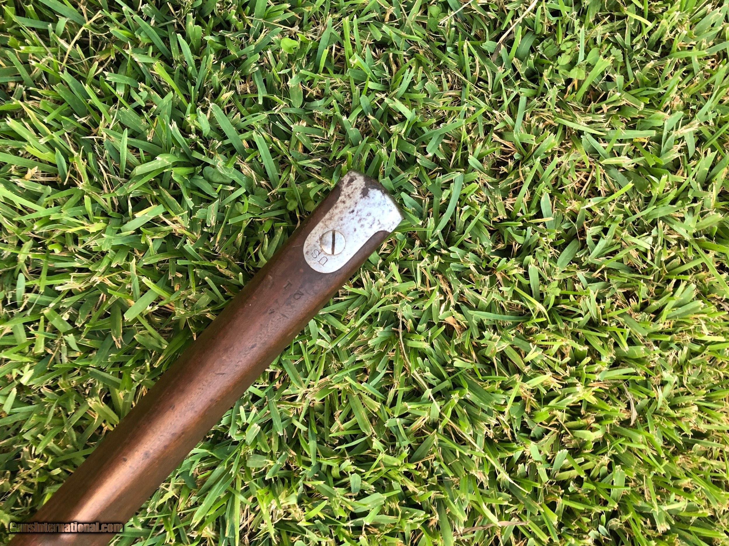 Description: Fine and all original with nice markings and some dark stains and very minor pitting in spots. Wood is very sharp with a gouge behind the front lockplate screw on opposite side and one in front of second barrel band. Hammer will hold a first cock but not the second. SOLD Antique: Yes |