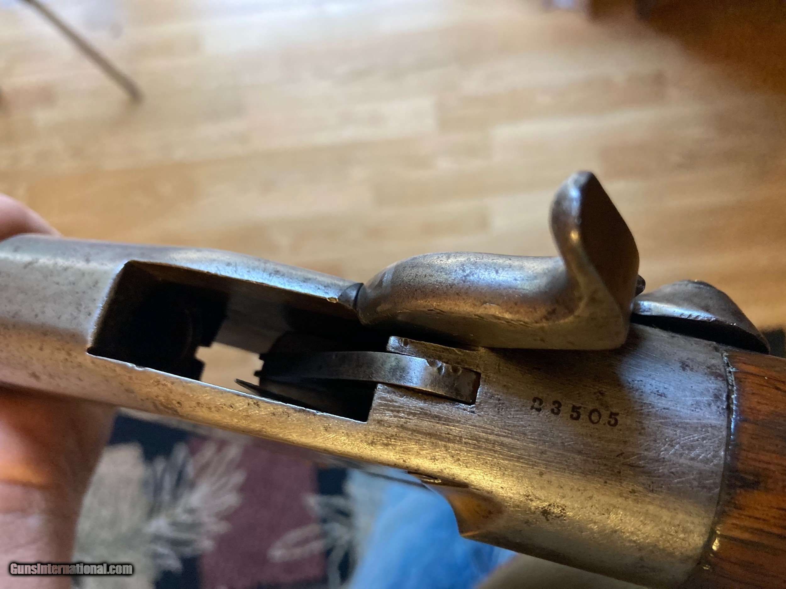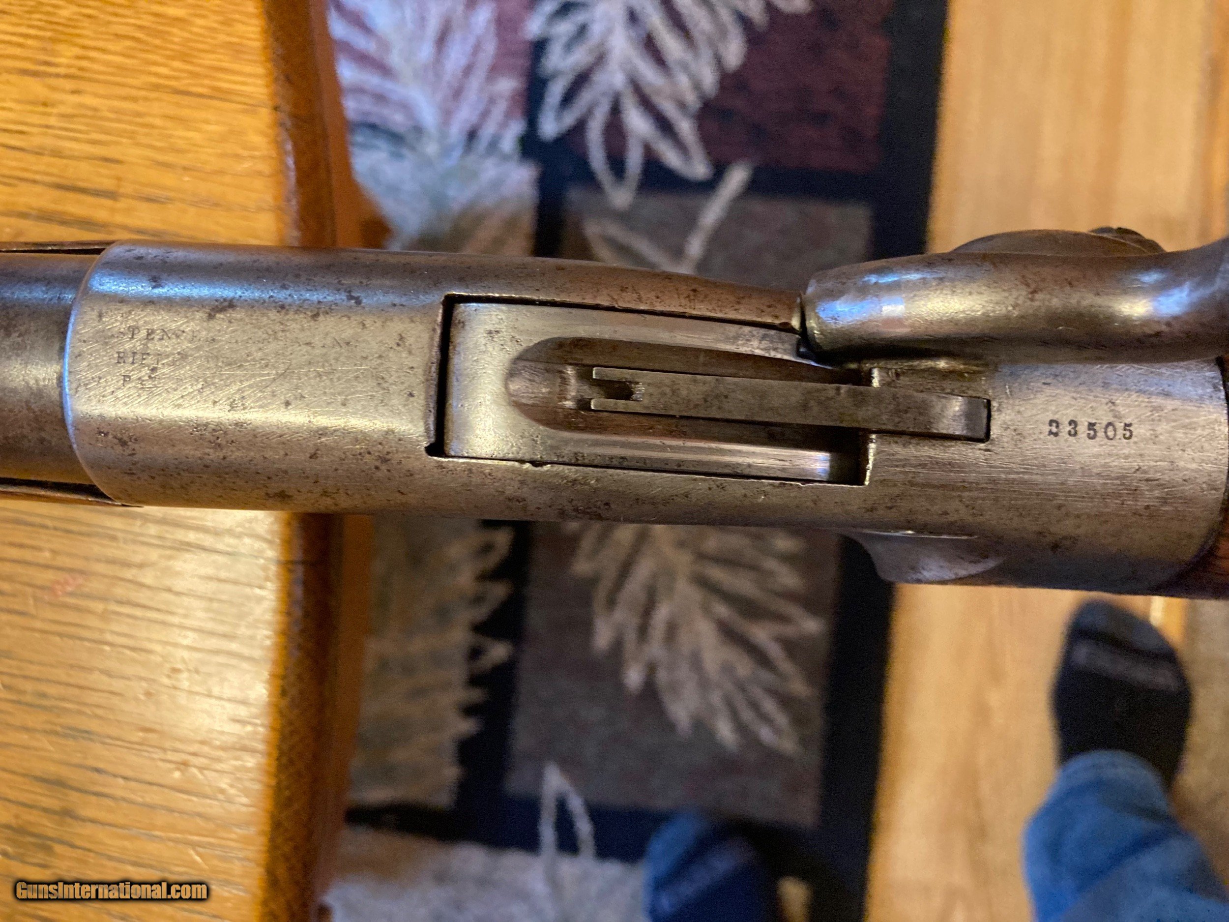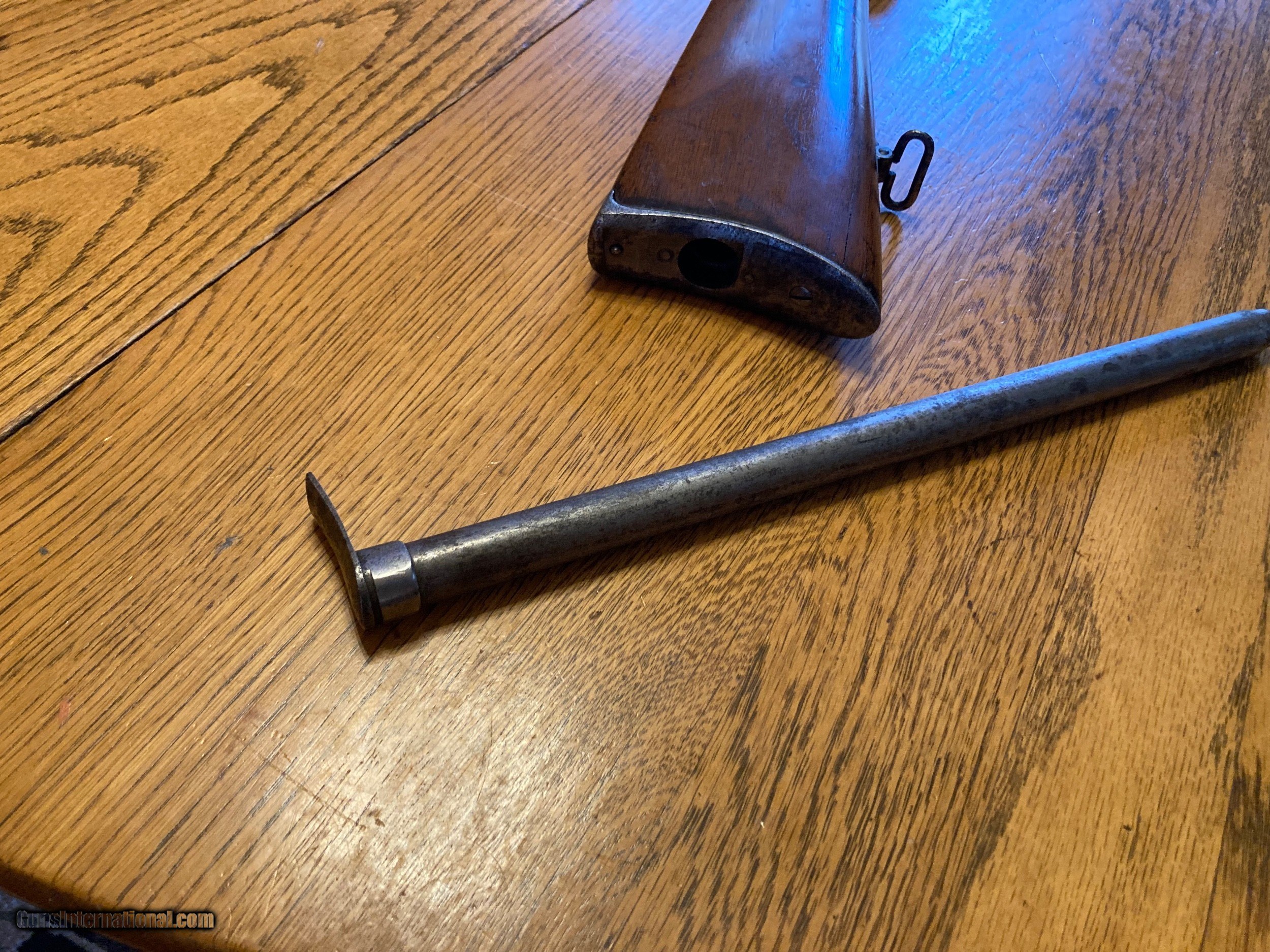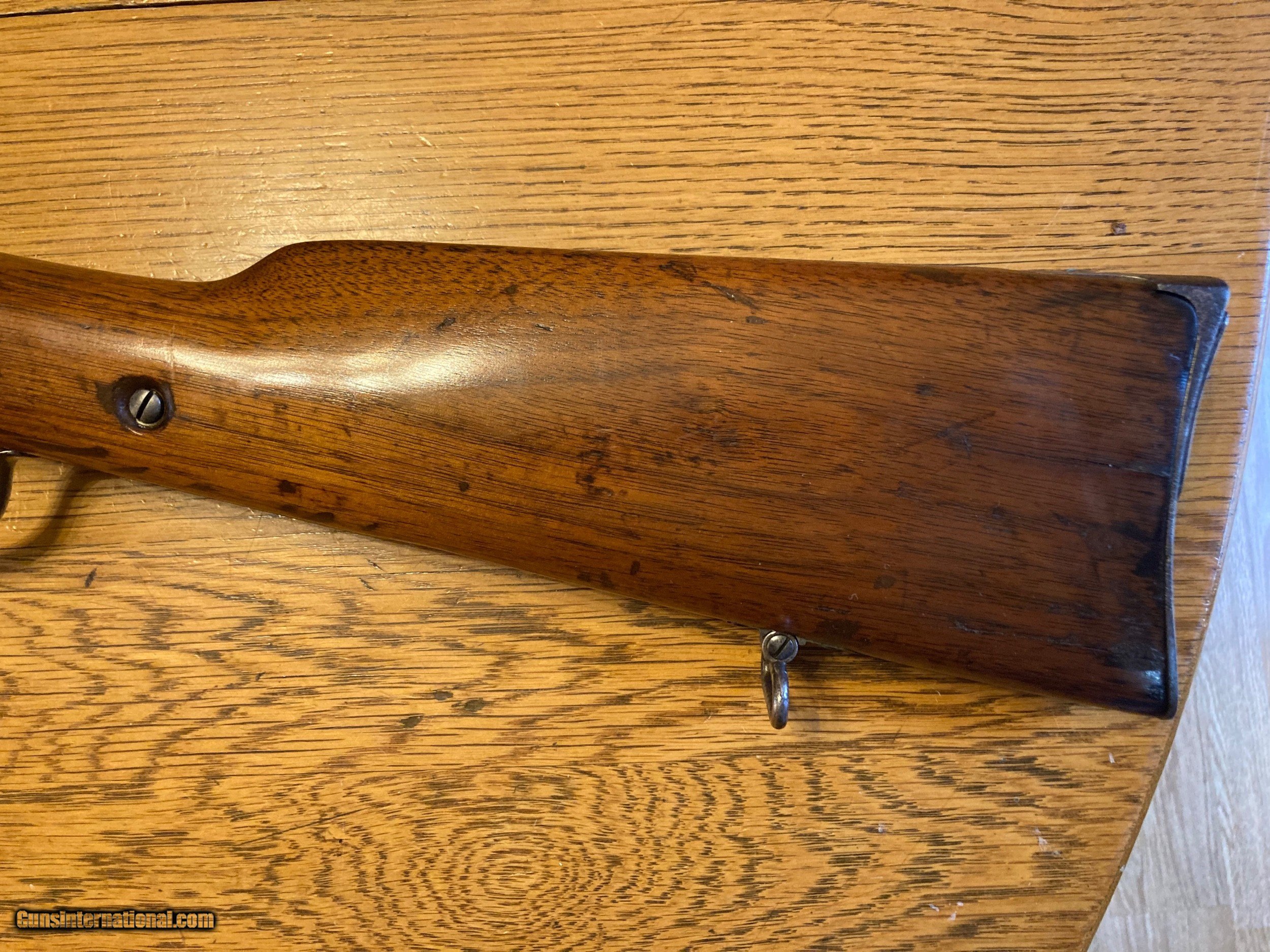 Description: On Hold Sale Pending Original Antique 1860 Spencer rifle. The original stock 2 piece stock is in good condition but has been sanded or cleaned. The rifle is full 3 bands with a 30" barrel. The metal has also been cleaned leaving the Spencer address only partially visible and the metal is grey brown with some scattered light pitting. These shot the 52 caliber 56-56 Rim fire Spencer cartridge. The serial number is 23,505 on the receiver and under the barrel. This rare gun seems complete with the spring loaded loading tube. The bore looks pretty good also and the action functions fine. Feel free to contact me with any questions. Shipping will be actuall cost by insured usps priority mail with tracking. On Hold Sale Pending SOLD Antique: Yes |