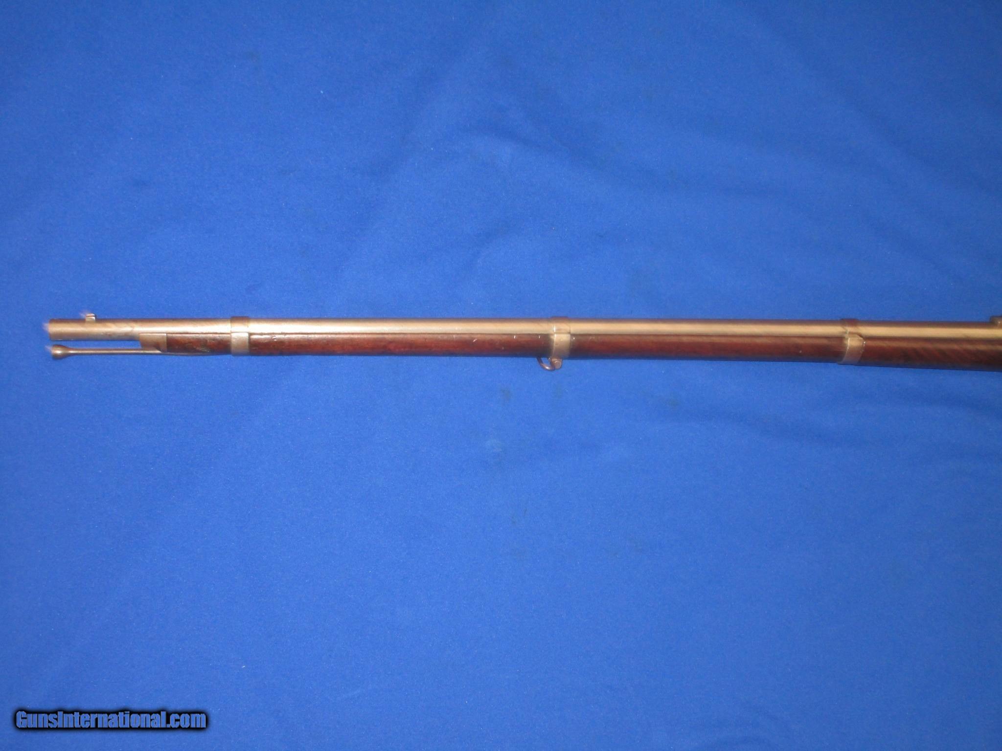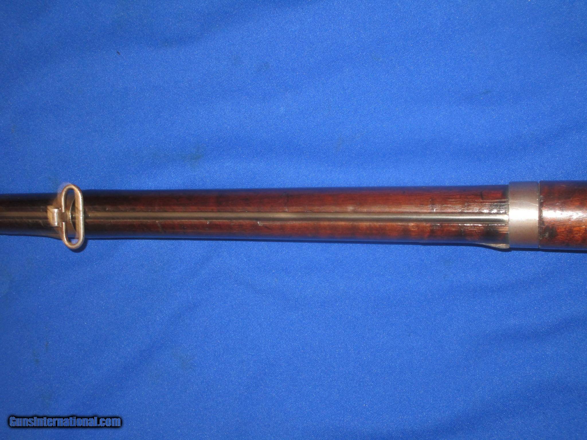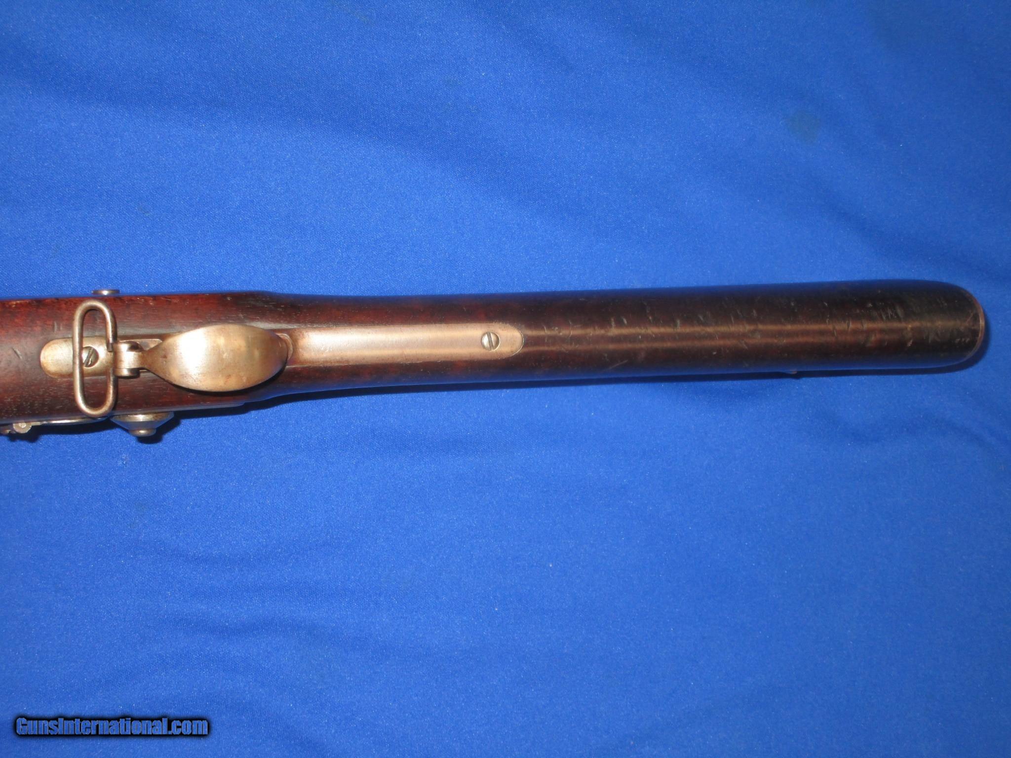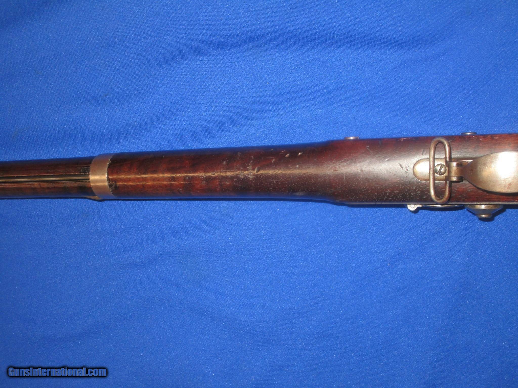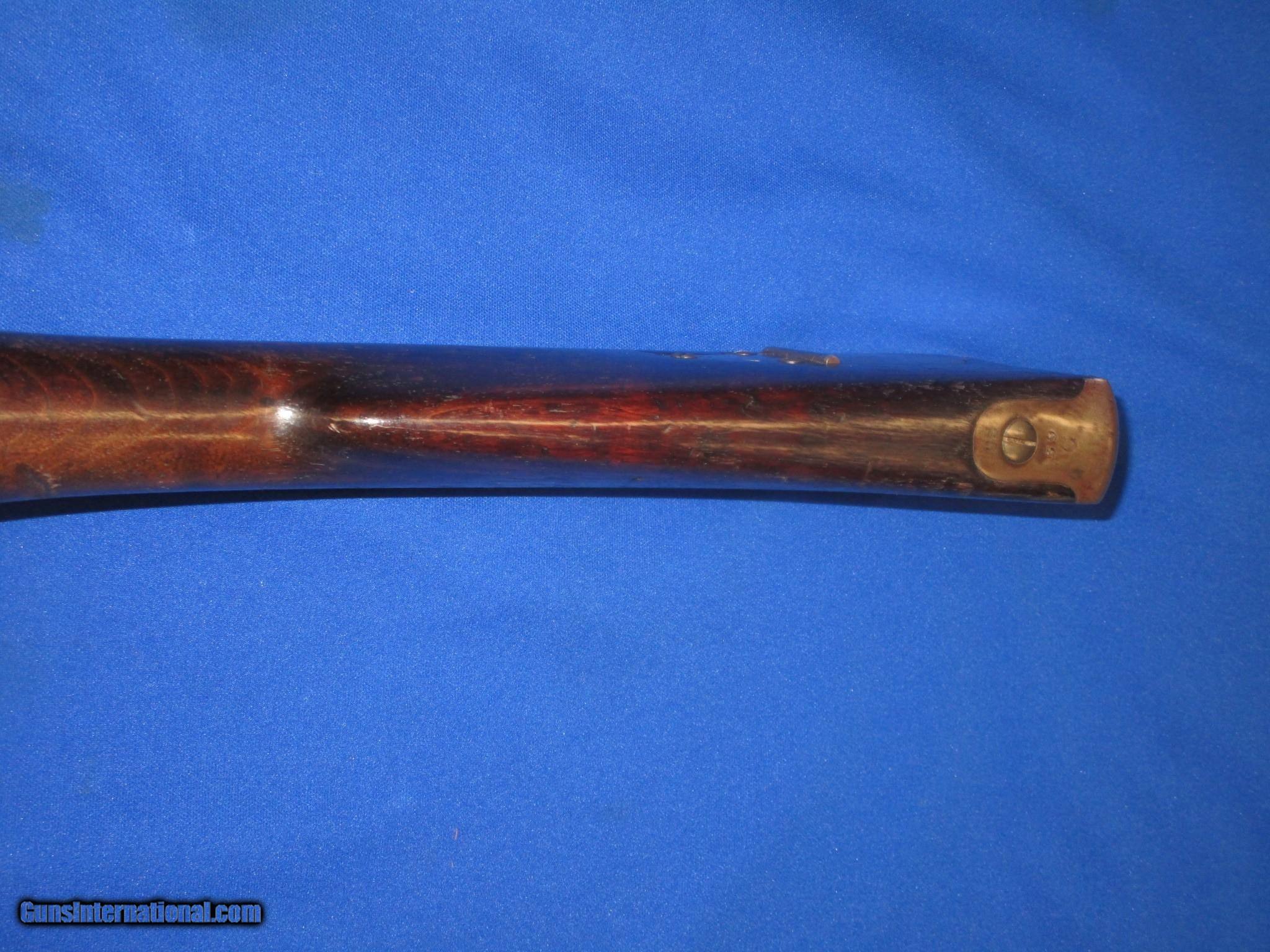 Description: A Scarce U.S. Civil War Springfield Model 1855 Percussion Rifle Musket With Patchbox And dated 1860 In Very Good Untouched Condition. All original and complete. The Musket has nice metal and markings. The lock is marked "U.S. Springfield, & dated 1860. It has a clear Eagle on the Maynard primer Door. THe barrel is marked with a "VP & Eagle" and is also dated 1860. There is a "#39", & a letter "G" on the top of the butt plate. These are most likely regimental markings. All of the metal on the gun has a natural light patina on it. The wood on the gun is fine throughout with nice edges. It has a very nice grain and color to it. There is a very clear "E.S.A." U.S. Inspectors cartouche on the backside. It has a fine bore and action. This Is A Very Nice Looking Example Of A U.S. Civil War Springfield Model 1855 Percussion Rifle Musket Dated 1860 And With A Very Scarce Patchbox. These Springfield 1855 Muskets Are Very Hard To Come By! SOLD Antique: Yes Manufacturer: SPRINGFIELD Model: 1855 RIFLE MUSKET Condition: VERY GOOD Metal Condition: VERY GOOD Wood Condition: VERY GOOD PLUS Bore Condition: VERY GOOD PLUS |