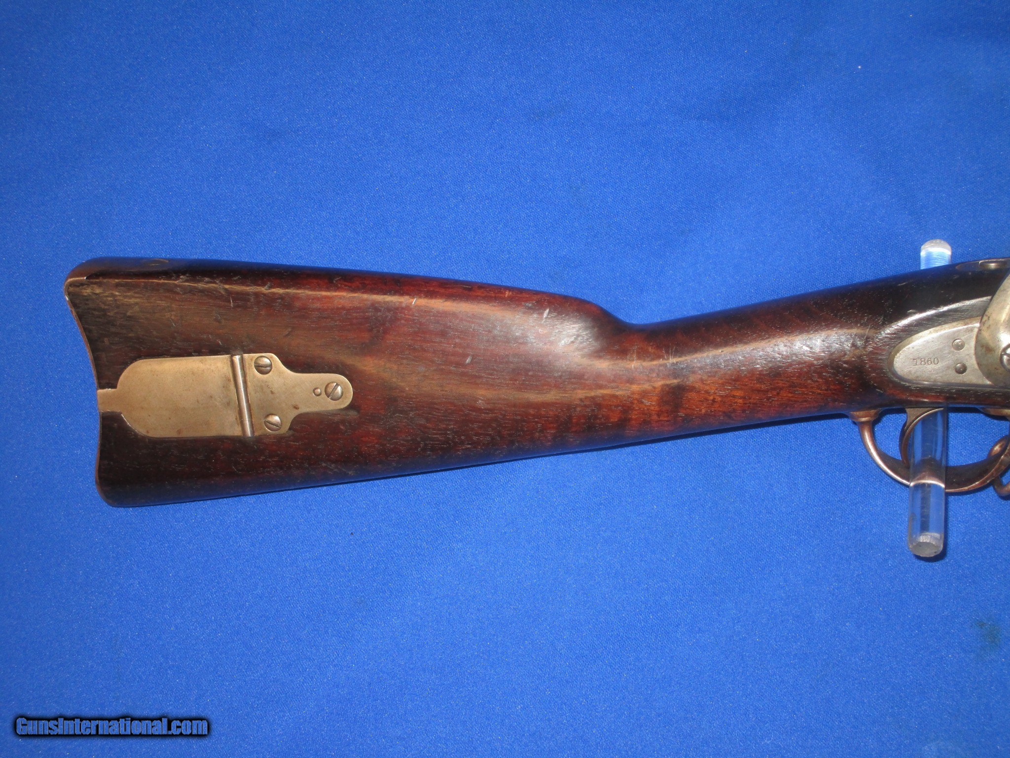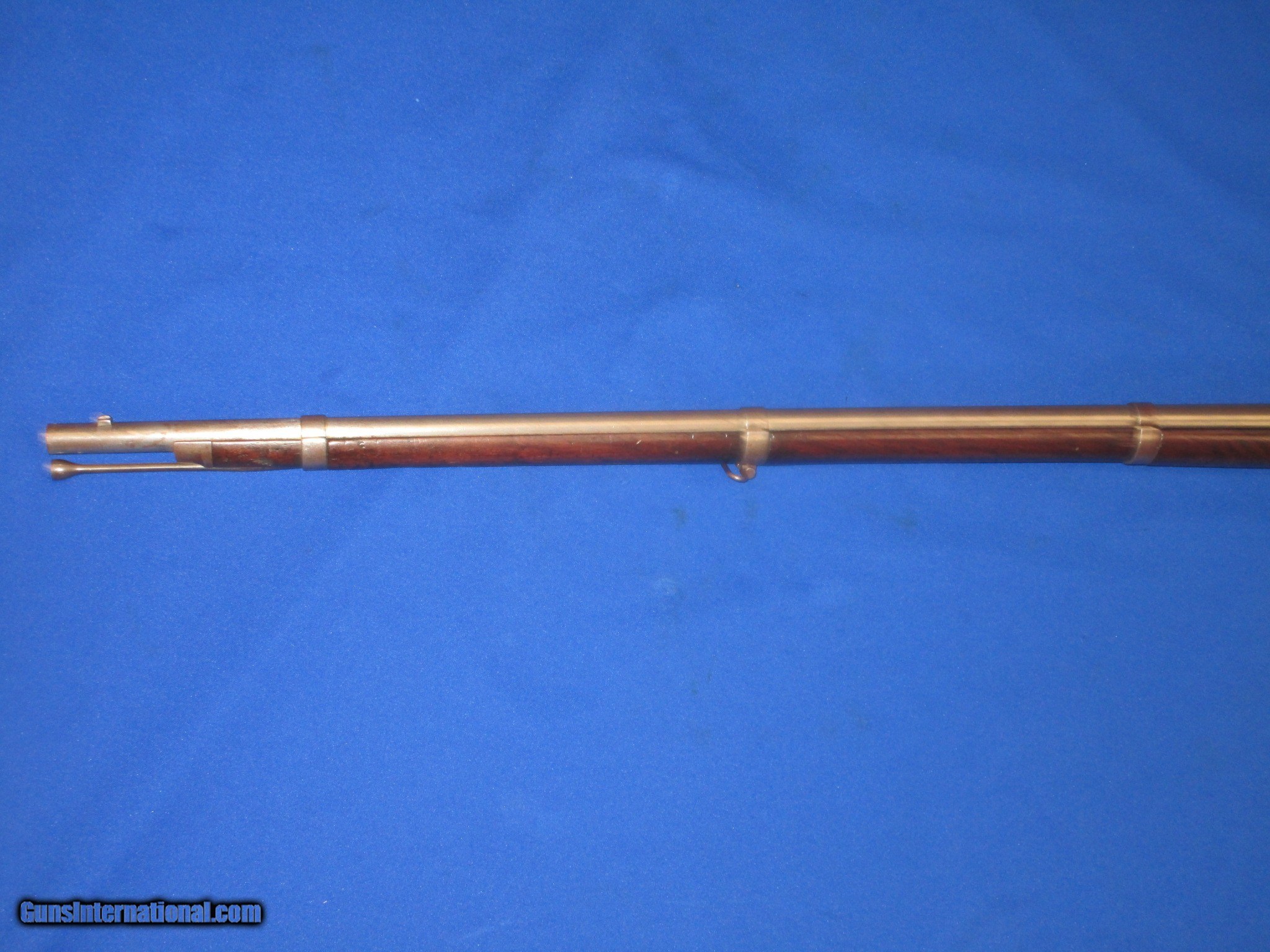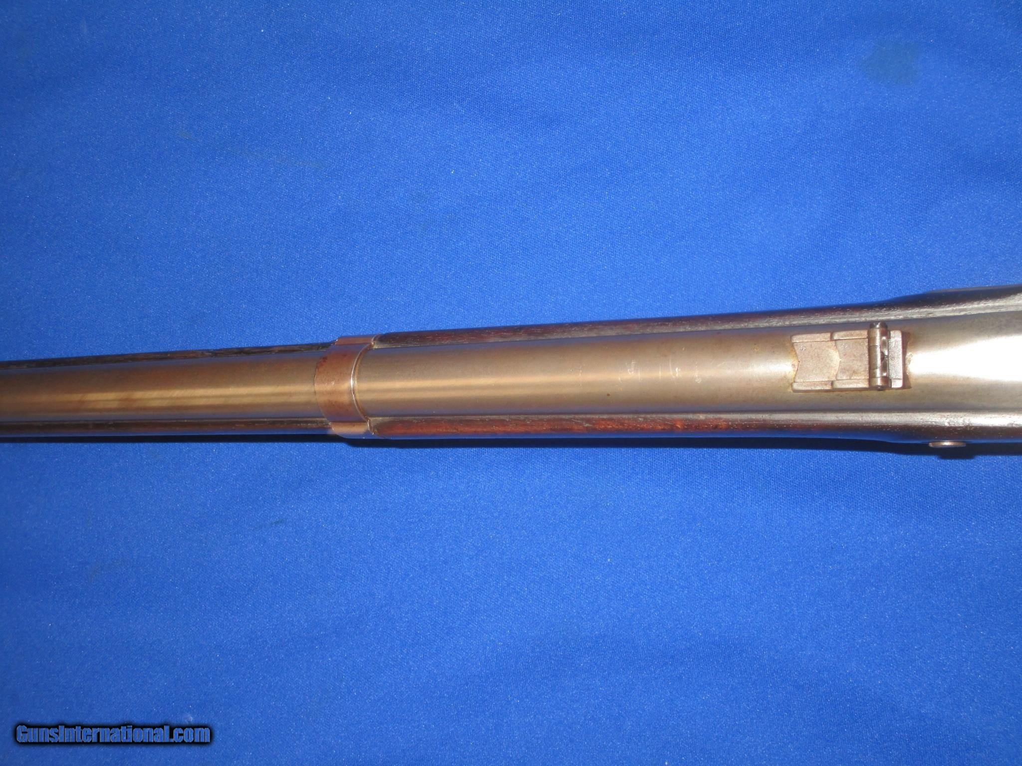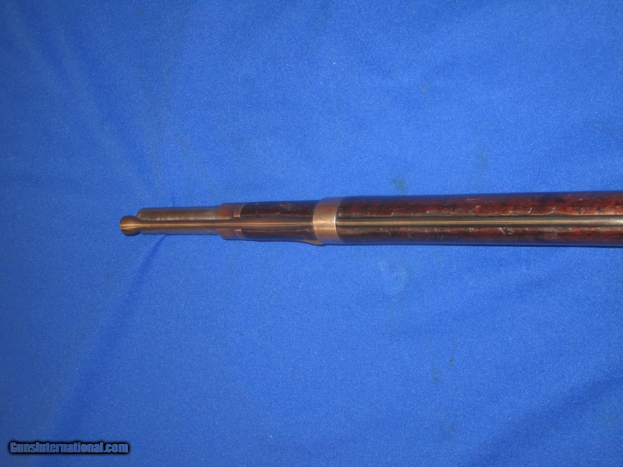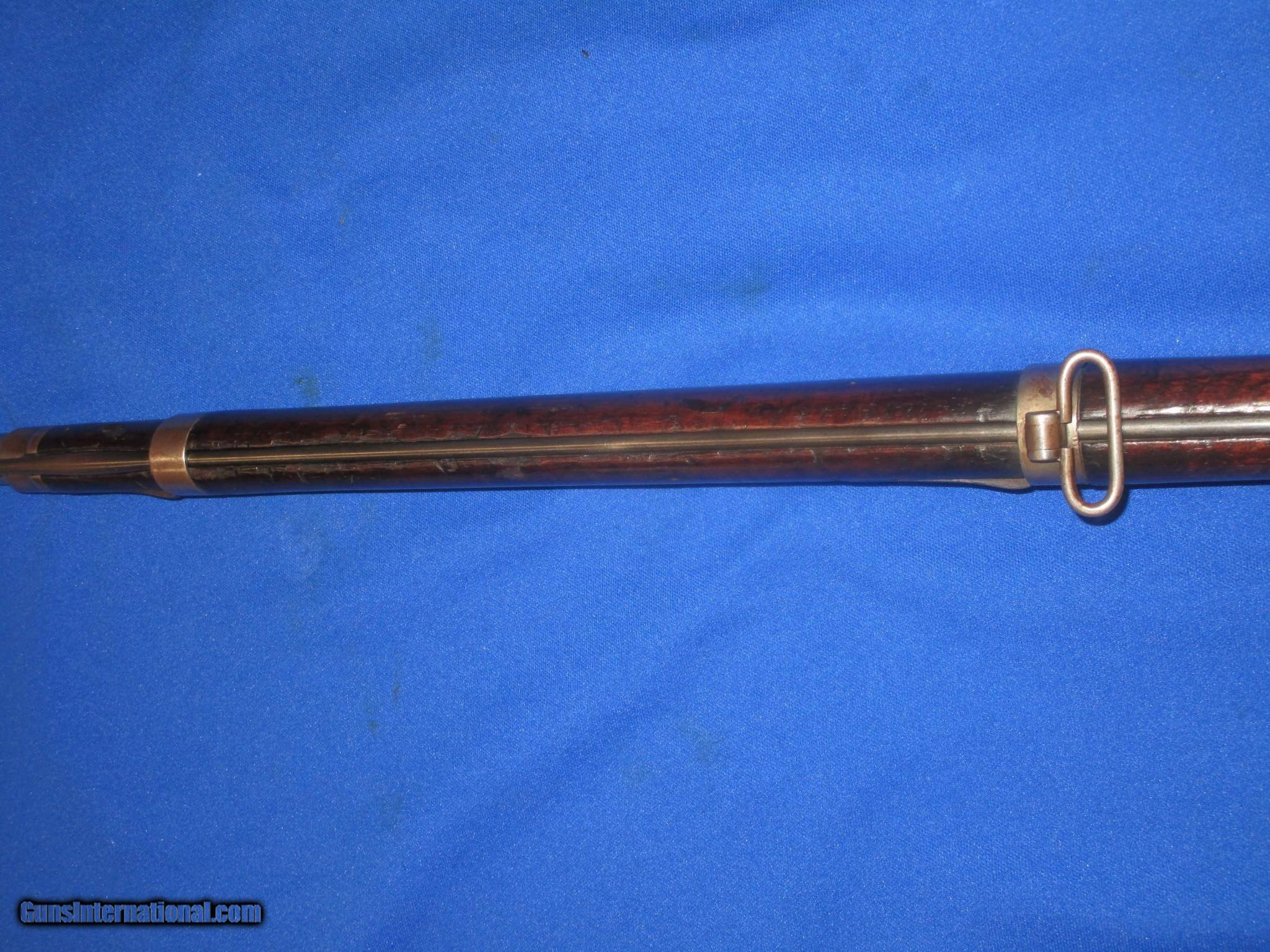 Description: A Scarce U.S. Civil War Springfield Model 1855 Percussion Rifle Musket With Patchbox And dated 1860 In Very Good Untouched Condition. All original and complete. The Musket has nice metal and markings. The lock is marked "U.S. Springfield, & dated 1860. It has a clear Eagle on the Maynard primer Door. THe barrel is marked with a "VP & Eagle" and is also dated 1860. There is a "#39", & a letter "G" on the top of the butt plate. These are most likely regimental markings. All of the metal on the gun has a natural light patina on it. The wood on the gun is fine throughout with nice edges. It has a very nice grain and color to it. There is a very clear "E.S.A." U.S. Inspectors cartouche on the backside. It has a fine bore and action. This Is A Very Nice Looking Example Of A U.S. Civil War Springfield Model 1855 Percussion Rifle Musket Dated 1860 And With A Very Scarce Patchbox. These Springfield 1855 Muskets Are Very Hard To Come By! SOLD Antique: Yes Manufacturer: SPRINGFIELD Model: 1855 RIFLE MUSKET Condition: VERY GOOD Metal Condition: VERY GOOD Wood Condition: VERY GOOD PLUS Bore Condition: VERY GOOD PLUS |