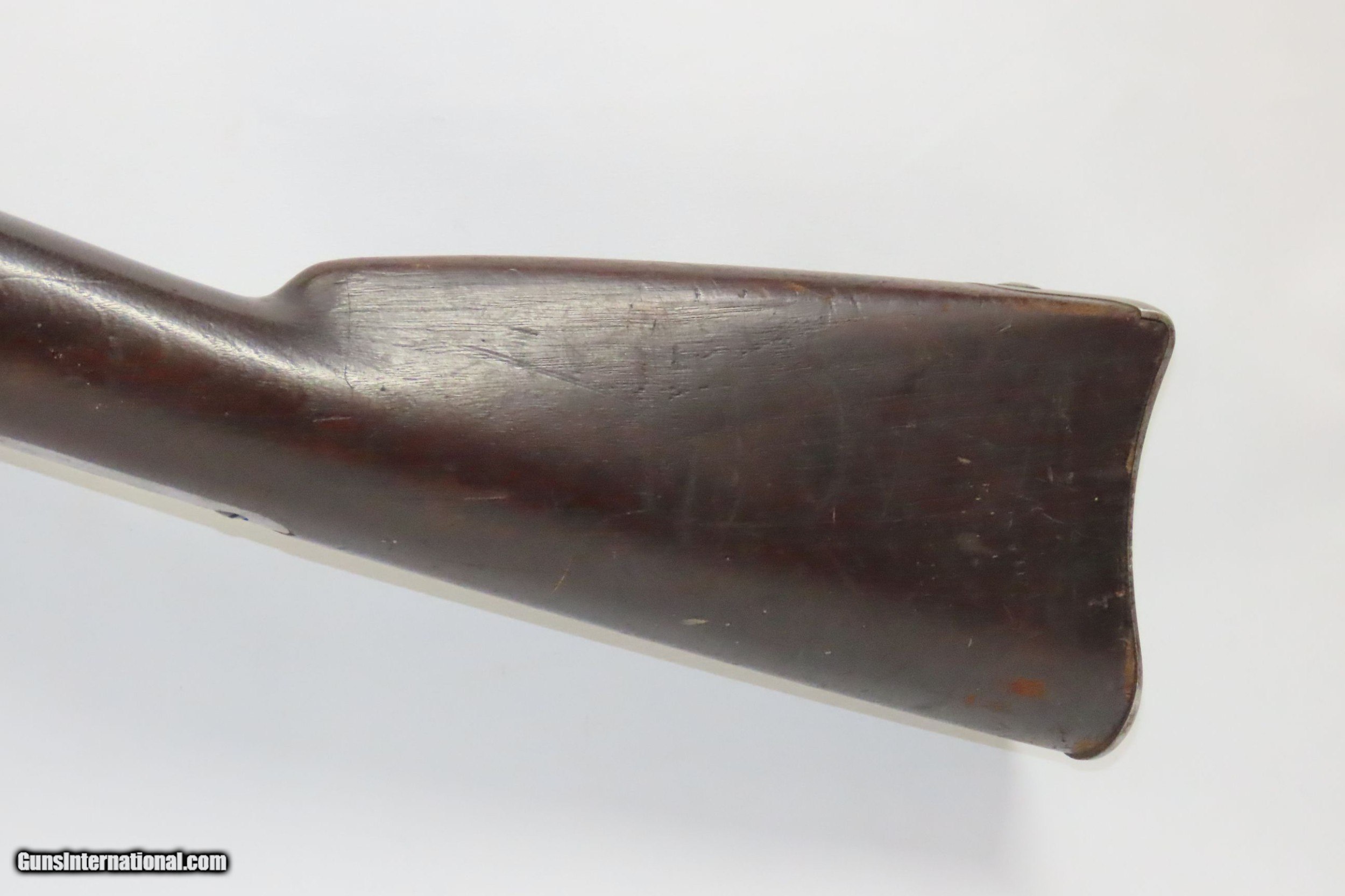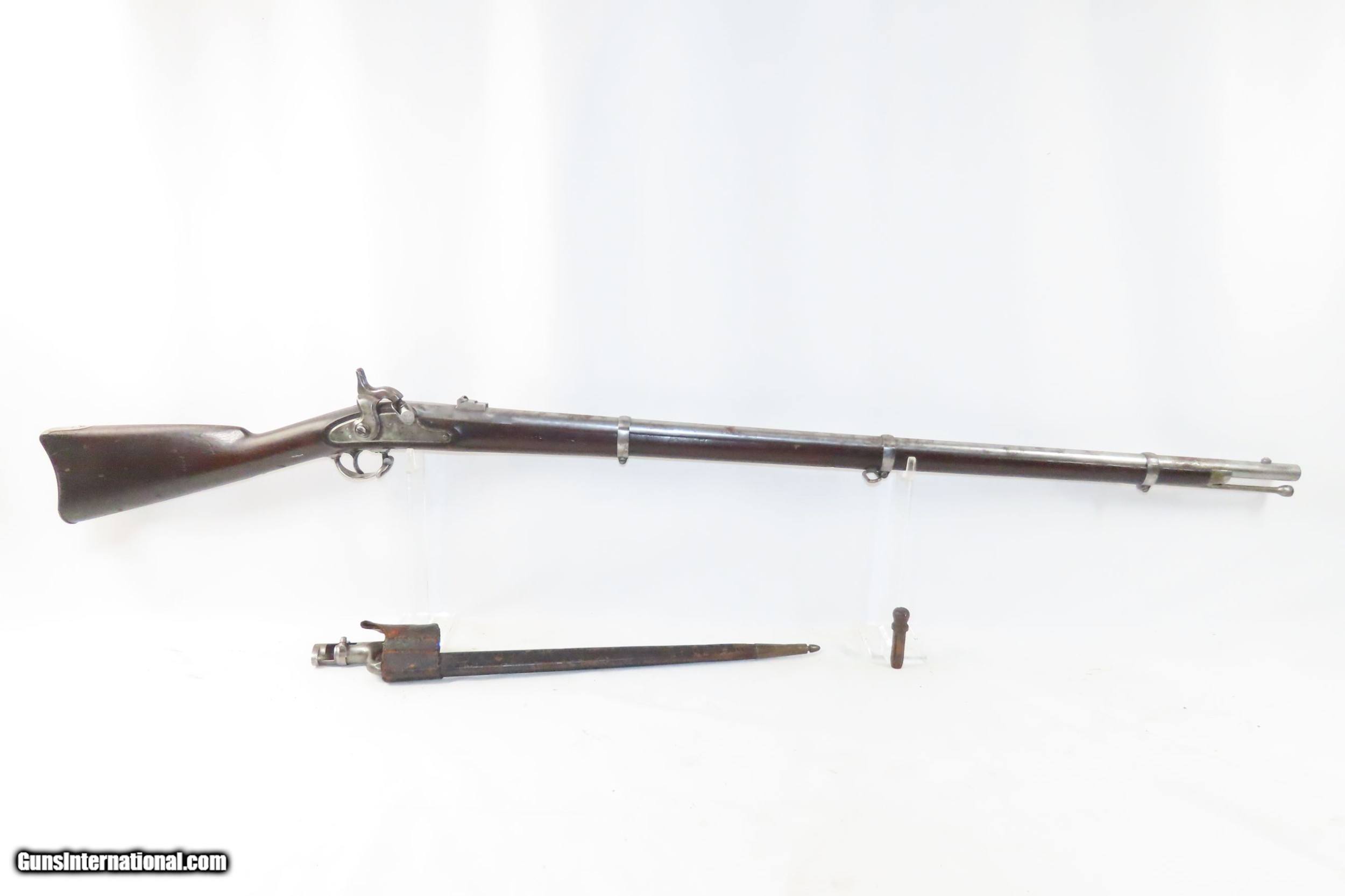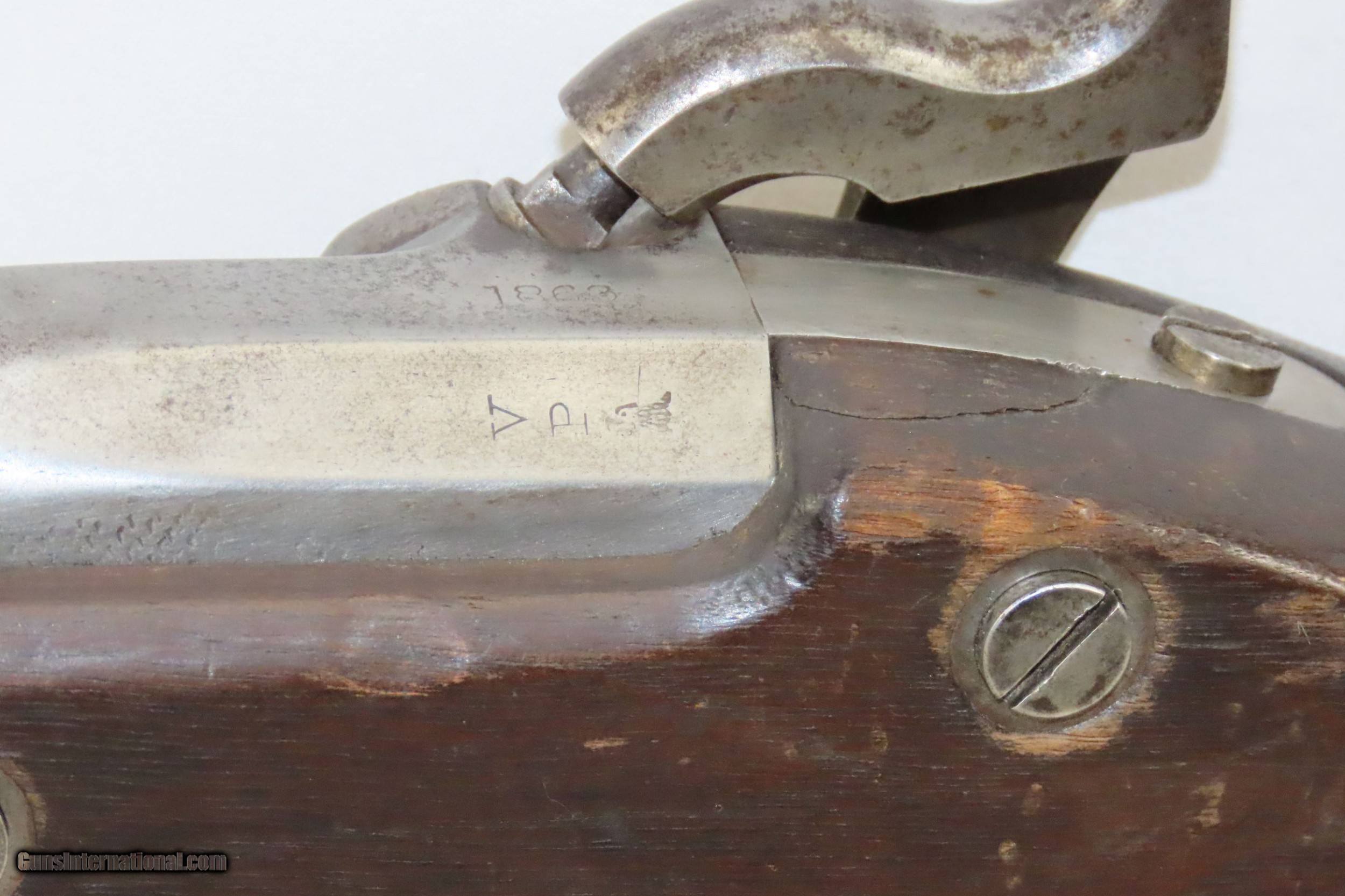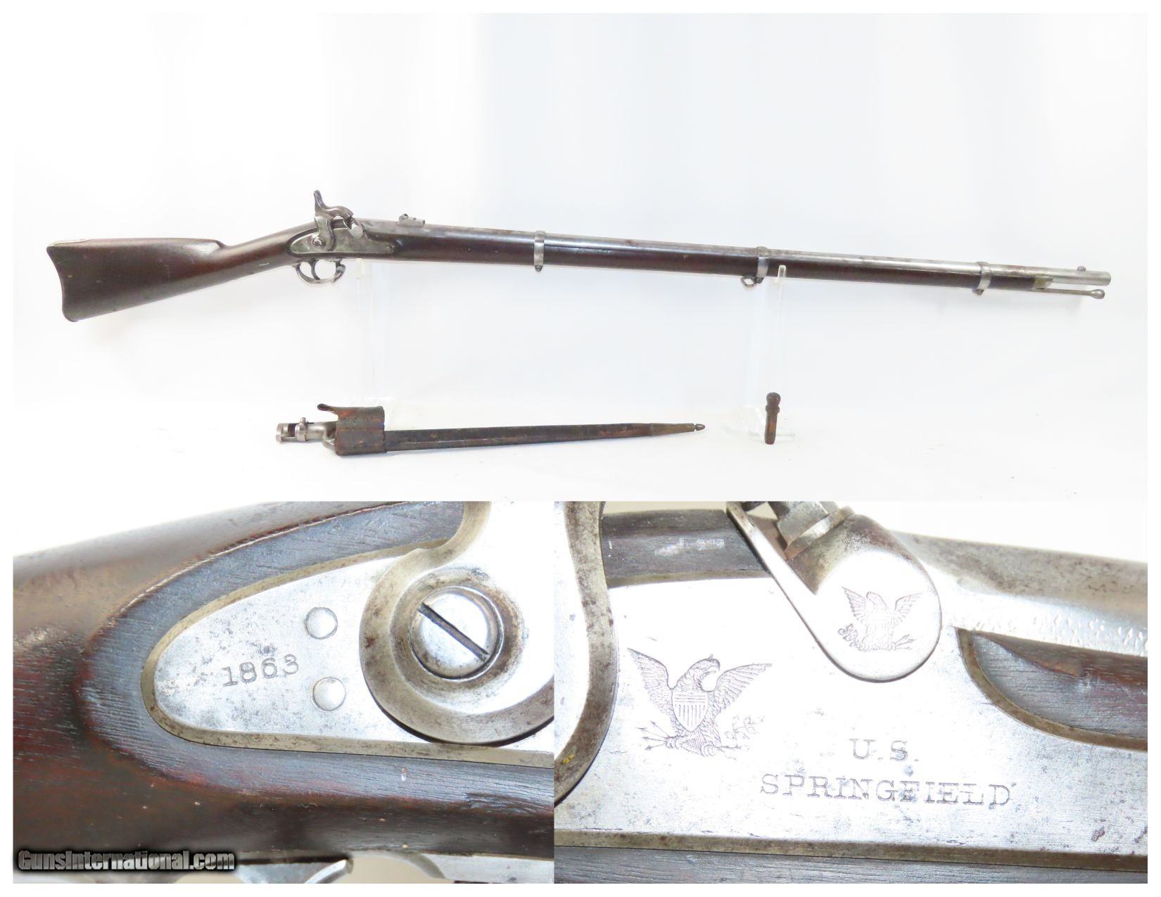 Description: Antique CIVIL WAR Springfield U.S. Model 1863 .58 Cal. Perc. RIFLE-MUSKET Made at the SPRINGFIELD ARMORY w/BAYONET & SCABBARD Here we present an antique Springfield U.S. Model 1863 Rifle-Musket, manufactured at the Springfield Armory in Springfield, Massachusetts circa 1863. The Model 1863 was only a minor improvement over the Springfield Model 1861. As such, it is sometimes classified as just a variant of the Model 1861. The Model 1863 was produced in two variants. The Type I eliminated the band springs and replaced the flat barrel bands with oval clamping bands. It also featured a new ramrod, a case-hardened lock, a new hammer, and a redesigned bolster. The Type II is sometimes referred to as the Model 1864 but is more commonly referred to as just a variant of the Model 1863. This version re-introduced band springs, replaced the clamping bands with solid oval bands, and replaced the three leaf rear sight with single leaf sight. A total of 255,040 of these were manufactured from 1864 to 1865. At the beginning of the American Civil War, the South and North both relied heavily on imported rifles. It wasn’t until the North adopted the .58 Caliber Springfield musket that the average infantryman would evolve into an accurate marksman and effectively turn the tide of the war. The M1861 is representative of the “everyman’s” rifle during the war. About 1.5 million rifle-muskets were made in the U.S., over 800,000 of which were made by the Springfield Armory. This was the last hurrah of the rifle-musket as arms development and tactics rapidly advanced during the short period of the American Civil War. Nevertheless, the 1861 represented new technology as it was made for use with the Minié ball, a hollow based, conical projectile that was small enough to quickly push down the muzzle of a rifled barrel and expanded to create a good gas seal unlike a solid, round ball. This musket also featured, for the first time in the arms market, static iron sights. Almost immediately after the war, the US military switched from the old muzzle loading type weapons to the newer breech loading rifles, bringing an end to the musket as a standard frontline firearm in American history. The overall condition is very good. Armory bright finish with some light oxidation in places. The action is excellent. The bore is in great shape with nice rifling. The stock is solid. There is a small chip just to the left of the top tang. There are two faint cartouches on the left stock flat. Own the original! This is a legitimate antique and not a reproduction. Barrel is 40 inches. Caliber: .58 Percussion Overall condition as seen in photos. Very Fast. Very Safe. FREE SHIPPING WORLDWIDE. Delivered directly to your door by express mail! Guaranteed AUTHENTIC & Includes CERTIFICATE OF AUTHENTICITY. ancestryguns $2995 #226908 SOLD Antique: Yes |