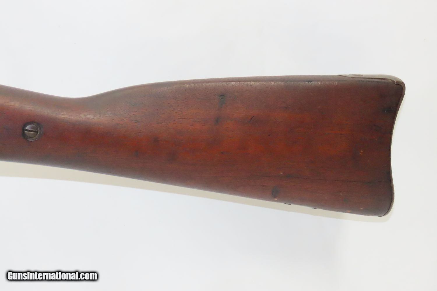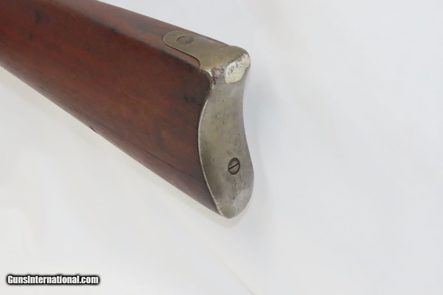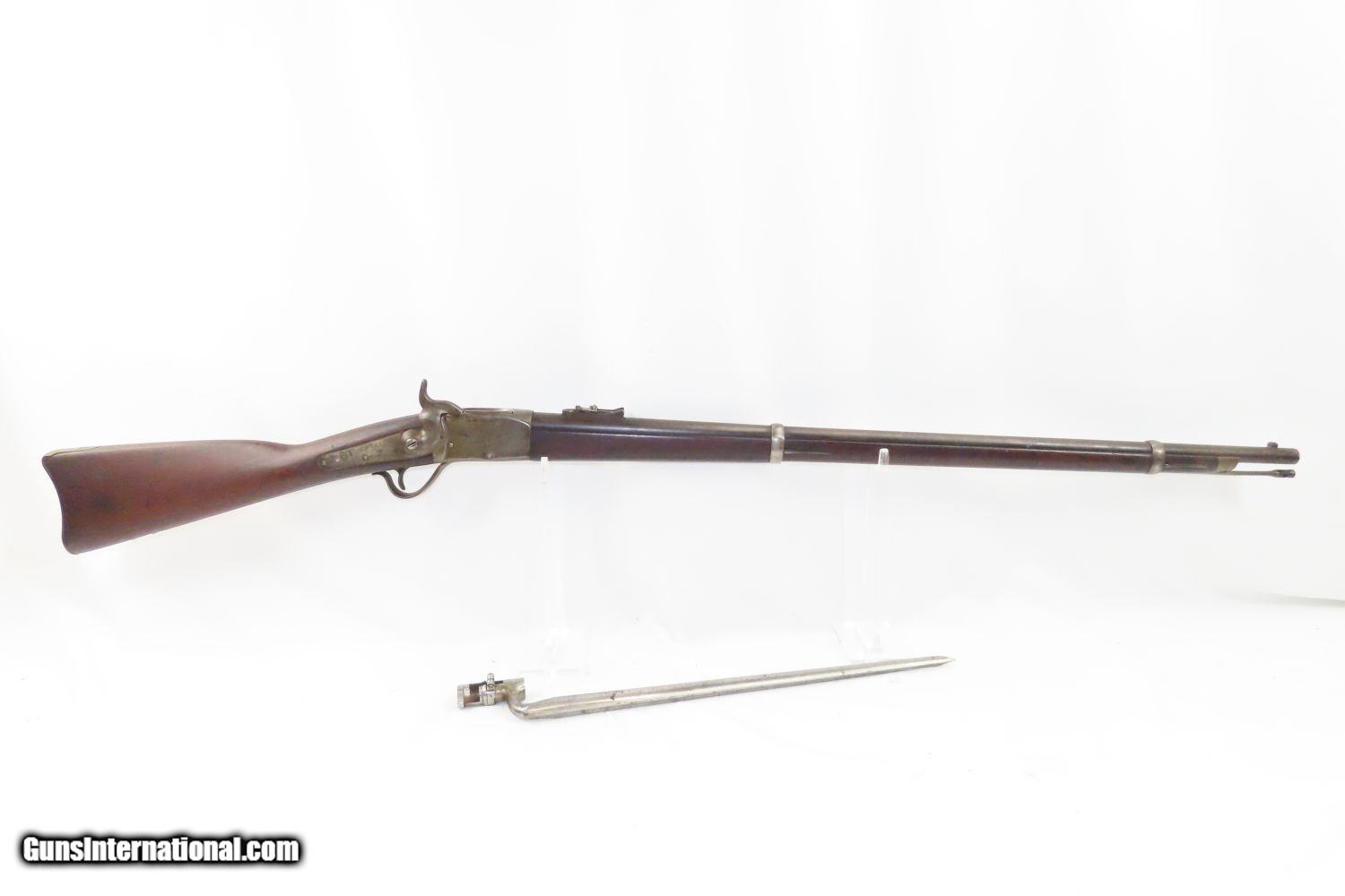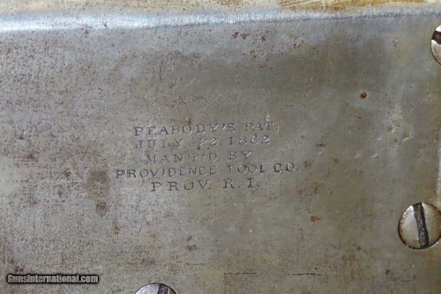Description: Antique CT MILITIA Marked PROVIDENCE TOOL Company .45-70 GOVT PEABODY RIFLE CONNECTICUT MILITIA Rifle with BAYONET! Here we present an antique Connecticut Militia Marked Peabody Rifle, made by the Providence Tool Company in Providence, Rhode Island. It is one of some 112,000 carbines and rifles produced by the company between 1866 and 1871. Henry Peabody developed this sturdy, single-shot, breechloading rifle during the American Civil War and it compared very favorably against the competition. It might have been adopted by the U.S. military had the conflict not ended when it did. Instead, the federal government decided to adopt the Allin Trapdoor Conversion of the ubiquitous Model 1861 Muskets that were in surplus after the war. Several states, such as Massachusetts and Connecticut, purchased these rifles for their militias. This rifle utilizes a trigger-guard that acts as a breech lever to lower the breechlock for top loading of the metallic round. It also features a back action style lock with a large side hammer. It features a very neat rear sight that is capable of five elevation adjustments! There are no sling swivels on this model, which is correct for a rifle that wasn refurbished. This specimen has a lock marked with “PEABODY PAT./JULY 22 1862/MAN’F’D BY/PROVIDENCE TOOL CO./PROV. R.I.” Single letter inspection marks are found throughout. The overall condition is very good. Strong action. Bright bore. The stock is solid. “43” is stamped on both the buttstock and barrel. Sharp markings. The included bayonet is in very good shape. Own the original! This is a legitimate antique and not a reproduction. Barrel is 33 inches. Caliber: .45-70 GOVT Overall condition as seen in photos. Very Fast. Very Safe. FREE SHIPPING WORLDWIDE. Delivered directly to your door by express mail! Guaranteed AUTHENTIC & Includes CERTIFICATE OF AUTHENTICITY. ancestryguns $2485 #210296 SOLD Antique: Yes |