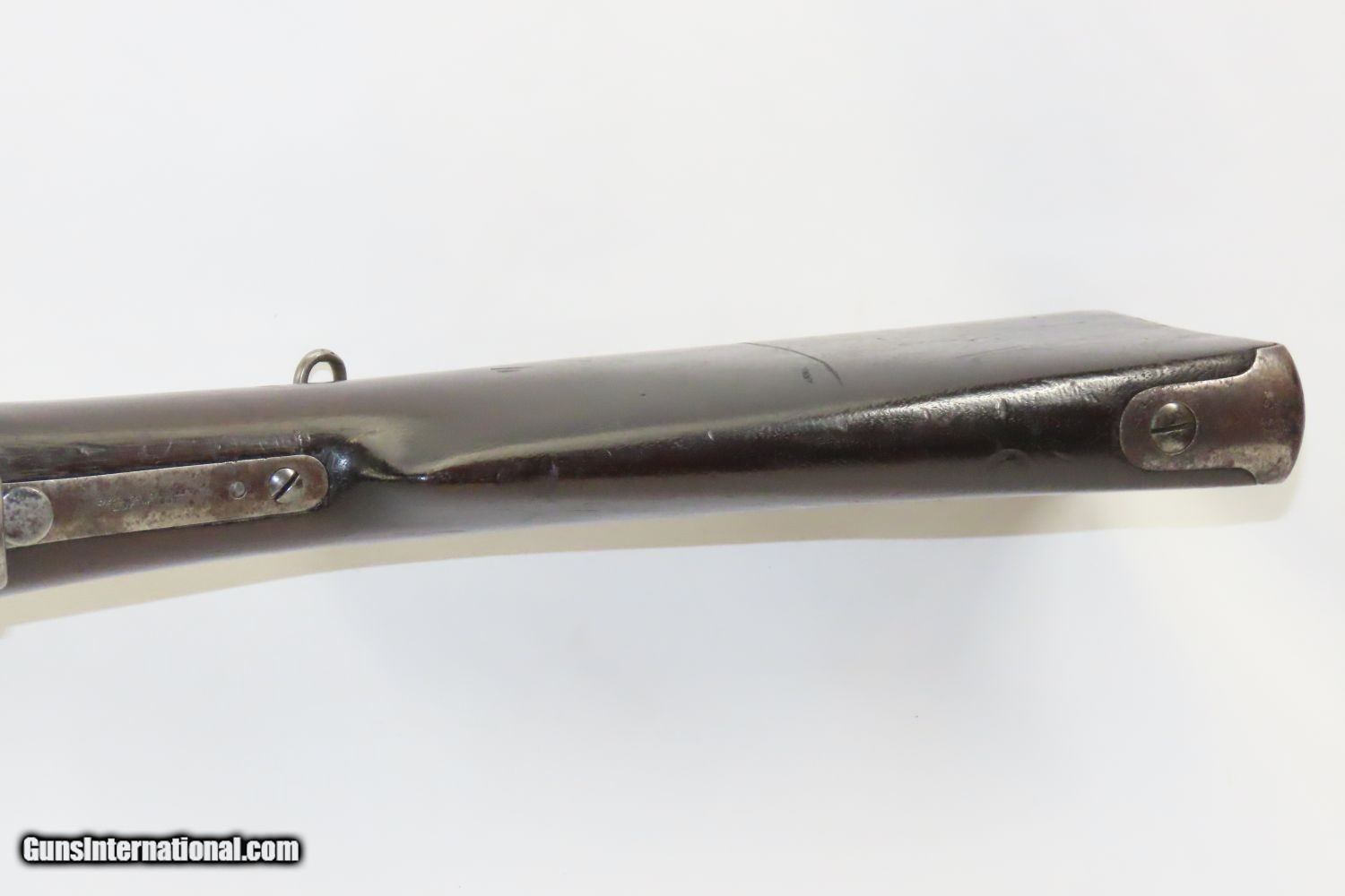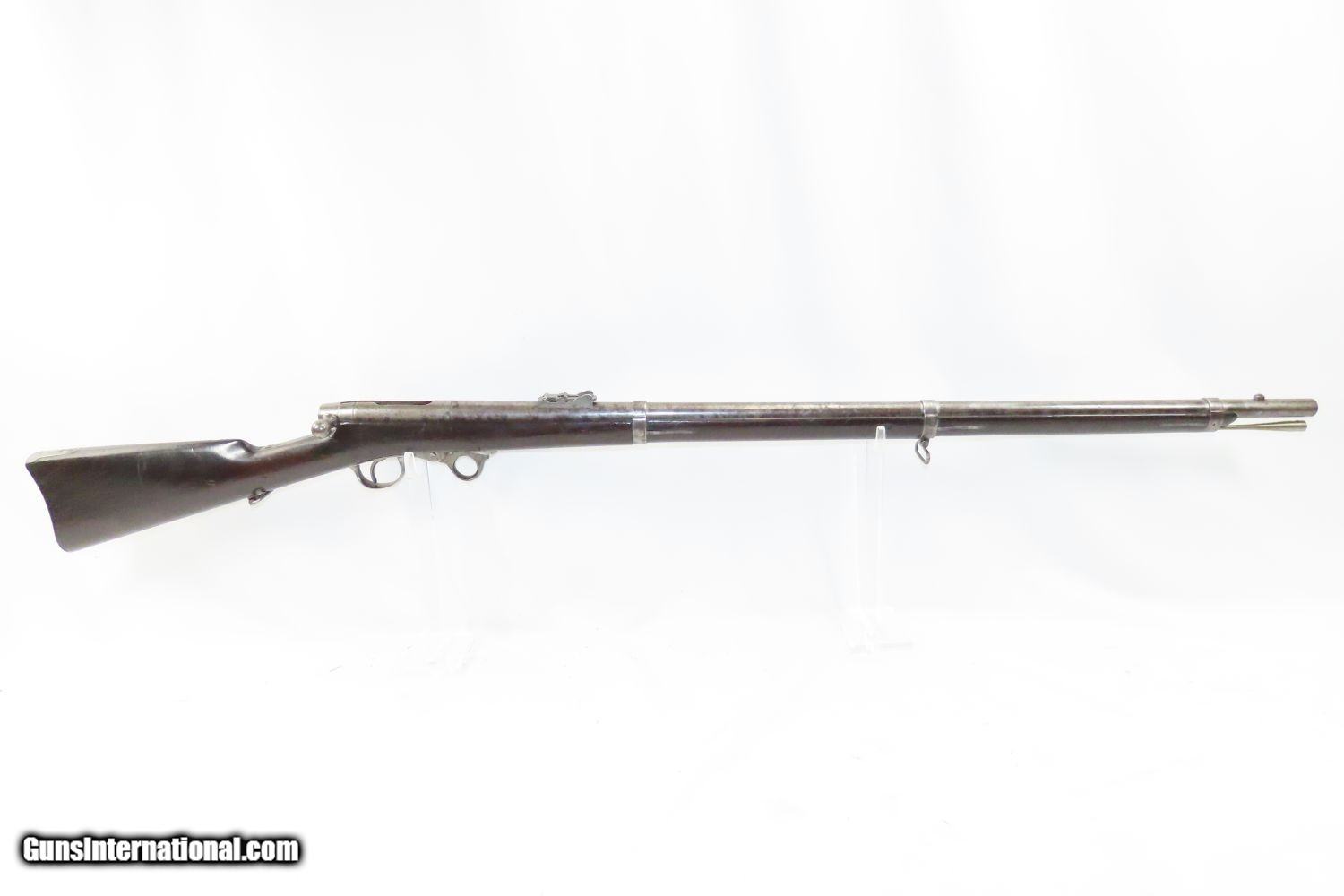 Description: Antique GREENE Percussion BREECHLOADING A.H. WATERS Made UNDERHAMMER Rifle Scarce CIVIL WAR RIFLE from the late 1850s/early 1860s! Here we present an antique Greene Underhammer Percussion Breechloading Rifle, manufactured by A.H. Waters in Millbury, Massachusetts circa 1859 through the early 1860s. The Greene breechloading rifle, with its underhammer design and unusual oval shaped bore, was invented by U.S. Army Lt. Col. J. Durrell Greene. Approximately 1,500 Greene Rifles were produced for sale in the United States, and additional 3,000 were made for the Russian Government. Although the Greene was the first American military bolt-action rifle, only 900 were purchased by the U.S. Army. One of the biggest shortcomings of the Greene rifle was, unlike other underhammer arms, these rifles required the percussion cap to be placed on a cone that was located under the barrel. When the hammer was cocked, there was nothing to hold the cap in place. Consequently, they frequently fell off, often at the most inopportune times. Another shortcoming was the requirement of loading two bullets, one of which served as a gas seal, at the same time. In the initial loading sequence, a bullet was inserted followed by a powder charge, and then a second bullet. The first bullet actually left the muzzle when the rifle was discharged, while the second remained in the breech to prevent propellant gasses from escaping. When the rifle was reloaded, this bullet was advanced into the bore, again followed by a powder charge and new “gas seal” bullet. The process would be continually repeated, thus each bullet saw dual use, first as a breech gas seal and next as the projectile on the next shot. The overall condition is very good. Excellent action. Bright, nicely rifled bore. The walnut stock is in nice shape and solid. This is a very scarce Civil War era bolt action rifle! Own the original! This is a legitimate antique and not a reproduction. Barrel is 35 inches. Caliber: .53 Percussion Overall condition as seen in photos. Very Fast. Very Safe. FREE SHIPPING WORLDWIDE. Delivered directly to your door by express mail! Guaranteed AUTHENTIC & Includes CERTIFICATE OF AUTHENTICITY. ancestryguns $4245 #215058 SOLD Antique: Yes |