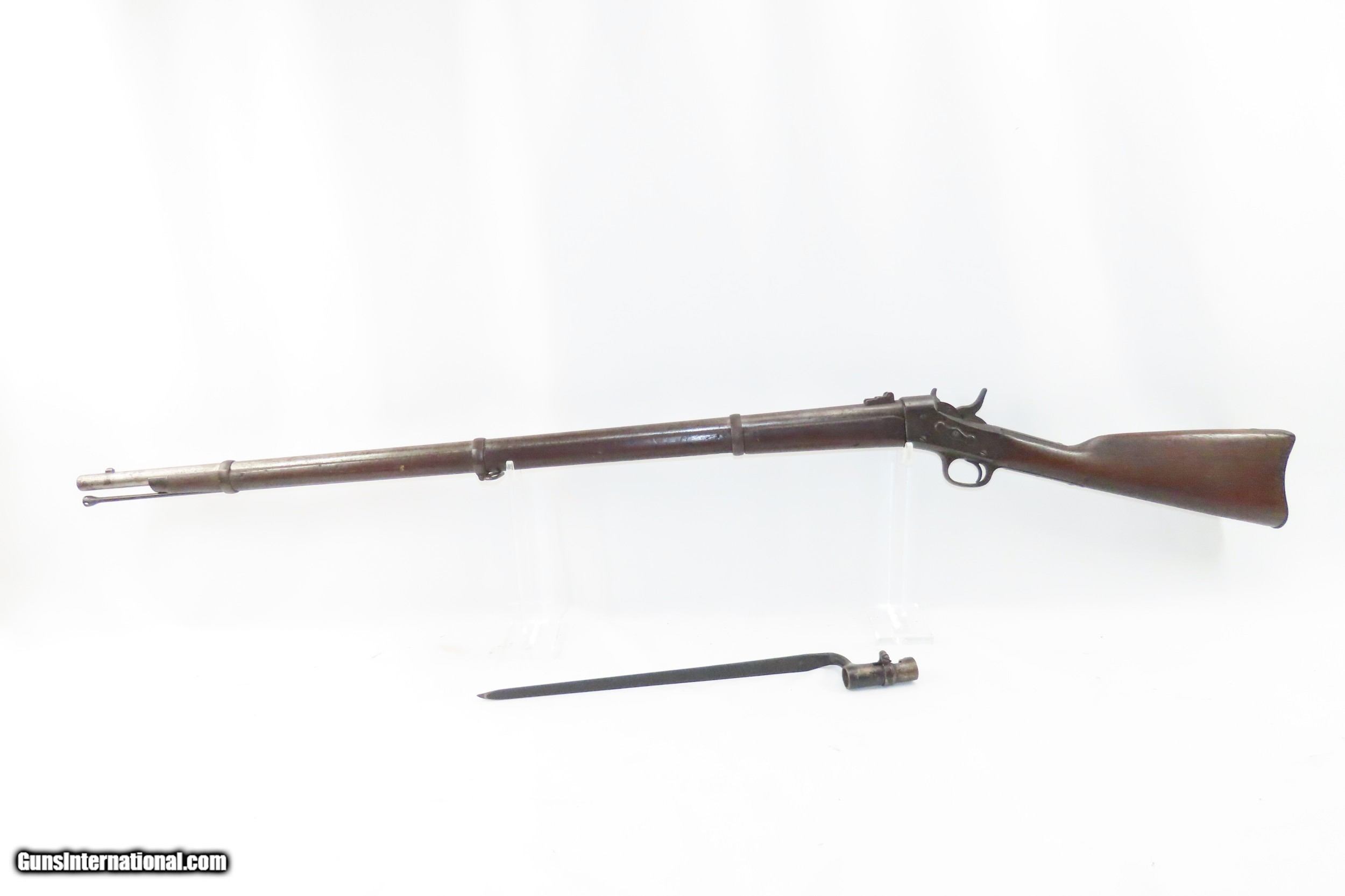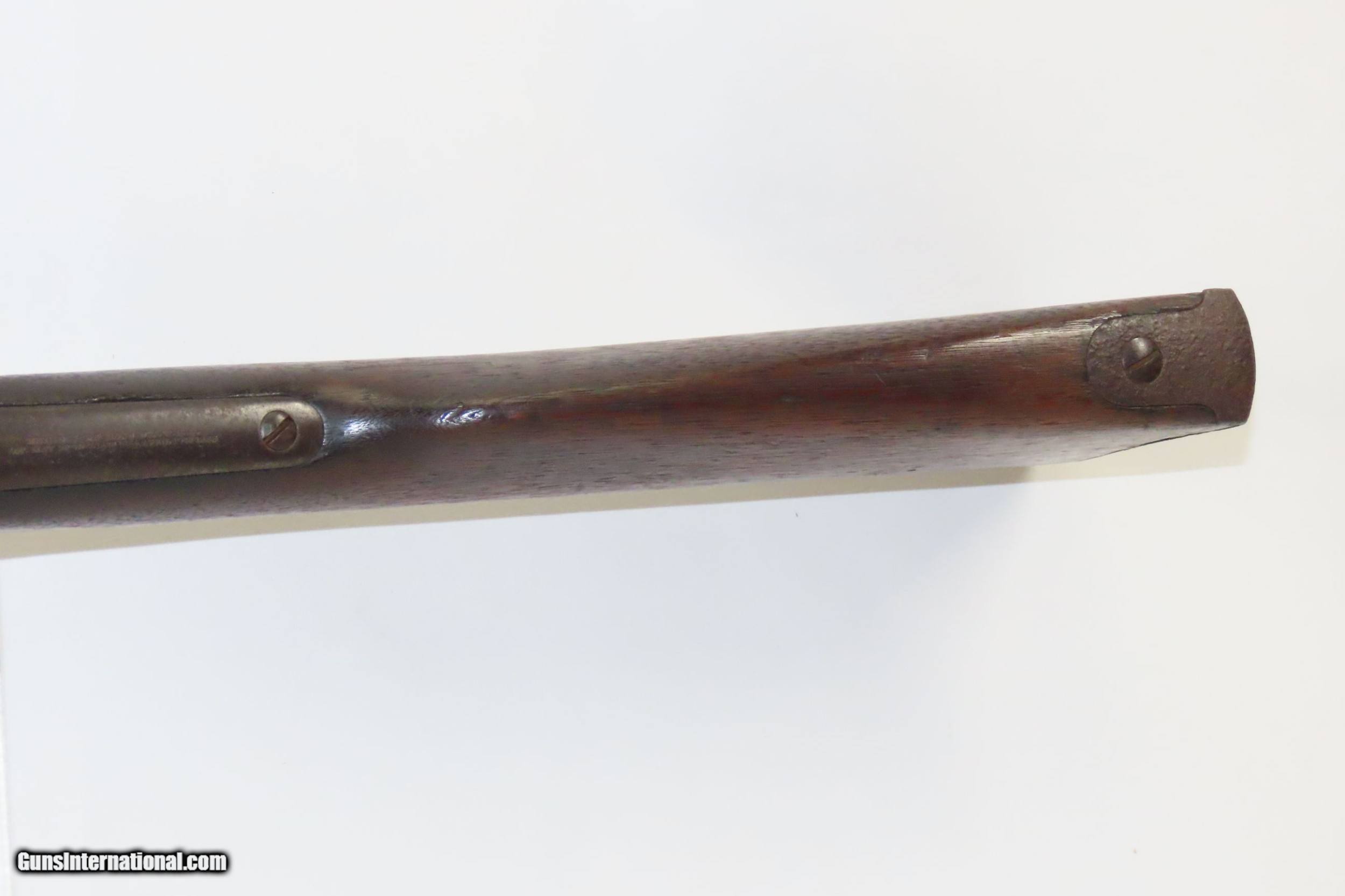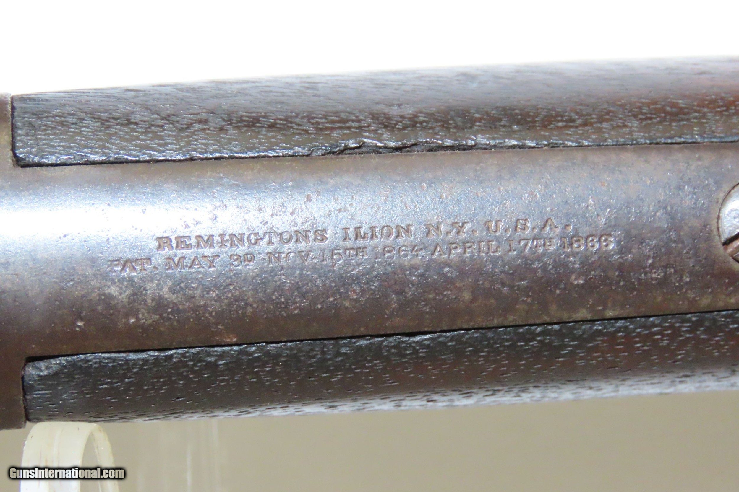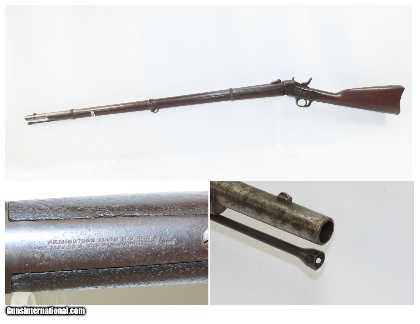 Description: Antique REMINGTON .58 Centerfire ROLLING BLOCK Conversion of Civil War Rifle-Musket 19th Century INDIAN WARS Era Rifle Here we present an antique Remington Rolling Block Conversion of a Civil War Rifled-Musket. During the American Civil War, gunsmith Leonard M. Geiger designed the basic action, in which the shooter “rolled” the breechblock backward with the thumb and inserted a cartridge in the breech, before the block “rolled” forward, and the interlocking hammer cocked in one fluid motion. E. Remington & Sons, America’s oldest firearms manufacturer, took over Geiger’s patent and assigned one of its chief engineers, Joseph Rider, to make the necessary refinements. Rider brought the new action along, and with his 1864 and 1865 patents, put it in its nearly perfect final form. Muskets were in abundance at the end of the Civil War, and many inventors were working on how to convert these surplus rifles into breech-loading, metallic cartridge firing rifles rather than simply throw them out in favor of adopting a new system from the ground-up. The overall condition is good. These typically show heavy use and this one is no exception. Dark patina throughout with the butt plate and stock around it showing greater weathering. The action is excellent. The bore is in good shape for age with nice rifling and good surfaces within. The stock shows much use and wear. A very scarce example of a Remington Rolling Block Converted Civil War Musket in .58 Centerfire! Own the original! This is a legitimate antique and not a reproduction. Barrel is 39 inches. Caliber: .58 Centerfire Overall condition as seen in photos. Very Fast. Very Safe. FREE SHIPPING WORLDWIDE. Delivered directly to your door by express mail! Guaranteed AUTHENTIC & Includes CERTIFICATE OF AUTHENTICITY. ancestryguns $1800 #217080 SOLD Antique: Yes |