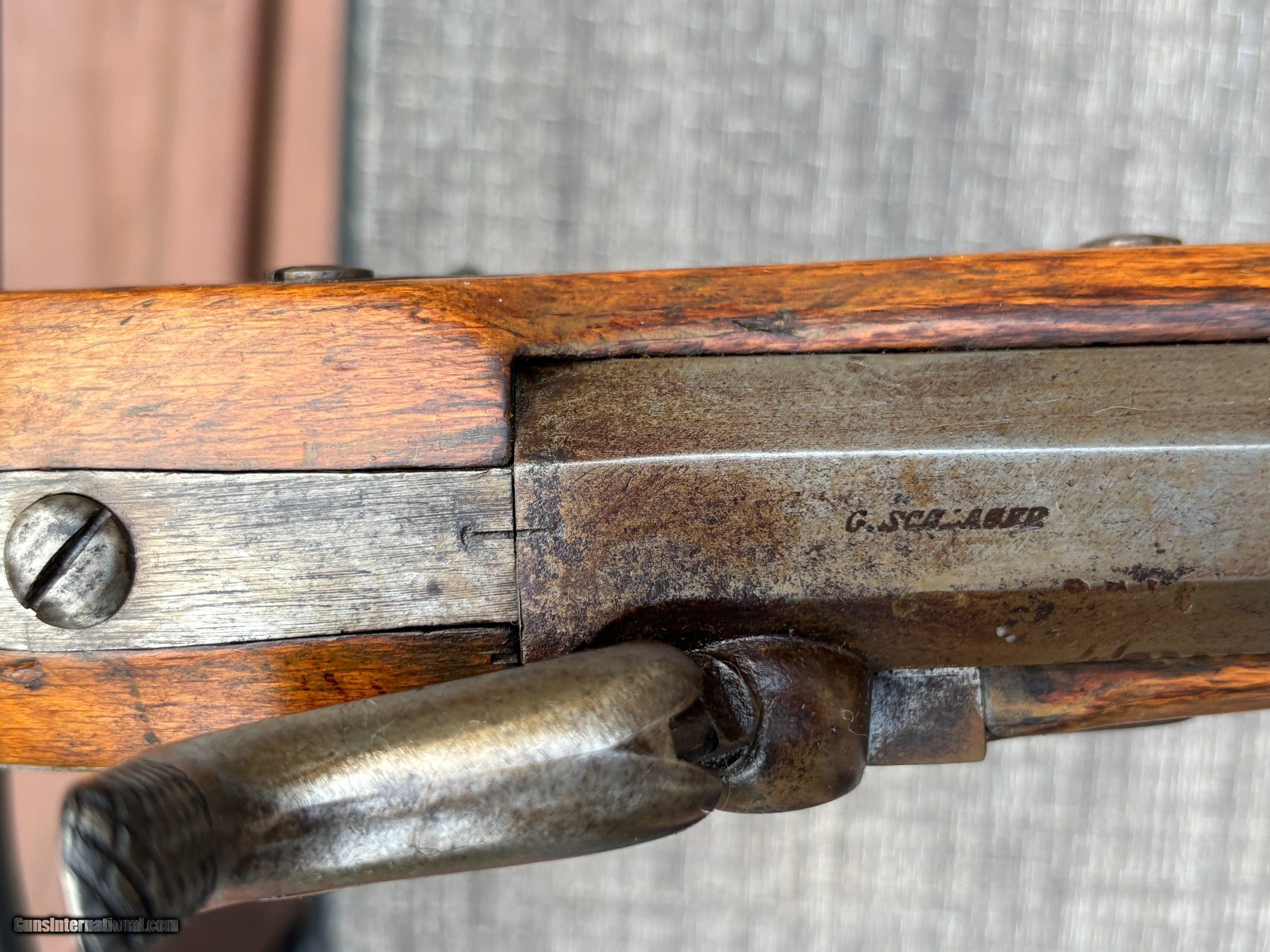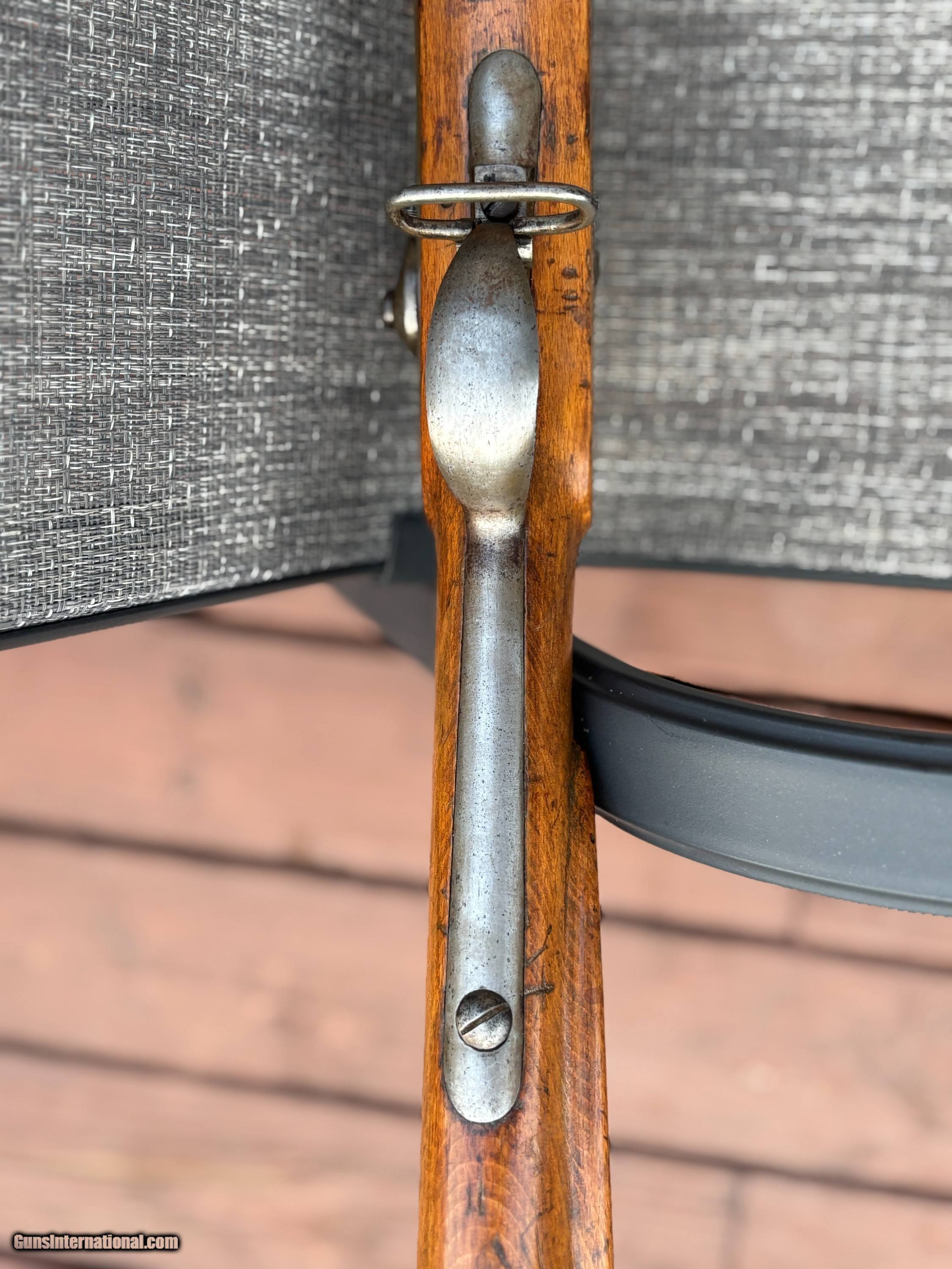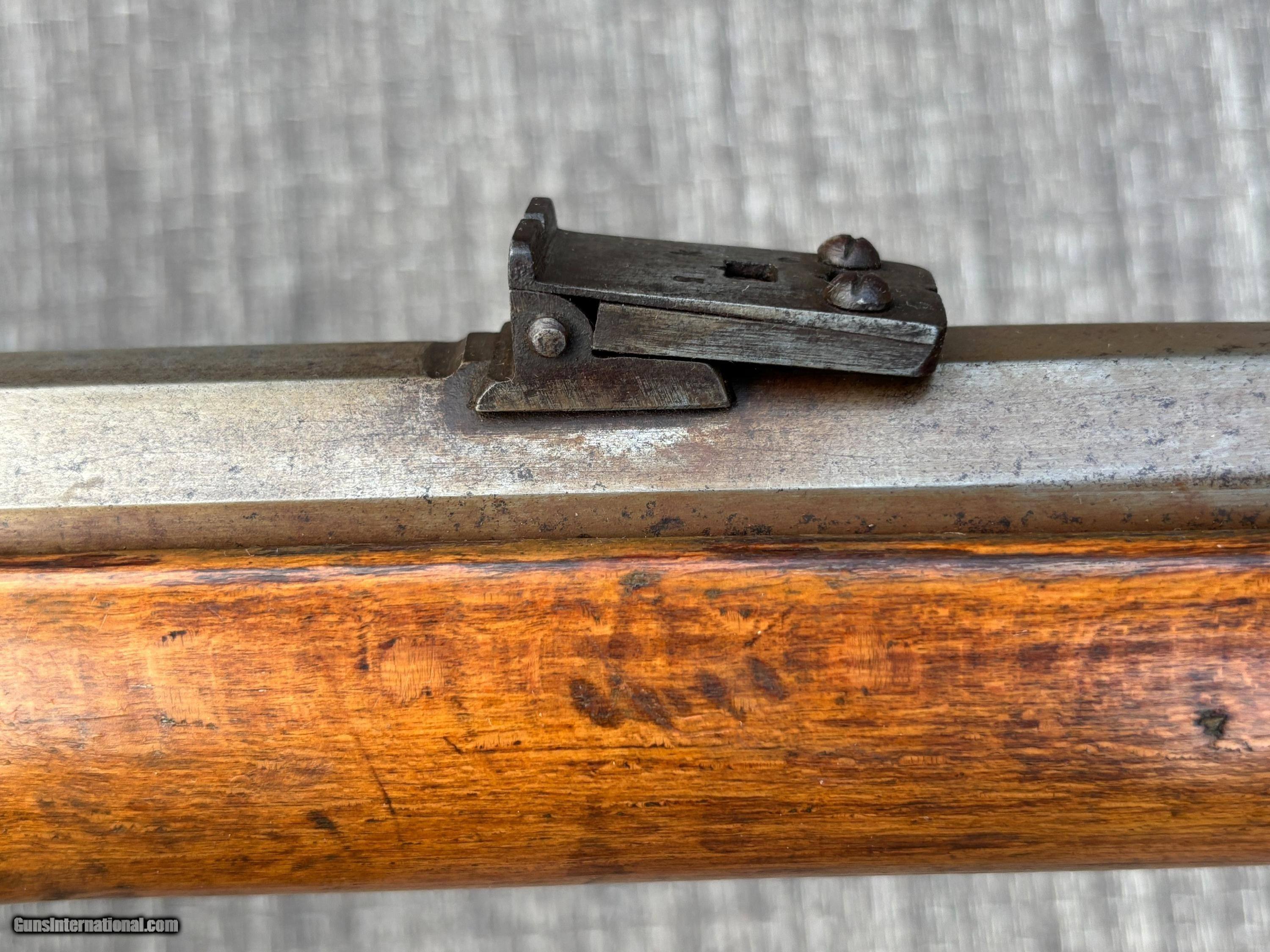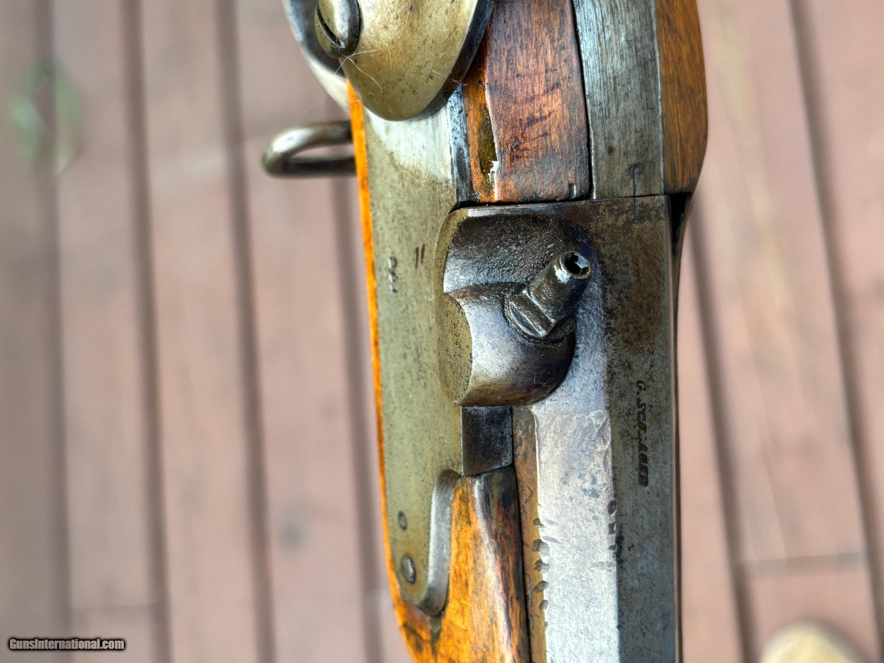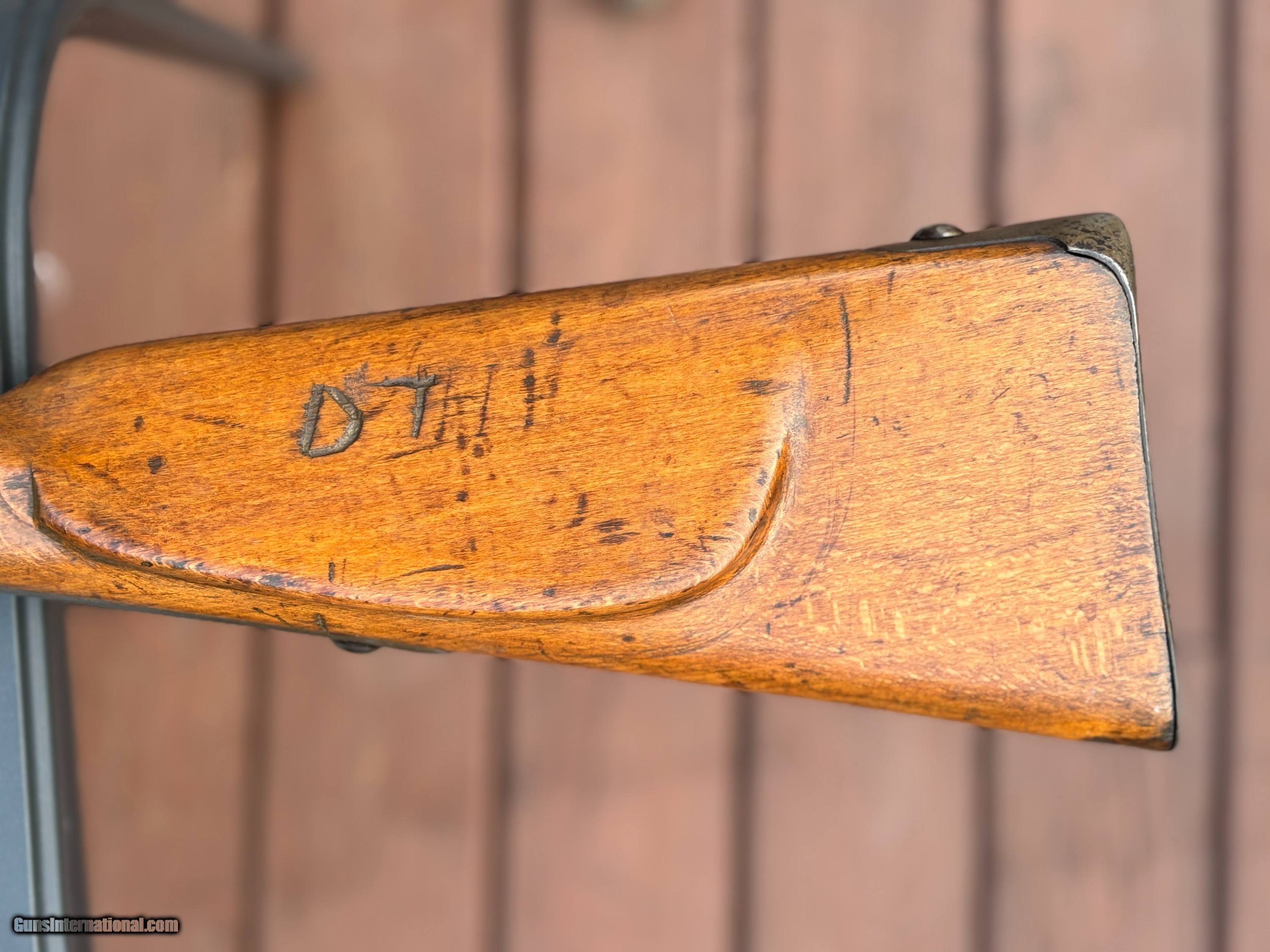 Description: This is a 100% complete and correct Austrian M-1854 Lorenz Rifle Musket, in fine as issued condition. The barrel is clean and smooth with an attractive light brown and gunmetal gray tone. The gun has a bright bore with very fine rifling in the original Austrian .547 caliber. The top of the breech is marked with the manufacturer’s name “G. SCHLAGER” and the barrel breech and bolster are perfectly smooth and clean with no pitting . The nipple is fine and clear and the gun retains its original helical front sight / bayonet lug at the muzzle and the flip-up sight at the breech. The lock is in very clean condition marked with a clear small Austrian double eagle stamp behind the hammer, and desirable “861” to the front, indicating that it was produced in 1861. The lock works perfectly on both safety and full cock. All the iron parts are clean smooth gunmetal gray color steel and there is no pitting or roughness on the metal. All the metal parts have matching assembly number 3 stamped on them. The gun retains its original sling swivels, bands, band springs, butt plate, trigger assembly, sideplate, and fine screws. The original brass-tipped Austrian ramrod in the channel under the barrel is full-length and complete with threads at the end. The stock is also in very nice condition, with a wonderful light orange-brown color to the beech wood. The edges are still fairly sharp and the ramrod channel is perfect. There are a few scattered dings and light handling wear overall as to be expected with a firearm of this age and there are two period initials carved into the cheeck piece. Lorenz stocks are usually found with surface drying cracks and this one also shows tight drying cracks on the bottom of the forearm and at the bottom of the butt stock as shown in the photo. These are minor and only mentioned for accuracy sake as they are due to the natural long term aging of the beech wood and do not affect the structual soundness of the stock. There is a .54 Cal tompion in the muzzle of the barrel. This is a much better than average condition example of a Lorenz that does not need any attention, restoration, or repairs. The price of the rifle includes the fine original Lorenz bayonet in its excellent and scarce U.S. made leather scabbard. The condition matches that of the rifle and fits the rifle perfectly. SOLD Antique: Yes |