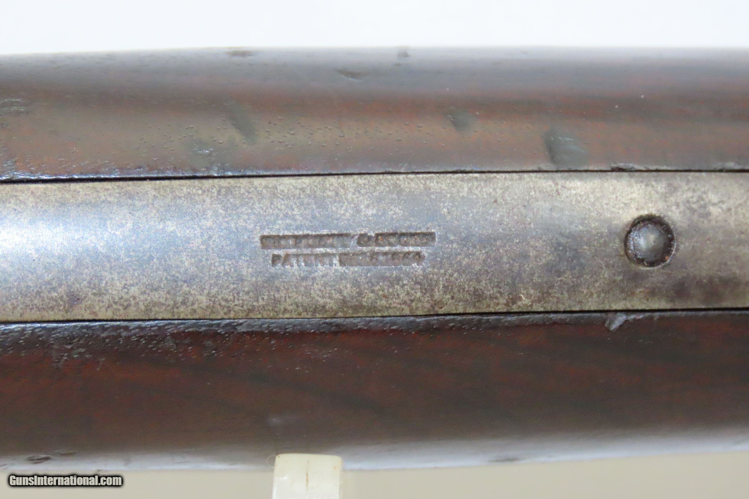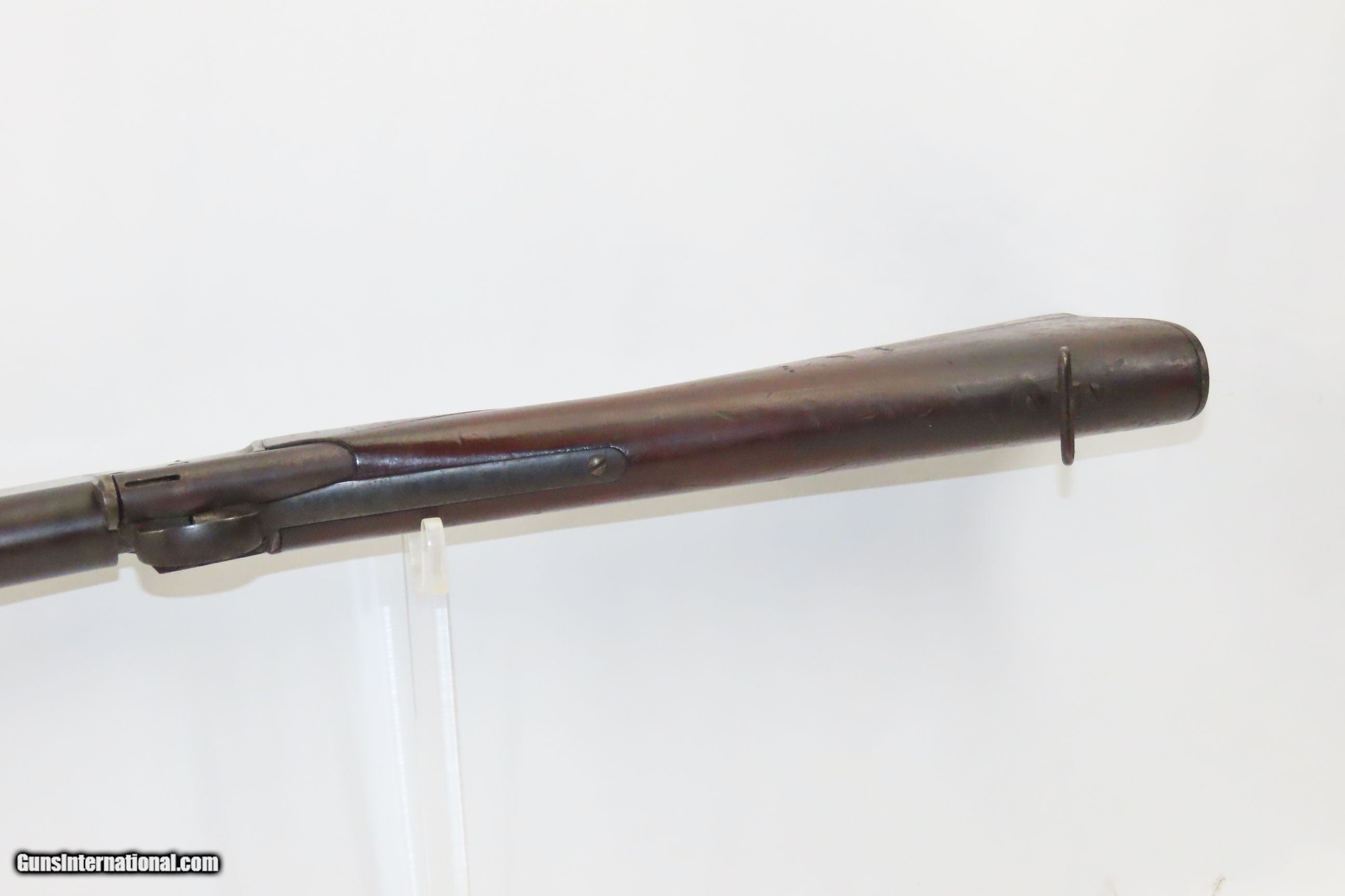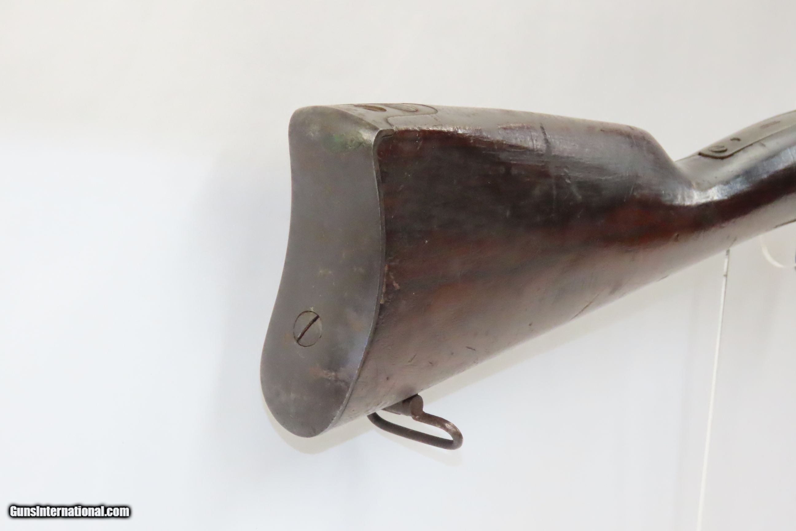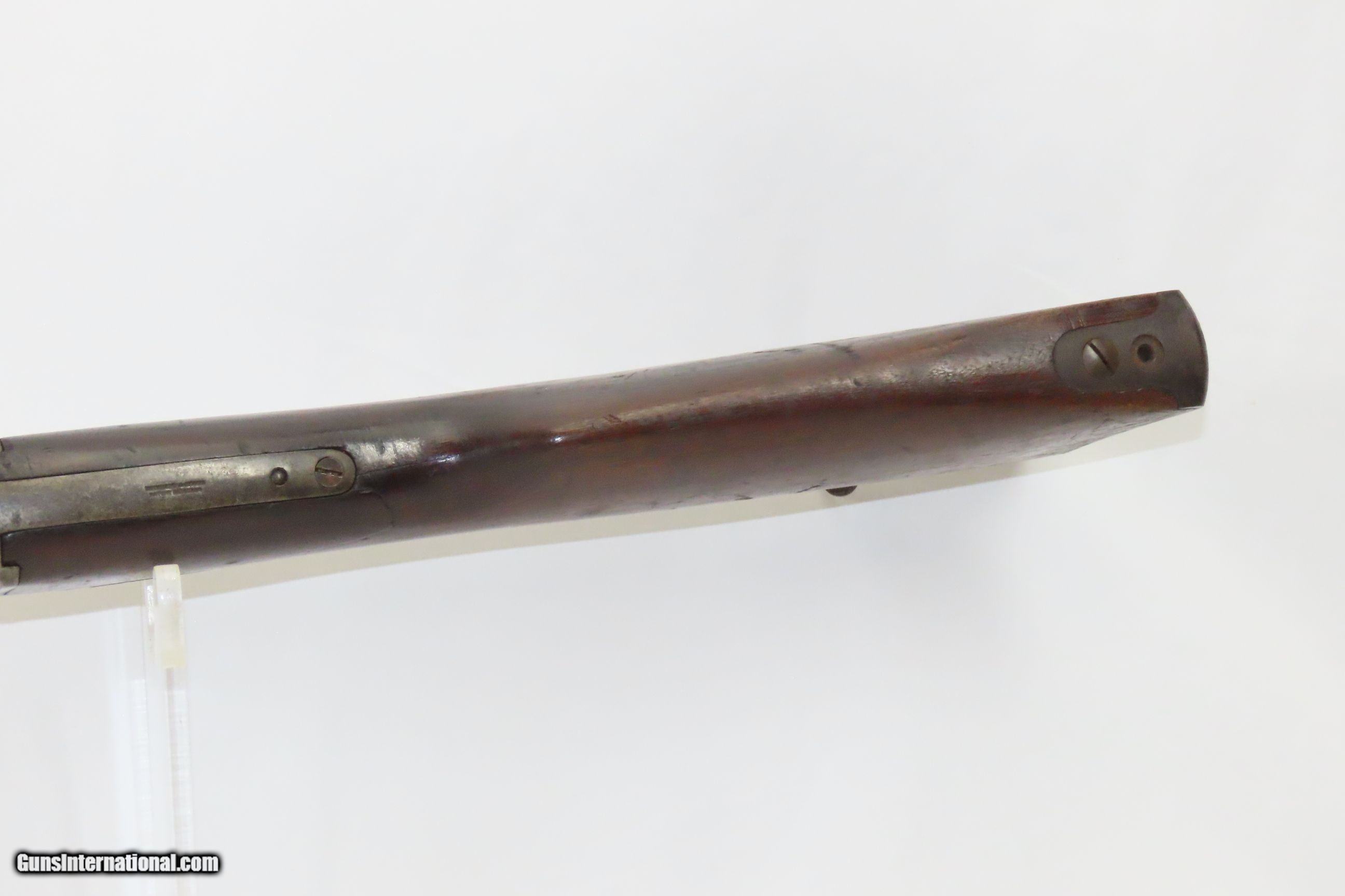 Description: c1864 KENTUCKY HOMEGUARD Triplett & Scott Rifle CIVIL WAR Antique 1 of About 3,000 KY State Militia .50 Rimfire Rifles Here we present an antique “KENTUCKY” Marked Triplett & Scott Patent Carbine, made circa 1864-65 by the Meriden Manufacturing Company of Meriden, Connecticut. Meriden Manufacturing was founded by Charles Parker and his brother, who would later go on to become one of the most famous firearms manufacturers in the world with his beautiful shotguns. That firm would be called Parker Brothers. However, these brothers would first make themselves successful by contracting for the Union government during the American Civil War. They produced the Triplett & Scott Repeating Rifle and Carbine on contract with the state of Kentucky for 5,000 pieces. Around 3,000 of the 30-inch barrel rifles/carbines were manufactured as part of the contract. These were to be issued to the Kentucky Home Guard for supply train defense for the Union Army as General Sherman marched on Atlanta. The diversity of weapons, especially carbines, during the Civil War was incredible. All of them are different in their own way. The Triplett & Scott Rifle & Carbine differentiates itself by its operation. The 7-shot magazine tube is housed in the front of the wrist of the butt stock. By placing the hammer in half-cock and depressing a button with the right thumb, one would be able to twist the forward portion of the gun, which would activate the automatic ejector, pushing the empty case out, before the receiver pushed aside the loading gate on the magazine tube to pick up another cartridge. The design was quite ingenious and the precision with which it was executed is still evident. This rifle is marked “KENTUCKY” on the left side of the receiver. The tang is marked “TRIPLETT & SCOTT/PATENT DEC. 6, 1864”. The left side of the frame is marked “MERIDEN MANFG. CO./MERIDEN. CONN.” The right side of the frame is marked with the serial number. The overall condition is very good. Original blue and case color finish. The action is excellent. The bore is in very good condition, reflective with strong rifling. The walnut stock is damaged like the vast majority where the magazine tube protrudes and the wood is thin. This is one of the very few repeating rifles of the American Civil War. Own the original! This is a legitimate antique and not a reproduction. Barrel is 30 inches. Caliber: .50 Rimfire Overall condition as seen in photos. Very Fast. Very Safe. FREE SHIPPING WORLDWIDE. Delivered directly to your door by express mail! Guaranteed AUTHENTIC & Includes CERTIFICATE OF AUTHENTICITY. ancestryguns $2800 #230681 SOLD Antique: Yes |