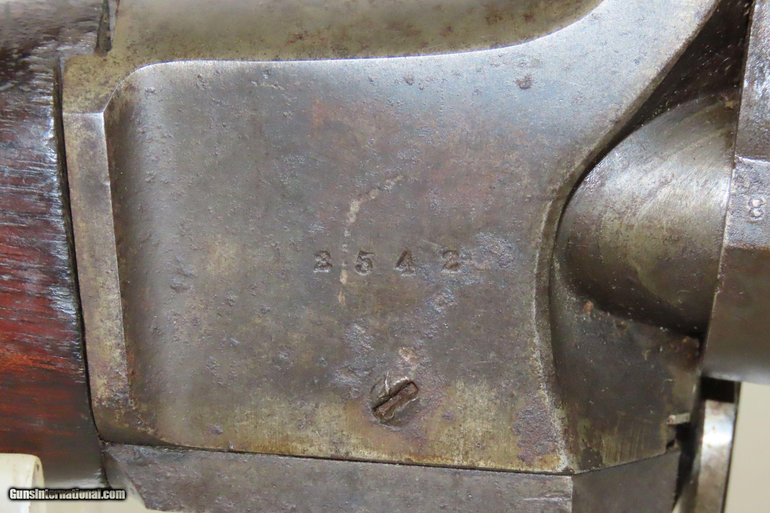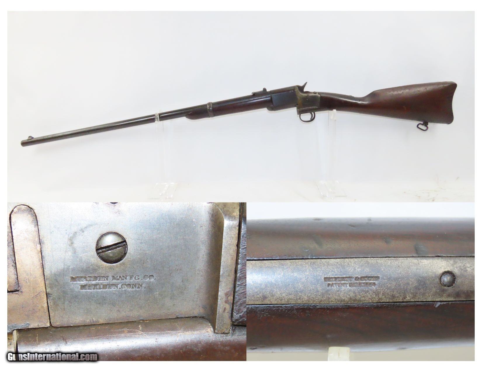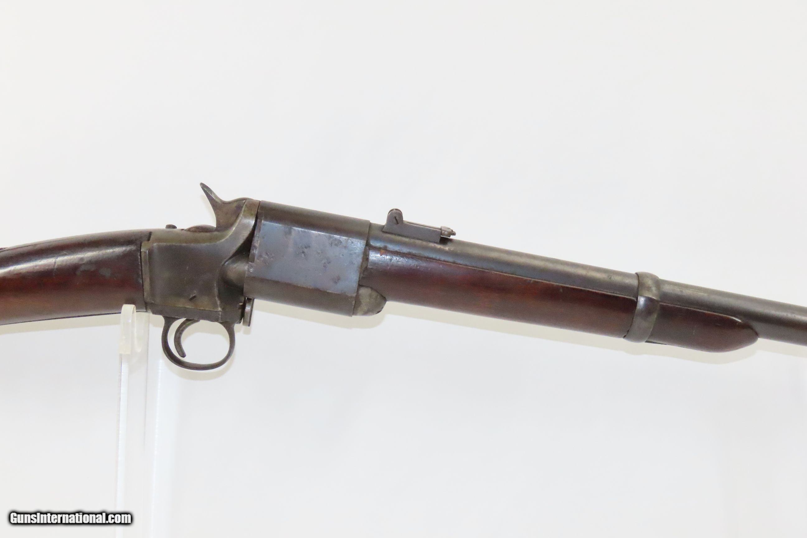 Description: c1864 KENTUCKY HOMEGUARD Triplett & Scott Rifle CIVIL WAR Antique 1 of About 3,000 KY State Militia .50 Rimfire Rifles Here we present an antique “KENTUCKY” Marked Triplett & Scott Patent Carbine, made circa 1864-65 by the Meriden Manufacturing Company of Meriden, Connecticut. Meriden Manufacturing was founded by Charles Parker and his brother, who would later go on to become one of the most famous firearms manufacturers in the world with his beautiful shotguns. That firm would be called Parker Brothers. However, these brothers would first make themselves successful by contracting for the Union government during the American Civil War. They produced the Triplett & Scott Repeating Rifle and Carbine on contract with the state of Kentucky for 5,000 pieces. Around 3,000 of the 30-inch barrel rifles/carbines were manufactured as part of the contract. These were to be issued to the Kentucky Home Guard for supply train defense for the Union Army as General Sherman marched on Atlanta. The diversity of weapons, especially carbines, during the Civil War was incredible. All of them are different in their own way. The Triplett & Scott Rifle & Carbine differentiates itself by its operation. The 7-shot magazine tube is housed in the front of the wrist of the butt stock. By placing the hammer in half-cock and depressing a button with the right thumb, one would be able to twist the forward portion of the gun, which would activate the automatic ejector, pushing the empty case out, before the receiver pushed aside the loading gate on the magazine tube to pick up another cartridge. The design was quite ingenious and the precision with which it was executed is still evident. This rifle is marked “KENTUCKY” on the left side of the receiver. The tang is marked “TRIPLETT & SCOTT/PATENT DEC. 6, 1864”. The left side of the frame is marked “MERIDEN MANFG. CO./MERIDEN. CONN.” The right side of the frame is marked with the serial number. The overall condition is very good. Original blue and case color finish. The action is excellent. The bore is in very good condition, reflective with strong rifling. The walnut stock is damaged like the vast majority where the magazine tube protrudes and the wood is thin. This is one of the very few repeating rifles of the American Civil War. Own the original! This is a legitimate antique and not a reproduction. Barrel is 30 inches. Caliber: .50 Rimfire Overall condition as seen in photos. Very Fast. Very Safe. FREE SHIPPING WORLDWIDE. Delivered directly to your door by express mail! Guaranteed AUTHENTIC & Includes CERTIFICATE OF AUTHENTICITY. ancestryguns $2800 #230681 SOLD Antique: Yes |