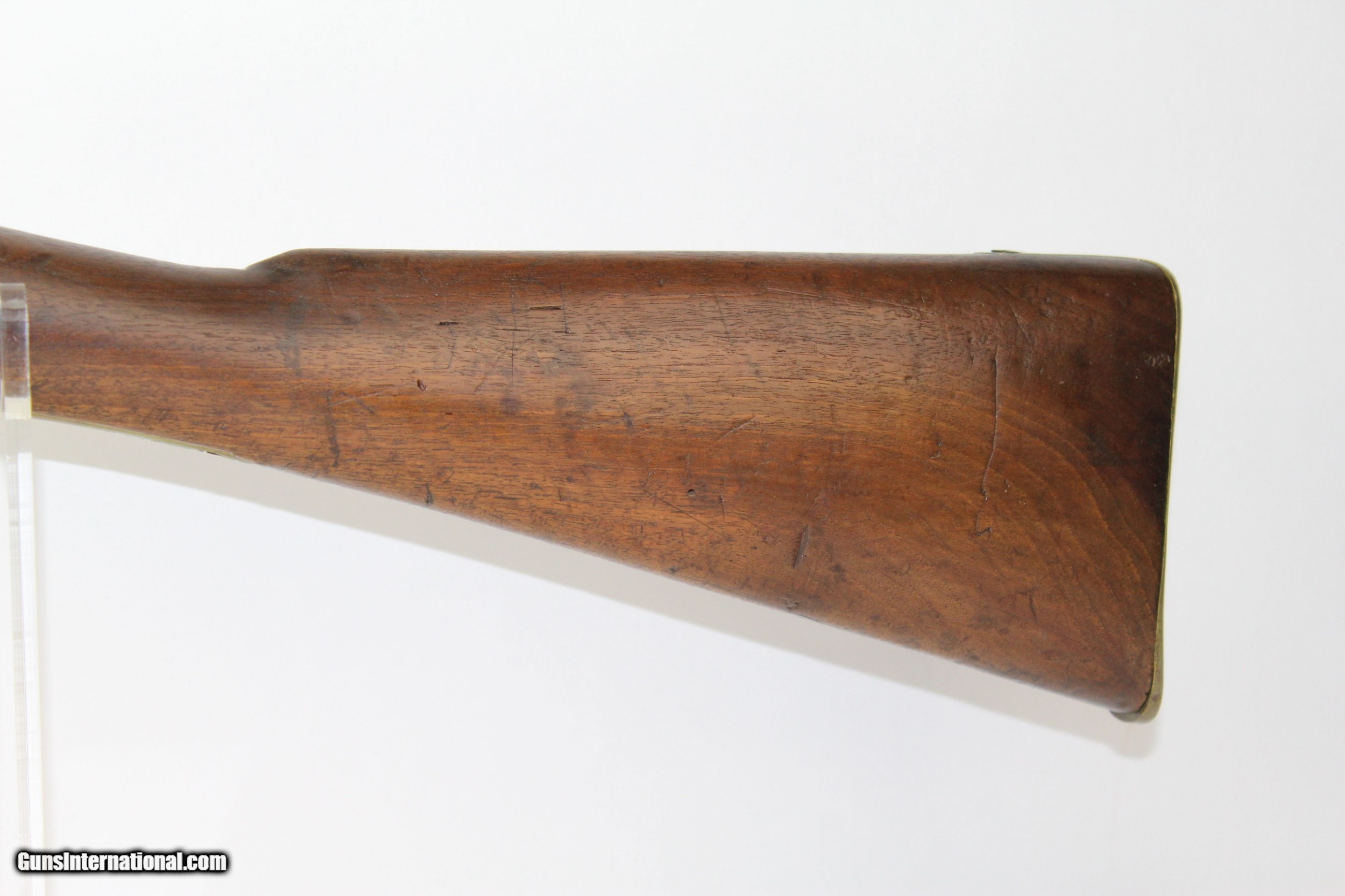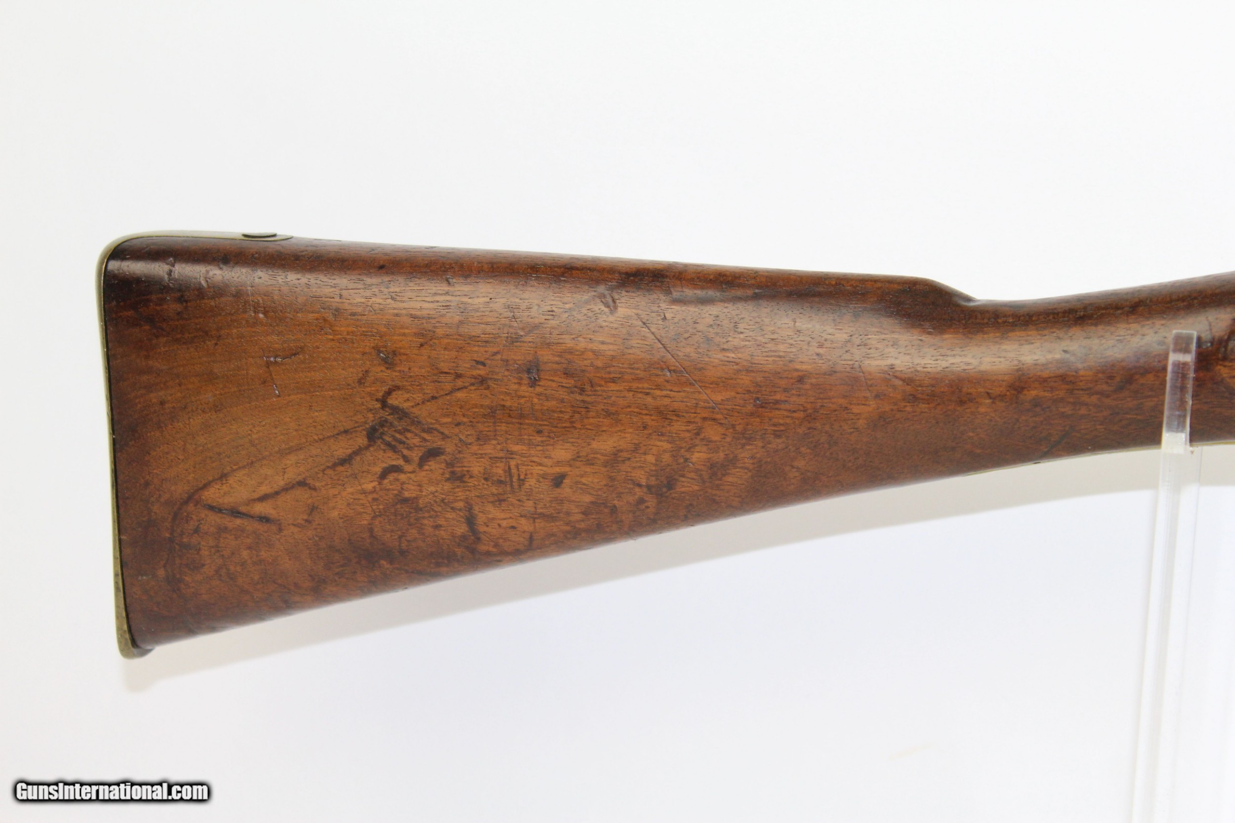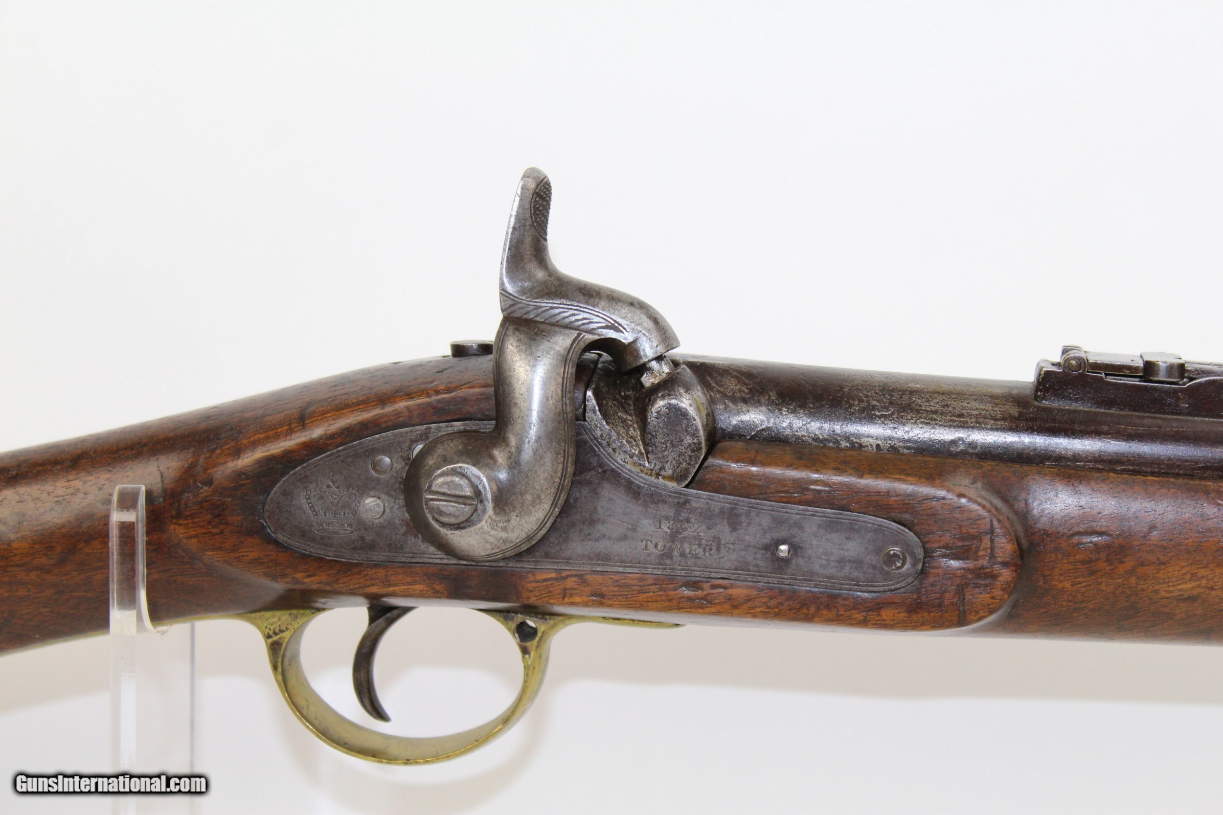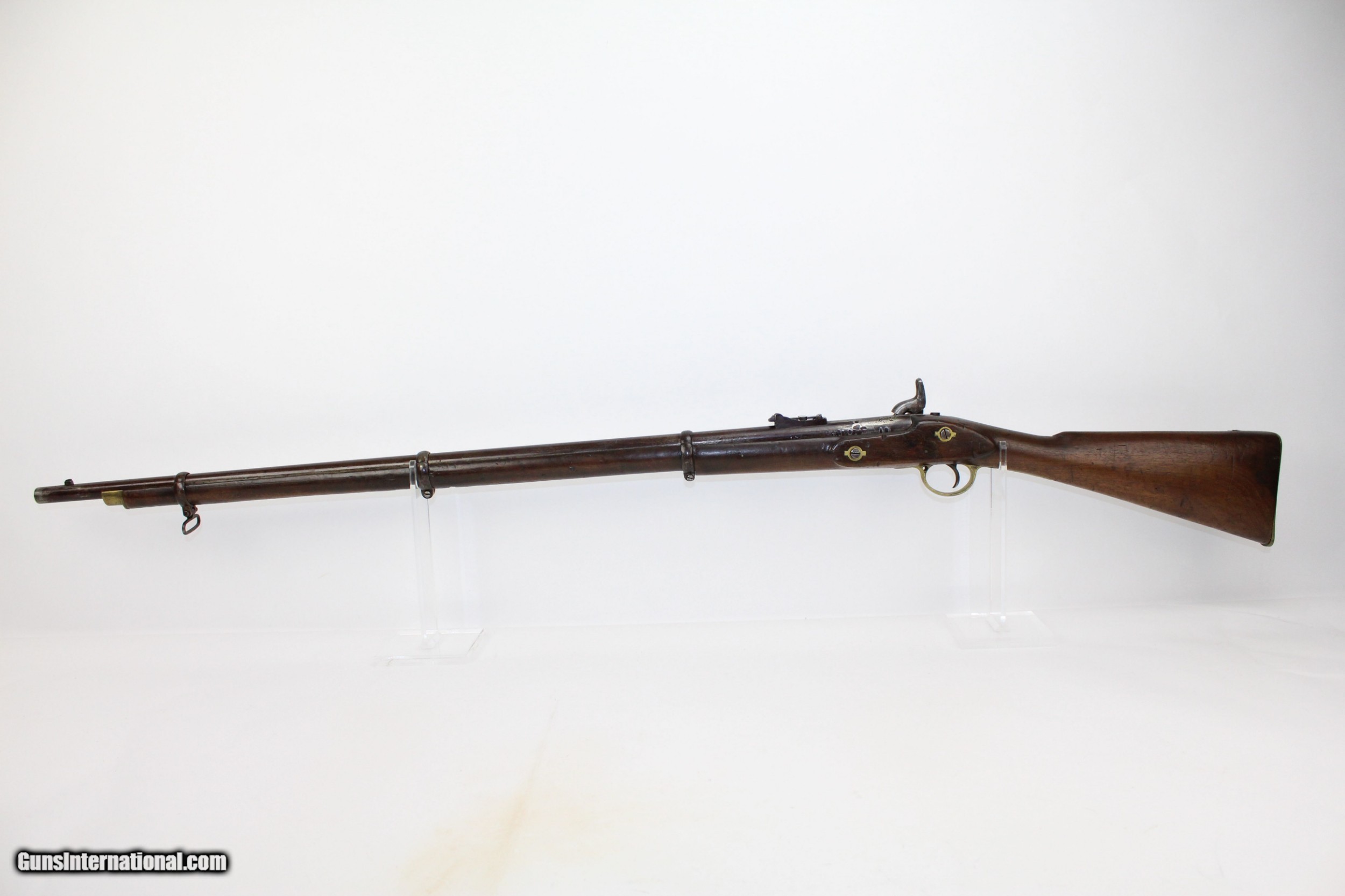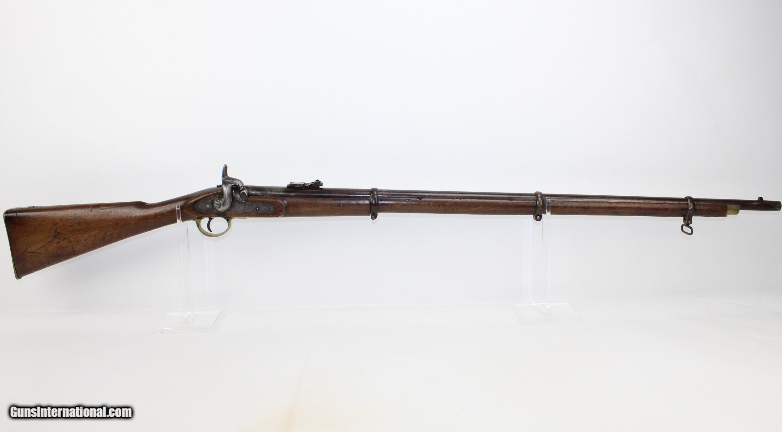 Description: CIVIL WAR Antique ENFIELD P1853 Infantry Rifle Musket Dated “1862” with Commercial Proofs! Here we present an antique Enfield Commercial Pattern 1853 Rifle-Musket, made in 1862 in England. The Pattern 1853 is perhaps the best known and regarded weapon that replaced all earlier infantry models in the British Army. Over 500,000 Pattern 1853 muskets were also purchased/imported by the US Ordnance Department during the Civil War. They represented the second most issued infantry musket in the field and were beloved by their users. The lock is marked with a British Royal Cipher and “1862/TOWER”. Commercial proof marks are located on the left side of the barrel. The initials “DM” are located just ahead of the butt plate. The overall condition is good. The metal surfaces are dark with age with signs of hard use. The markings are clear and legible. The stock shows wear all about with a small repaired crack on the left side opposite the lock. The bore is dark with good rifling. The action on this rifle is strong. Own the original! This is a legitimate antique and not a reproduction. Barrel is 39 inches. Caliber: .577 Percussion Overall condition as seen in photos. Very Fast. Very Safe. FREE SHIPPING WORLDWIDE. Delivered directly to your door by express mail! Guaranteed AUTHENTIC & Includes CERTIFICATE OF AUTHENTICITY. ancestryguns $1425 #7052 SOLD Antique: Yes |