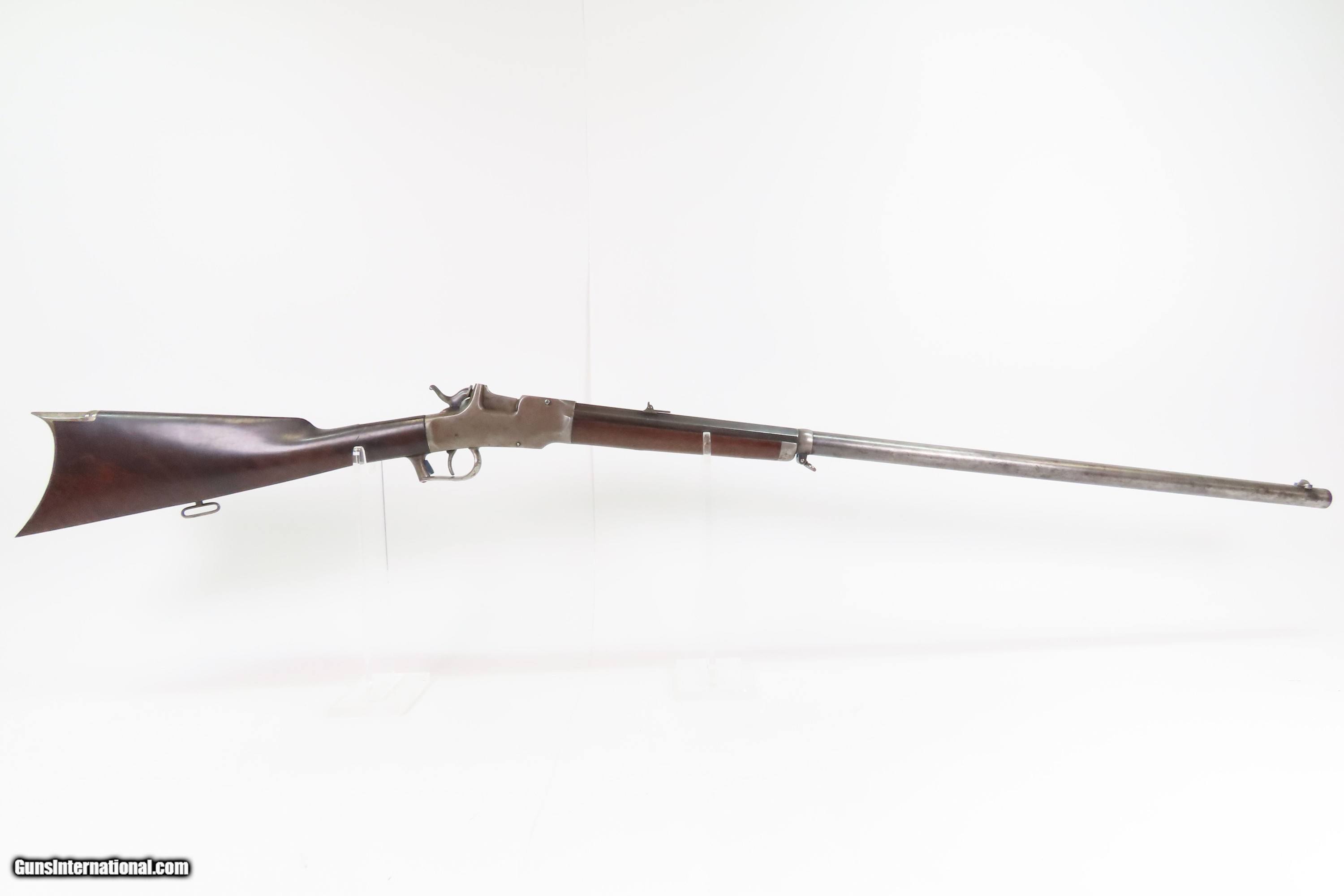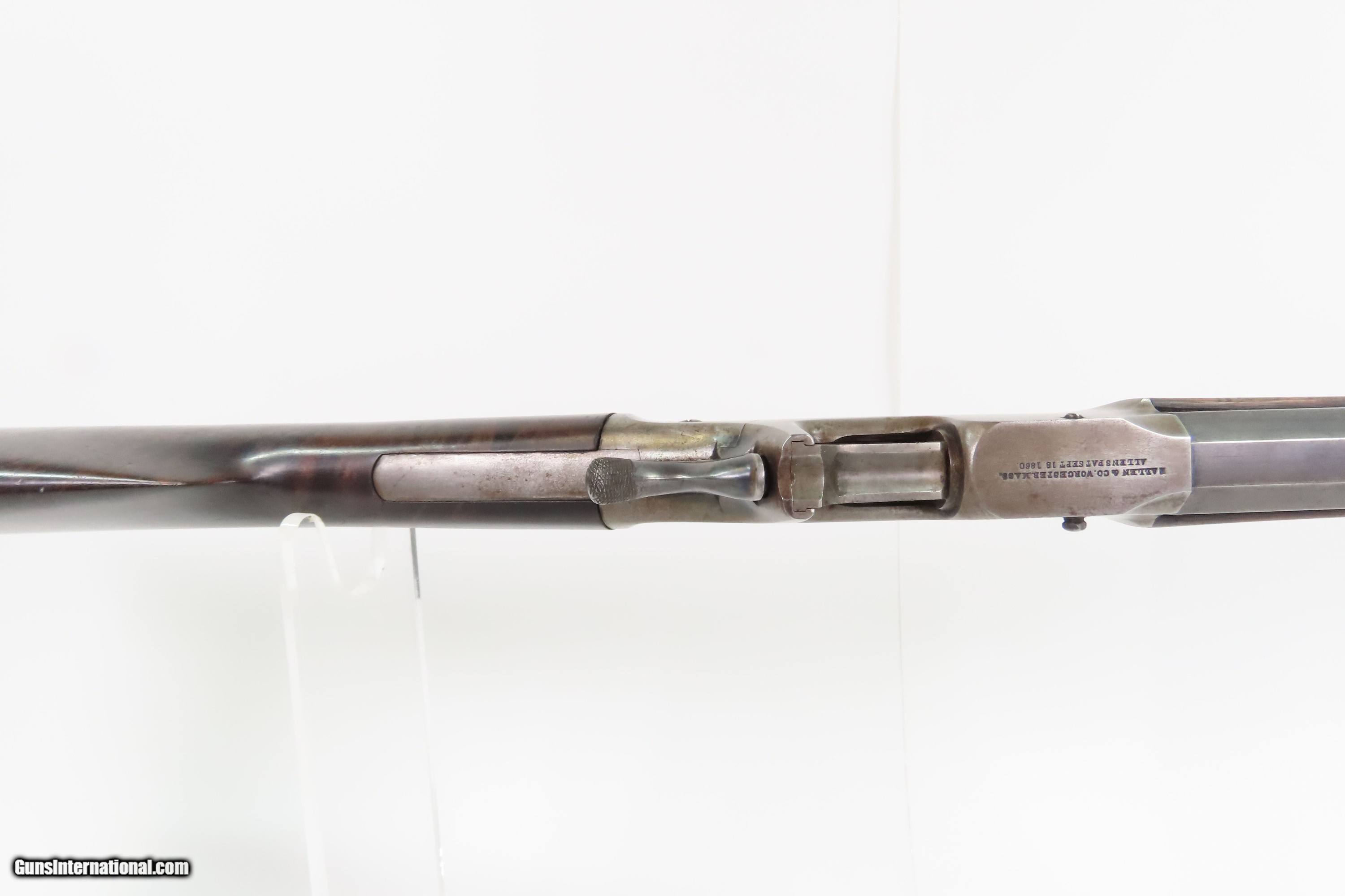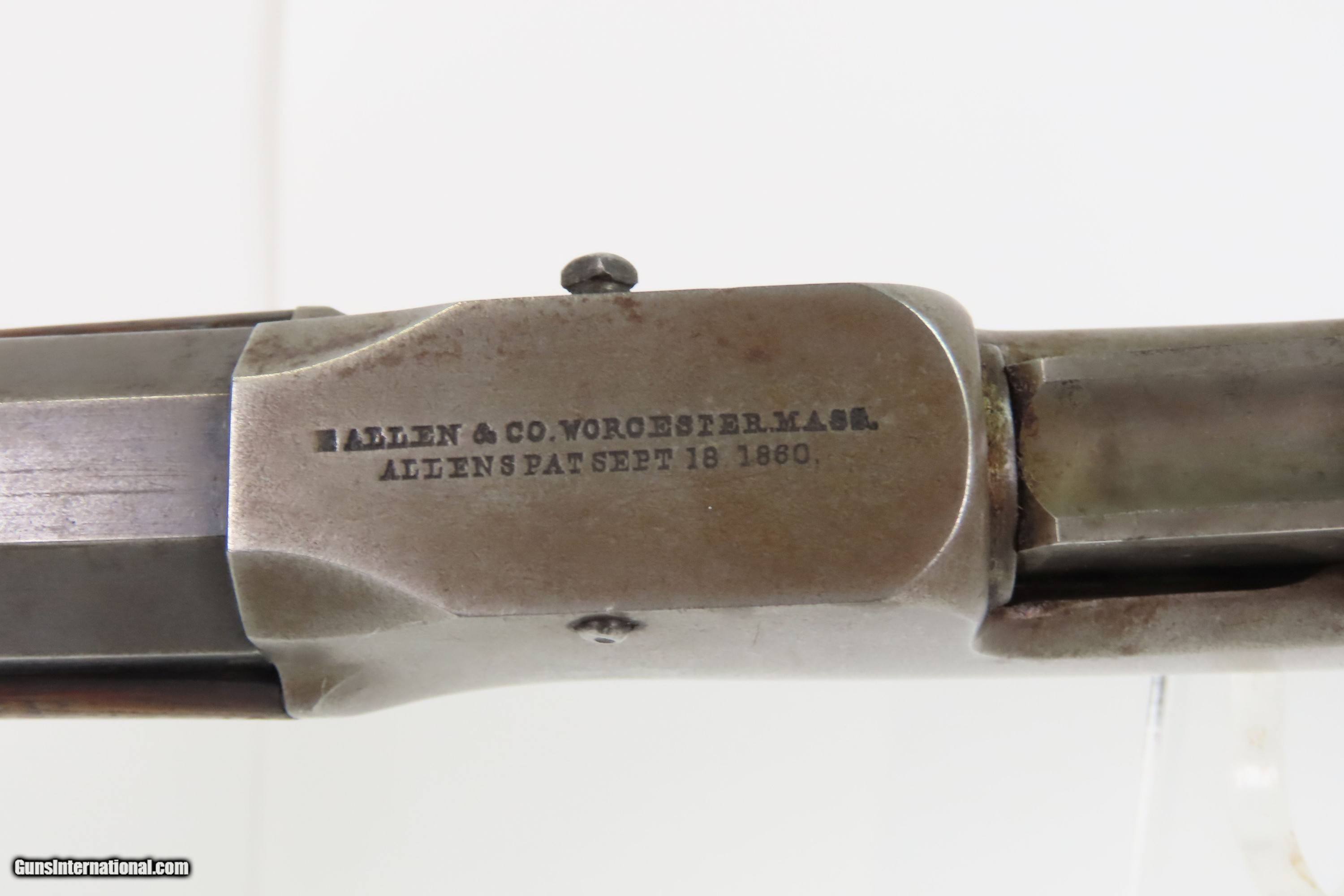 Description: CIVIL WAR Antique ETHAN ALLEN & CO. Drop Breech .38 RF Single Shot RIFLE Falling Block Single Shot Rifle in .38 Caliber with Sling Here Ancestry Guns presents an antique Allen & Co. Falling Block Rifle in .38 Rimfire, made circa the early 1860s in Worcester, Massachusetts. Fewer than 2,000 of these rifles are thought to have been made in any variant. Though not standard issue, this rifle saw service in the American Civil War through private purchases by soldiers. It features a half-octagonal, half-round barrel with a very neat adjustable rear sight. The rear sight tips and its arm points to various ranges which also have notches which allow the arm to rest in under spring tension. This rifle is equipped with the optional sling loops ahead of the forearm and under the buttstock. The lowering action of the breech block automatically ejected the spent cartridge. The top of the barrel is marked “E. ALLEN & CO. WORCESTER MASS. / ALLENS PAT SEPT 18. 1860.”. The butt plate has a cleaning rod trap. The overall condition is good. Original finishes. Strong action. The bore is good for its age, has darkened and does contain a budge. Mixed gray patinas. The fancy walnut stock is solid with an average amount of wear and light chipping. Markings are legible. Own the original! This is a legitimate antique and not a reproduction. Barrel is 30 inches. Caliber: .38 Rimfire Overall condition as seen in photos. Very Fast. Very Safe. FREE SHIPPING WORLDWIDE. Delivered directly to your door by express mail! Guaranteed AUTHENTIC & Includes CERTIFICATE OF AUTHENTICITY. $2300 #259589 Antique: Yes Price: $2,300.00 Buy Now Pay with