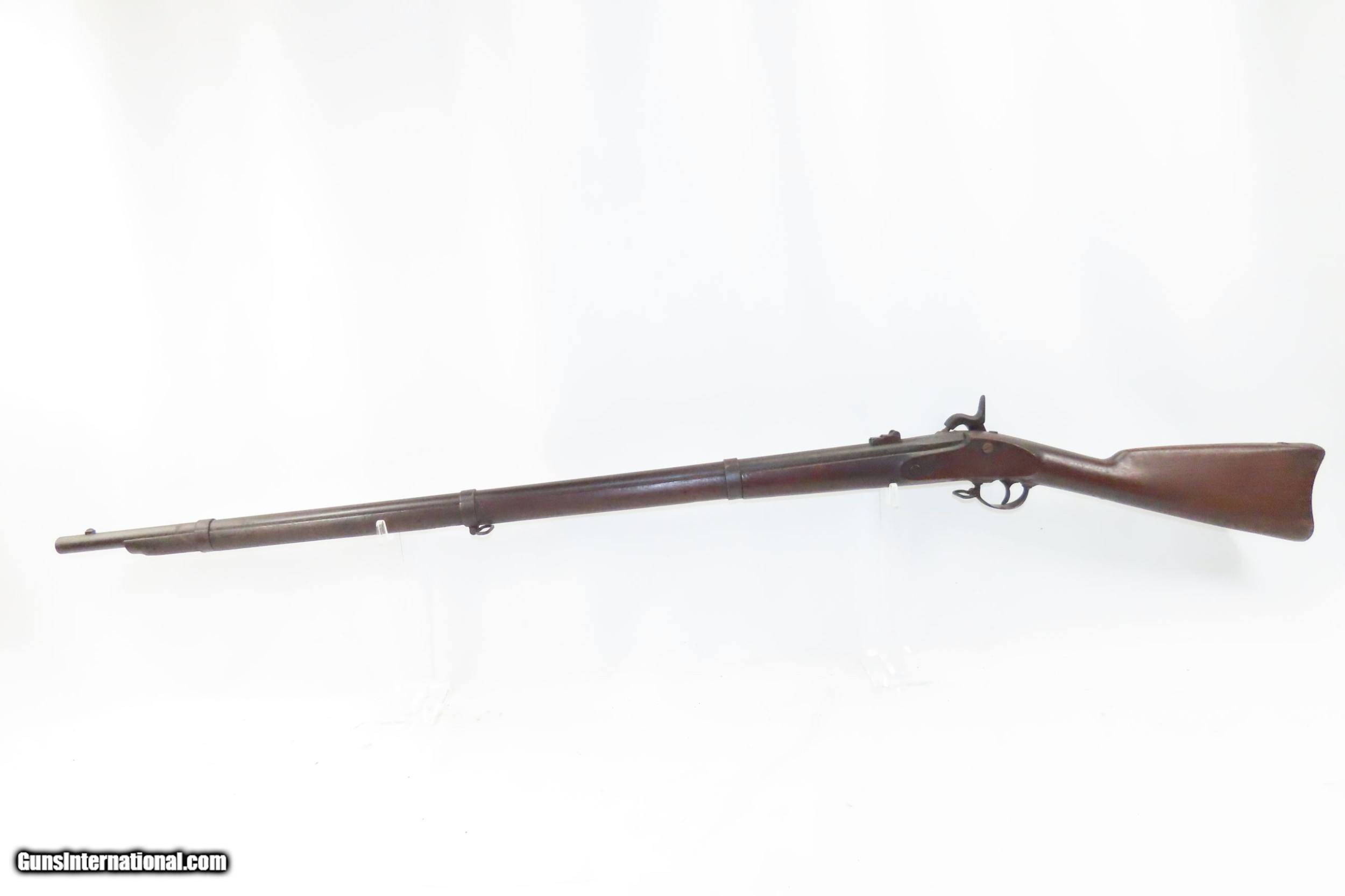 Description: CIVIL WAR Antique NORWICH ARMS Contract U.S. M1861 Percussion Rifle-MUSKET James D. Mowry U.S. Model 1861 “EVERYMAN’S RIFLE” Here we present an antique U.S. Model 1861 Rifle-Musket, made on contract by James D. Mowry of Norwich Arms Co. of Norwich, Connecticut circa 1863. Only about 22,000 of these rifles came out of this contract, quite a small number when compared to the total. The Model 1861 is representative of the “everyman’s” rifle during the American Civil War. This was the last hurrah of the rifle-musket as arms development and tactics rapidly advanced during the short period of the American Civil War. Nevertheless, the 1861 represented new technology as it was made for use with the Minié ball, a hollow based, conical projectile that was small enough to quickly push down the muzzle of a rifled barrel and expanded to create a good gas seal unlike a solid, round ball. Almost immediately after the war, the US military switched from the old muzzle loading type weapons to the newer breech loading rifles, bringing an end to the musket as a standard frontline firearm in American history. This .58 caliber rifle’s lock is dated “1863” and marked “U.S./NORWICH”. The barrel tang is dated “1862” and the left side of the barrel has the “V/P/eagle head” proofs. Cartouches are “JM” and “AJN”. The overall condition is very good. Original patina. Strong action. The bore has good rifling and probably has not been touched since the period of use—will clean up better. Solid walnut stock with an expected amount of handling/storage wear. Clear markings including cartouches and a Mowry marking on the left stock flat. The ramrod is absent. Own the original! This is a legitimate antique and not a reproduction. Barrel is 40 inches. Caliber: .58 Percussion Overall condition as seen in photos. Very Fast. Very Safe. FREE SHIPPING WORLDWIDE. Delivered directly to your door by express mail! Guaranteed AUTHENTIC & Includes CERTIFICATE OF AUTHENTICITY. ancestryguns $2365 #217378 SOLD Antique: Yes |