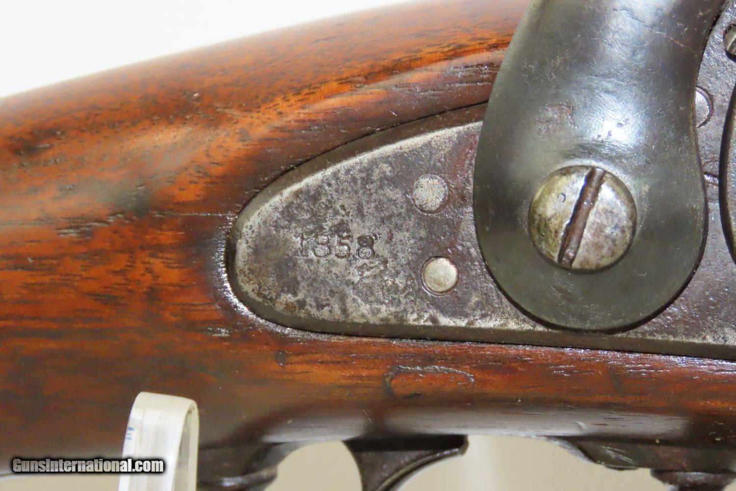 Description: CIVIL WAR Antique US SPRINGFIELD ARMORY Model 1855 .58 Caliber Rifle-MUSKET SCARCE Maynard Tape Primed Musket! Here we present an antique Springfield Armory US Model 1855 Rifle-Musket, manufactured in 1858 in Springfield, Massachusetts. The Model 1855 was the first US musket to utilize the .58 caliber Minie ball. The US military was piloting a concept for all U.S. Army troops to have a common caliber, so that logistics would be simplified. The chosen caliber was .58, and it utilized the cutting-edge cone-shaped Minié ball with the hollow base instead of a spherical ball. Also, relatively new and short-lived was the Maynard tape priming system, to which Springfield had purchased the rights. Instead of directly priming the nipple by hand for each shot, the user would simply install a roll of paper percussion caps, and a single cap would be exposed, sheared and carried by the hammer to detonate on the nipple. Of course, the standard rifle percussion caps could also be used. This system was simply abandoned with the beginning of the American Civil War as arms production was driven by effectiveness and efficiency, resulting in the simplified Model 1861. The overall condition is good. The action is strong. The bore remains in good shape. There are two cartouches on the left side of the stock that are visible, but not legible. “US” is stamped atop the buttplate tang. “US/SPRINGFIELD” and “1858” is engraved on the lock, along with the Federal Eagle on the Maynard system’s door. Here is a fantastic Springfield for the Civil War collection! Own the original! This is a legitimate antique and not a reproduction. Barrel is 40 inches. Caliber: .58 Overall condition as seen in photos. Very Fast. Very Safe. FREE SHIPPING WORLDWIDE. Delivered directly to your door by express mail! Guaranteed AUTHENTIC & Includes CERTIFICATE OF AUTHENTICITY. ancestryguns $2750 #20192 SOLD Antique: Yes |