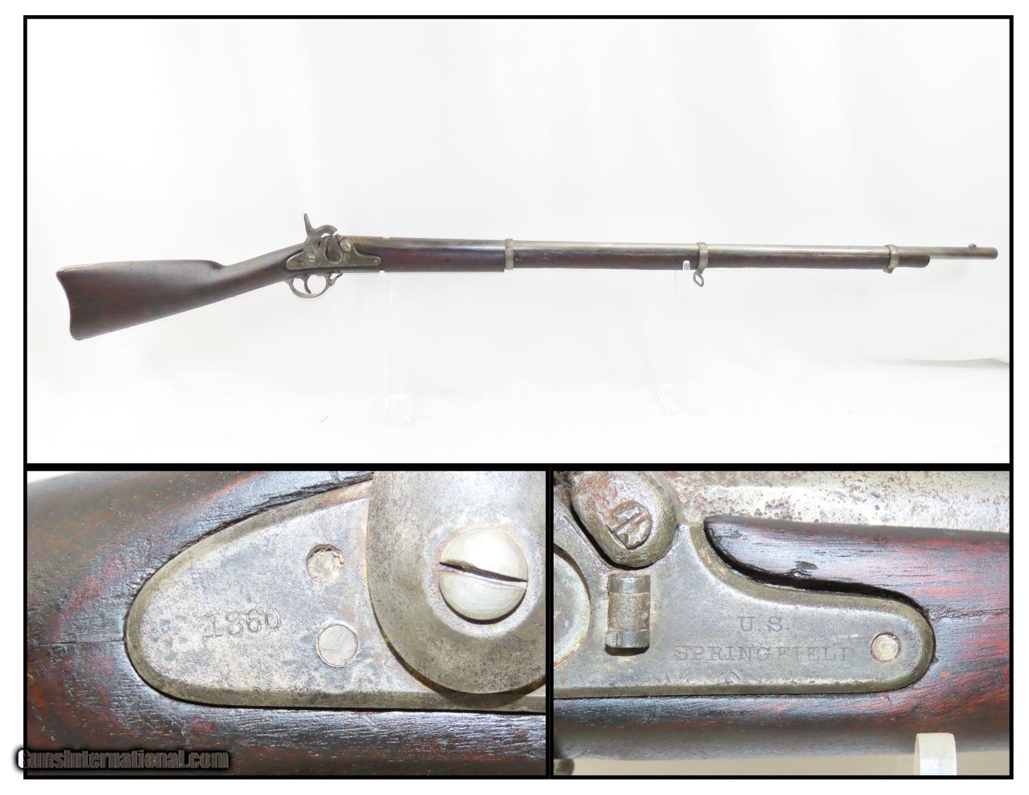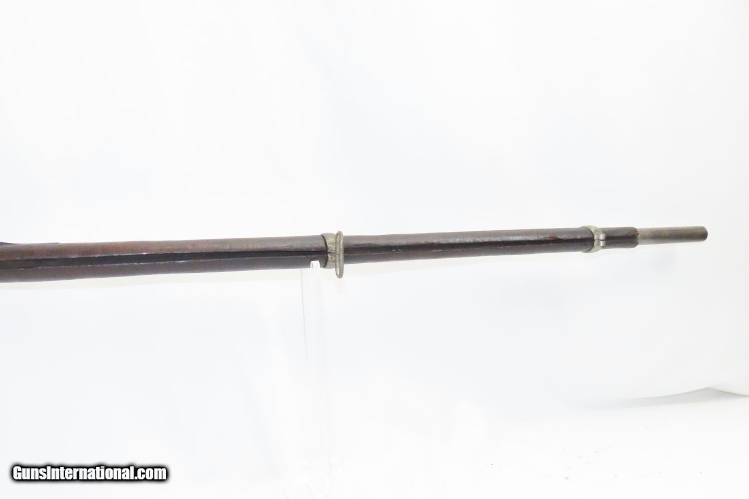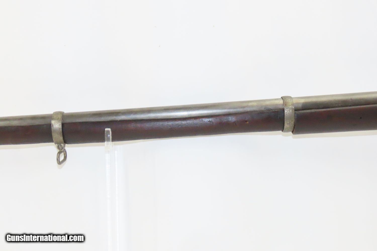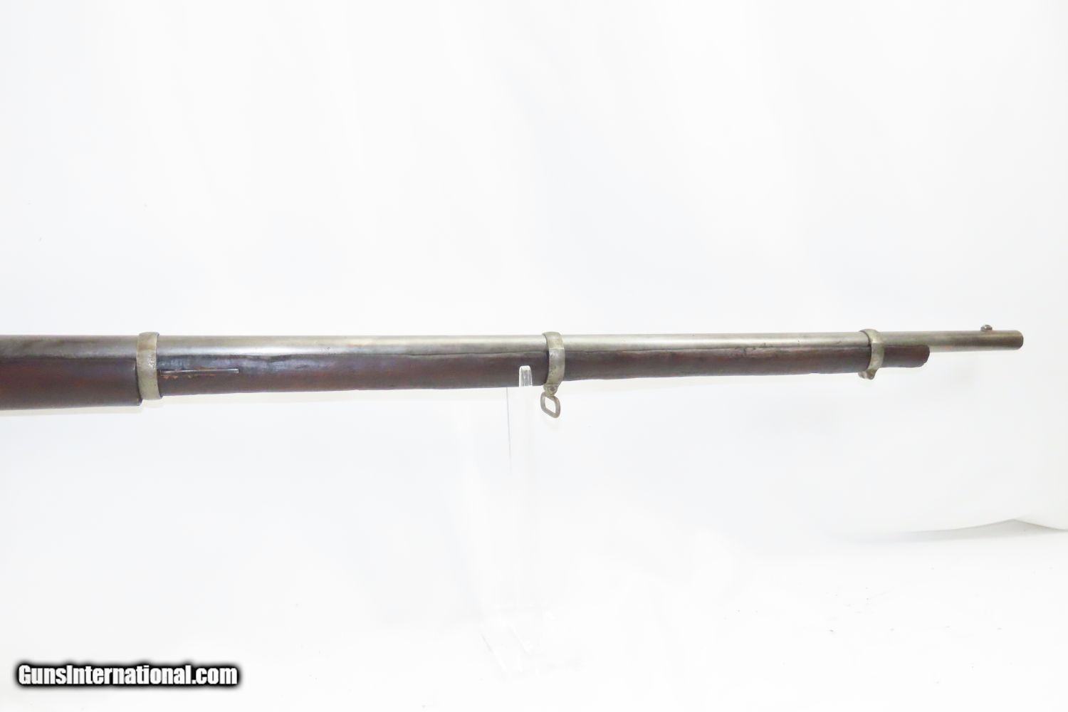 Description: CIVIL WAR Antique US SPRINGFIELD ARMORY Model 1855 TAPE PRIMED Rifle-MUSKET NORTH & SOUTH Used Maynard Tape Primed Musket! Here we present an antique Springfield Armory US Model 1855 Rifle-Musket, manufactured in 1860 in Springfield, Massachusetts. The Model 1855 was the first US musket to utilize the .58 caliber Minie ball. The US military was piloting a concept for all U.S. Army troops to have a common caliber, so that logistics would be simplified. The chosen caliber was .58, and it utilized the cutting-edge cone-shaped Minié ball with the hollow base instead of a spherical ball. Also, relatively new and short-lived was the Maynard tape priming system, to which Springfield had purchased the rights. Instead of directly priming the nipple by hand for each shot, the user would simply install a roll of paper percussion caps, and a single cap would be exposed, sheared and carried by the hammer to detonate on the nipple. Of course, the standard rifle percussion caps could also be used. This system was simply abandoned with the beginning of the American Civil War as arms production was driven by effectiveness and efficiency, resulting in the simplified Model 1861. This one has been there and done that. The action functions. (Weak hammer spring and there is no tape lid) Bore has been crudely bored out. Solid stock despite containing a few repairs around the lock. Missing rear sight. Missing ramrod. Your chance to own a Springfield Model 1855 Maynard Tape-Primed Musket! Own the original! This is a legitimate antique and not a reproduction. Barrel is 40 inches. Caliber: .62 Percussion Overall condition as seen in photos. Very Fast. Very Safe. FREE SHIPPING WORLDWIDE. Delivered directly to your door by express mail! Guaranteed AUTHENTIC & Includes CERTIFICATE OF AUTHENTICITY. ancestryguns $1245 #210387 SOLD Antique: Yes |