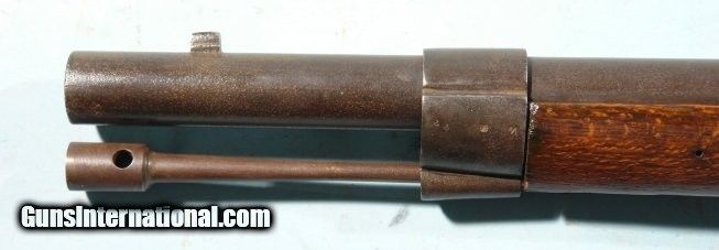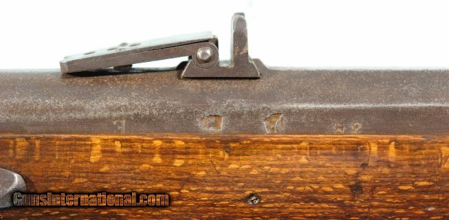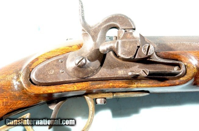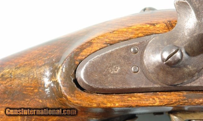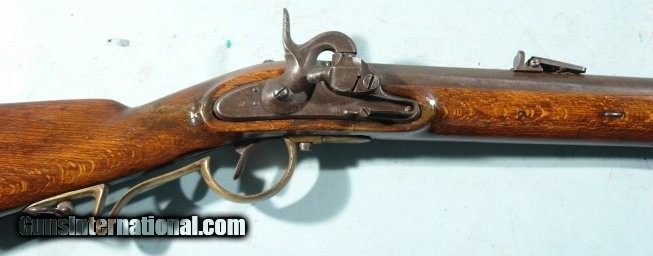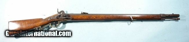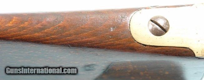 Description: CIVIL WAR AUSTRIAN AUGUSTIN TUBE LOCK JAGER KAMMERBUSCHE M1849 RIFLE CIRCA 1849-64. 49” overall with 33” .75 caliber multi-groove rifled barrel with mirror bright bore and crisp rifling. Blade front and Long Range two leaf rear sights. Lock plate numbered with "8-51" date(matching) and stamped with Austrian proof to rear of hammer. All original with all the lock parts and lock in working order. Excellent with lovely crisp plum patina on metal and stock in very good condition with old repaired minor hairline at wrist barely visible. Small quantities imported during the Civil War and are very seldom seen for sale having not been converted to accept cap. Strangely enough this one has mint 12 groove rifling right on back to the breech so probably never used. SOLD Antique: Yes |