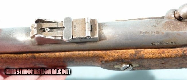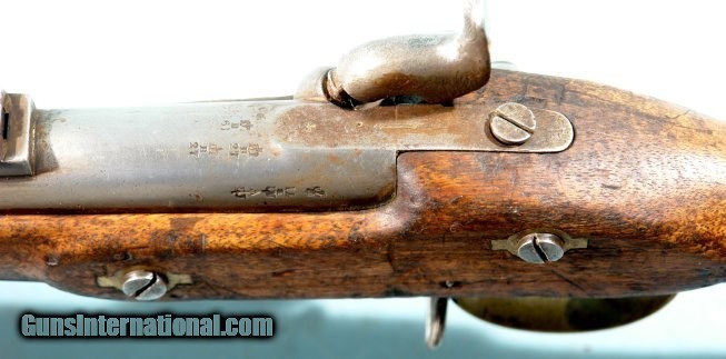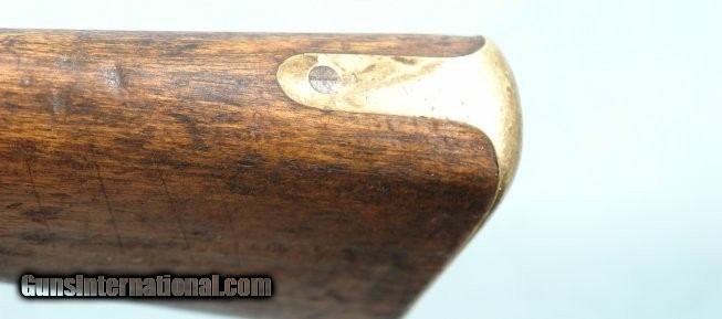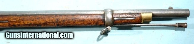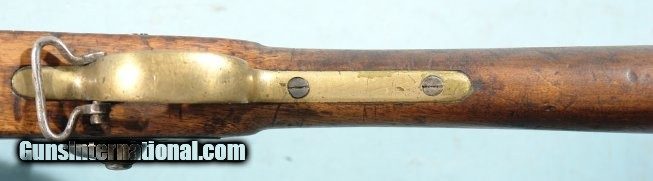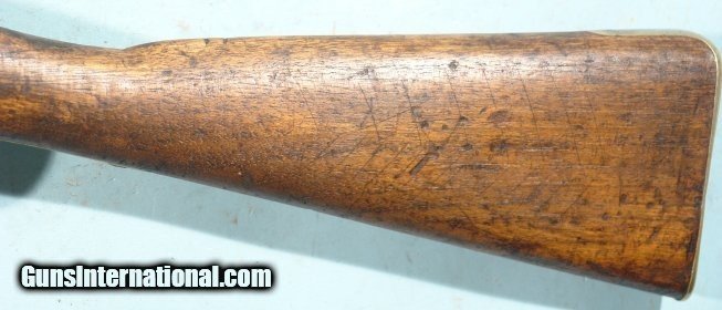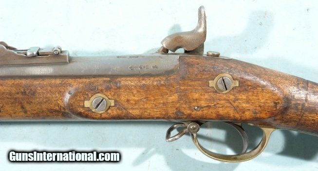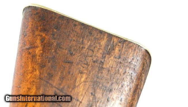 Description: CIVIL WAR ERA BRITISH TOWER PATTERN 1853 PERCUSSION .577 CAL. RIFLE MUSKET. All original and complete including the ramrod. 39” rifled barrel with British Royal Ordnance proofs at left breech. Lock plate stamped “CROWN/VR” and “1857/TOWER”. Stock with “WD” inspector’s stamp on right side of butt over broad arrow. Very good overall with very nice deep grey metal original patina and extra nice markings. Stock with battle wear and nice old patina. Perfect working order and surprisingly excellent bore with crisp rifling. Type used by the both the North and the South during the Civil War. Nice example at a reasonable price. SOLD Antique: Yes |