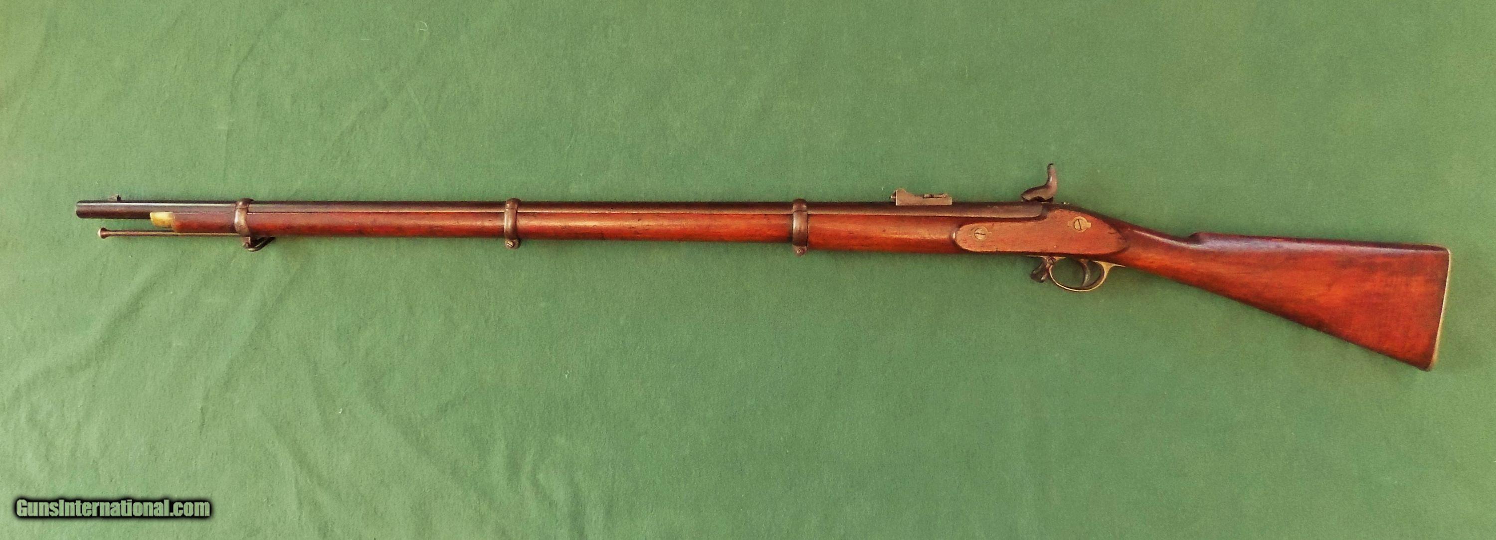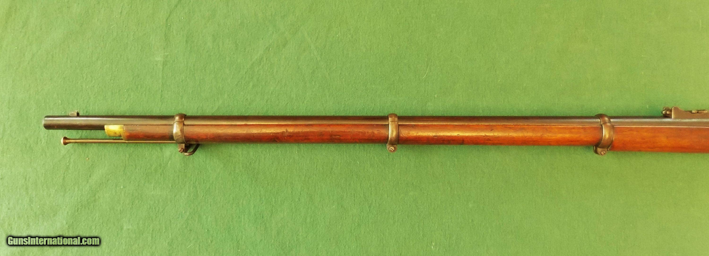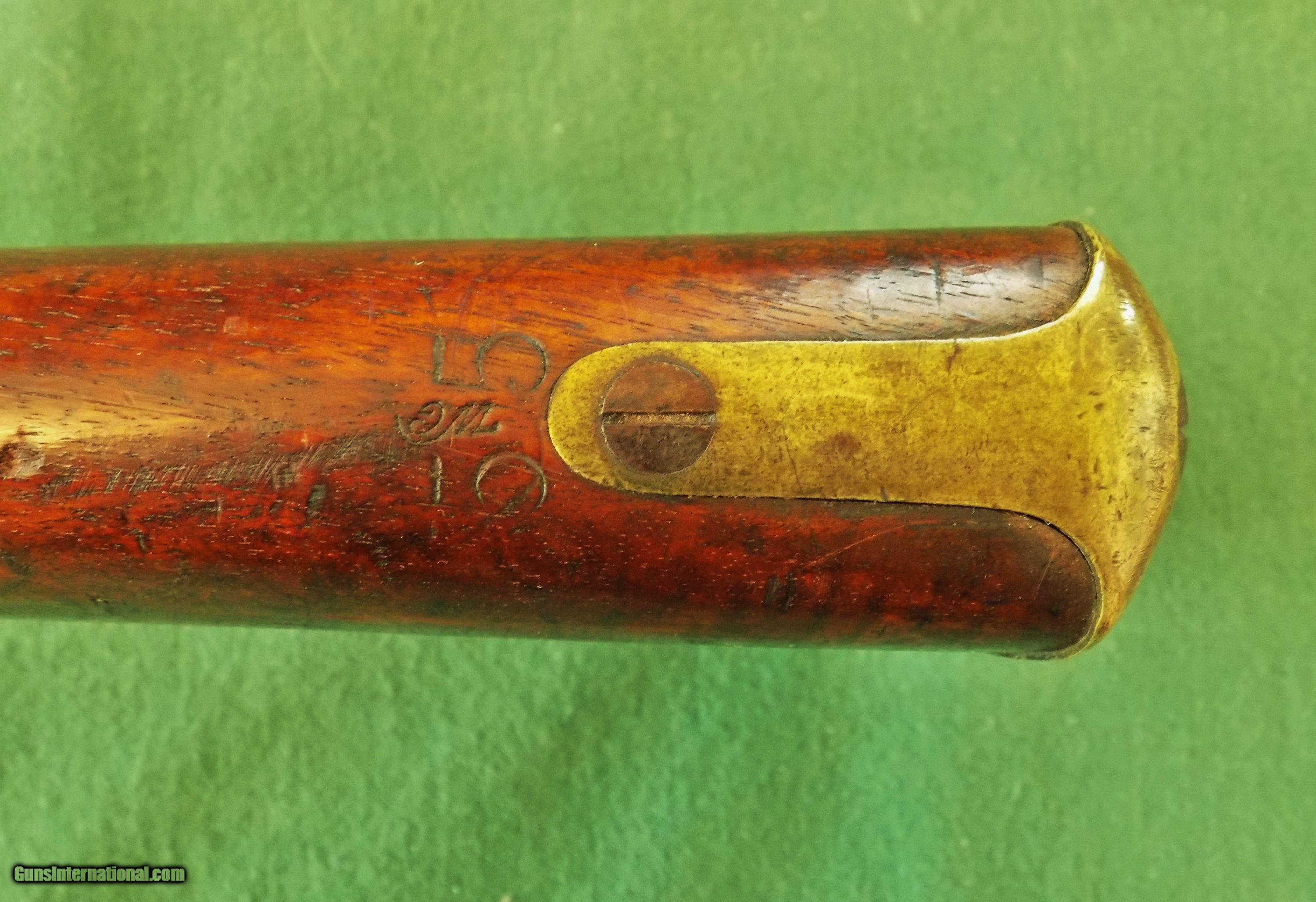 Description: Enfield Pattern 1853 Rifle - Musket, .58 Caliber. Percussion lock marked "1862 Tower". Bottom of buttstock stamped, "A Homer", an export company. "5wc5" marked near top of buttplate and initials, "J W" carved into left side of buttstock. Good bore, rare brass ramrod, minor pitting on breech. Overall very good condition wood and metal. An above average example. Markings suggest Confederate use, if verified this Enfield would be worth much more than the listed price. SOLD Antique: Yes |