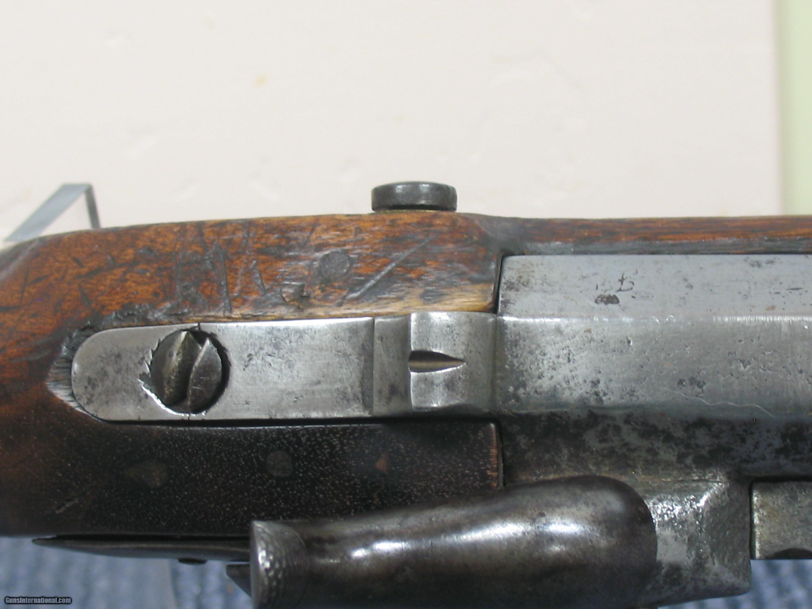 Description: The Prussian Model 1809 Smoothbore Musket (often referred to as “the Potsdam Musket”) was the most common Prussian arm imported during the American Civil War. Ordinance records list 142,823 being purchased and placed in service by the Federal government during 1861 and 1862. The weapon was originally manufactured as a flintlock for use by the Prussian Army, with the lockplate stamped with the particular armory of manufacture - “Potsdam”, “Saarn”, “Neisse”, “Suhl” or “ Dresden”. Beginning in 1839 most were converted to the percussion system, with the year of that upgrade stamped on the underside of the barrel. Starting in 1855, the Prussians began to rearm their front line infantry with breech loading Dreyse rifles. Accordingly, even though the 1809 Model remained a well made and fully serviceable weapon, the Prussians sold many of their surplus to the United States government. The gun proved a reliable long arm for many infantry units. It was referred to by some as a “pumpkin slinger”, given the large caliber (.71/.72) of the weapon. The damage this sized lead ball did at close range was substantial. Unique to this smoothbore was a fixed rear sight mounted on the tang/breach plug. This particular example has decent exterior metal work in the original armory bright, with nice condition brass bands. The lock mechanics are good. The inside of the barrel is dark. The stock is solid, with good finish and wood to metal fit, but suffers from a number of wood splits or cracks as shown in the pictures provided. Apparently, some idle soldier decided to carve “1812” in the butt plate, which it is reasonable to presume was the gun’s original year of service issue. The year on the lock has worn off with time. The gun is all original and complete, save for missing the small ramrod retaining spoon in front of the nose band. Also, the original ramrod was replaced with an early Civil War period substitute consistent with the type then used with the U.S. Model 1842 smoothbore percussion musket. ( This ramrod substitution is often seen with these imported guns, and was logically a veteran Federal Soldier’s preferred alternative to the smaller headed Prussian ramrod). The lockplate has a “Saarn” armory stamp of original manufacture (faded at two letters). Underneath the barrel the 1845 date of percussion conversion is stamped. There are script “S”’s appearing on the lock and underneath the barrel, but I cannot discern the additional “a” or “oe” that would identify the percussion conversion as occurring at Saarn or Soemmerda. “19455” appears as a serial number on the bottom of the barrel, the right side of the tang/breach plug base, the inside of the percussion lock, and on the butt plate. The part matchup number “S8” still appears on a number of screw heads. The underside of the barrel, barrel bands and trigger plate are all maker stamped. Packing and shipping to anywhere in the Continental USA west of the Mississippi by UPS ground will cost $50 in addition to the purchase price. Shipping charges elsewhere at actual cost. I do not accept payment by credit card or Pay Pal. Please Note: I am just an old guy who collected guns, parts and civil war memorabilia for many years who is liquidating his collection. I do not make my living buying and selling guns. My comments on any particular gun being sold are based on my knowledge as a collector, my examination of the gun, my research, and my comparison with other similar guns. I do not purport to be the second coming of Norm Flayderman, and recognize that there is always something to learn in connection with antique guns (although others I encounter seem to think they know everything). The pictures I post are intended to give you what you need to make a fair assessment of the item being sold. Please study these closely. If you find there is some detail that is unclear, let me know and I will get you that detail if it exists. Finally and most importantly, be clear that the guns I am selling are being sold as collectibles and nothing more. I can tell you from years of competing with the NSSA as a black powder shooter, the shooting of antique guns is an activity that is totally different from modern shooting. The metallurgy of antique barrels and breach plugs can only sustain a certain amount of velocity, and may be impaired after 150 years or so of deterioration or abuse. Assuming a capable gunsmith has pronounced an antique gun safe to fire, only true black powder can be used, and then only in appropriate amounts. People who want to have the historical connection of firing an antique gun without the knowledge, experience or supervision to properly do so can wind up maiming or killing themselves. Please don’t do that. SOLD Curio/Relic: Yes Antique: Yes |