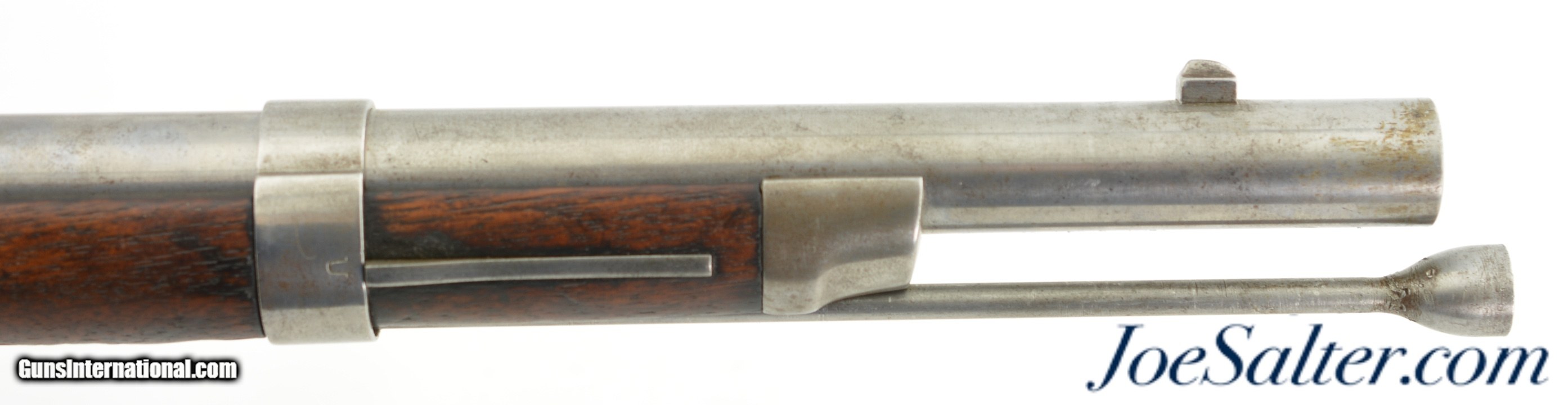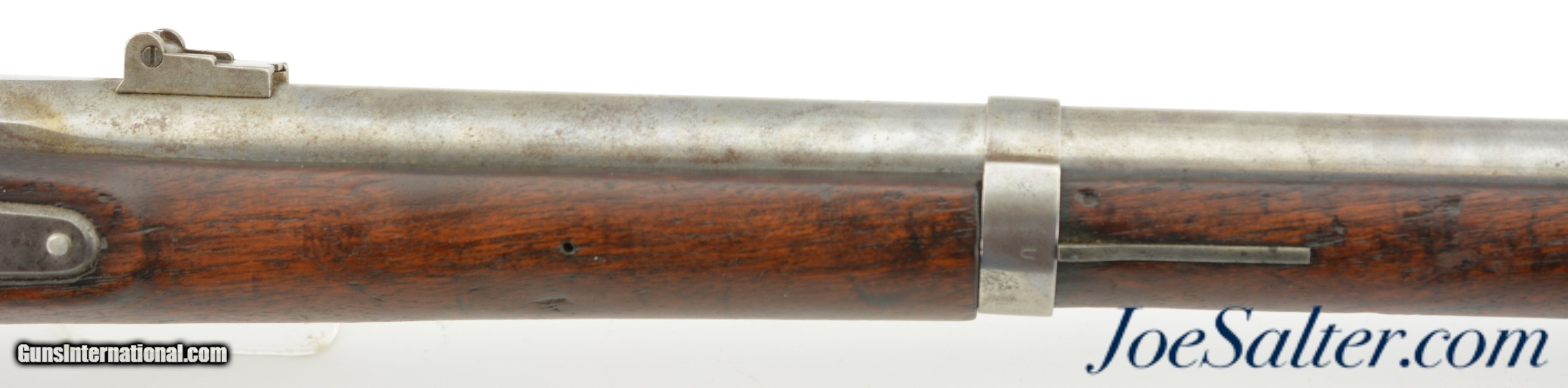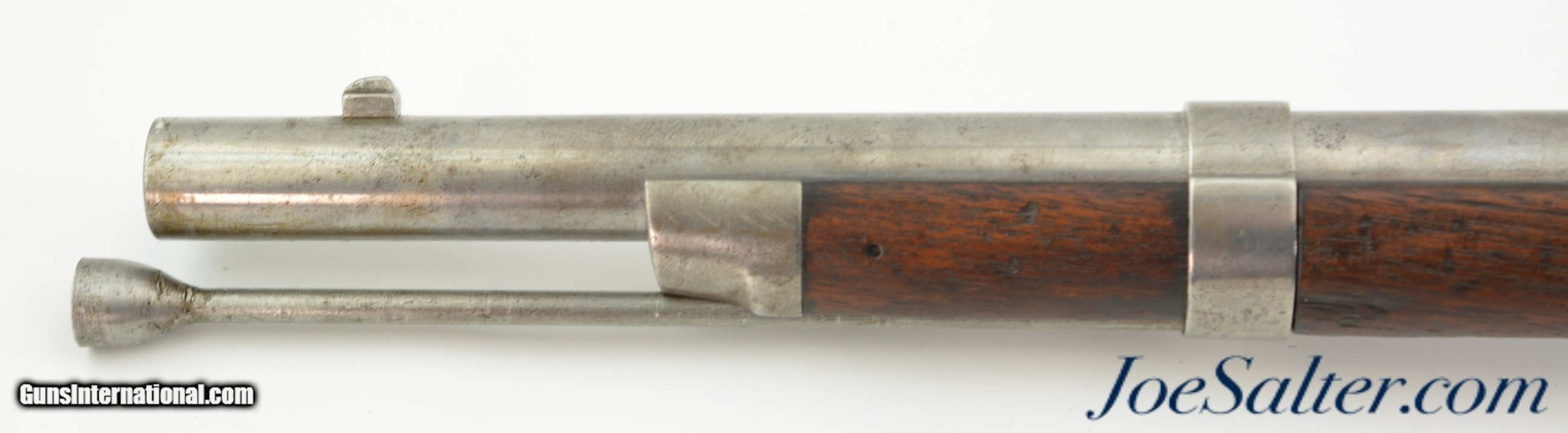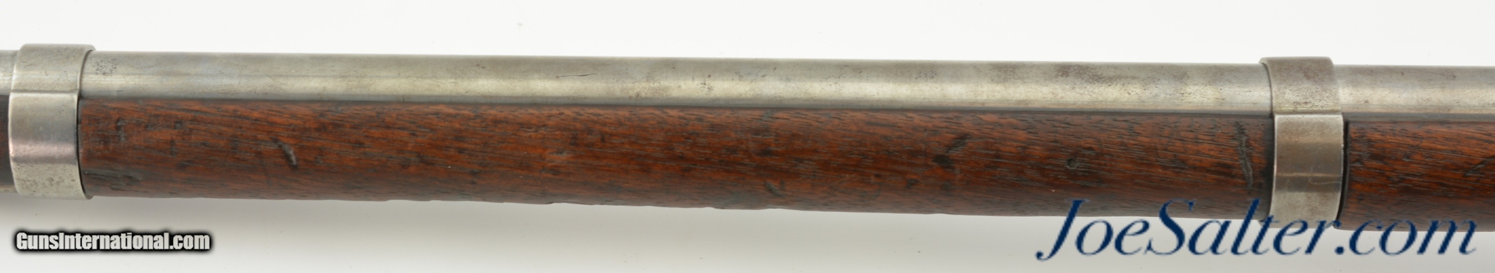Description: NSN, .58 Caliber, 40" barrel with a very good, bright bore that has some minor freckling within the grooves. This musket has an 1861-dated, Springfield-marked lock with the metal having an overall darkly mottled patina with even pitting and mild surface oxidation throughout. The walnut stock has some small chips present along the ramrod channel, and numerous small handling marks and blemishes scattered throughout, as well as no visible inspector cartouche on the left side opposite the lock. A correct ramrod is included, but does not fully seat within the channel, and the sling swivels have been removed. The lock is still tight and functions flawlessly. This is a very nice looking Civil War-dated US musket, in very good overall condition, and would make a fine piece for display. Antique SOLD Antique: Yes |