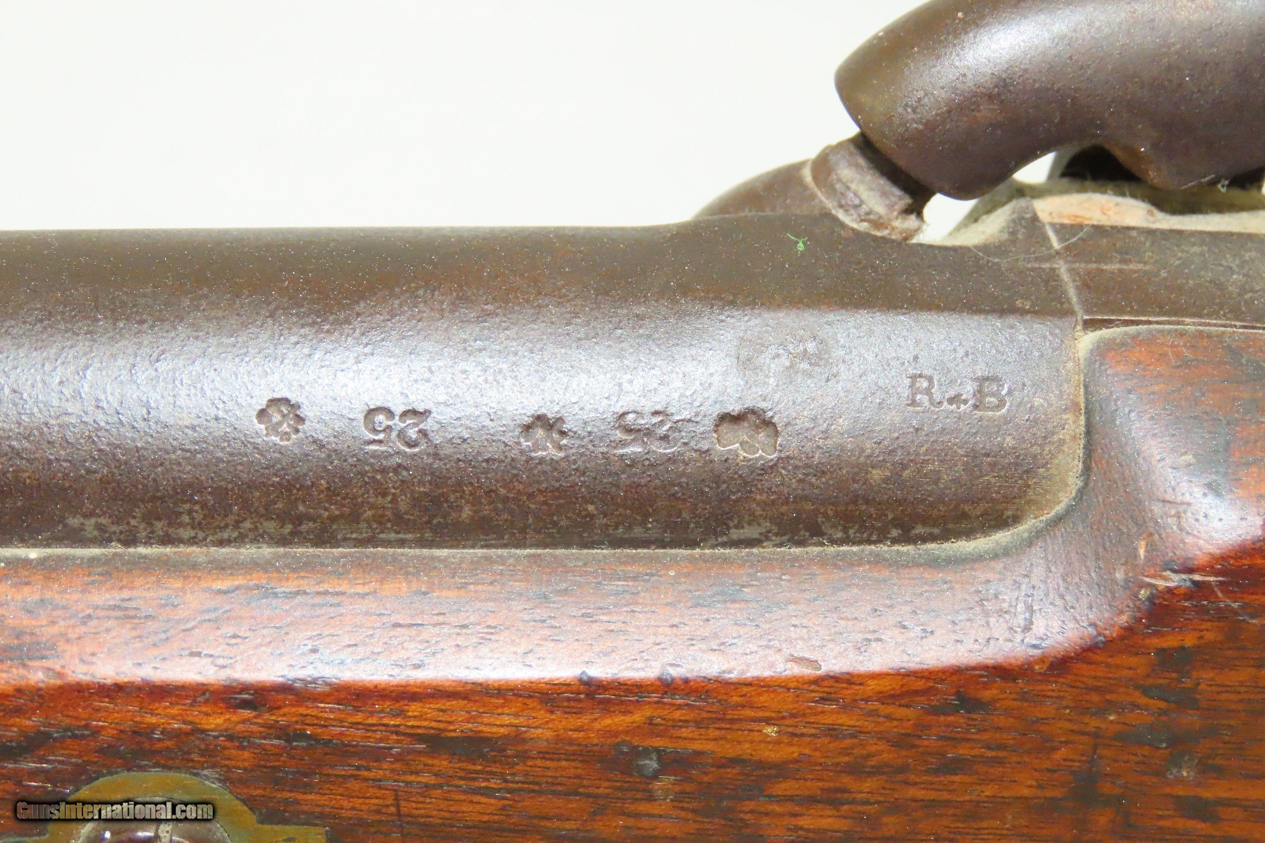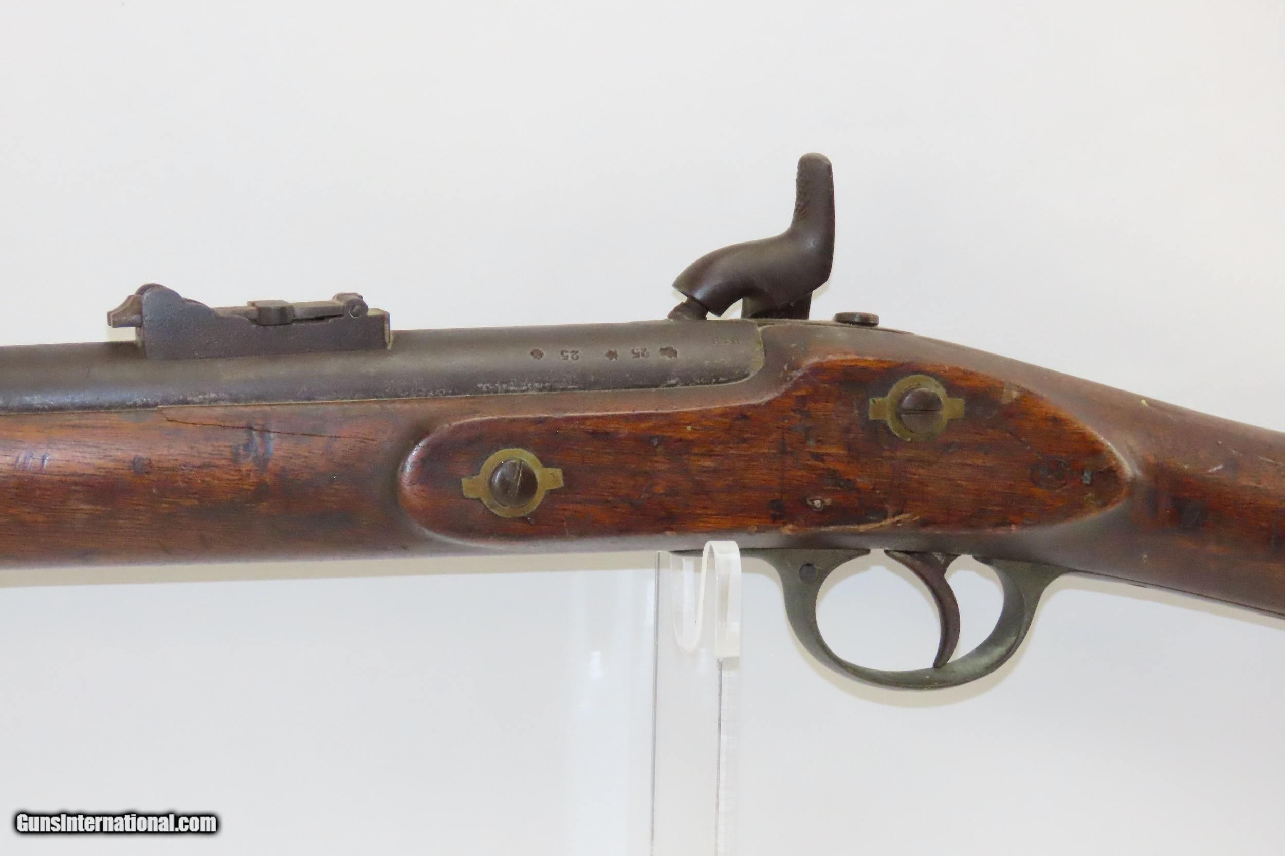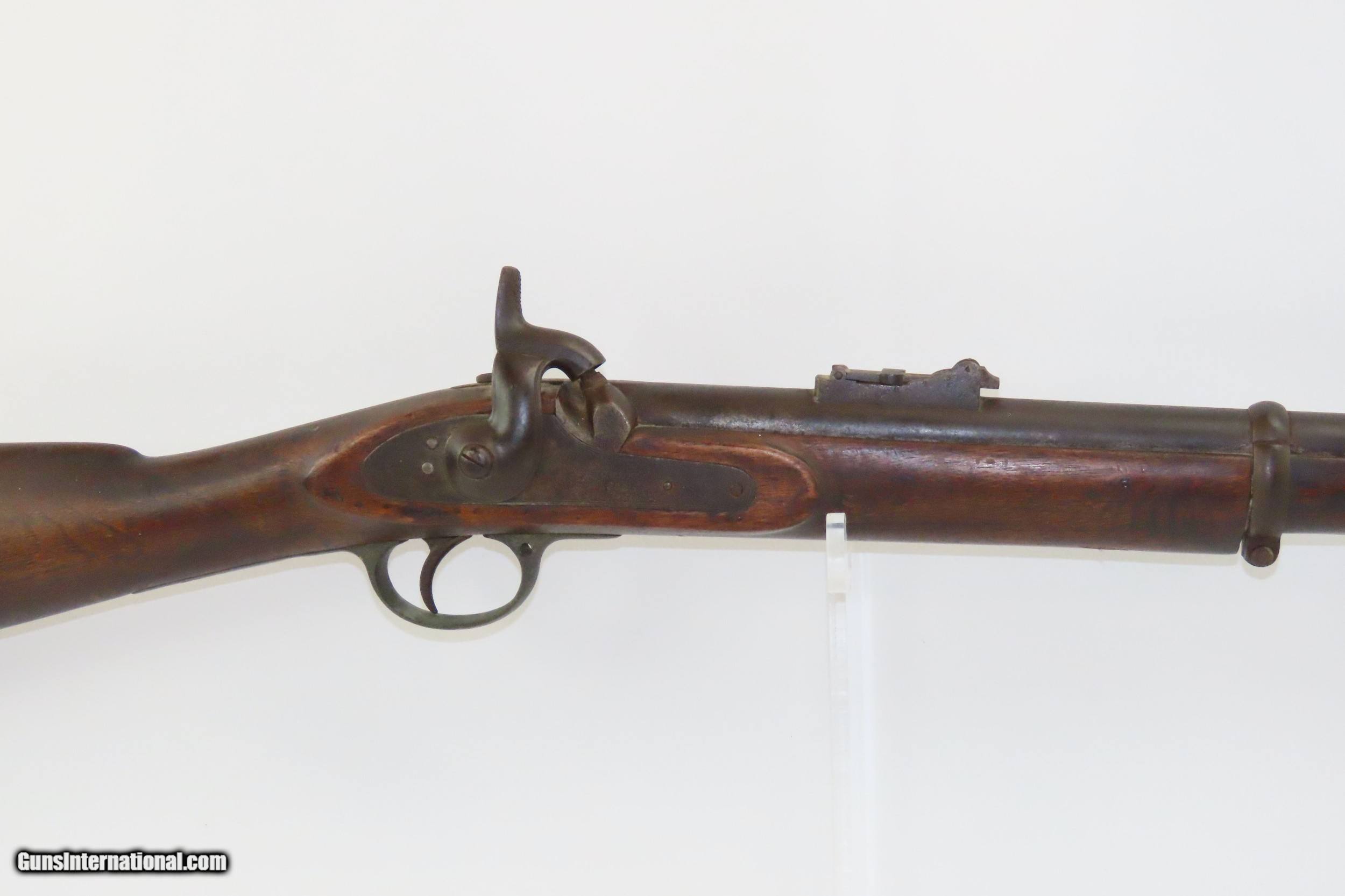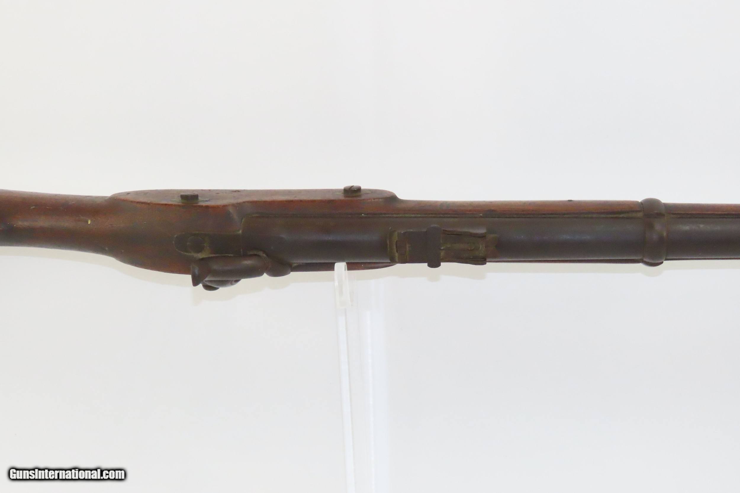 Description: CONFEDERATE Antique MOORE & HARRIS Marked ENFIELD Pattern 1853 Rifle-Musket Dated 1862 with “JC” Inspection Stamp and “SHG” Mark Here we present an antique Confederate Commercial Pattern 1853 Enfield Percussion Rifle-Musket, made by Moore & Harris in Birmingham, England, in 1862, with Sinclair, Hamilton & Company Marking. The P-1853 was Britain’s adopted rifle from 1853 until the Snider system was adopted to transform arms into breech-loaders. In addition to its use around the world with the British military, this was one of the most popular arms for the infantry during the American Civil War. This was a commercially produced musket that was marked “TOWER” and the date of manufacture: “1862”. There are the commercial (non-British military) Birmingham proof markings on the left side of the barrel. The repeating number “25” is how the barrel gauged. This rifled musket is marked “MOORE & HARRIS” along the bottom of the buttstock. The top of the comb is marked “SH/G3” under a crown, just ahead of the buttplate tang. This is the mark of Sinclair, Hamilton & Company who exported such muskets to the Confederacy during the American Civil War. The left stock flat bears the inspection mark “JC” within an oval, with a small two-character mark stamped behind it. “R+B” is marked at the breech of the barrel near the proofs. The interior of the ramrod channel have the names “WINFIELD” and “HODGETT” stamped inside. The Confederates imported more Enfields during the course of the war than any other small arm, buying from private contractors and gun runners. It has been estimated that over 900,000 P53 Enfields were imported into America and saw service in every major engagement of the war. Regarding the maker of this particular musket, William Moore began his own business in 1808 and did work making stocks for the famous Joseph Manton until about 1820. In 1836 he was made “Gunmaker-in-Ordinary” to King William IV of England. This meant that he was placed in a higher category than many of his peers and a chosen maker for the king. He began a partnership with William Harris in 1838 and began exporting their firearms to the United States around this time. The overall condition is very good, especially for a Confederate used weapon. There is a nice brown patina throughout. The action is strong. The bore is well-rifled. The stock is solid and remains in good condition. There are signs of usage throughout and a small sliver on the left stock flat near the barrel. This is a stunning piece of history that is a study in markings and may yet reveal more information! Own the original! This is a legitimate antique and not a reproduction. Barrel is 39 inches. Caliber: .577 Overall condition as seen in photos. Very Fast. Very Safe. FREE SHIPPING WORLDWIDE. Delivered directly to your door by express mail! Guaranteed AUTHENTIC & Includes CERTIFICATE OF AUTHENTICITY. ancestryguns $3995 #20145 SOLD Antique: Yes |