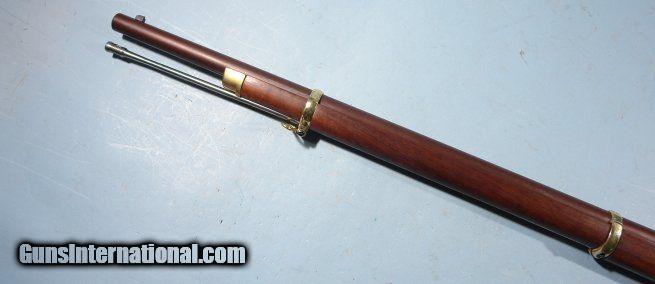 Description: EUROARMS COPY OF CIVIL WAR LONDON ARMS CO. ENFIELD PATTERN 1853 .577 RIFLED MUSKET. Italian made for US market. Like new unfired condition with crisp rifling and mint bore. No signs of reenactor carry as only marks on it are from storage (will blend in with some stain). Brilliant case colors on lock. Mint unmashed nipple(no fowling). Plum brown finish on barrel with only miniscule traces of streaking. 33" barrel with factory dovetail sights. Has nipple protector held by chain. Like new for less money than you could buy one at retail and of superb quality. SOLD |