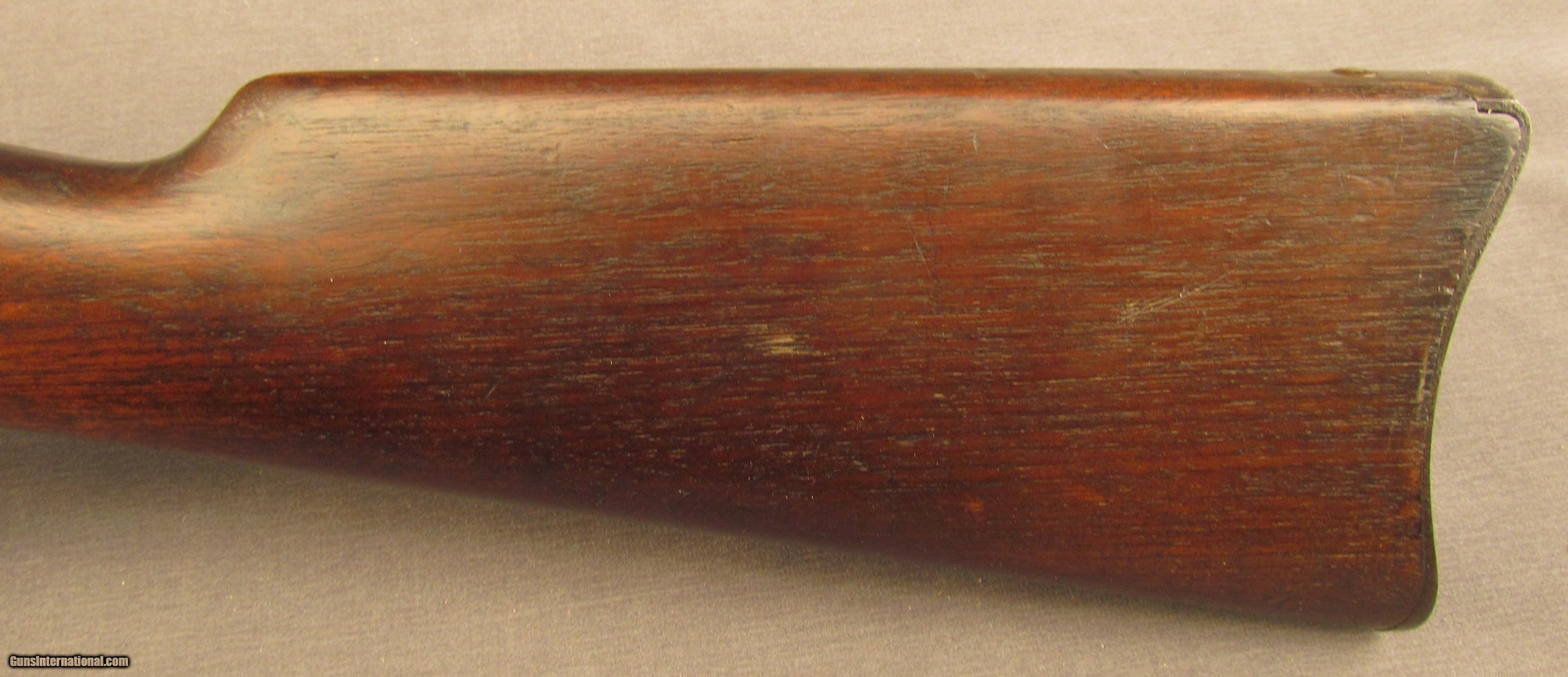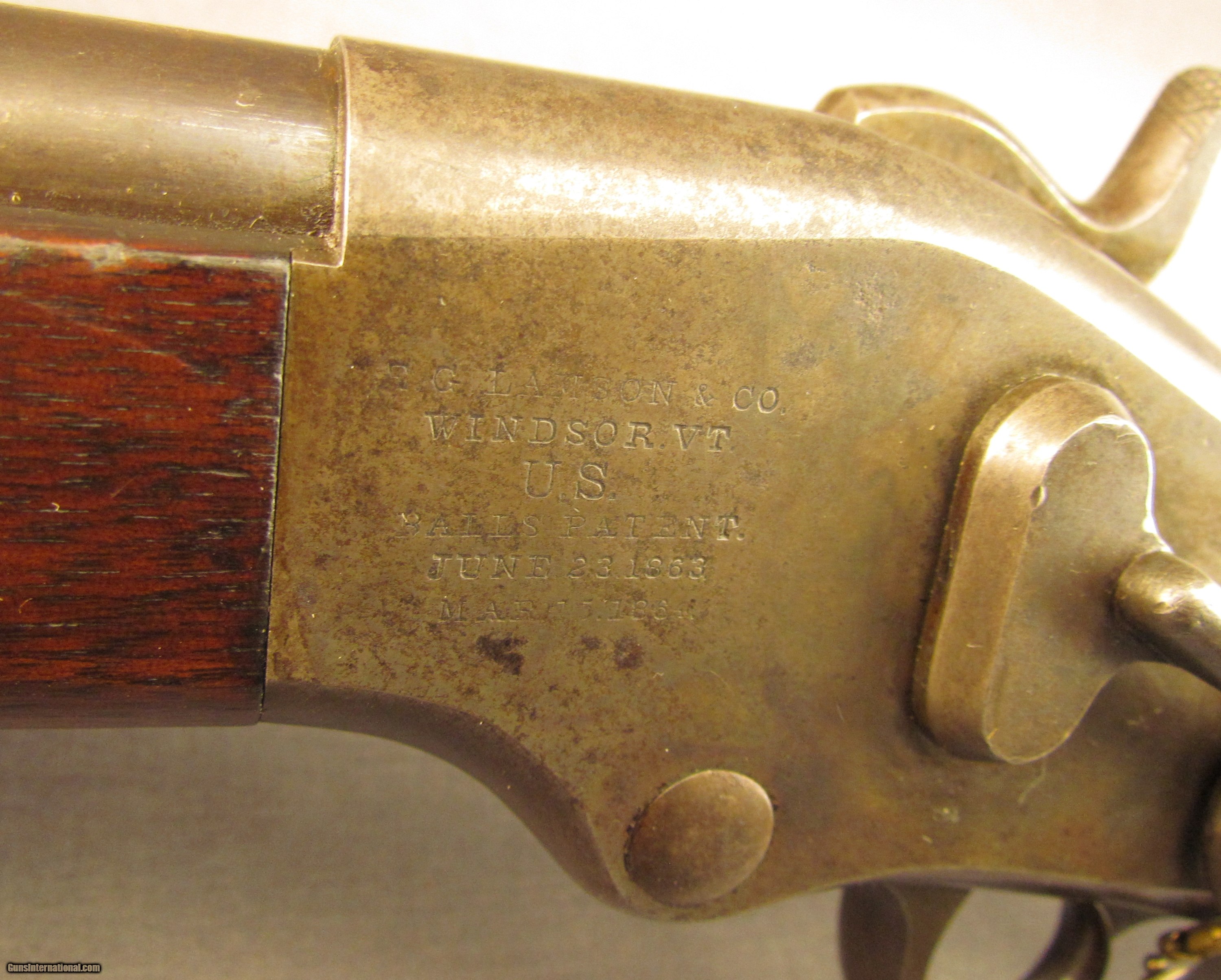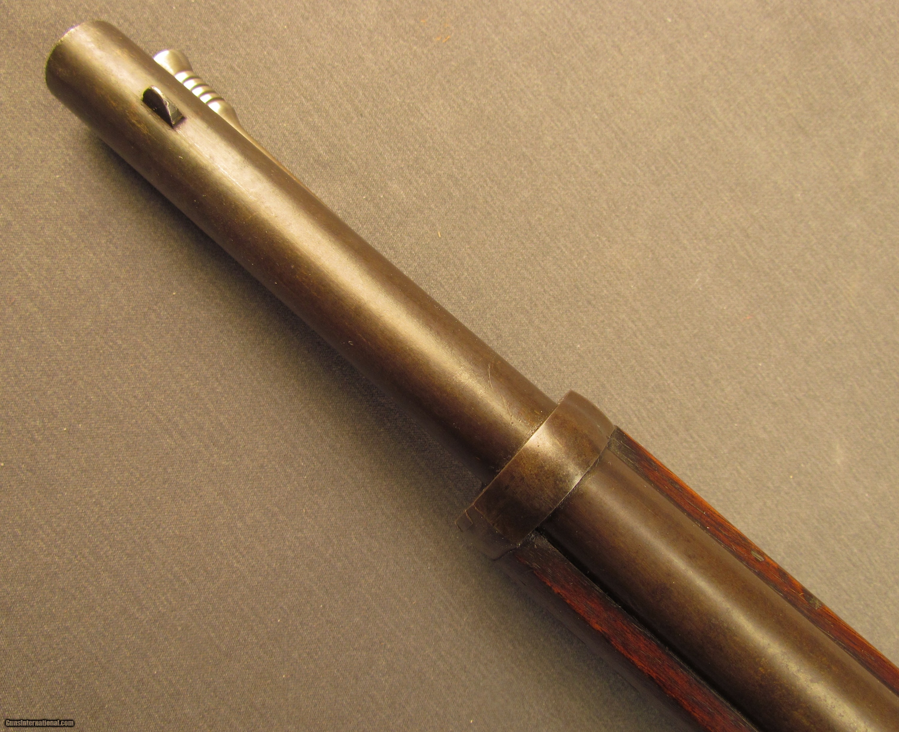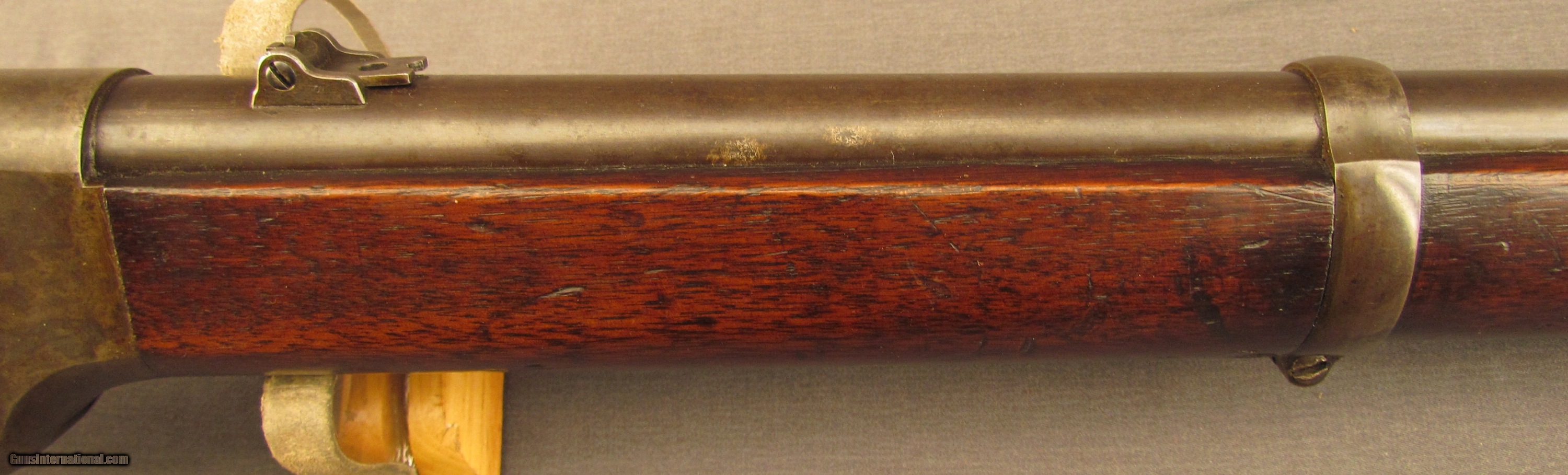 Description: Excellent condition U.S. Ball carbine built by Lamson & Co Windson Vermont. This example is one of 1002 carbines built 1864-65. Reference see Flayderman's guide 8th edition page 506. This carbine shows a bright very good plus bore. The barrel shows 90+ original blue. The action shows clear mrkings and muted color. The walnut stock shows original finish . This piece shows its' original cleaning rod. An overall excellent example for the civil war or U.S. Collector. SOLD Antique: Yes Manufacturer: Ball Model: Carbine Caliber Info: .50 Gauge Info: .50 |