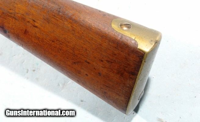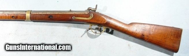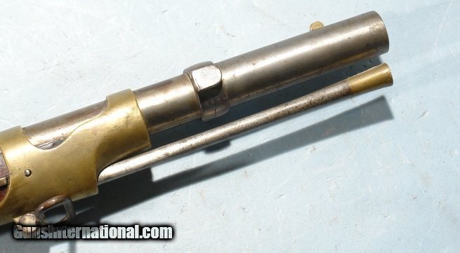 Description: FINE HARPERS FERRY U.S. MODEL 1841 MISSISSIPPI RIFLE DATED 1847. All original early and matching Mexican War dated Harpers Ferry Mississippi Rifle with no later alterations. Original .54 caliber rifled 33” barrel with Harpers Ferry proofs and with all correct U.S. Ordnance Inspector’s stamps. Original front and rear sights. Lock stamped “HARPERS/FERRY/1847” and “EAGLE/US”. Barrel tang dated “1847”. Original stock and brass patchbox and mounts. Faint cartouche outline visible on the side panel. Fine untouched original condition with crisp dark grey patina on metal and stock with light wear. Lock in perfect working order and excellent bore with sharp rifling. Very hard to find extra nice example. SOLD Antique: Yes |
