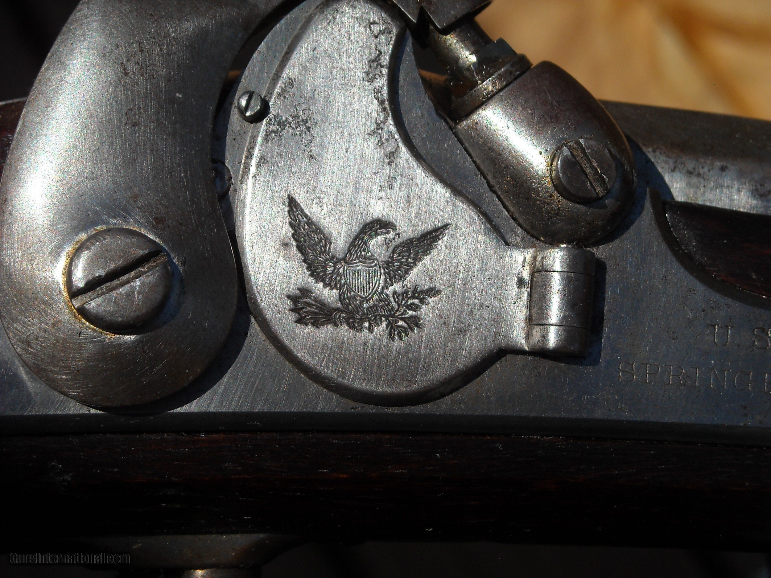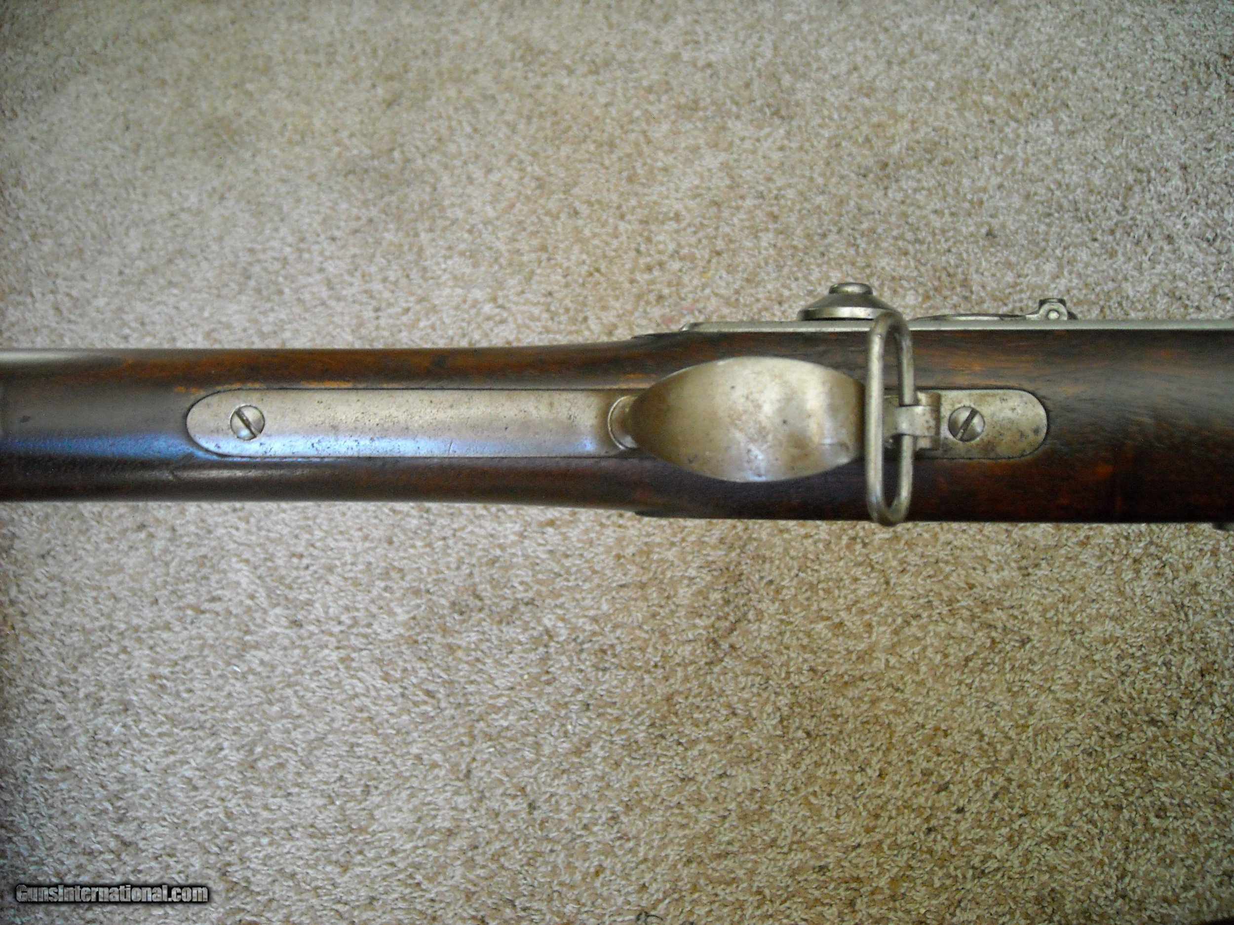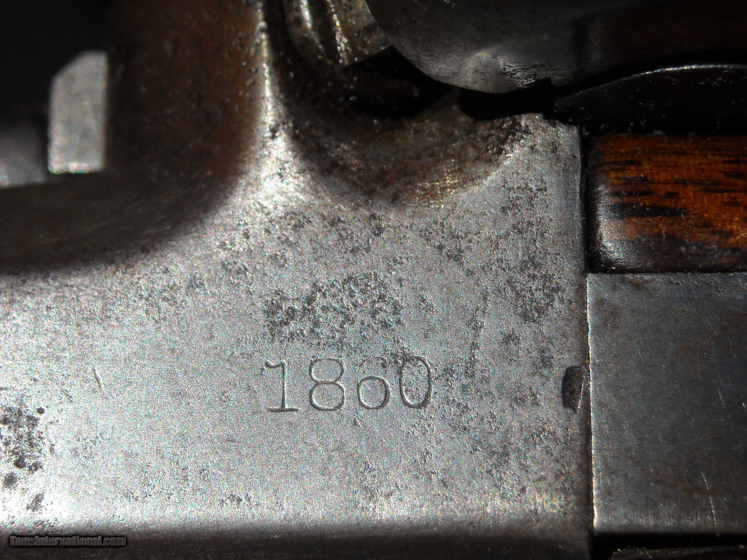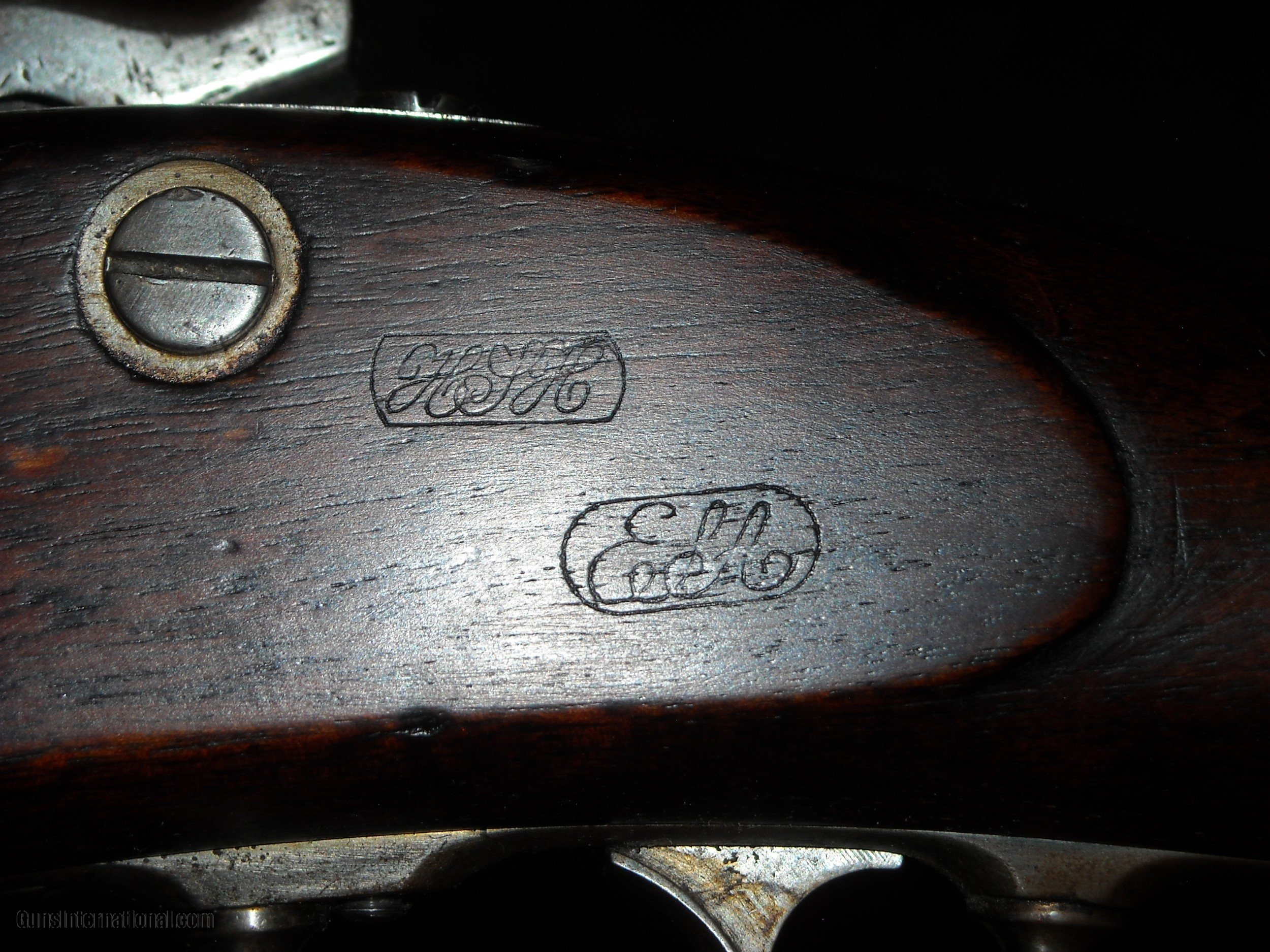 Description: Here is a fine clean example of the U.S. Springfield Model 1855 Springfield rifle-musket. The Model 1855 is fitted with the Maynard tape primer lock that automatically feeds from a roll of Maynard tape primers a single primer over the percussion nipple each time the hammer is cocked and released. The first model 1855 rifle muskets produced prior to 1859 were fitted with a long range adjustable single ladder rear sight, a brass nose cap, and had no patch box in the stock. In 1859 the gun was modified by adding a short base two-leaf rear sight, an iron nosecap, and an iron patch box in the stock to hold extra rolls of the Maynard tape primers. The guns with the iron patch box are fairly scarce and highly desirable. This example is in fine untoched condition. It has an excellent tight clean lock that is beautifully marked with the federal spread-wing eagle on the primer door, 'U.S. Springfield' on the front tang, and the date '1859' on the tail of the plate. All of the Maynard tape primer parts are present and fully functional, the action is crisp and tight. The iron parts have not been cleand or polished and wear an attractive natural light aged brown patina. There is no pitting to speak of save for some scattered very small black specks visible under the patina. The barrel proofs are excellent and the date of manufacture, '1860' is clearly stamped on the top flat of the barrel breech. The 1859 lock and 1860 barrel dates clearly indicate that the gun was assembled early in 1860 using 1859 dated locks still in inventory left over from the end of the 1859 production year. Lock and barrel production dates that are only one year apart is often encountered and perfectly acceptable. The rifled .58 caliber bore is very fine, with clean sharp rifling all the way down the barrel with no noticable pitting evident. The nipple and bolster clean out screw can be easily removed and the threads on these parts and in the barrel are perfect and not worn or stripped. I have not removed the breech plug but it is aligned correctly with the alignment mark on the bottom of the barrel and there are no vice marks on the barrel. All screws are original and in fine condition and both original sling swivels, original rear sight, and the original ramrod are present. The ramrod has some black tarnish and pitting on it but is straight and not warped. The walnut stock is in fine condition with a nice medium dark oiled finish and shows no signs of having been sanded as all the matal parts fit correctly. There are no cracks or missing chips in the stock and it shows only the slightest smooth handling wear with strong well defined edges. The stock has two very crisp inspection stamps on the left flat with 'ESA' for Springfield Master Armorer Erskine S. Allin and 'HSH' for sub-inspector Henry S, Hill. The Model 1855 rifle-muskets saw hard use in the early years of the Civil War before the Model 1861 rifle-muskets were issued. Consequently, these guns are ususally found in well used condition. Overall, this example is in much better condition than what is usually found and has nothing to apologize for. The buyer will pay the actual shipping cost and has the usual three day inspection period. SOLD Antique: Yes |