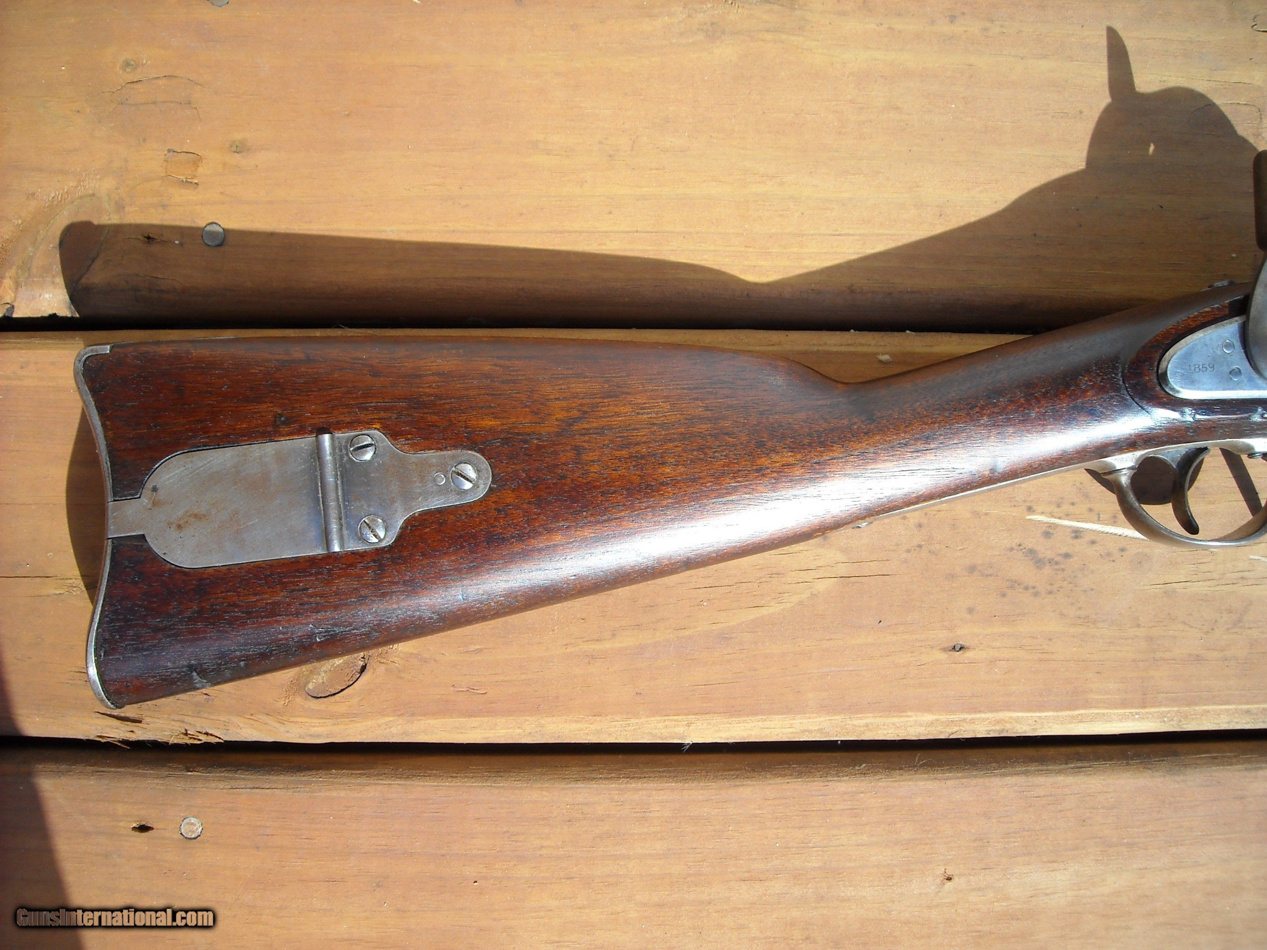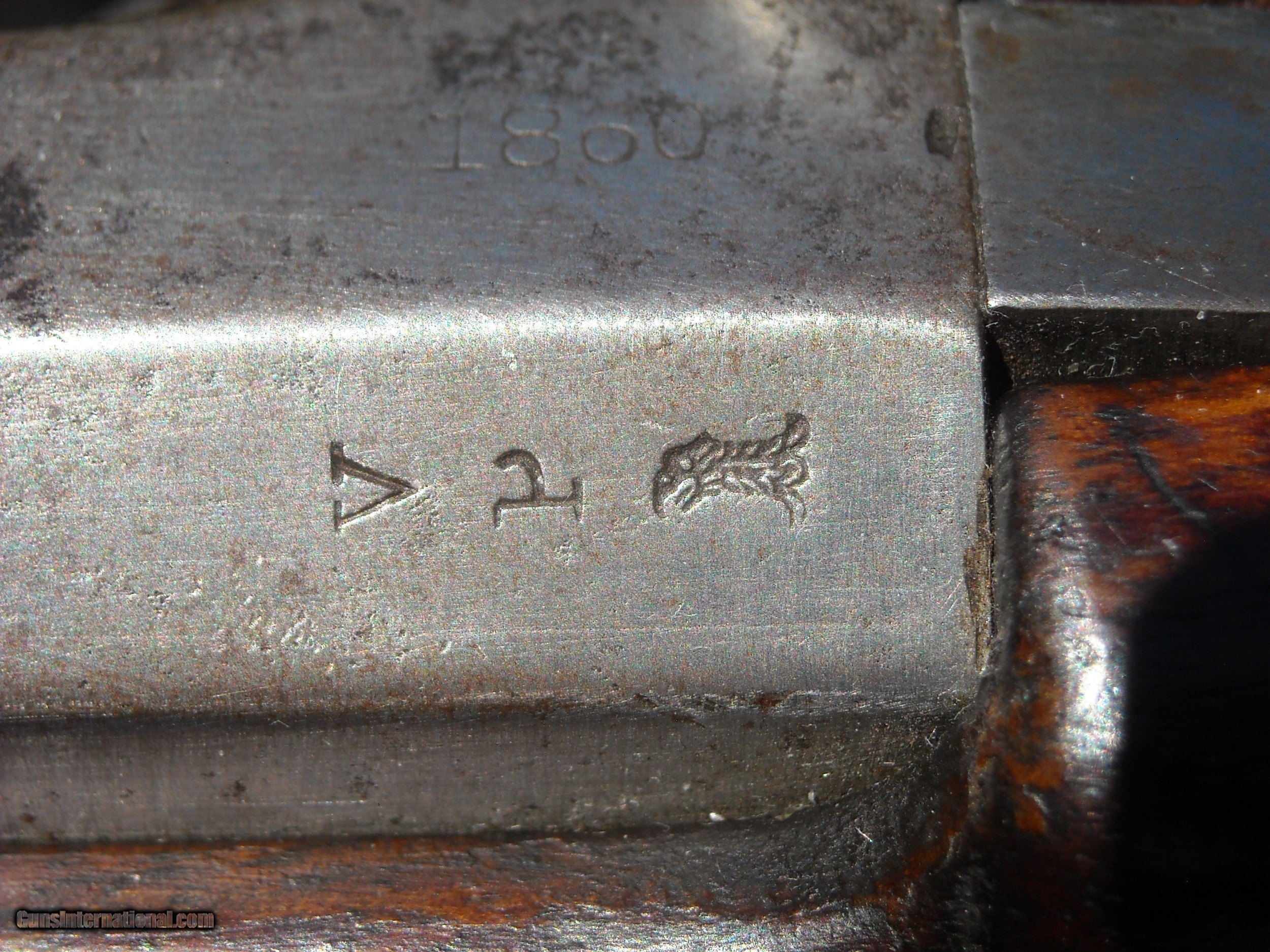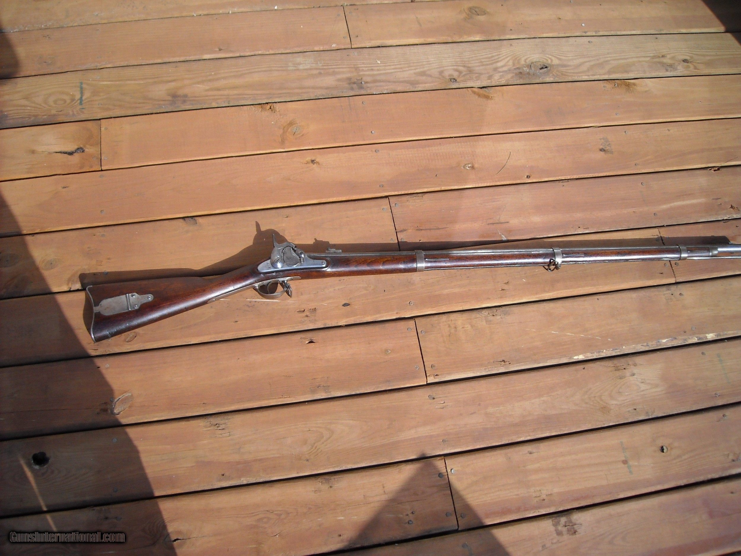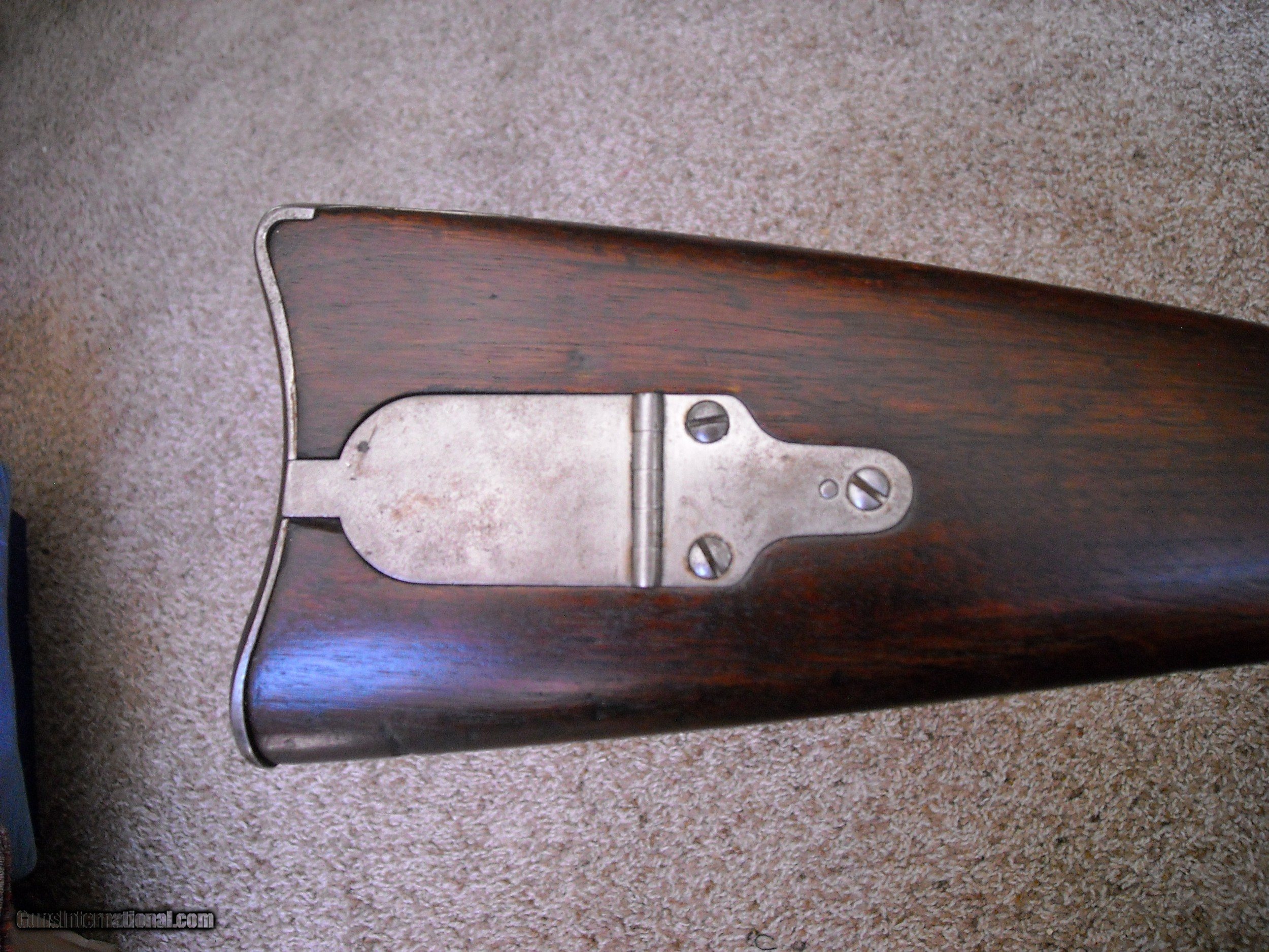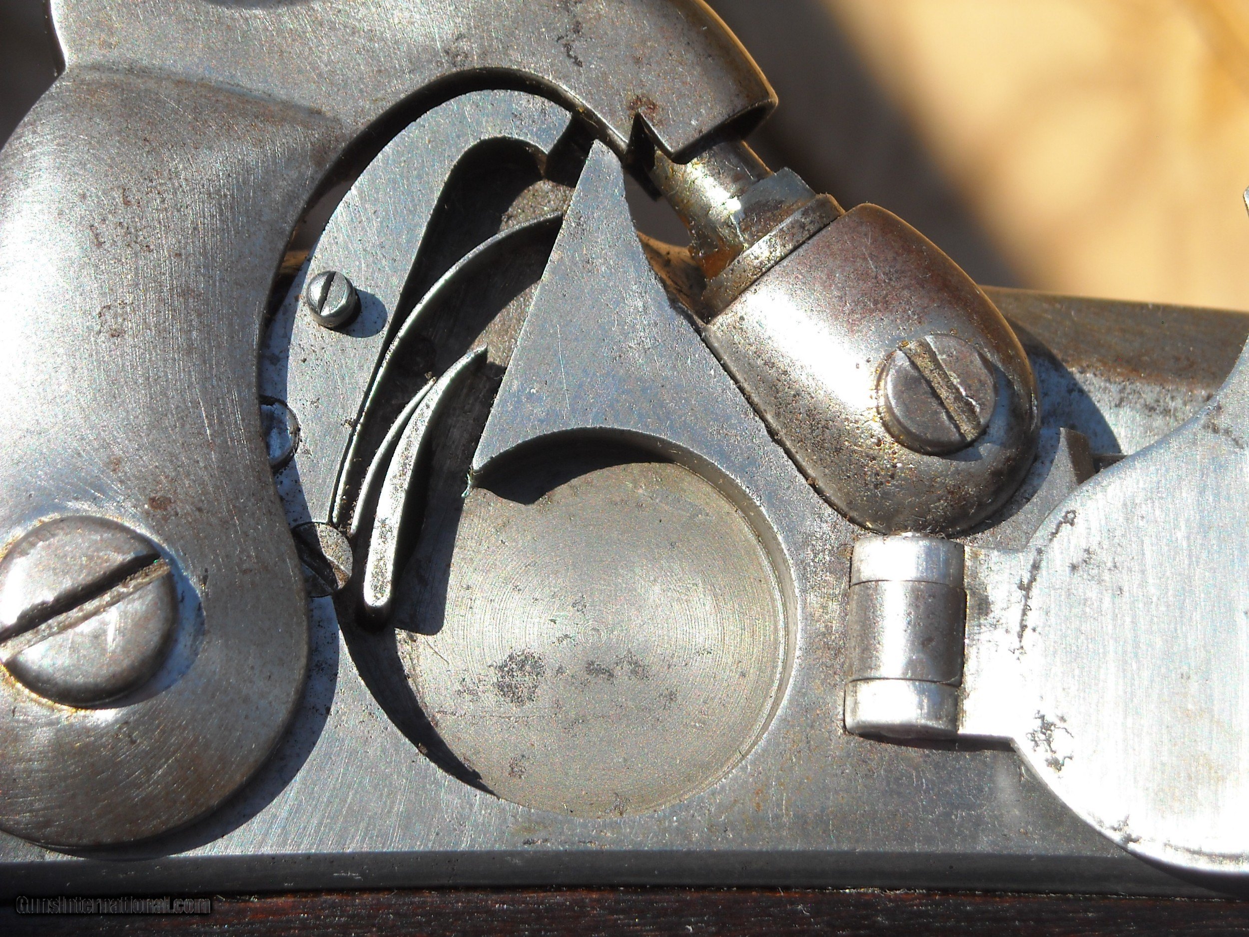 Description: Here is a fine clean example of the U.S. Springfield Model 1855 Springfield rifle-musket. The Model 1855 is fitted with the Maynard tape primer lock that automatically feeds from a roll of Maynard tape primers a single primer over the percussion nipple each time the hammer is cocked and released. The first model 1855 rifle muskets produced prior to 1859 were fitted with a long range adjustable single ladder rear sight, a brass nose cap, and had no patch box in the stock. In 1859 the gun was modified by adding a short base two-leaf rear sight, an iron nosecap, and an iron patch box in the stock to hold extra rolls of the Maynard tape primers. The guns with the iron patch box are fairly scarce and highly desirable. This example is in fine untoched condition. It has an excellent tight clean lock that is beautifully marked with the federal spread-wing eagle on the primer door, 'U.S. Springfield' on the front tang, and the date '1859' on the tail of the plate. All of the Maynard tape primer parts are present and fully functional, the action is crisp and tight. The iron parts have not been cleand or polished and wear an attractive natural light aged brown patina. There is no pitting to speak of save for some scattered very small black specks visible under the patina. The barrel proofs are excellent and the date of manufacture, '1860' is clearly stamped on the top flat of the barrel breech. The 1859 lock and 1860 barrel dates clearly indicate that the gun was assembled early in 1860 using 1859 dated locks still in inventory left over from the end of the 1859 production year. Lock and barrel production dates that are only one year apart is often encountered and perfectly acceptable. The rifled .58 caliber bore is very fine, with clean sharp rifling all the way down the barrel with no noticable pitting evident. The nipple and bolster clean out screw can be easily removed and the threads on these parts and in the barrel are perfect and not worn or stripped. I have not removed the breech plug but it is aligned correctly with the alignment mark on the bottom of the barrel and there are no vice marks on the barrel. All screws are original and in fine condition and both original sling swivels, original rear sight, and the original ramrod are present. The ramrod has some black tarnish and pitting on it but is straight and not warped. The walnut stock is in fine condition with a nice medium dark oiled finish and shows no signs of having been sanded as all the matal parts fit correctly. There are no cracks or missing chips in the stock and it shows only the slightest smooth handling wear with strong well defined edges. The stock has two very crisp inspection stamps on the left flat with 'ESA' for Springfield Master Armorer Erskine S. Allin and 'HSH' for sub-inspector Henry S, Hill. The Model 1855 rifle-muskets saw hard use in the early years of the Civil War before the Model 1861 rifle-muskets were issued. Consequently, these guns are ususally found in well used condition. Overall, this example is in much better condition than what is usually found and has nothing to apologize for. The buyer will pay the actual shipping cost and has the usual three day inspection period. SOLD Antique: Yes |