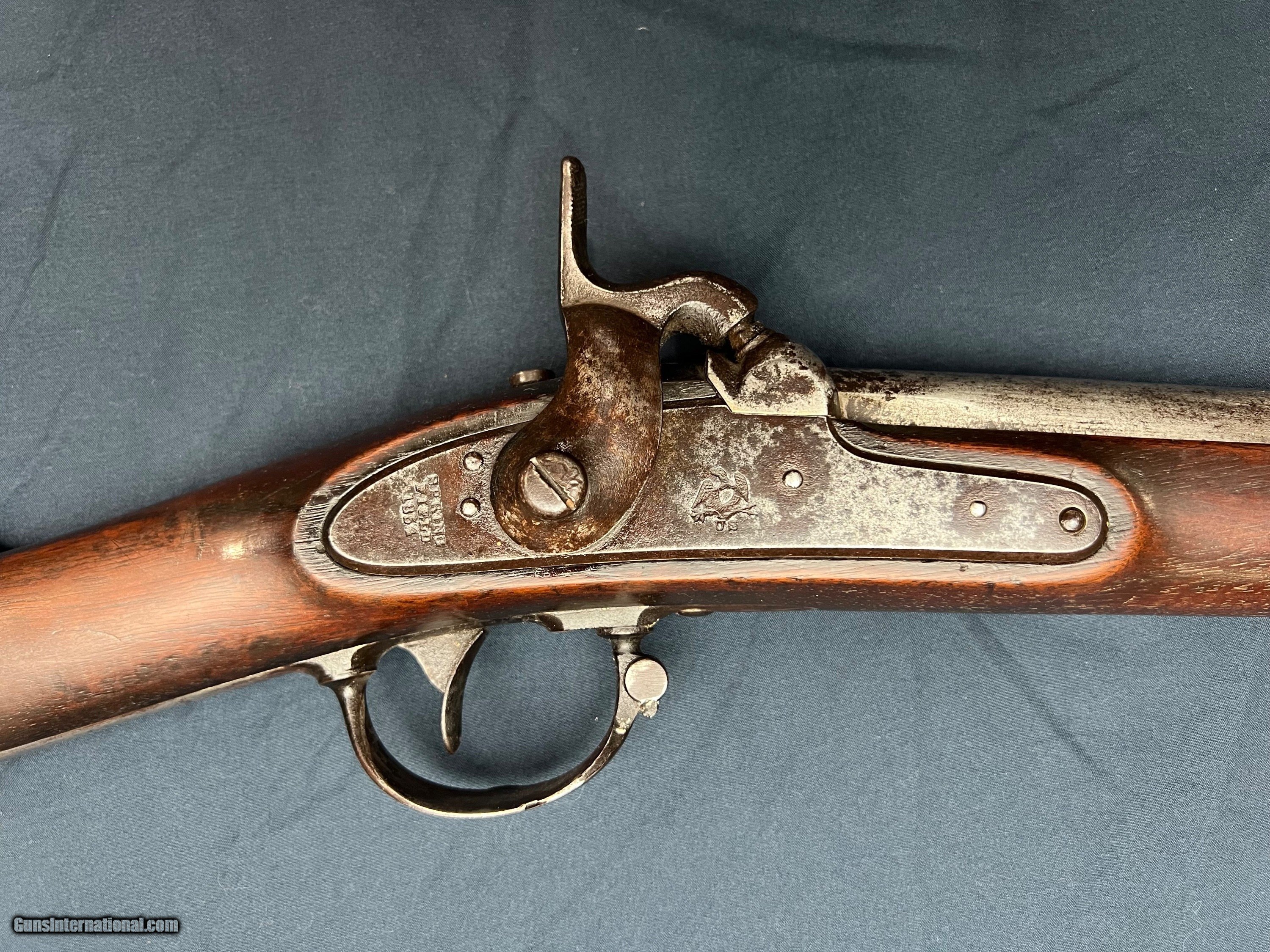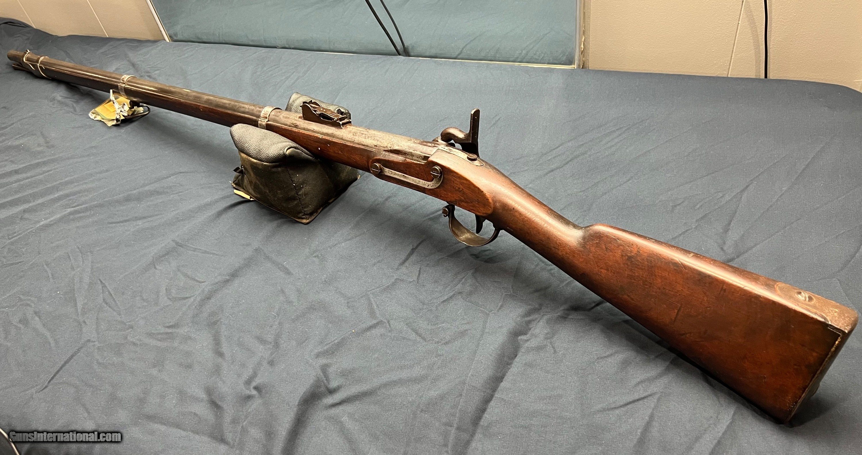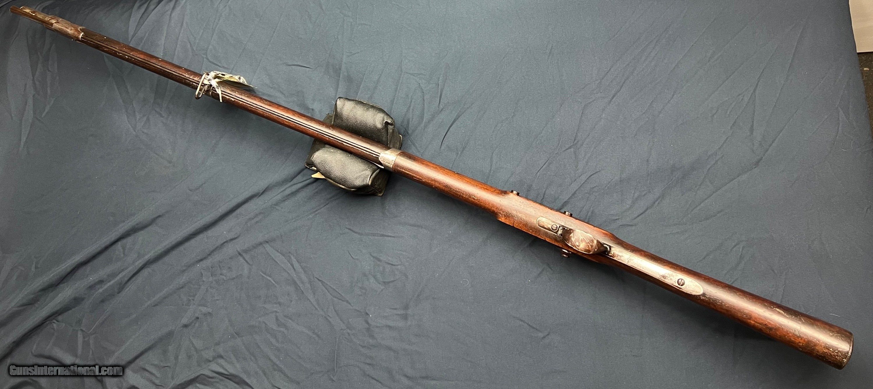 Description: Price includes shipping in the 48 states. Offered here is a hard to find, fine example of a proper rifled and sighted Civil War era U.S. Springfield Model 1842 percussion musket, that came right of an estate of an 80 year collection. Less than 10,000 of these .69 caliber muskets were converted between c. 1856-1859 with rifled bores and fitted with the long range sights by the Springfield and Harpers Ferry Armories. The usage rate of this variant was extremely high during the Civil War. Hence, these rifled and sighted 1842s are hard to find today, and the limited surviving examples are typically in rough shape, excluding this very fresh example. The edges and markings in this musket remain sharp and defined overall. It has just the right signs of some use that Civil War collectors look for. The lock has an “1854” date and barrel tang has an “1855” date, in which it was certainly originally made this way. The breech of the barrel has the “V/P” proofs above the eagle head stamp, the lock has the federal eagle motif and Springfield manufacturer marking above its date, the left stock flat has a very nice bordered “JS” inspection cartouche stamp, and the buttplate is “US” marked. A socket bayonet accompanies the musket, and appears to have never left its side based on the unmistakable matching patina. As an antique, this can ship directly to your doorstep in most states! Antique: Yes Rifle Caliber: .69 Manufacturer: Springfield Model: 1842 Barrel Length: 42 inch Price: $2,500.00 Buy Now Pay with