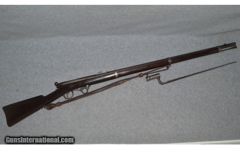 Description: This Greene Breech loading Rifle is in great condition with it’s under hammer design and unusual oval- shaped bore, was invented by U.S. Army Lt. COL. J. Durrell Greene. Approximately 1,500 rifles were produced for sale in the United States and 3,000 for the Russian Government. 900 were purchased by the U.S Army these were the only black powder bolt action rifles to see service in the American civil war. Over all this rifle is very good condition with some minor field mark on the stock and barrel. This rifle is very rich with history and would look great in a collections. The rifle comes with a Bayonet and sling. SOLD Antique: Yes Manufacturer: Built in 1859 - 1860. Caliber Info: .54 Cal. Chambers: Bolt- action rifle. Metal Condition: Very good. Wood Condition: Very good. Barrels: 36 inch round barrel. Triggers: Single trigger. Stock: Dark smooth walnut stock with sling. Stock Dimensions: 13 3/4 inch LOP. Fore End: Matching dark walnut fore end with sling. Butt Pad: Metal butt plate. Weight: 10 Lbs. Sights: Original iron sights. Extras: Comes with a bayonet. Item Location: Sun Prairie, WI |