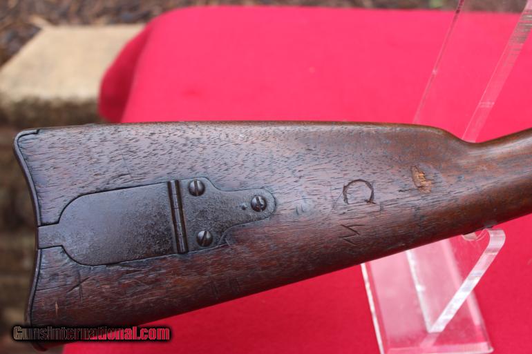 Description: For sale is a really nice Model 1855 Harpers Ferry rifle. The barrel is the correct length at 33" and has an excellent bore. The wood has a nice original rub to it and has never been sanded or cleaned. It is full length and is nor cut under the rear band like so many are. There are several sets of initials carved in various places and were probably done by a bored Confederate while awaiting his next target to pop up. All parts are correct to include the original rod. All the tape primer parts are in the lock and operating. All that is needed for a great display is the correct saber bayonet and scabbard. This nice rifle has a lot of history behind it and has a great feel when held to sight. Priced at $ 4395.00 for a quick sale. SOLD Curio/Relic: Yes Antique: Yes |