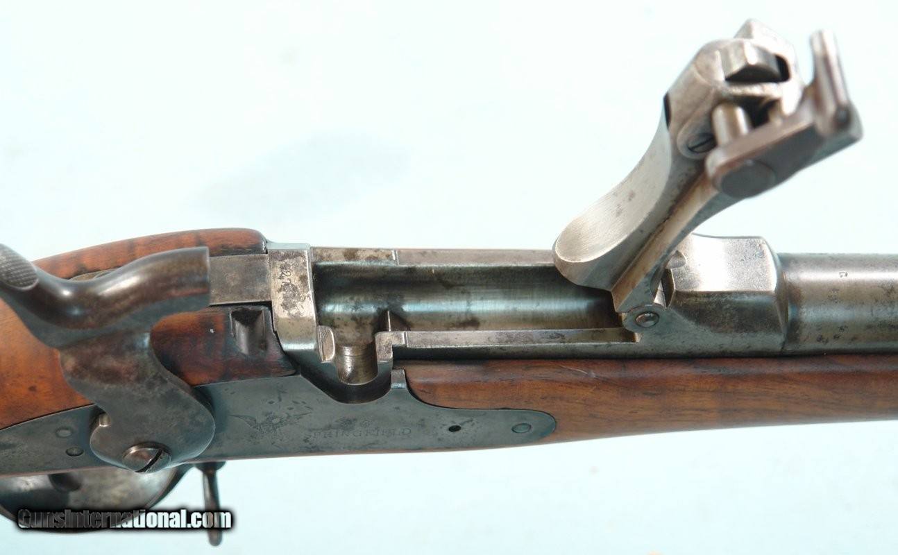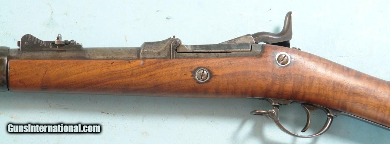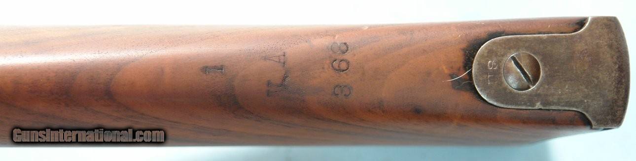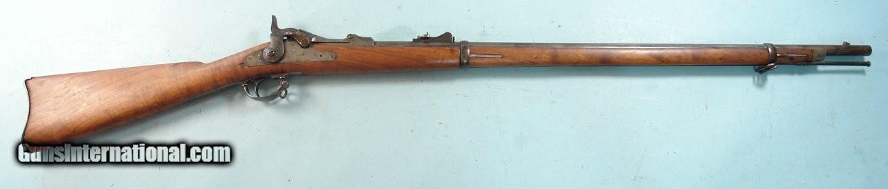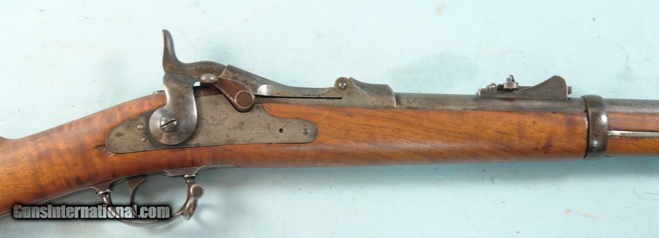 Description: INDIAN WARS SPRINGFIELD U.S. MODEL 1873 TRAPDOOR .45-70 CAL. RIFLE. 32 ½” barrel. Breech block stamped “U.S./MODEL/1873” and serial numbered in the 92,xxx range. Lock plate stamped “EAGLE/U.S./SPRINGFIELD”. Model 1879 stock with Virginia Militia “I/V A/396” stamps on comb of stock. Very good overall with finely grained walnut stock having a good Ordnance Inspector’s cartouche and metal a medium grey original patina. Perfect working order and excellent bore. SOLD Antique: Yes Rifle Caliber: .45-70 Government |