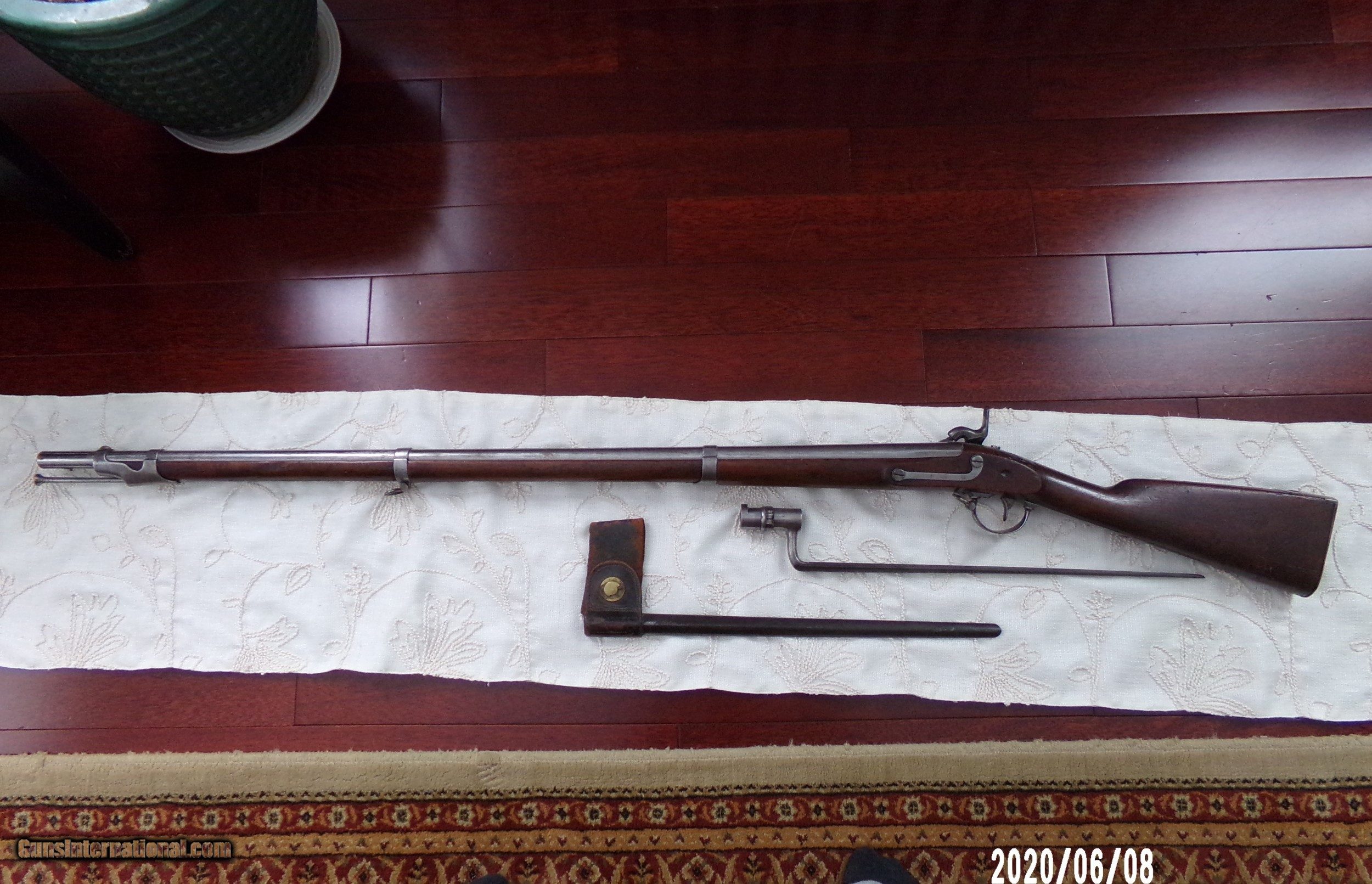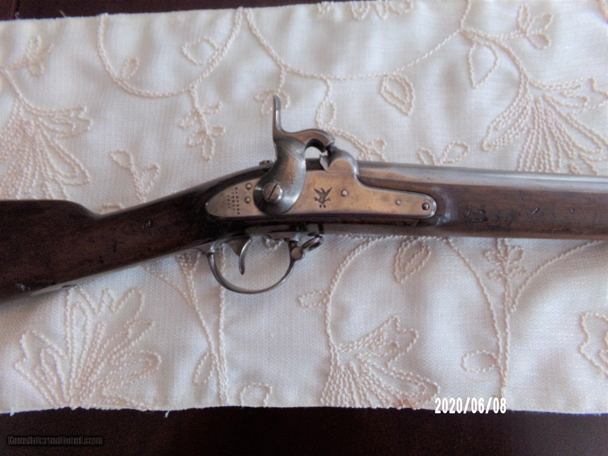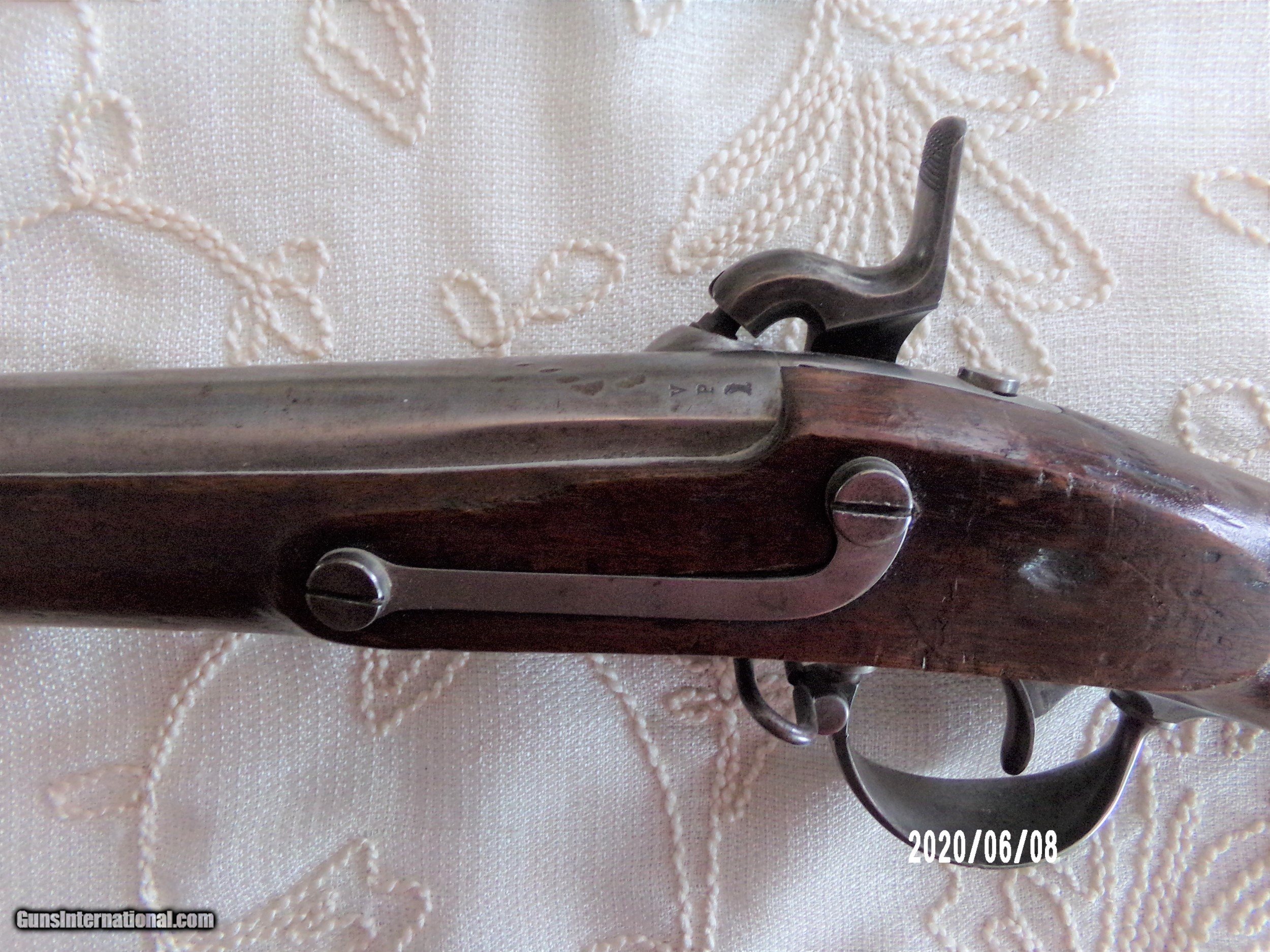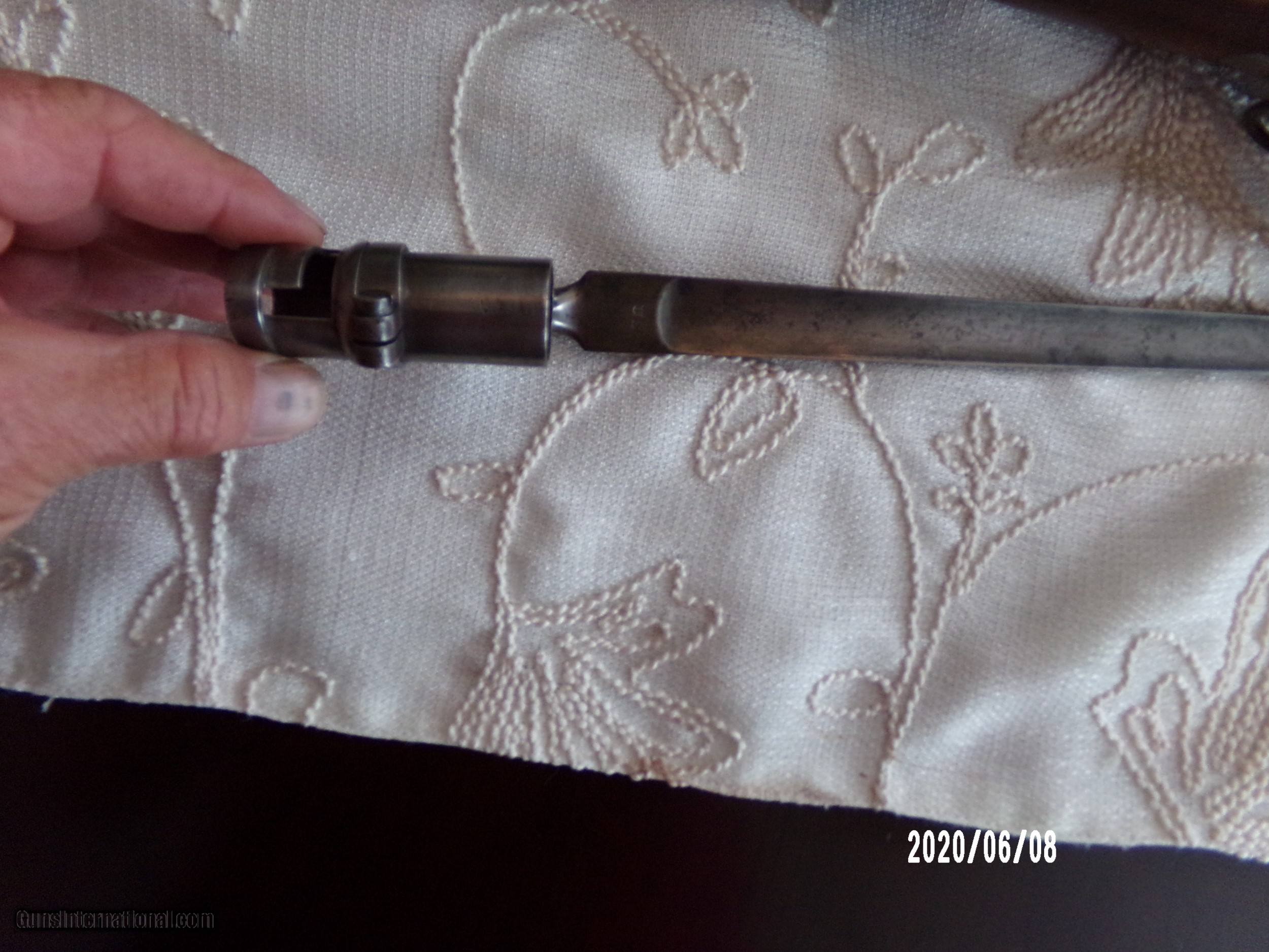 Description: Harpers Ferry 69Cal. musket in over all very good plus Cond. Stock is sound and solid with dings and bruses and original finish and two light cartouches on left flat. All steel parts are smooth with good finish and no pitting. Strong lock plate markings with 1851 date. Strong VP eagle head on breech and 1853 date on tang Smooth bore is very good. Butt plate is very goog with sharp US. Bayonet fits well and same Cond. as gun.Scabbard is Indian wars model . SOLD Antique: Yes |