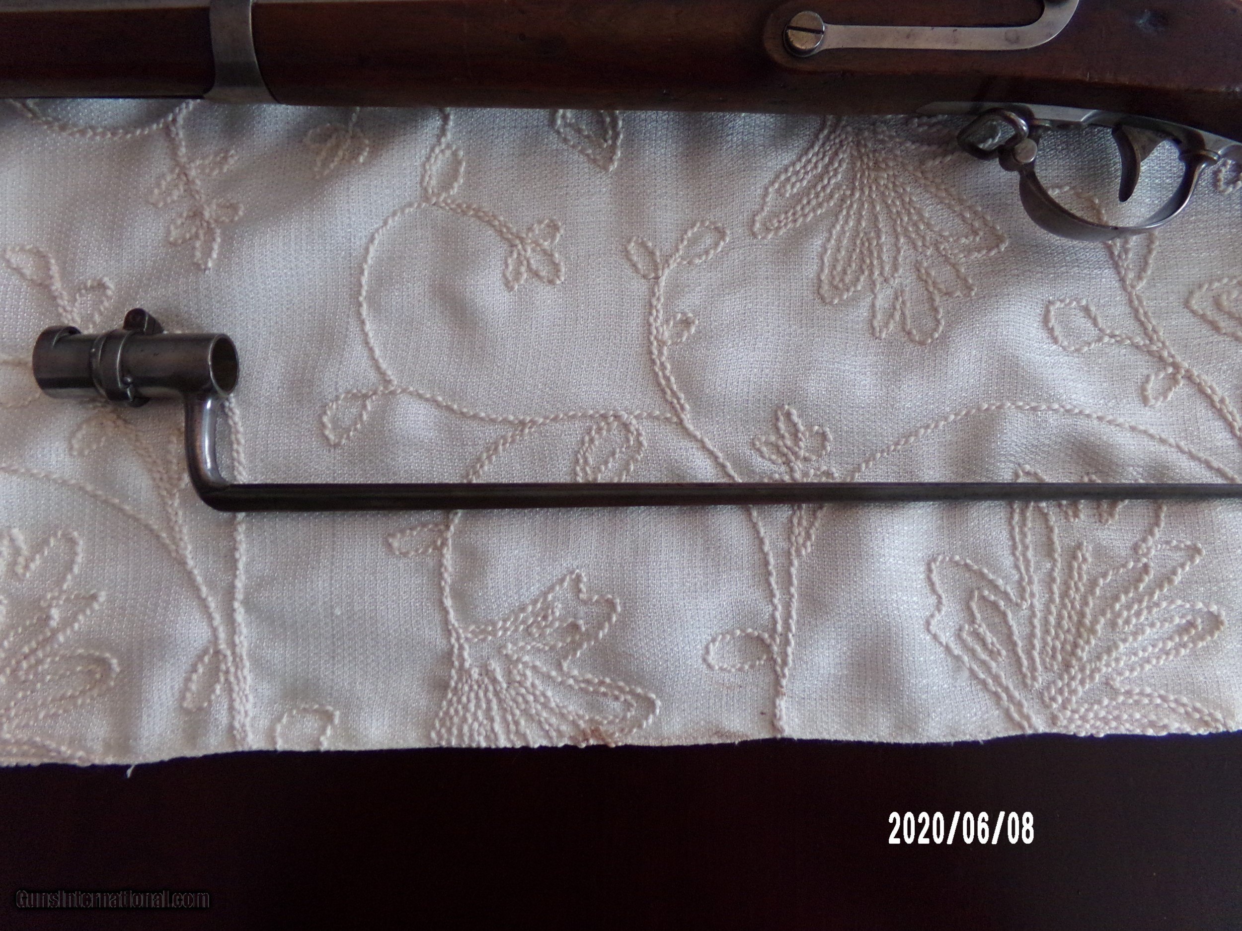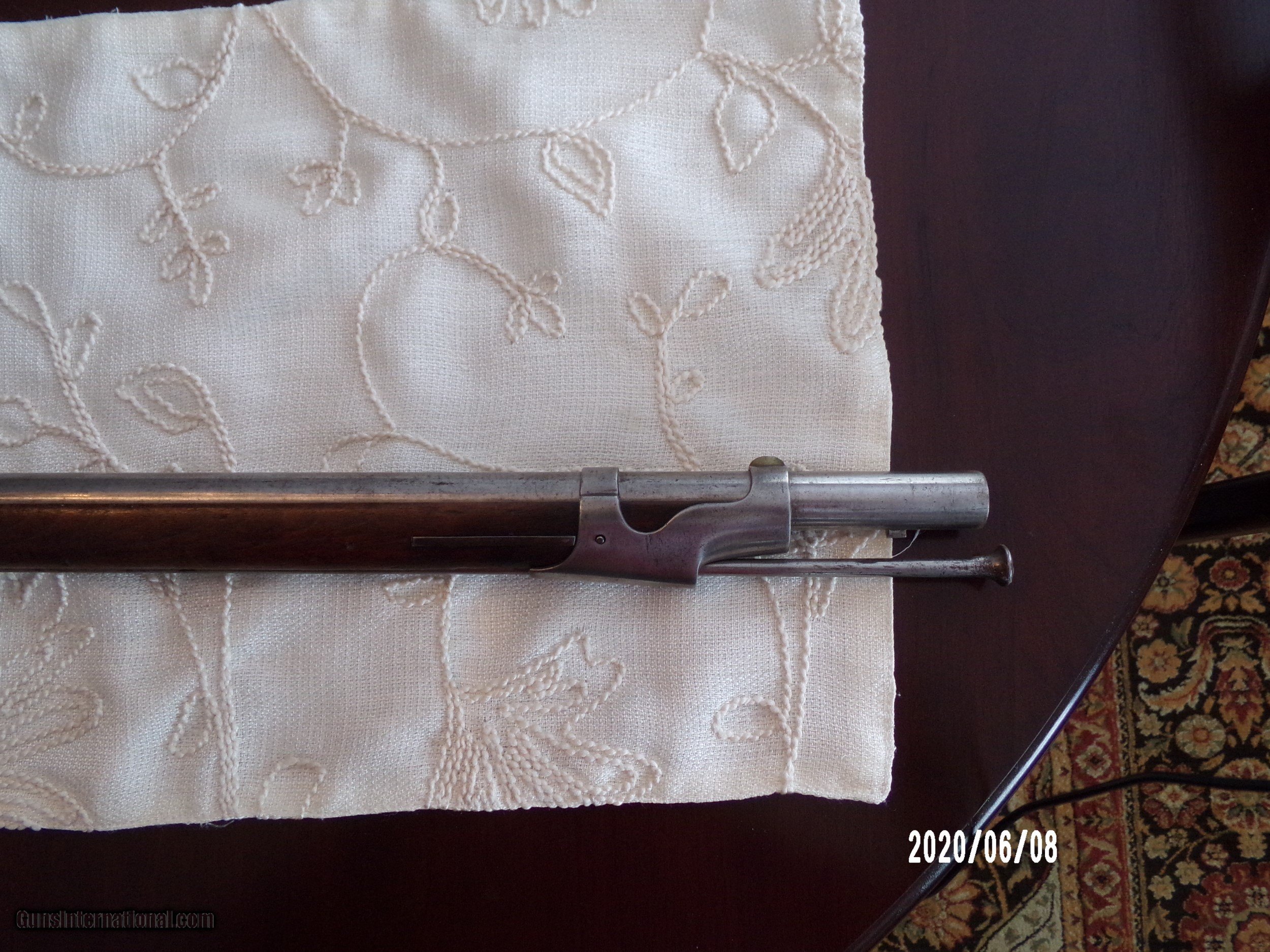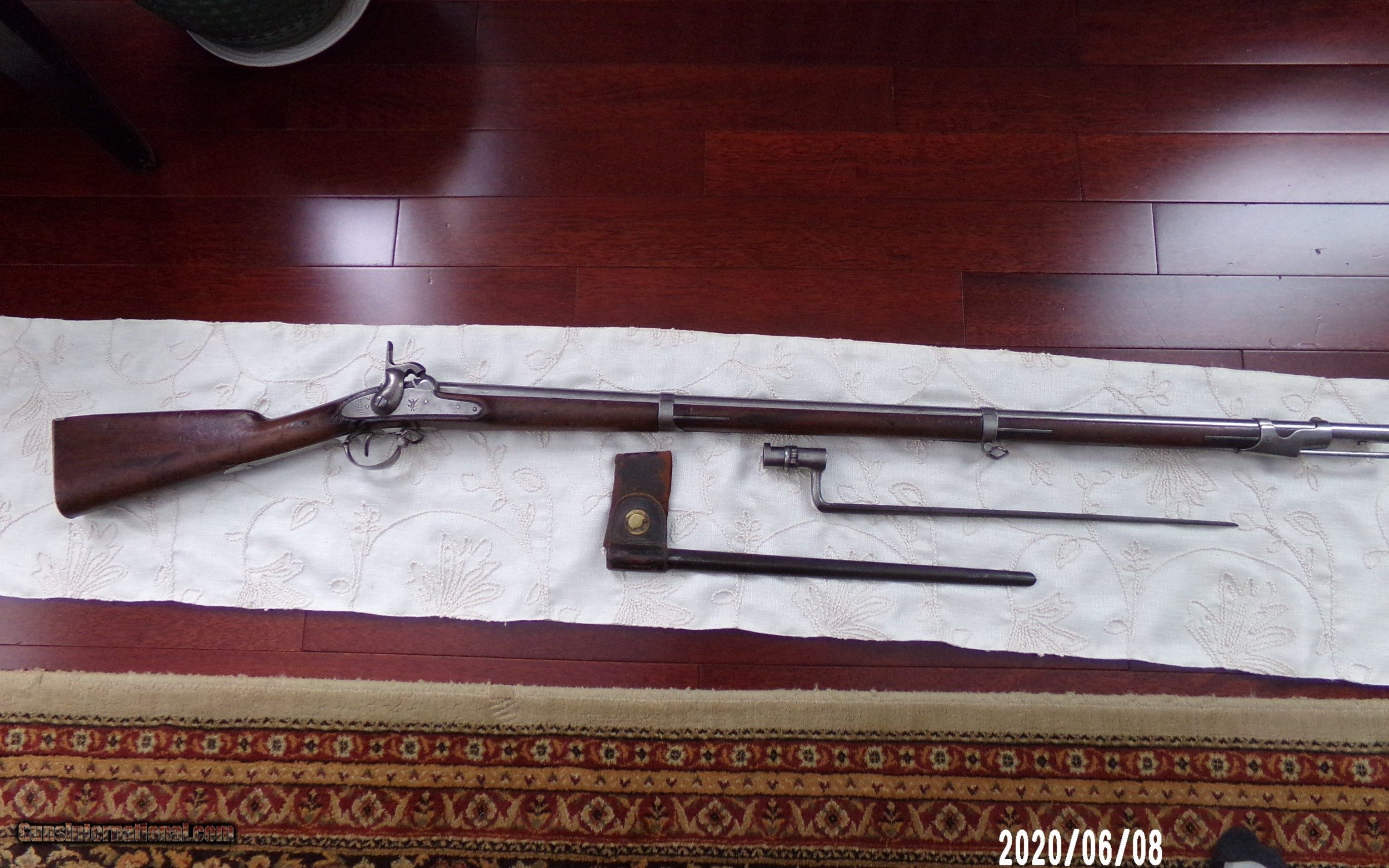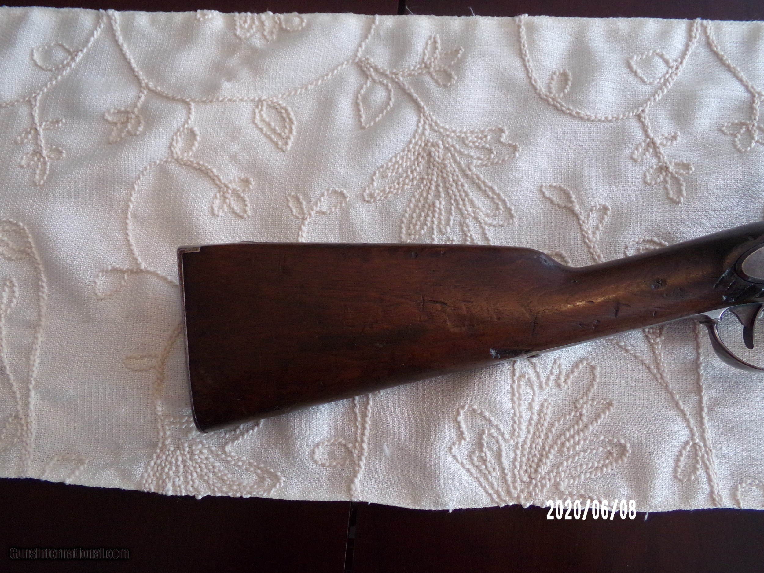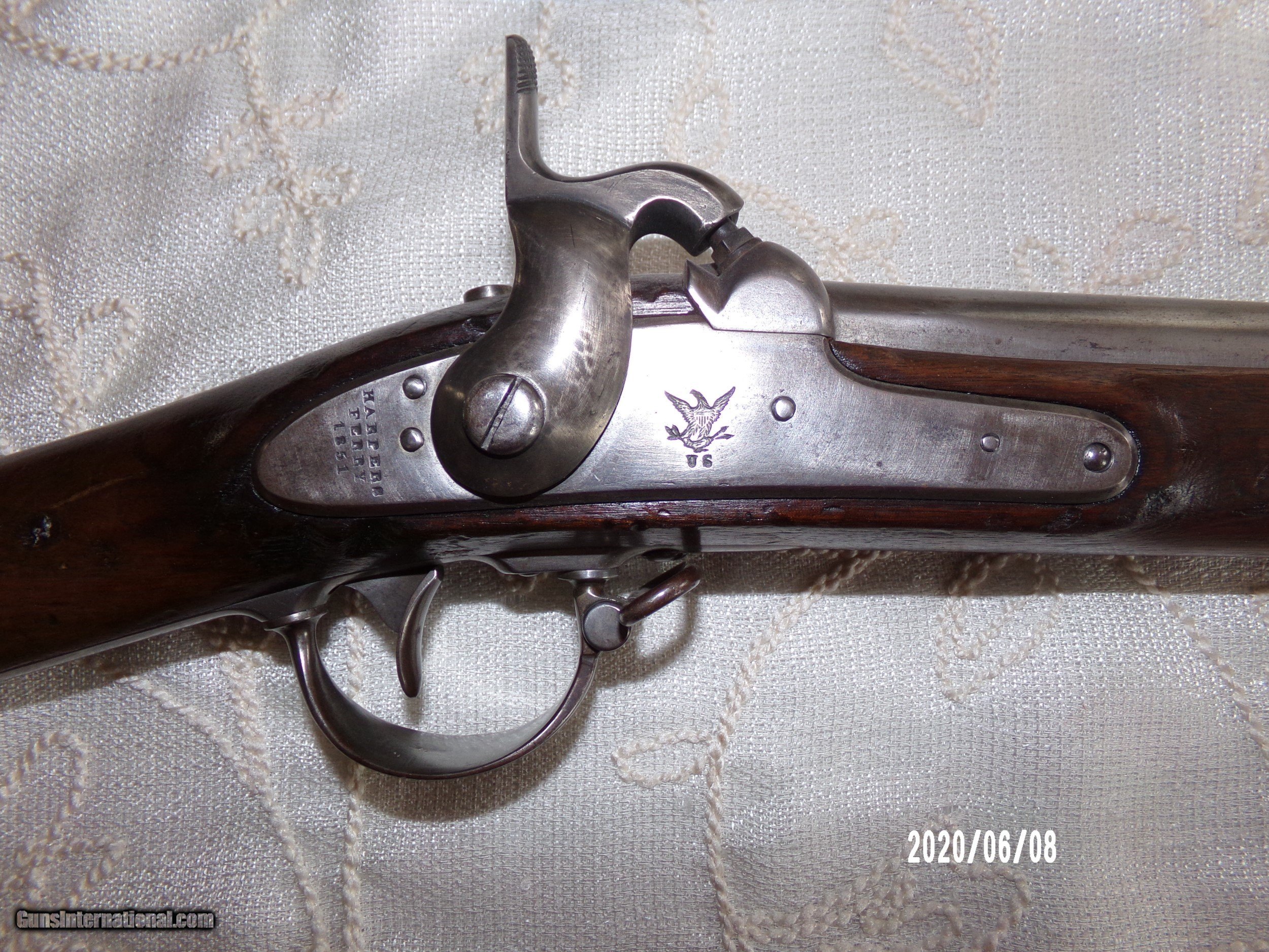 Description: Harpers Ferry 69Cal. musket in over all very good plus Cond. Stock is sound and solid with dings and bruses and original finish and two light cartouches on left flat. All steel parts are smooth with good finish and no pitting. Strong lock plate markings with 1851 date. Strong VP eagle head on breech and 1853 date on tang Smooth bore is very good. Butt plate is very goog with sharp US. Bayonet fits well and same Cond. as gun.Scabbard is Indian wars model . SOLD Antique: Yes |
