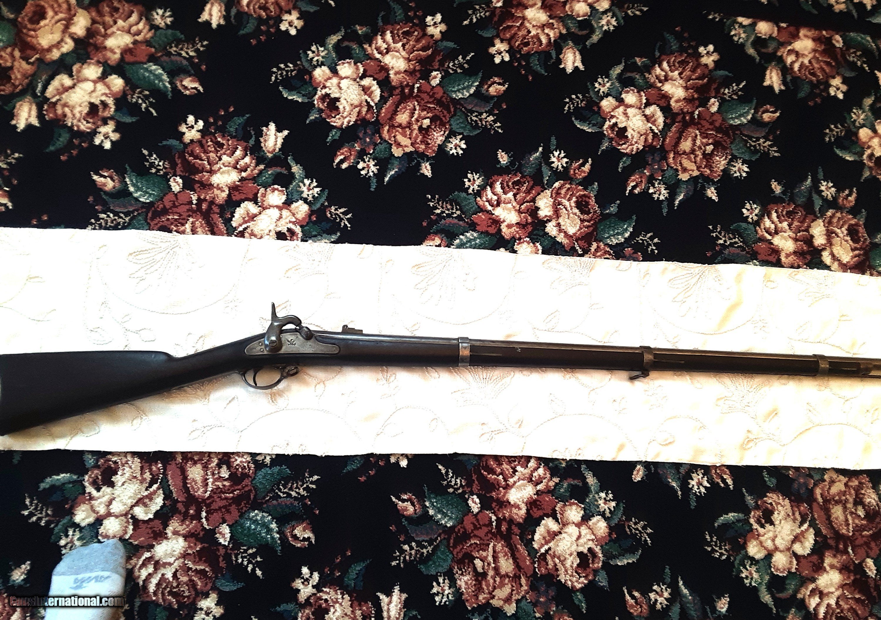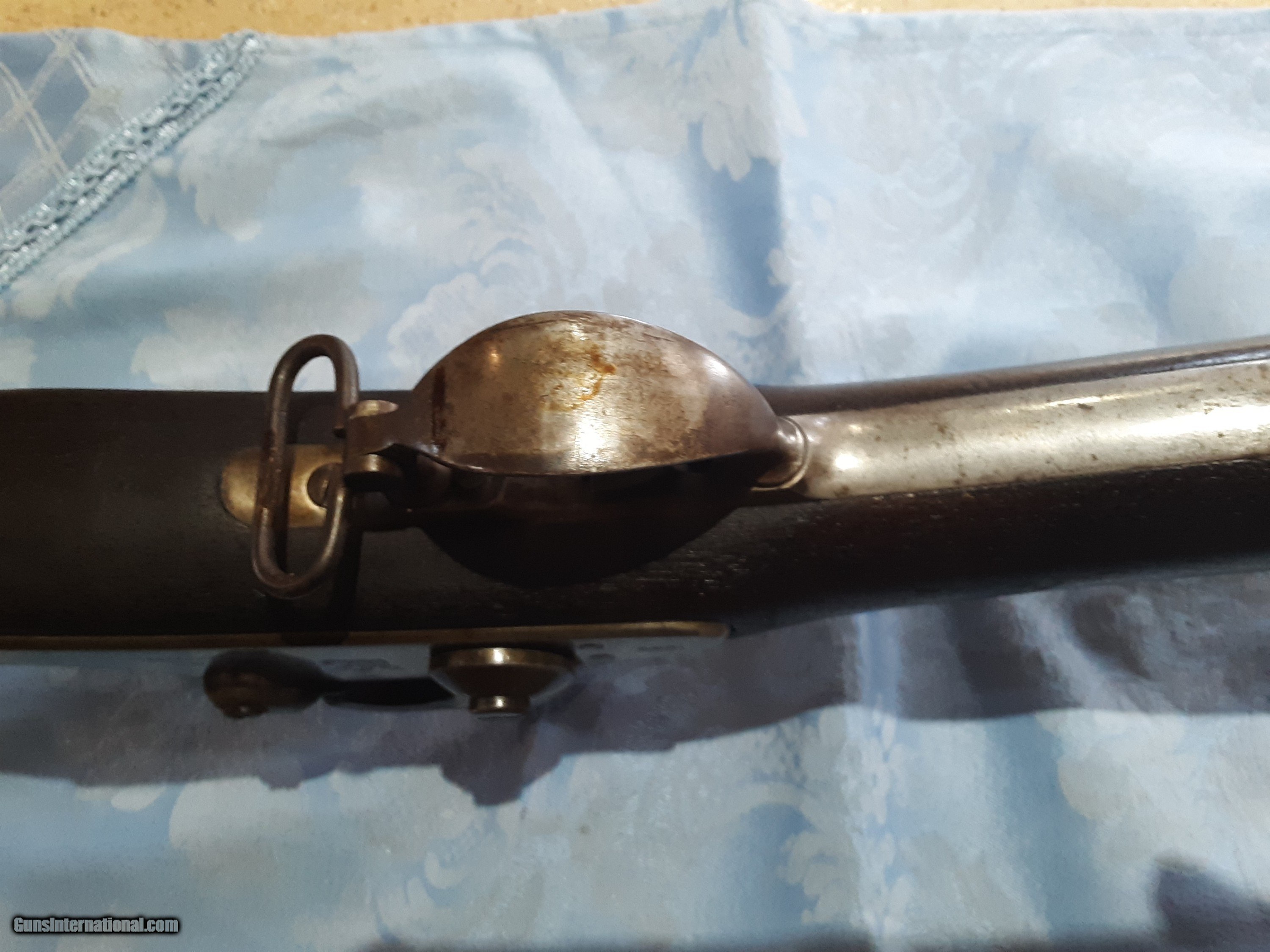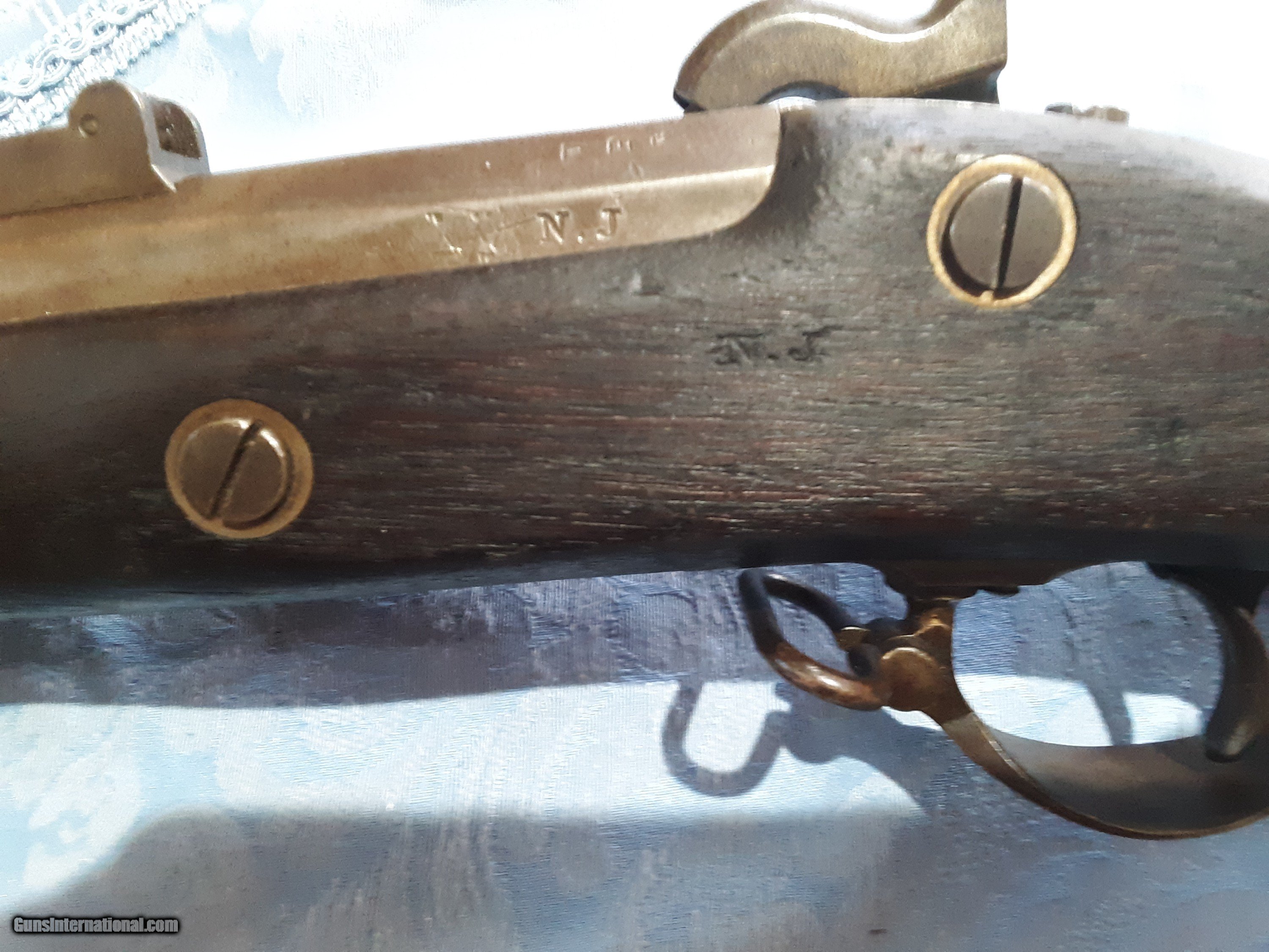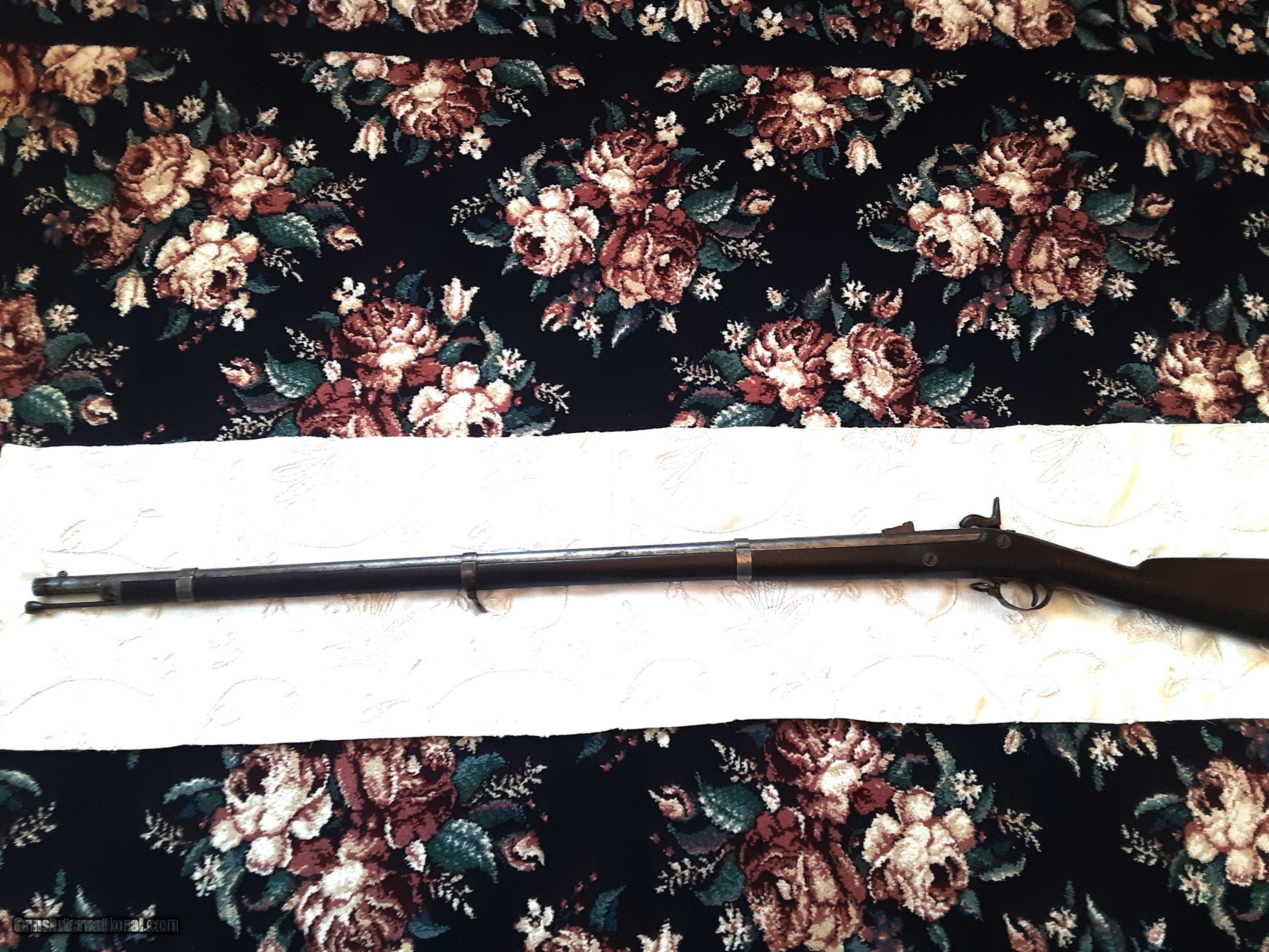 Description: On hold,Trenton contract model 1861 rifled musket in very good Cond. Came out of age old West Va. collection. This gun is not refinished and stock is solid with a rich deep tone and N.J. stamped. All steel parts are smooth with sharp markings and age stain patina. Rifled bore is very good. Barrel length is 39 and 3/4 inches and band springs are perfect. Holds half and fullcock with strong mainspring. Gun is 100% original and never sanded or steel wool used on it like so many. A good looking Civil War musket at a good price! SOLD Antique: Yes |