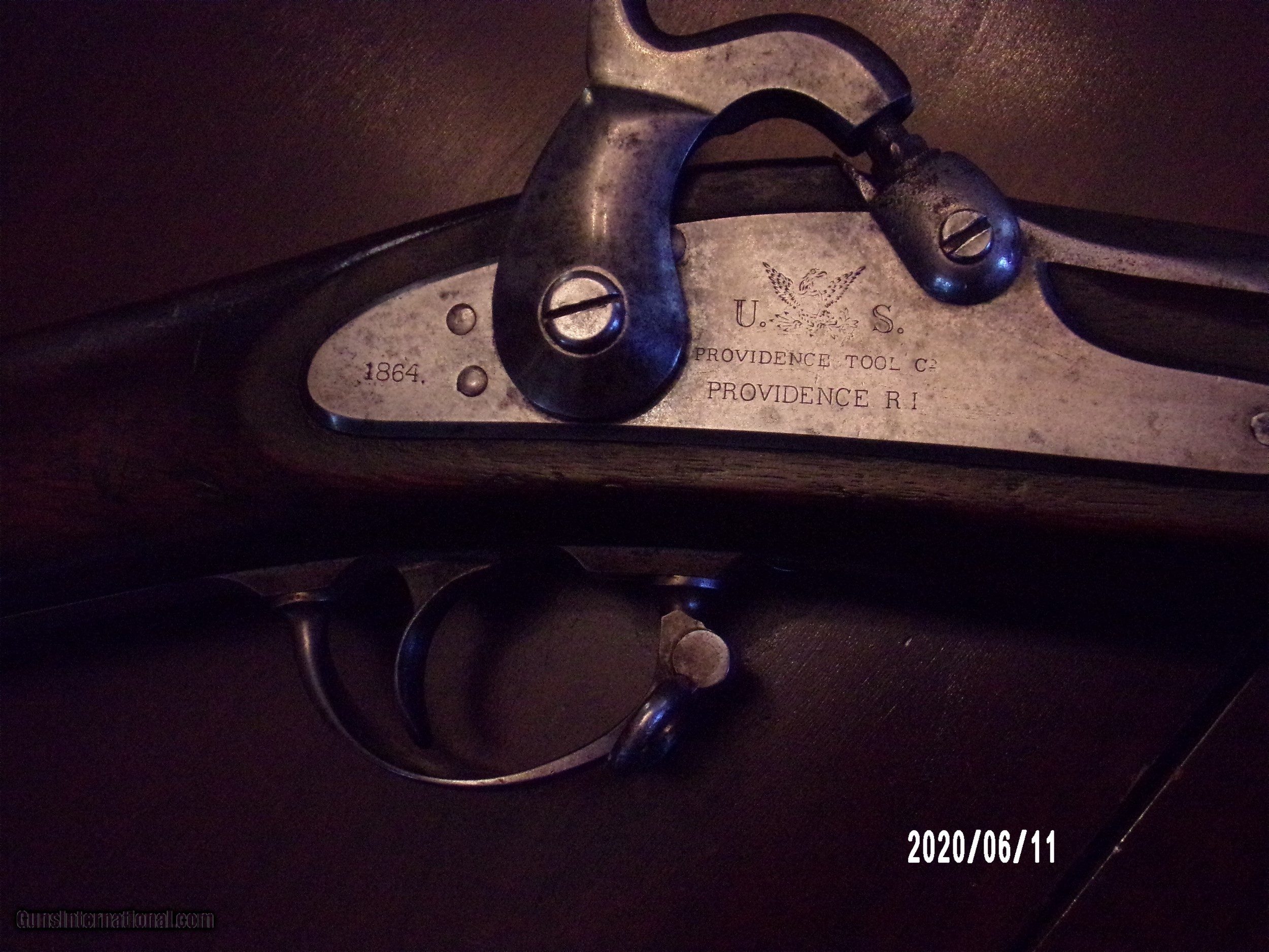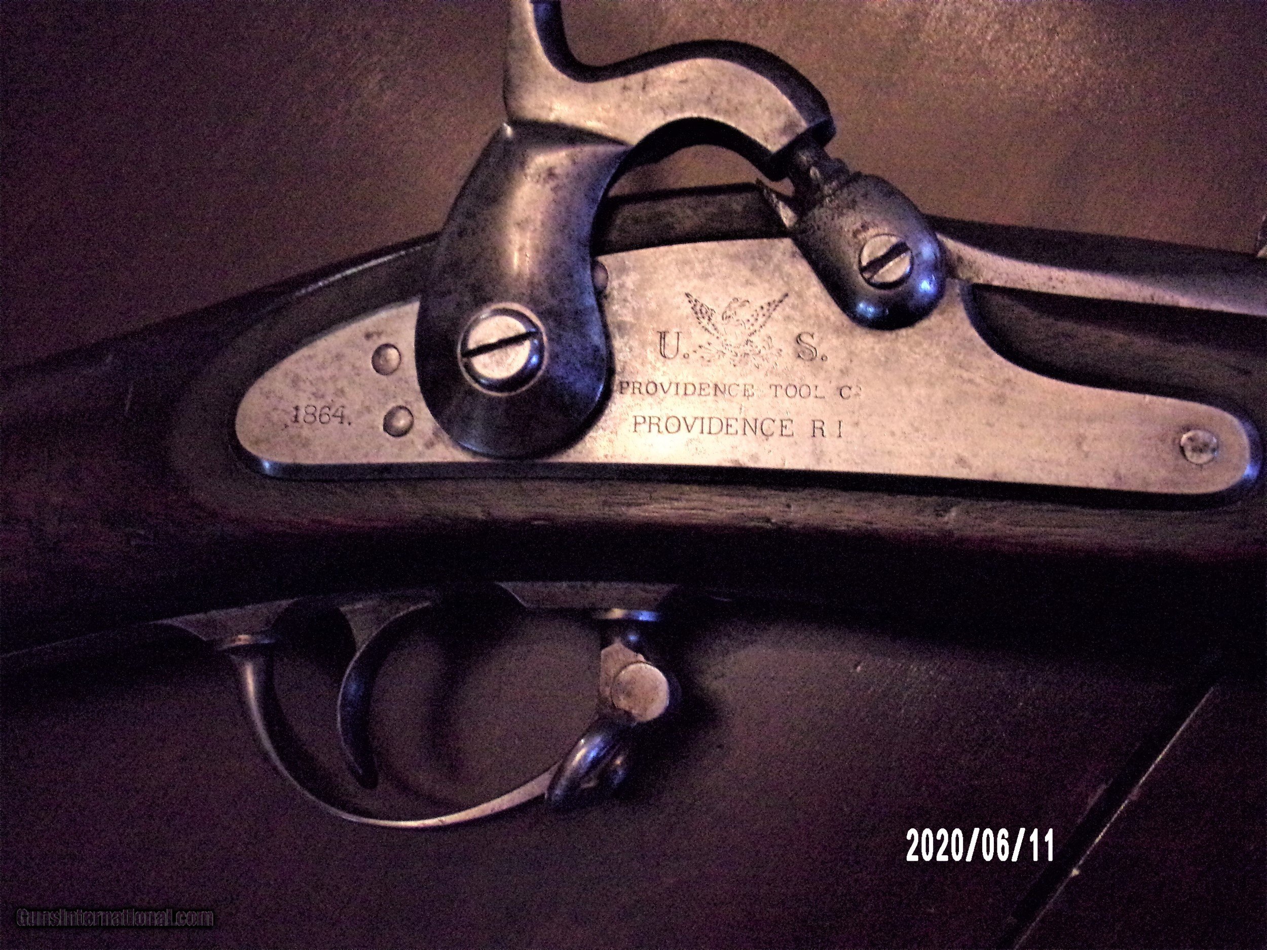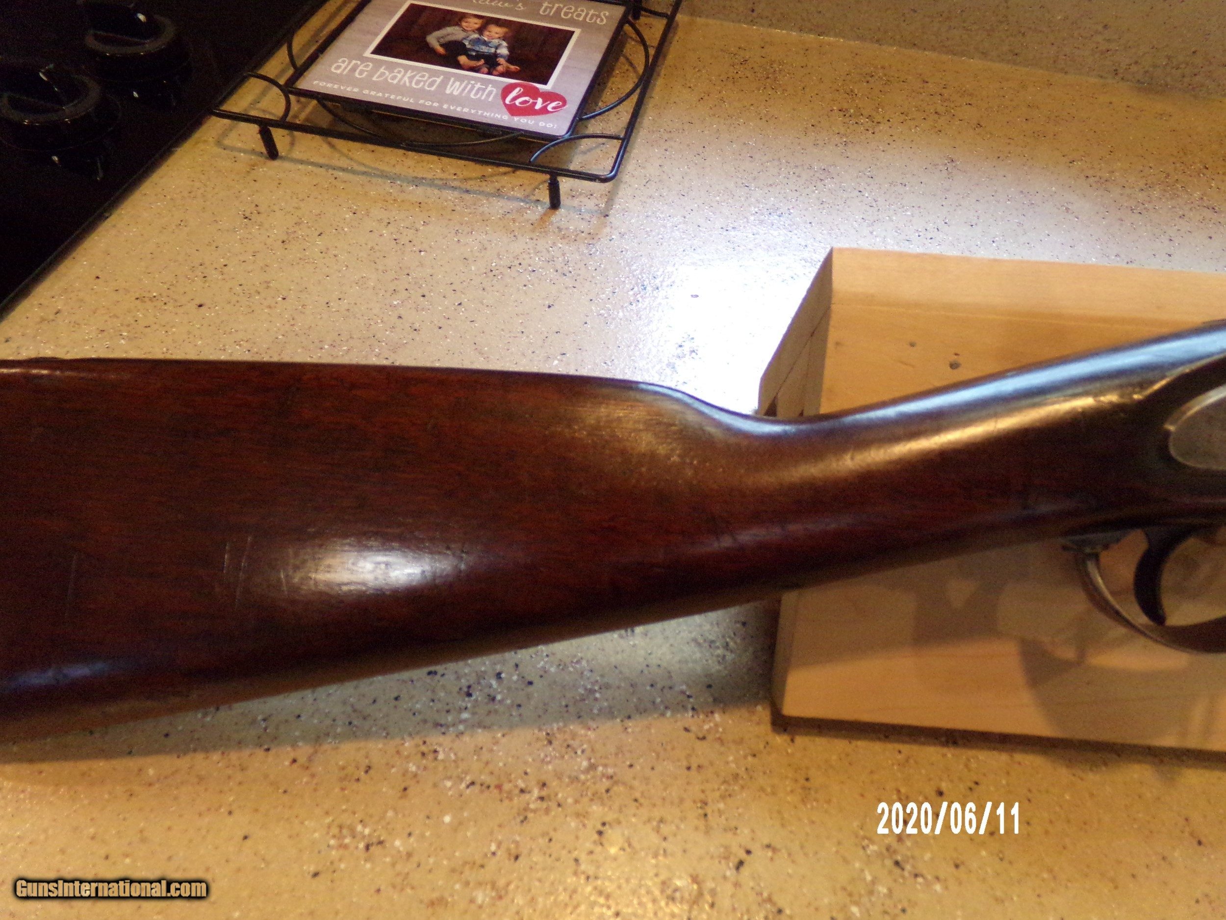 Description: Model 1861 Providence Tool Co. civil war musket in very good plus condition, maybe near fine. Gun is in good working order and 100% complete and original. Stock is very good with two cartouches on left flat. All metal parts are smooth with some original finish and some pitting in bolster area. Very good breech and lock plate markings with 1864 date. Original ramrod with threaded tip and good rifled bore. Awell above average model 1861 at much less then most dealers. SOLD Antique: Yes |