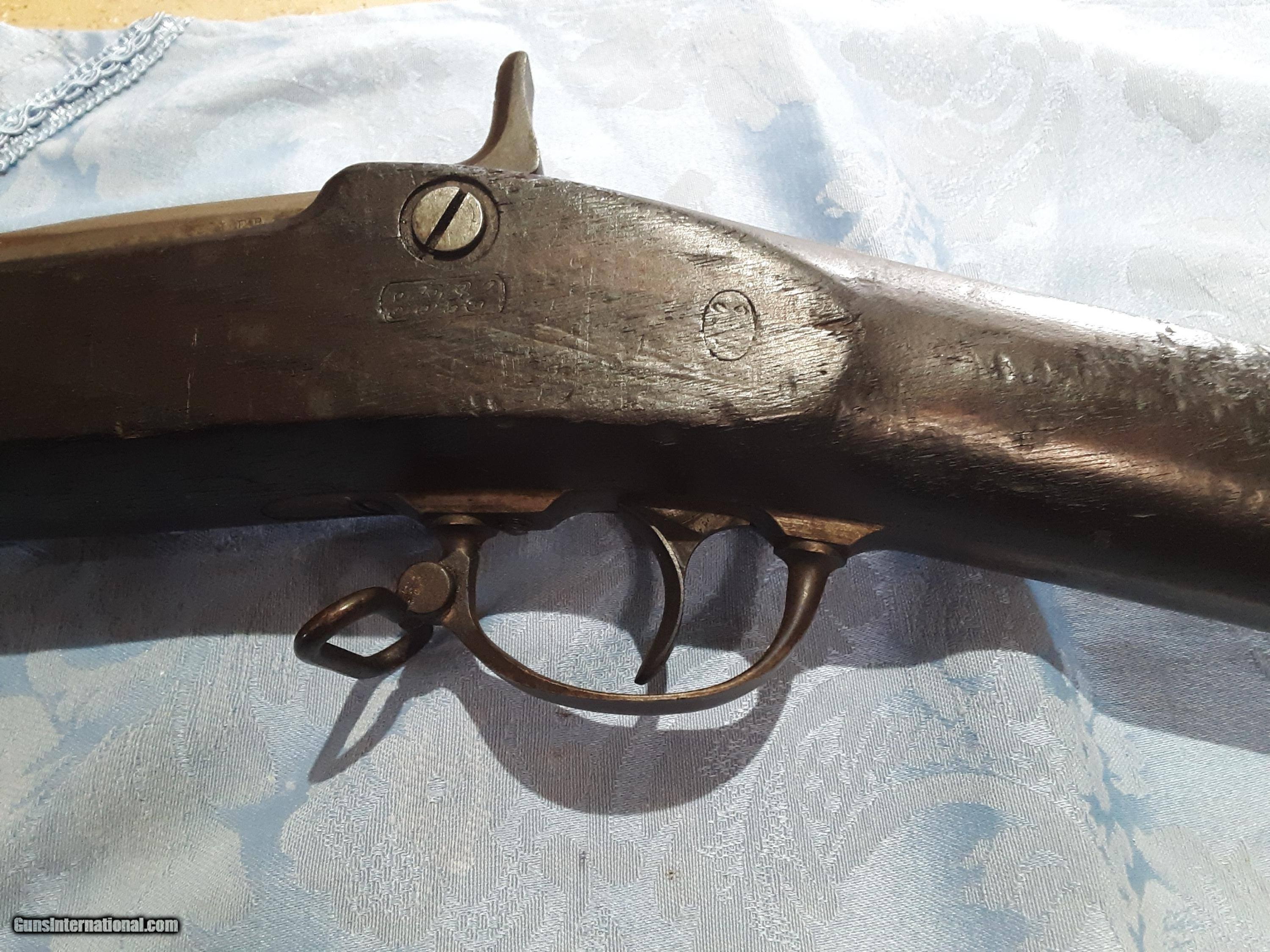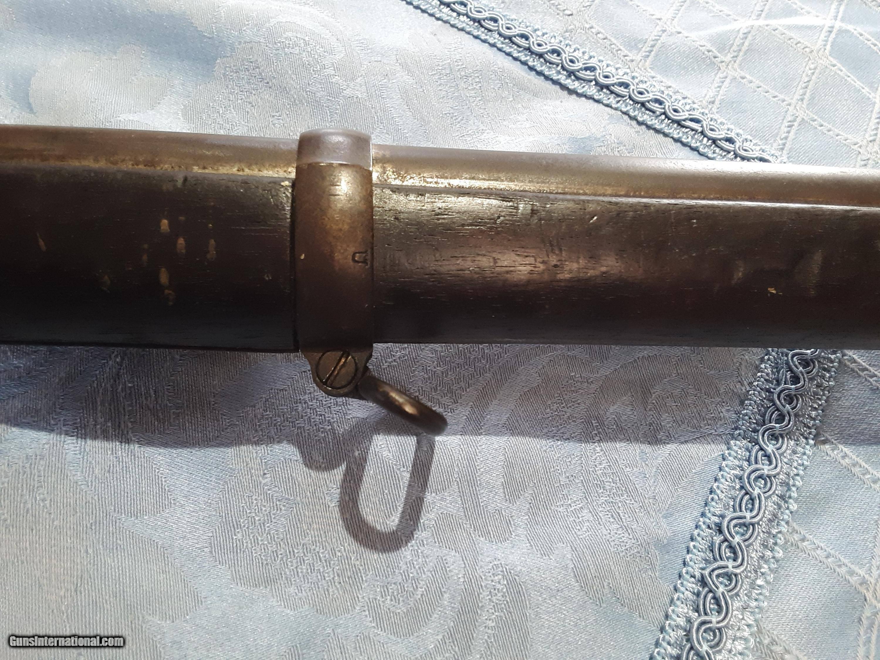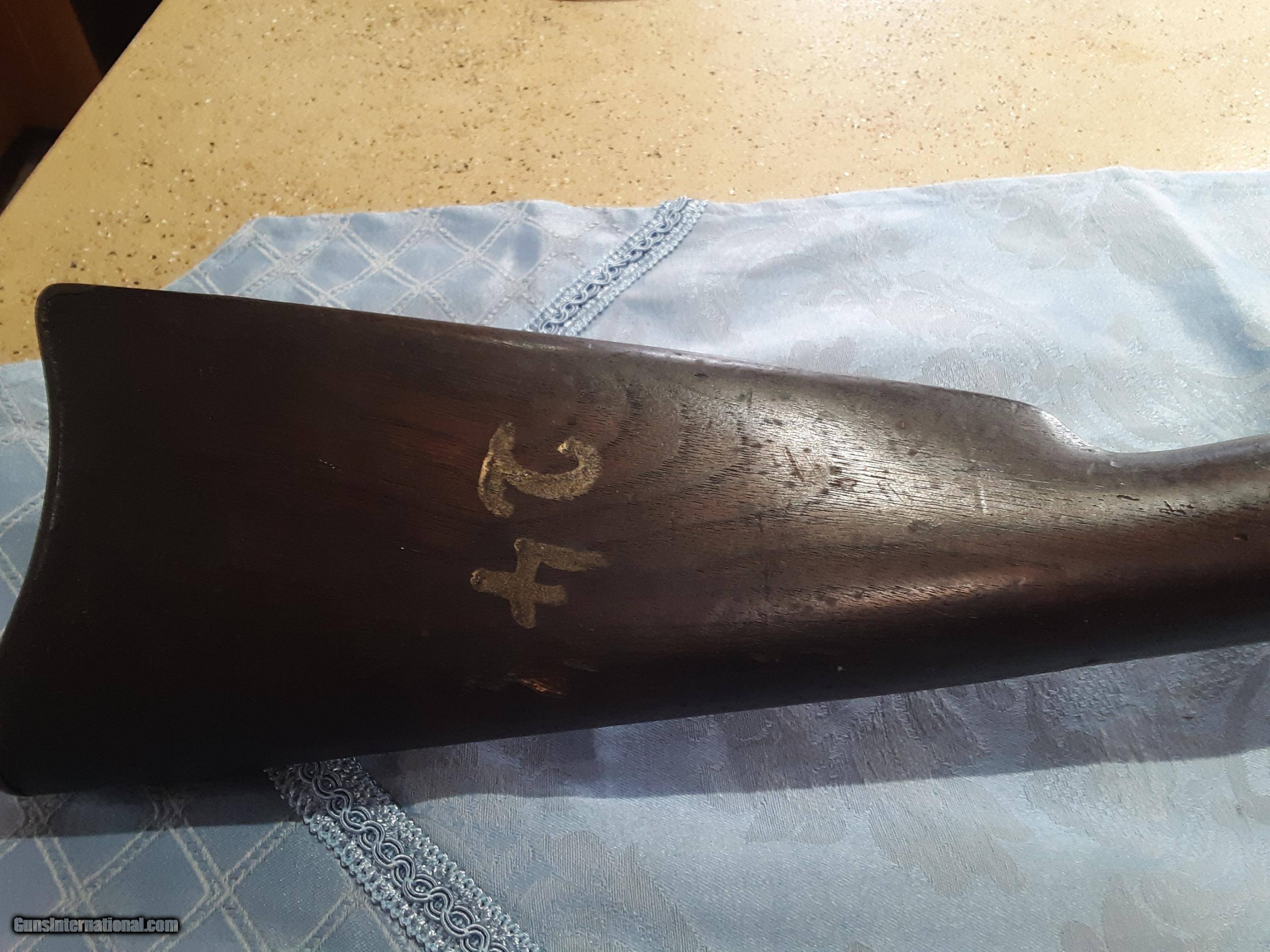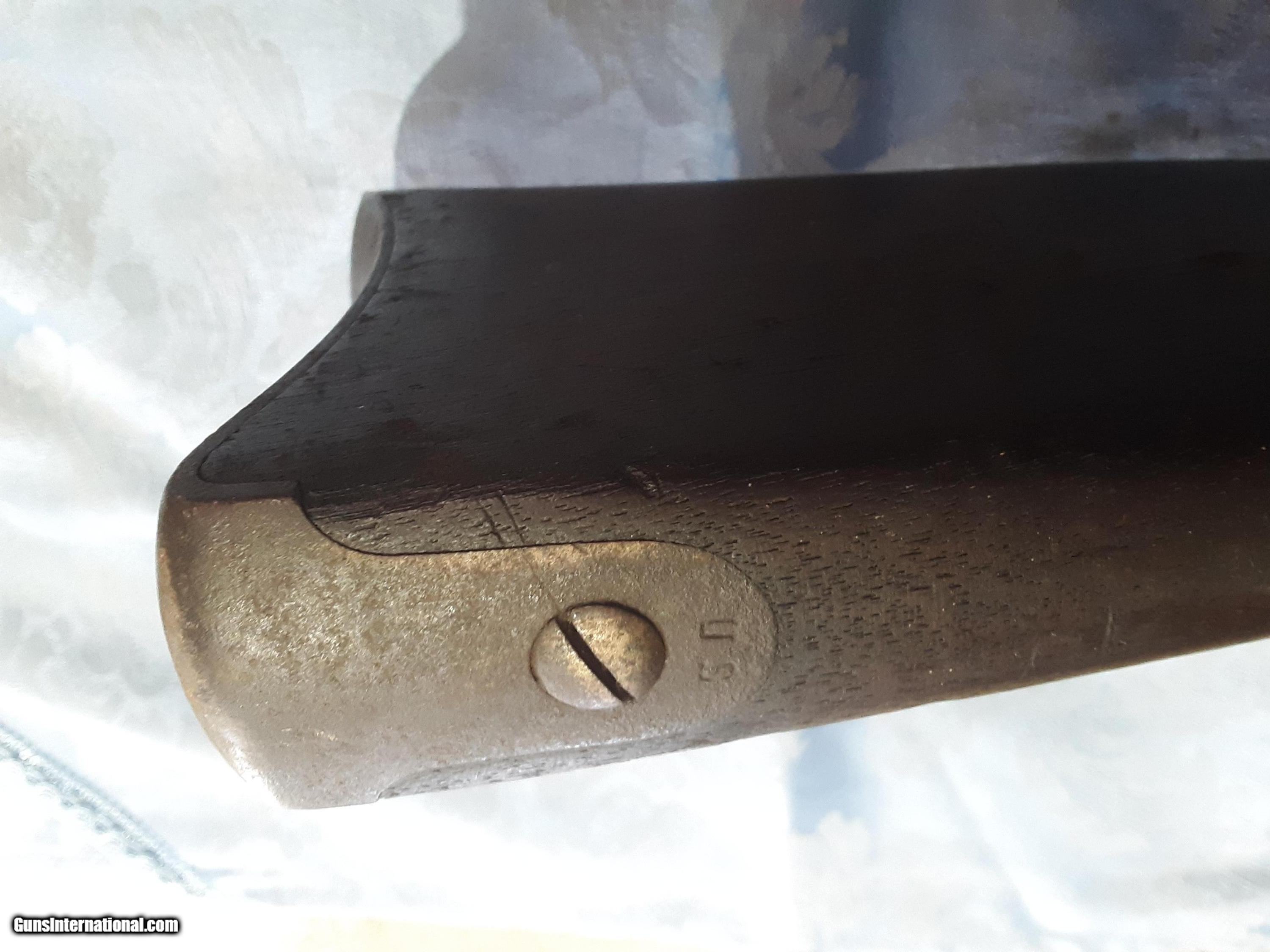 Description: Very good Cond. contract Civil War musket made in Springfield 1863-1864. This gun came out of an old West Va. collection and is 100% original and never been sanded or refinished.Walnut stock is solid with a dark aged tone. All steel parts are smooth without pitting with dark age stain patina. Maker markings and proof markings are sharp and clear and two cartooches on left flat. Rifled bore is verg good. Hammer holds half and full cock with strong mainspring. With some effort gun would clean to near bright but why remove 160 years of age. SOLD Antique: Yes |