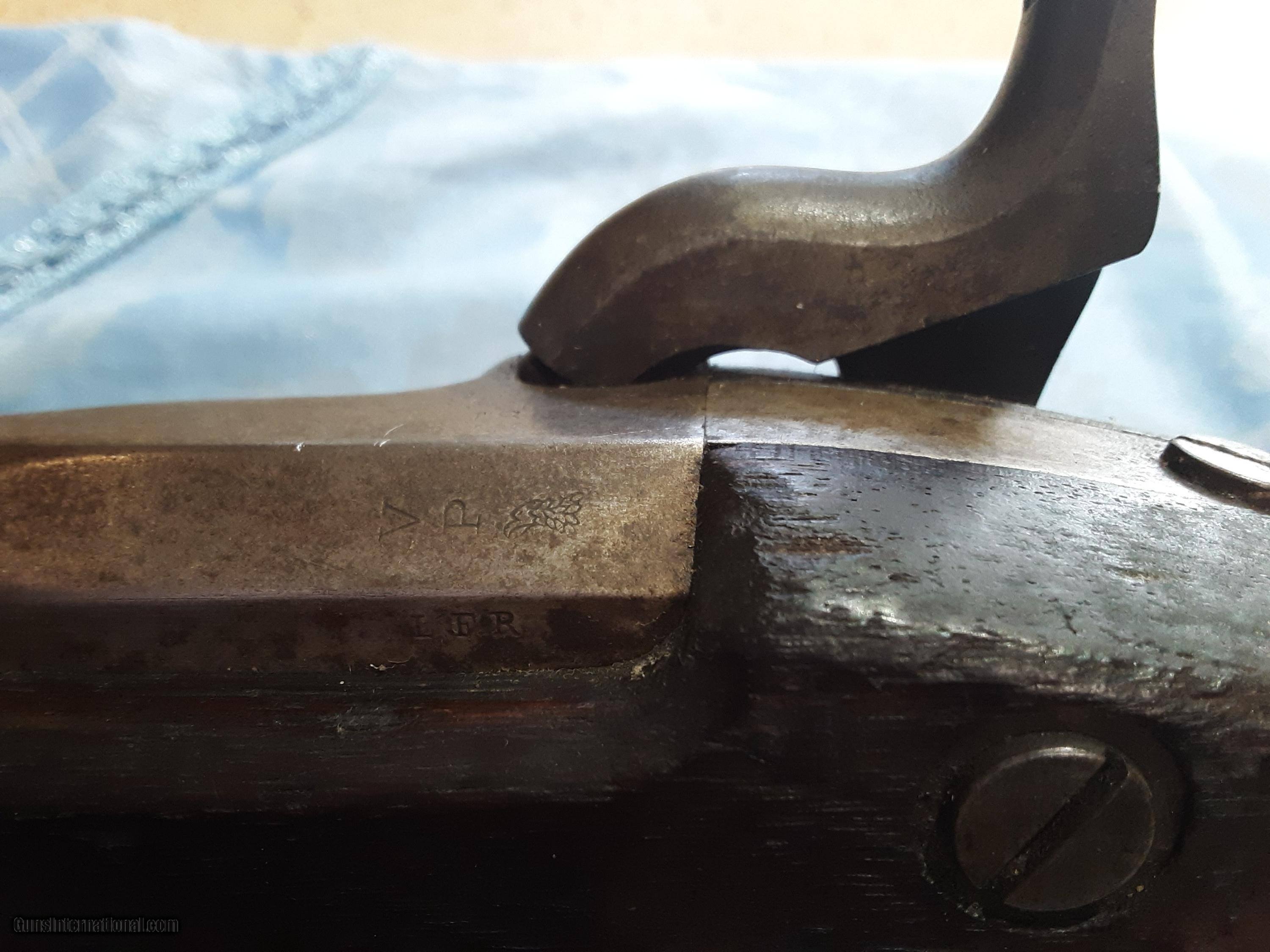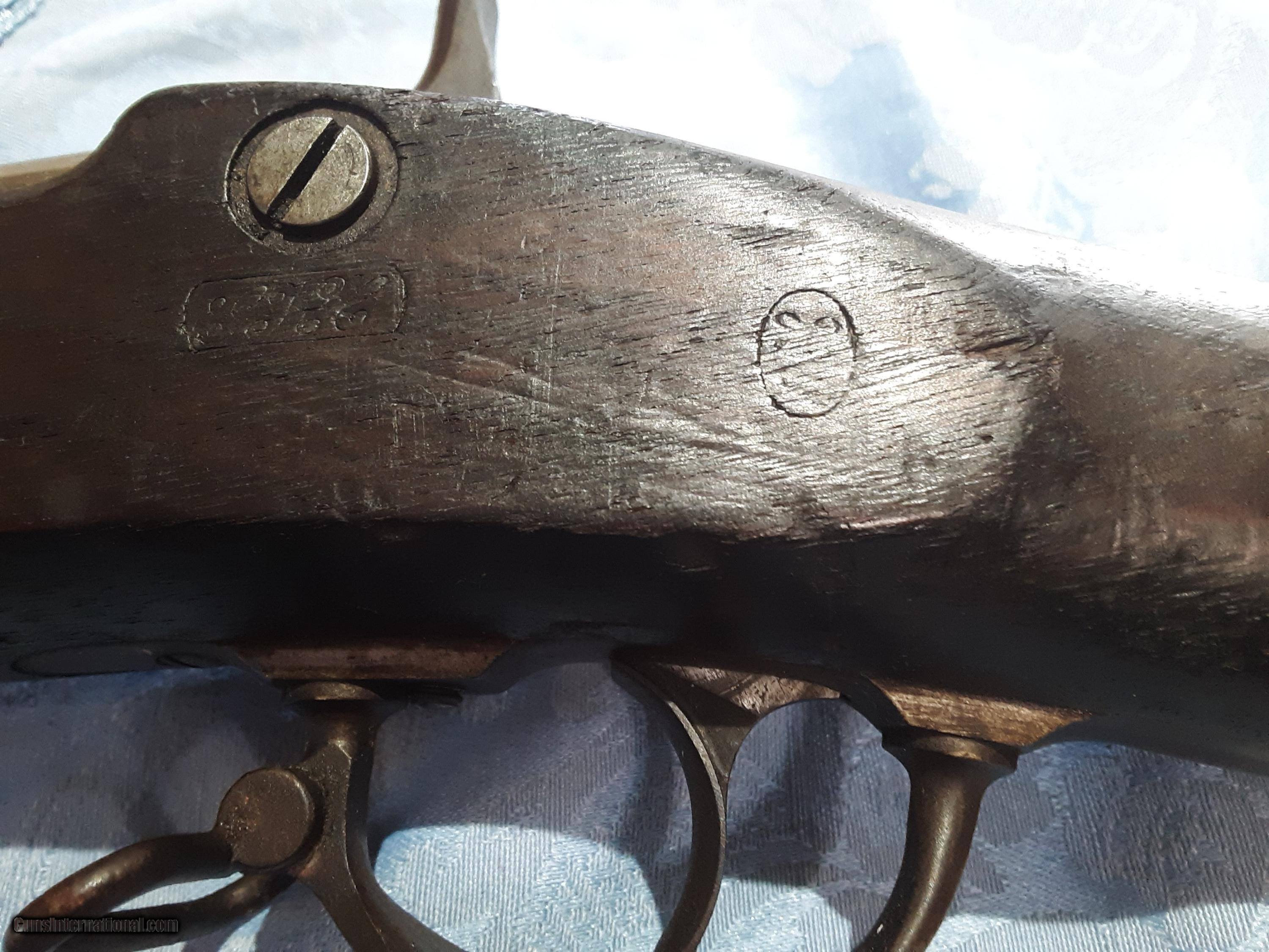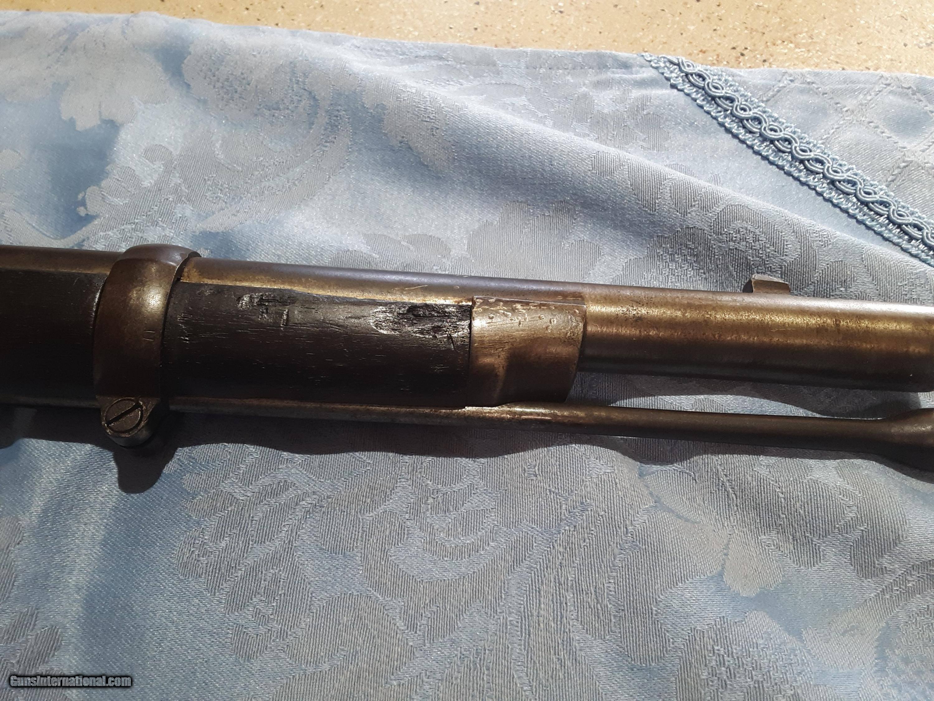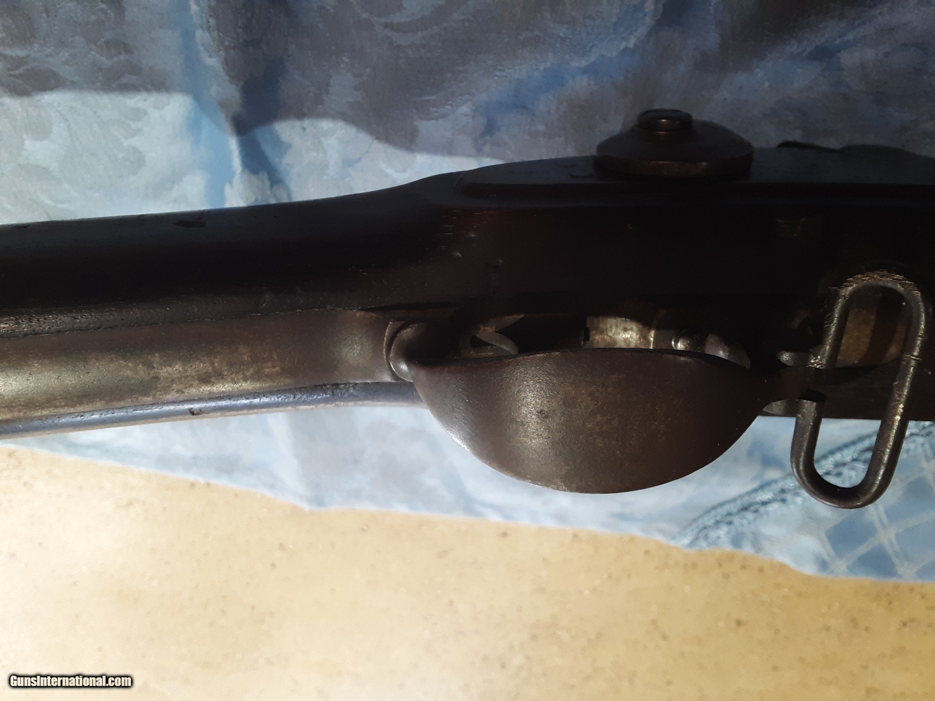 Description: Very good Cond. contract Civil War musket made in Springfield 1863-1864. This gun came out of an old West Va. collection and is 100% original and never been sanded or refinished.Walnut stock is solid with a dark aged tone. All steel parts are smooth without pitting with dark age stain patina. Maker markings and proof markings are sharp and clear and two cartooches on left flat. Rifled bore is verg good. Hammer holds half and full cock with strong mainspring. With some effort gun would clean to near bright but why remove 160 years of age. SOLD Antique: Yes |