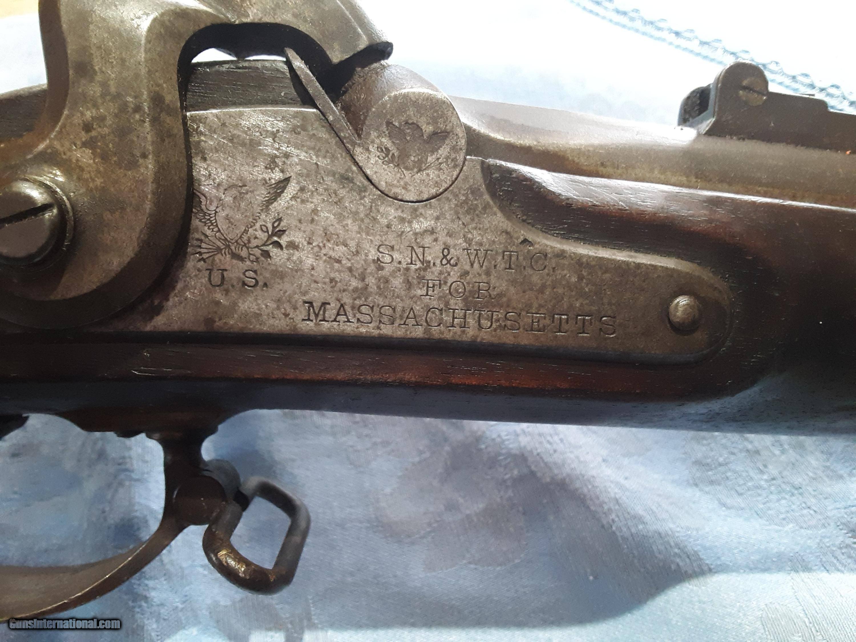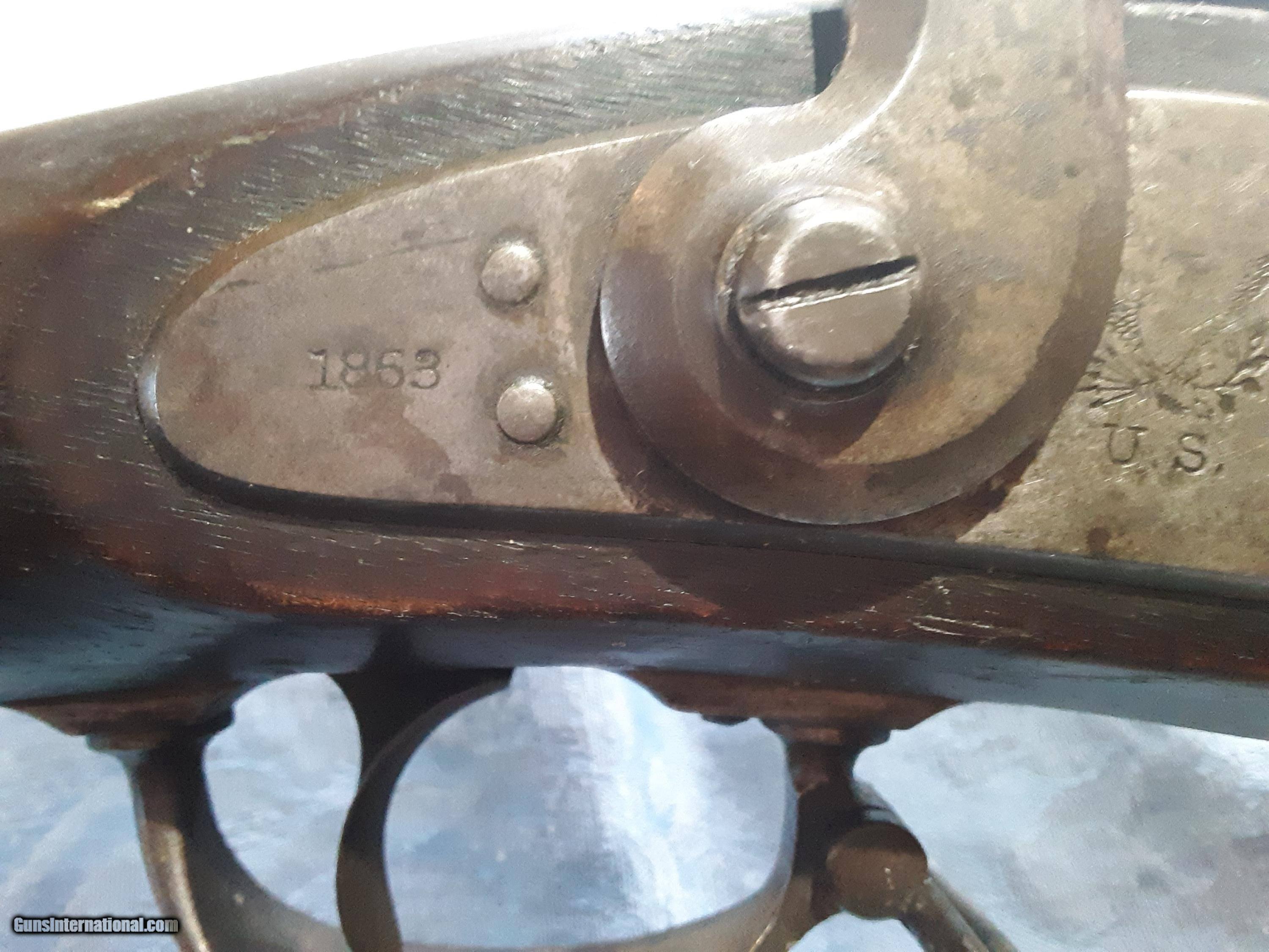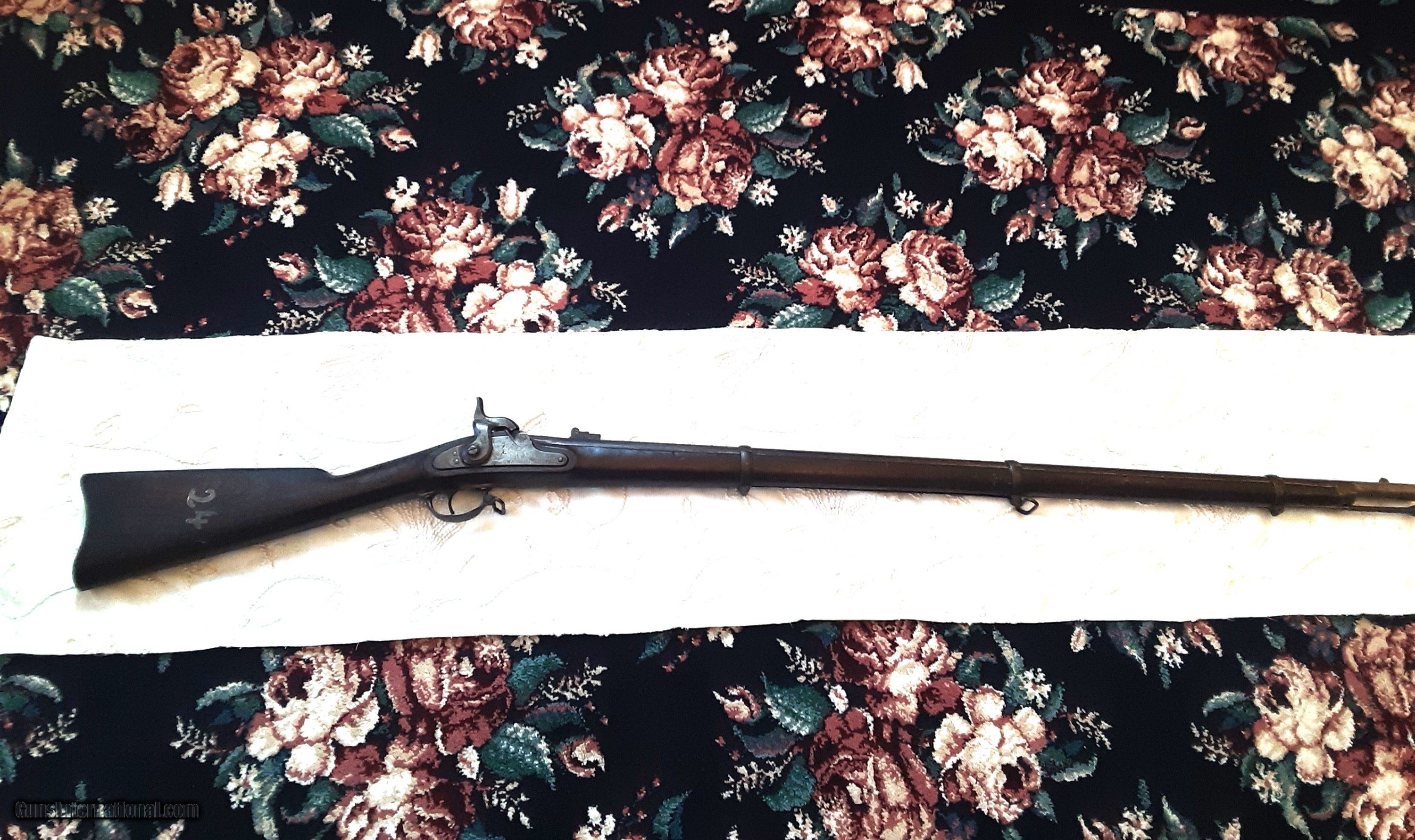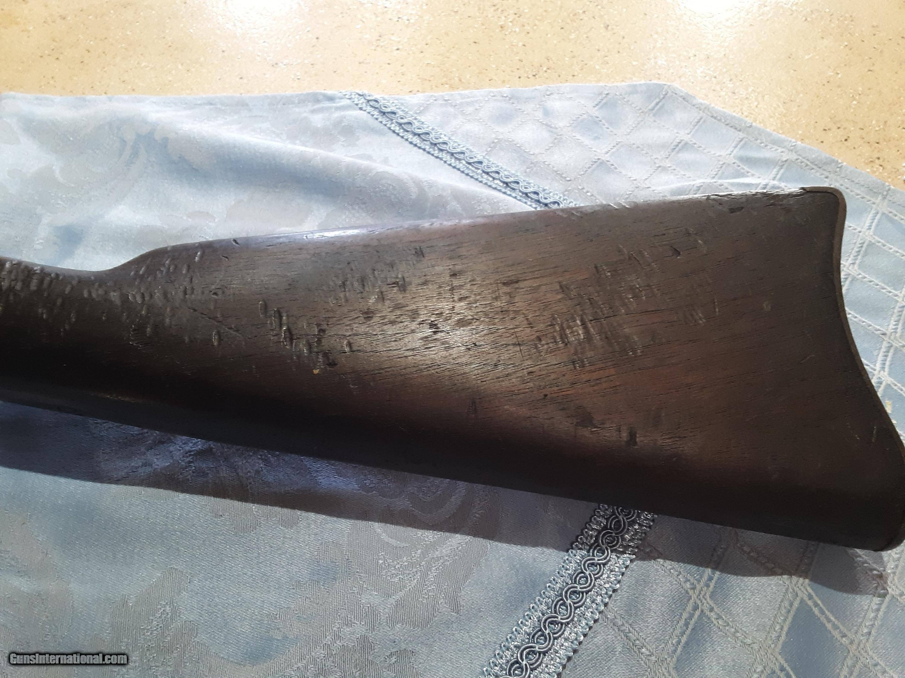 Description: Very good Cond. contract Civil War musket made in Springfield 1863-1864. This gun came out of an old West Va. collection and is 100% original and never been sanded or refinished.Walnut stock is solid with a dark aged tone. All steel parts are smooth without pitting with dark age stain patina. Maker markings and proof markings are sharp and clear and two cartooches on left flat. Rifled bore is verg good. Hammer holds half and full cock with strong mainspring. With some effort gun would clean to near bright but why remove 160 years of age. SOLD Antique: Yes |