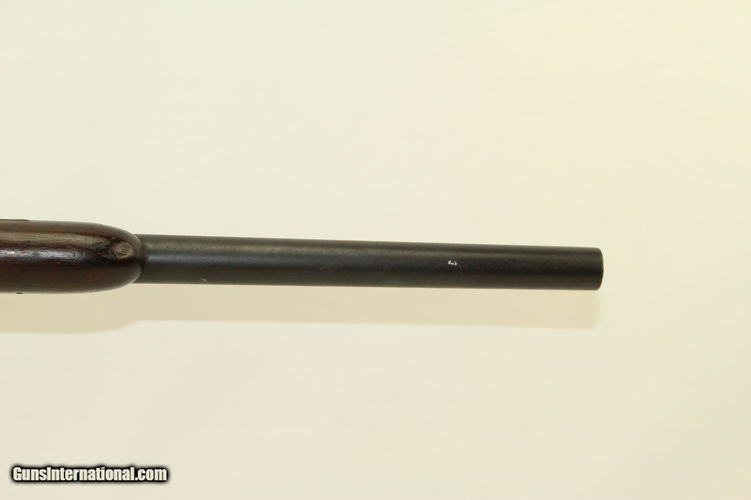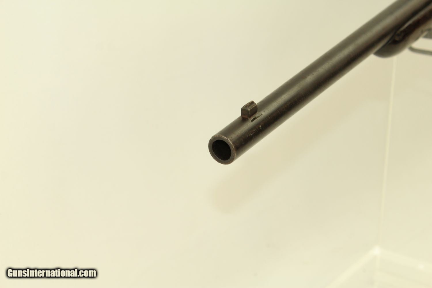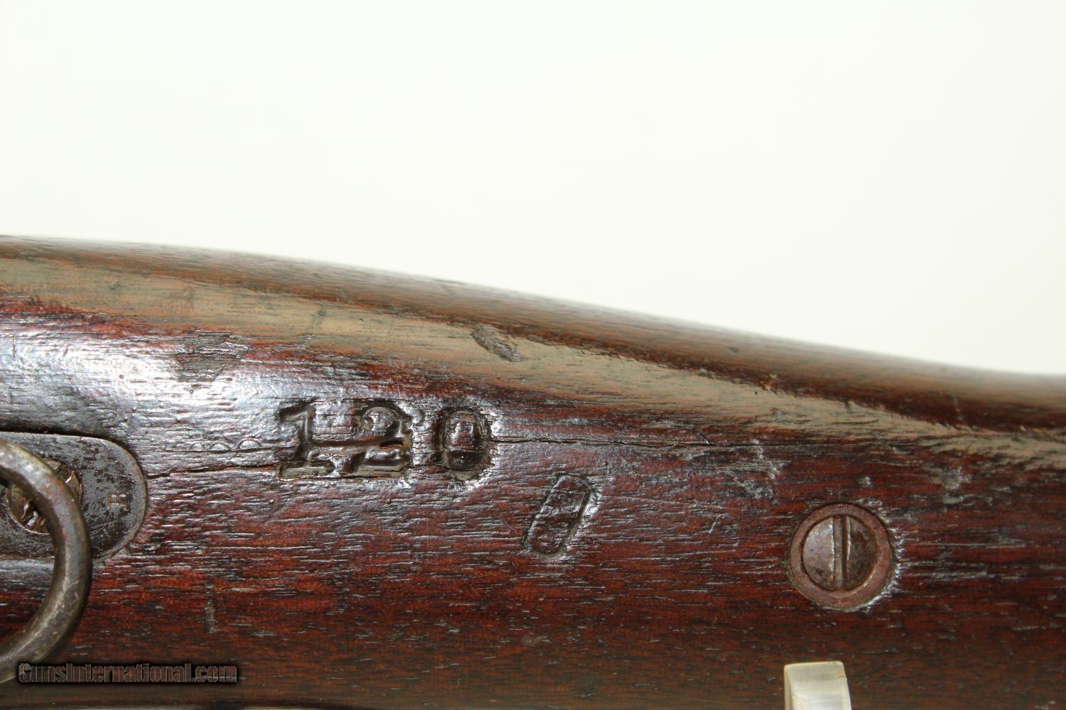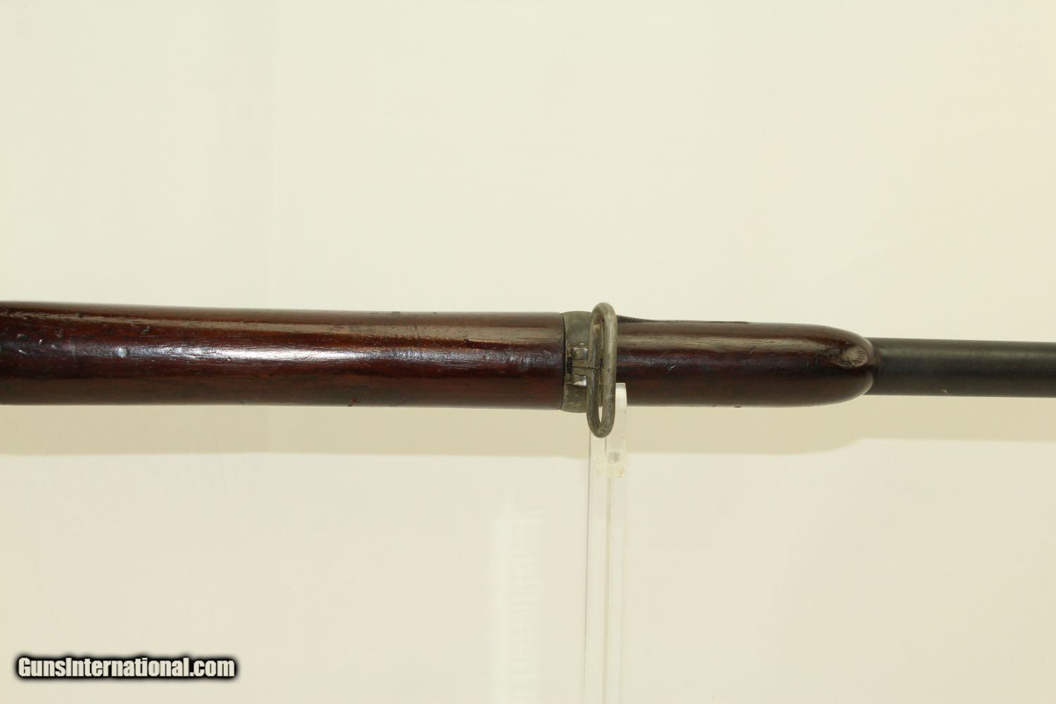 Description: Post-Civil War PEABODY Carbine by PROVIDENCE TOOL Civil War Developed Breechloader from Rhode Island Here we present an antique Peabody Carbine in .50 Rimfire, made by the Providence Tool Company in Providence, Rhode Island. It is one of some 112,000 carbines and rifles produced by the company between 1866 and 1871. Henry Peabody developed this sturdy, single-shot, breechloading rifle during the American Civil War and it compared very favorably against the competition. It might have been adopted by the US military had the conflict not ended when it did. Instead, the federal government decided to adopt the Allin Trapdoor Conversion of the ubiquitous Model 1861 Muskets that were in surplus after the war. Several states, such as Massachusetts and Connecticut, purchased these rifles for their militias. This rifle utilizes a trigger-guard that acts as a breech lever to lower the breechlock for top loading of the metallic round. It also features a back action style lock with a large side-mounted hammer. It features a rear sight leaf for various ranges. Interestingly, the rear sight has 3 distinct notches intentionally filed into the left side. This specimen has a lock marked with “PEABODY PAT./JULY 22 1862/MAN’F’D BY/PROVIDENCE TOOL CO./PROV. R.I.” Single letter government inspection marks are found throughout. The overall condition is near fine. 90% of the original blue finish remains. The case-hardened parts such as the hammer and butt plate have a white scale to them. The markings are clear. The walnut stock shows some use. There are a couple hairline cracks that are very thin and stable and are climate related. The bore is bright with sharp rifling. The action is excellent. Own the original! This is a legitimate antique and not a reproduction. Barrel is 20 inches. Caliber: .50 Rimfire Overall condition as seen in photos. Very Fast. Very Safe. FREE SHIPPING WORLDWIDE. Delivered directly to your door by express mail! Guaranteed AUTHENTIC & Includes CERTIFICATE OF AUTHENTICITY. ancestryguns $1800 #190095 SOLD Antique: Yes |