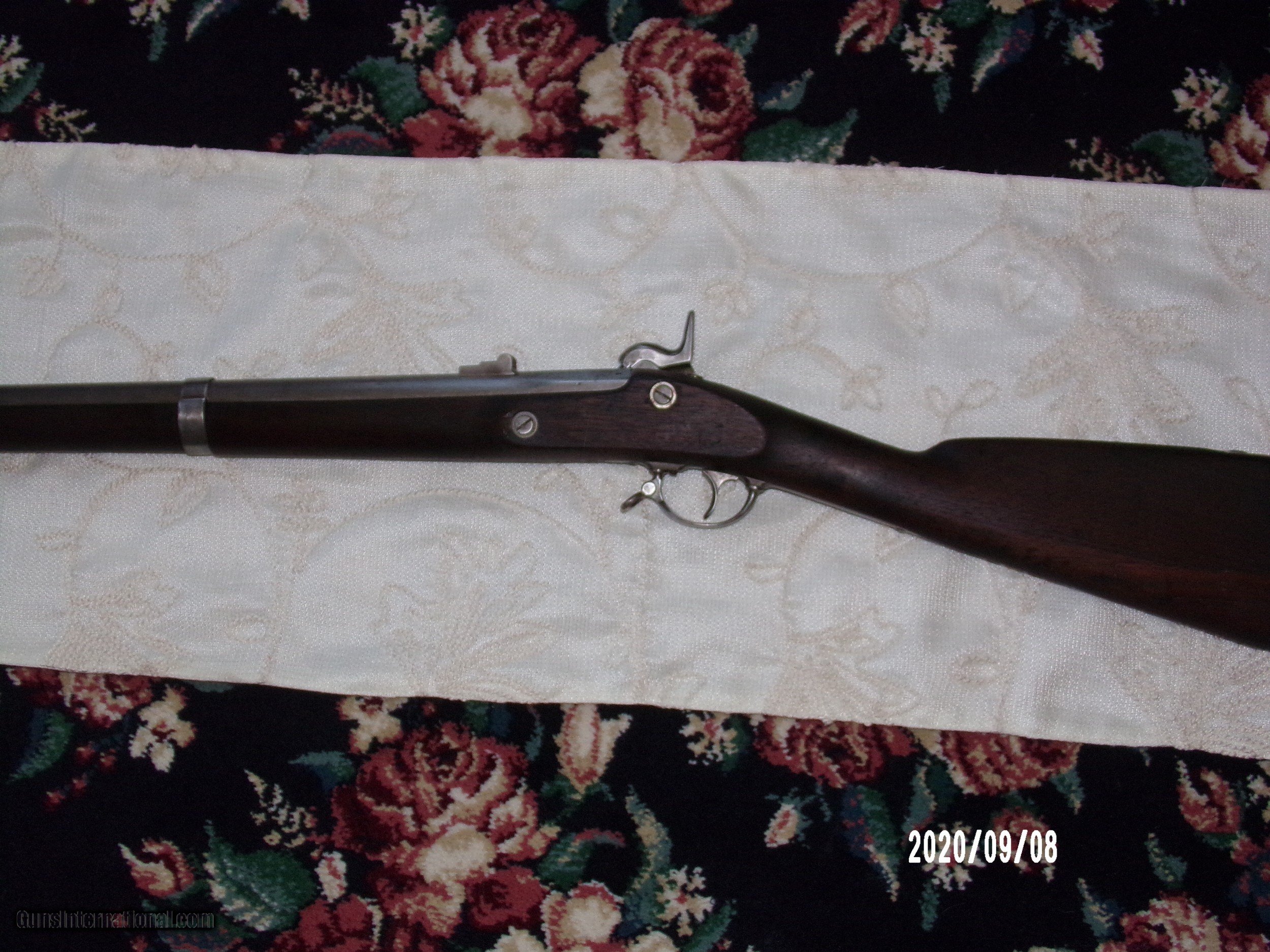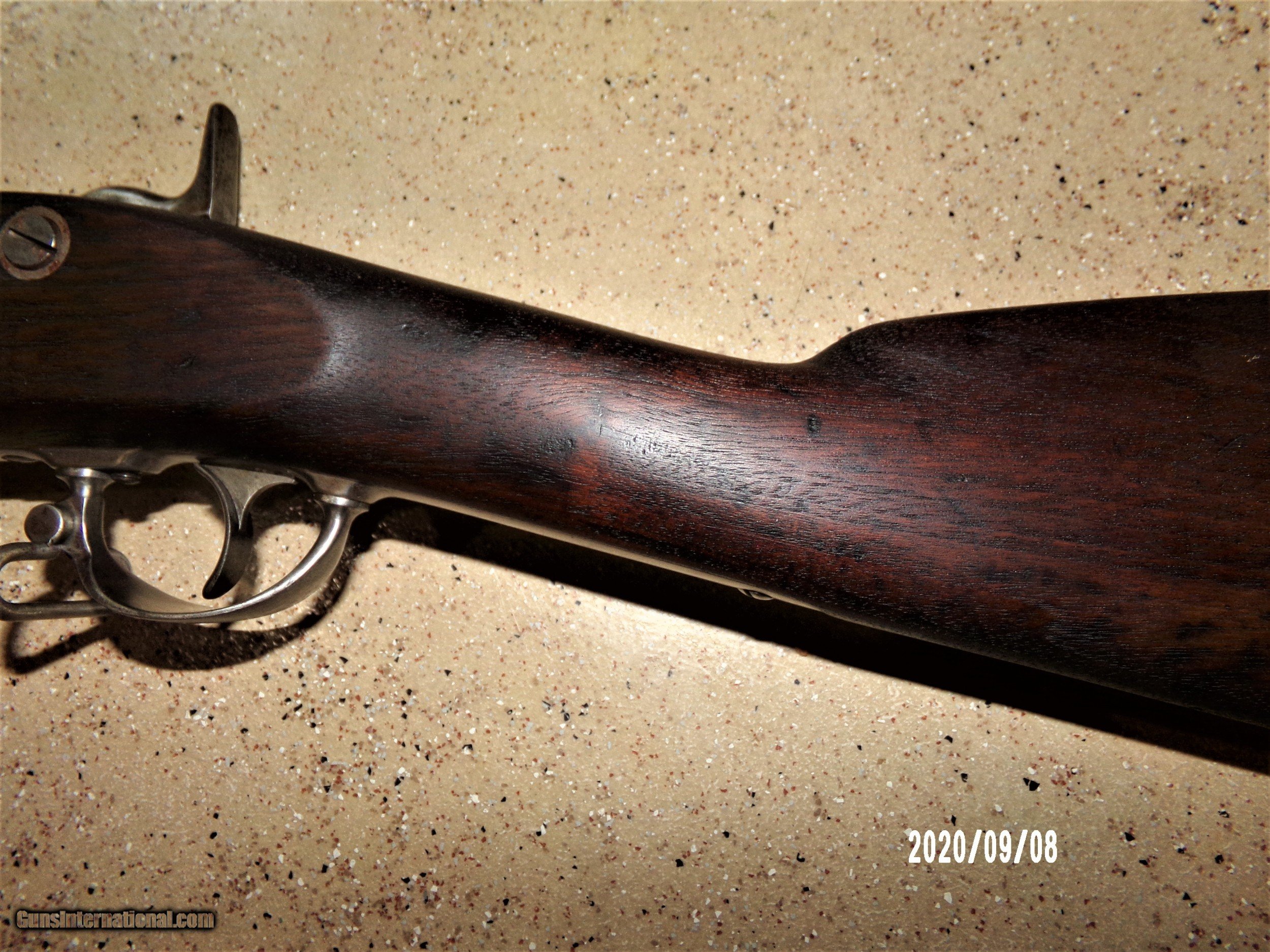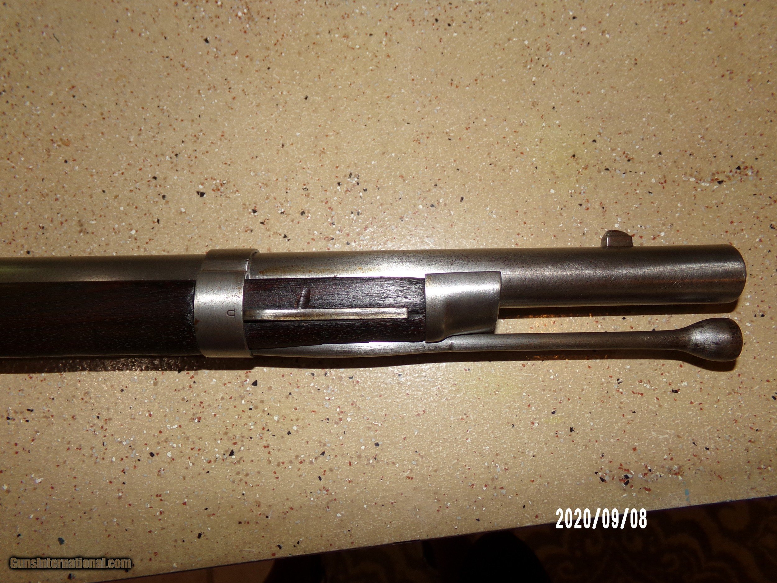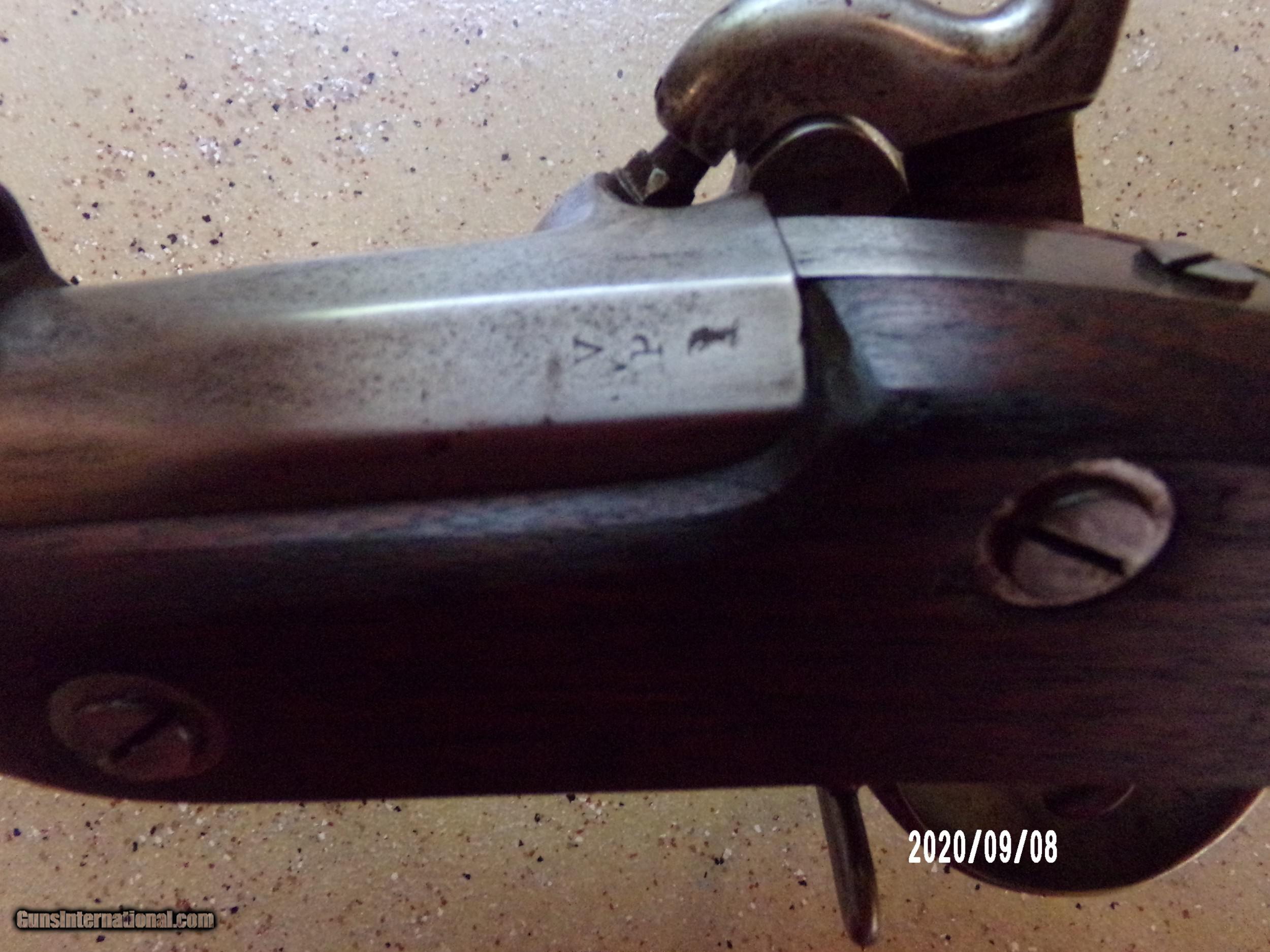 Description: Springfield model 1855 cadet in overall very good Cond. Only 2500 of these guns were made and so not often seen. Has proper 38 inch barrel, 50 inch stock and correct spacing of barrel bands. Maynard primer system and mechanics are perfect. Lock plate markings and proof marks on barrel are very good but date on barrel is worn. Metal parts have been cleaned at some point Rifled bore is verg good and correct ramrod with threaded tip. Stock has chip out by hammer and shoulder stock has been repaired where it been chipped out long ago.Buttplate is smaller then those on full size musket and also correct for this model. This model musket often sells for $4000 - $5000. SOLD Antique: Yes |